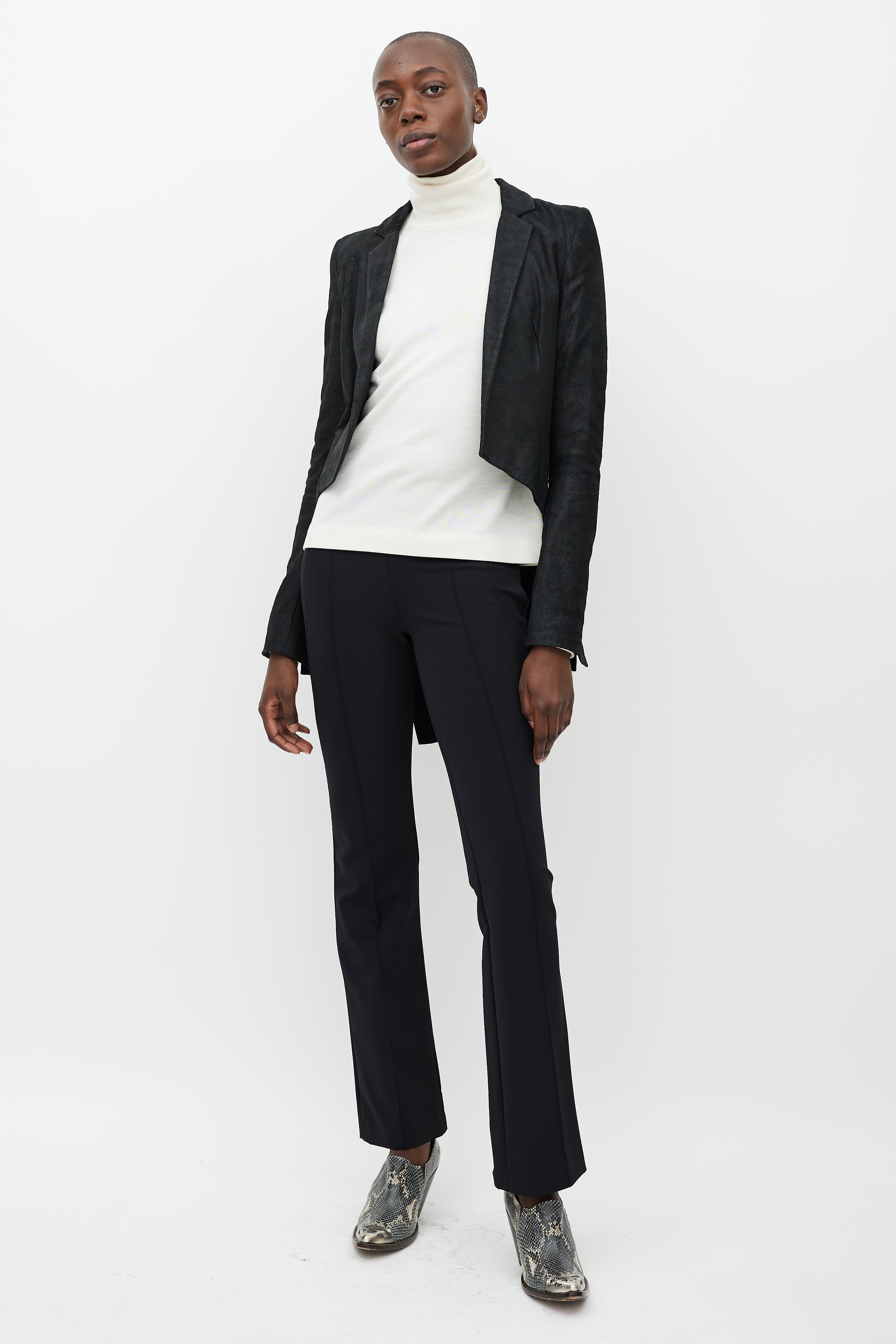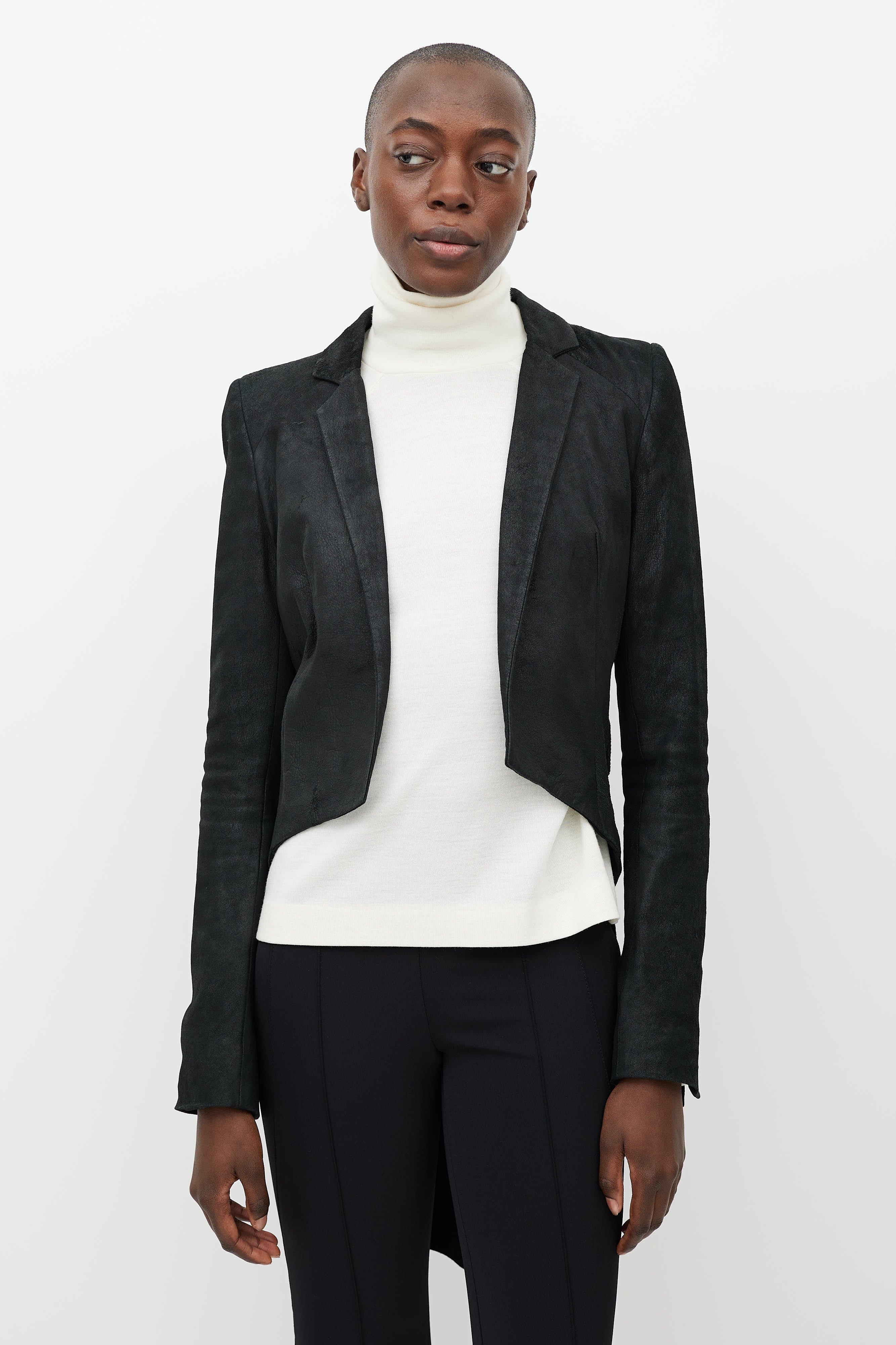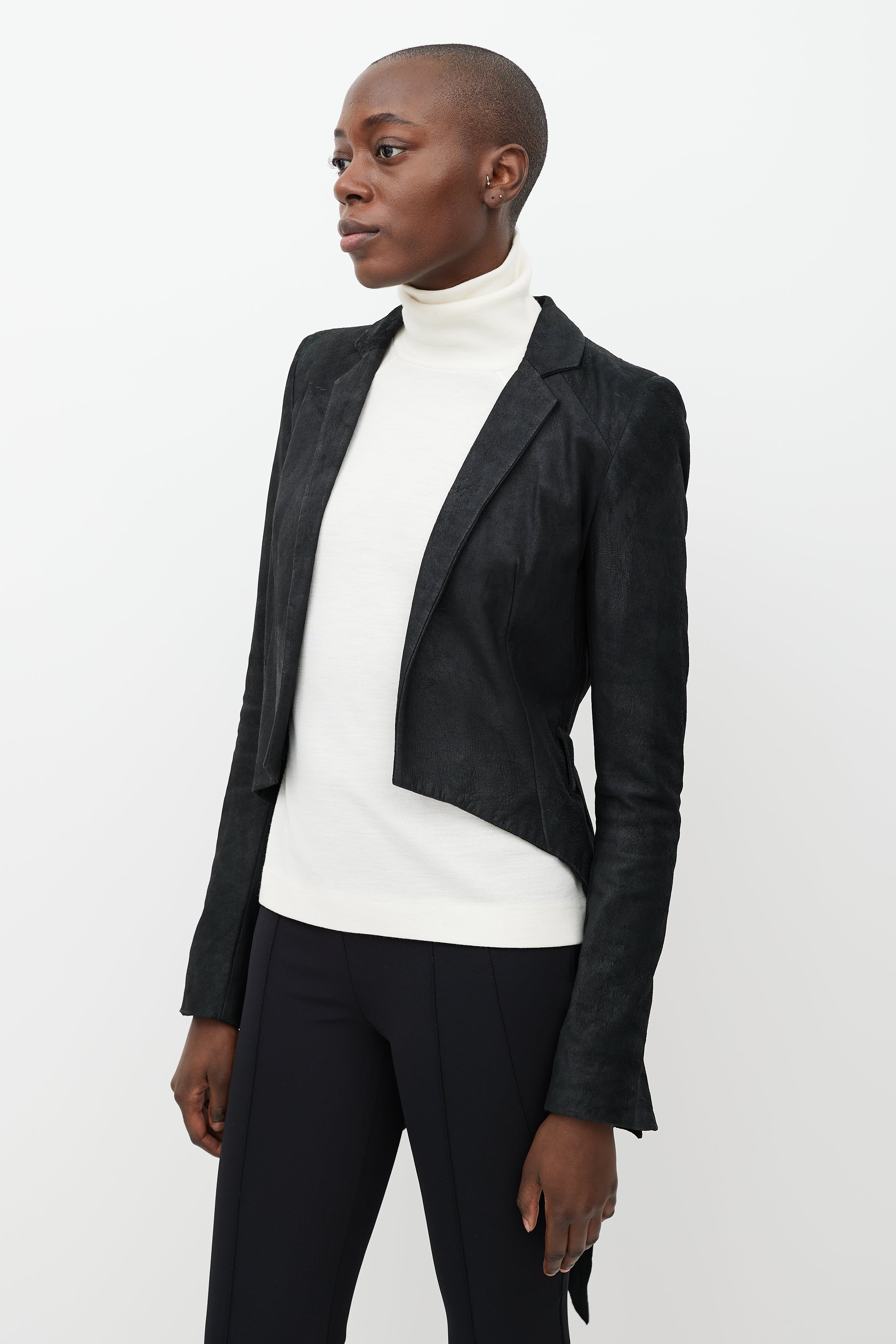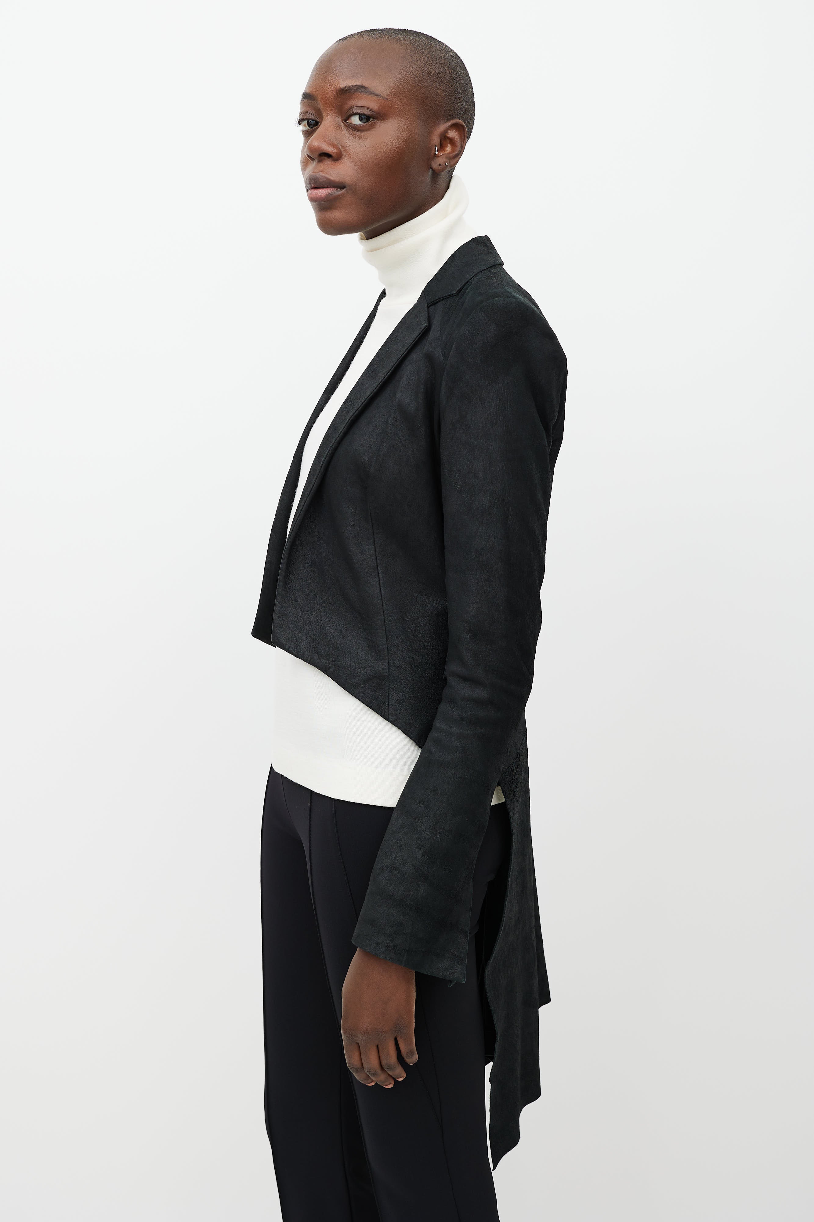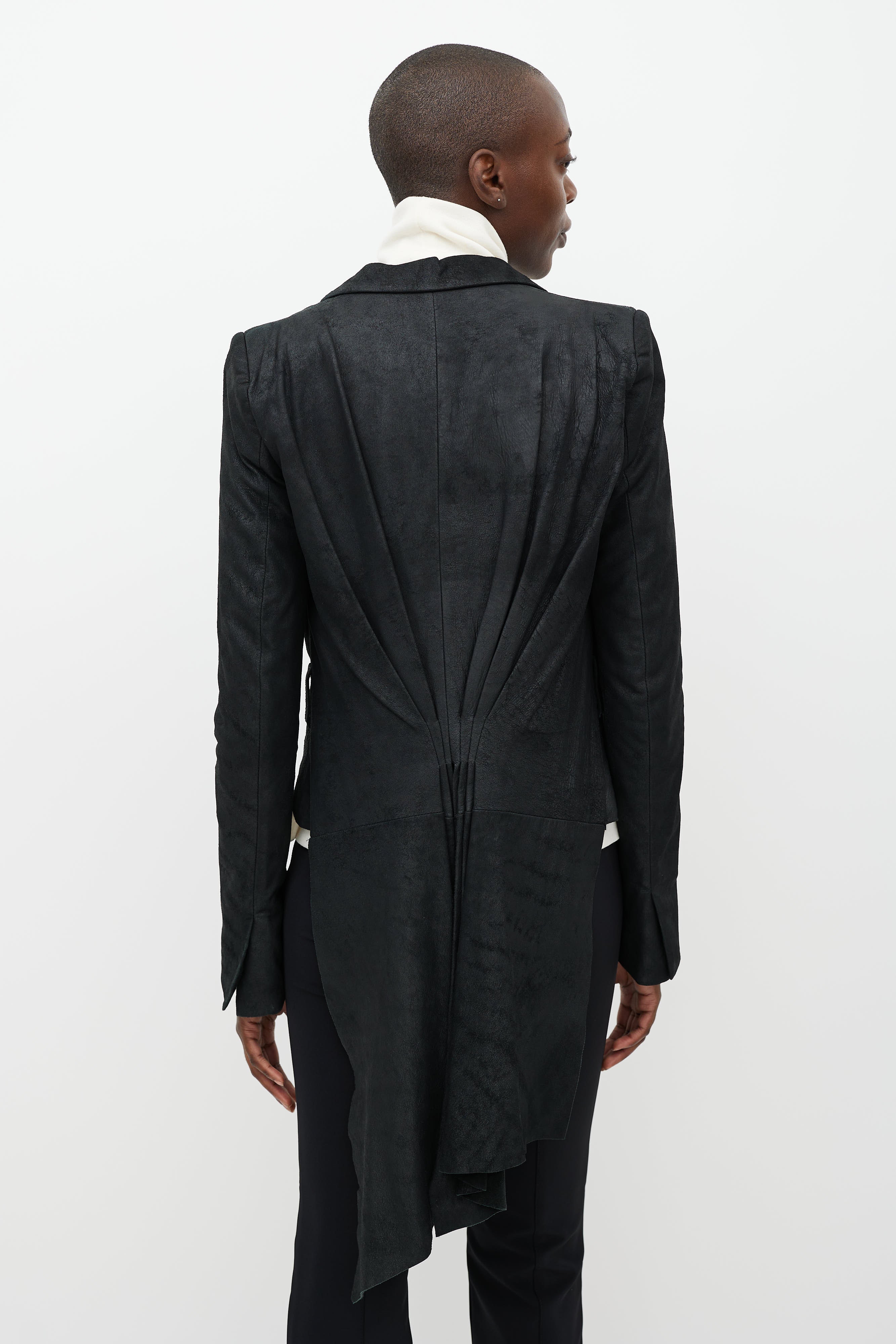 Pre-owned Haider Ackermann black leather tailcoat blazer featuring a notched lapel, shoulder pads, long sleeves with flared cuffs, gathered detailing at back, and open front. Lined.