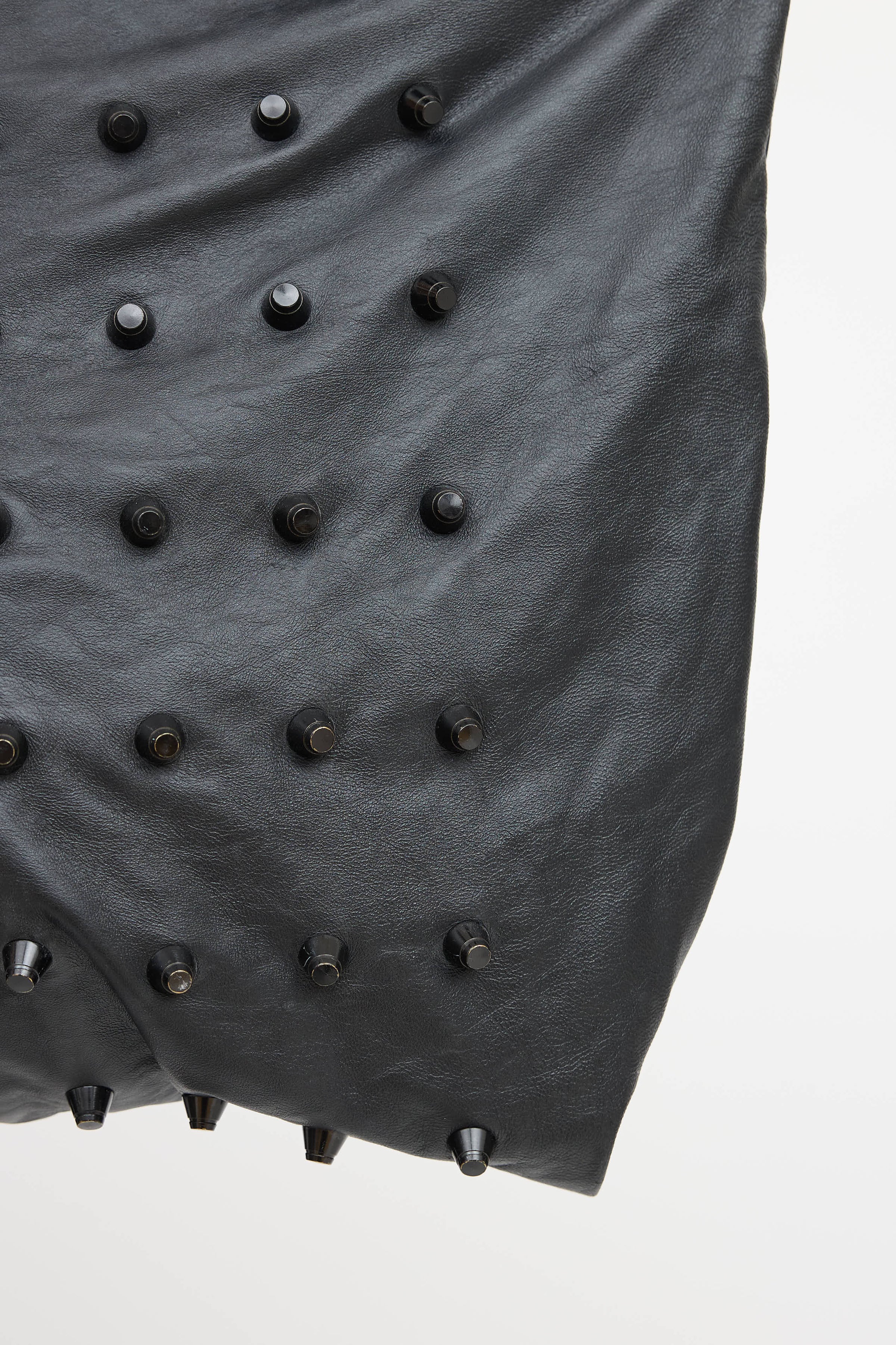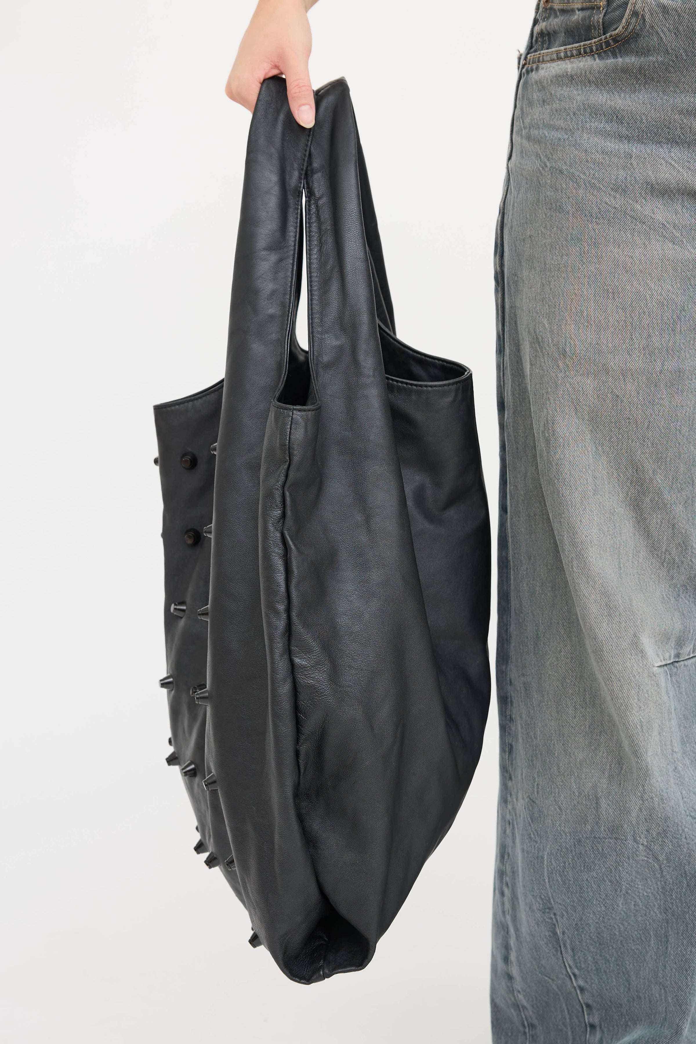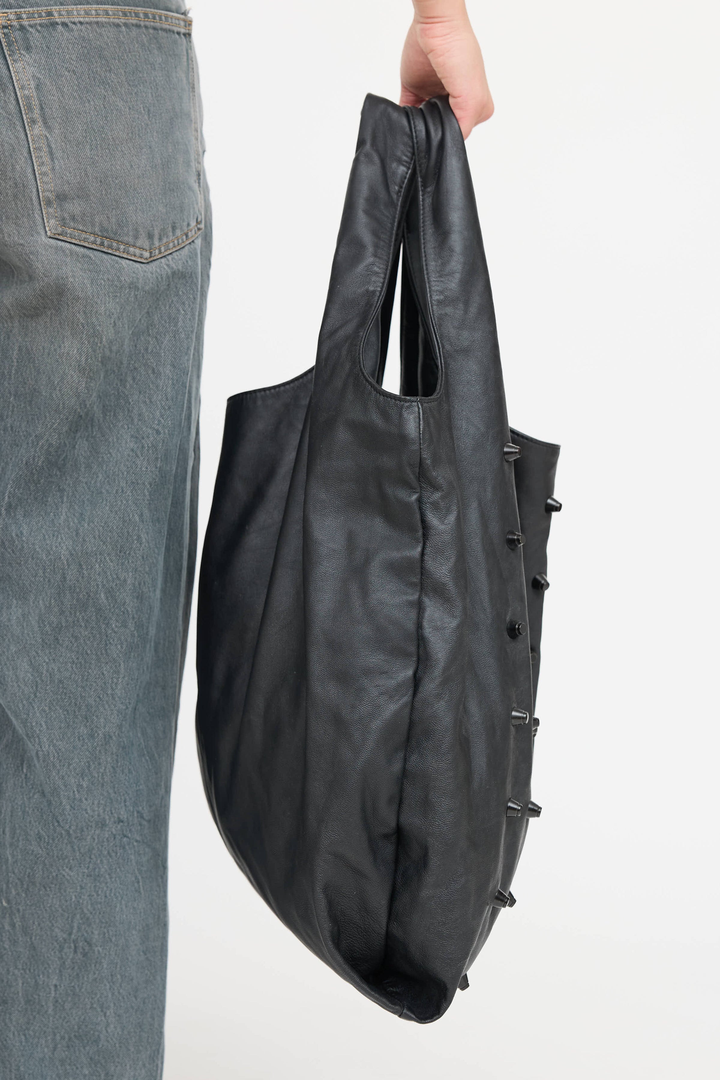 Pre-owned Alexander Wang black Hilary bag featuring dual flat top handles, studded front, open top, and one main compartment with one zip pocket.