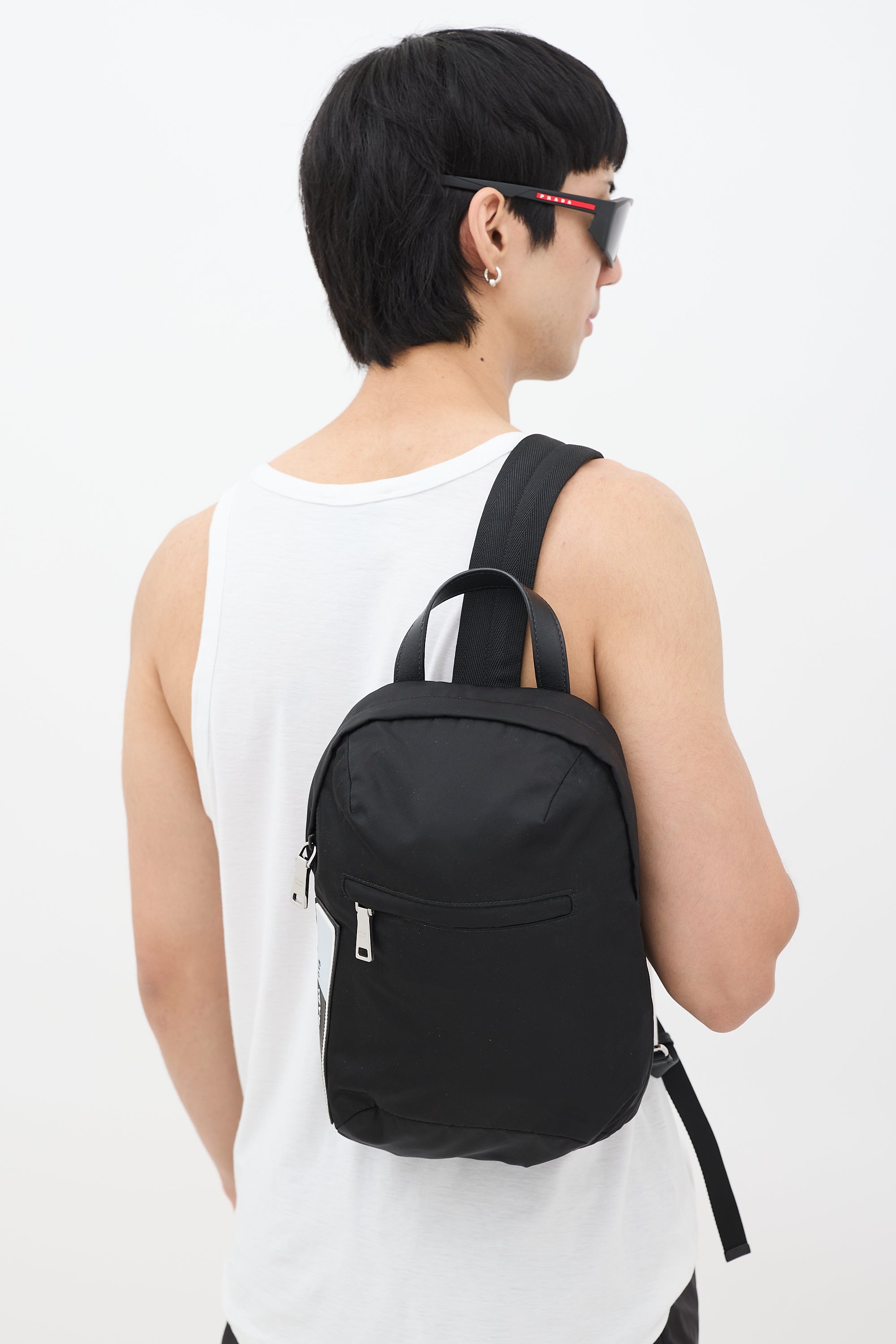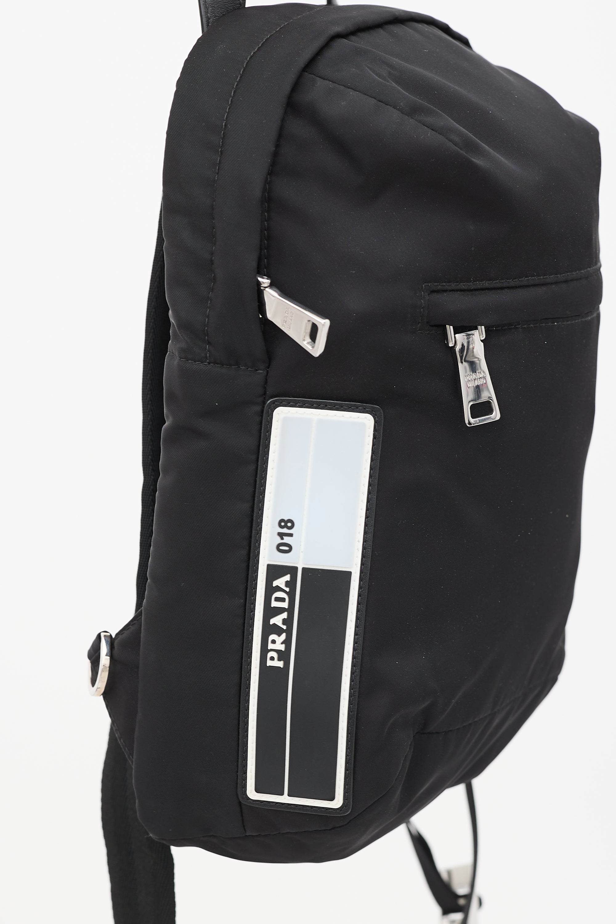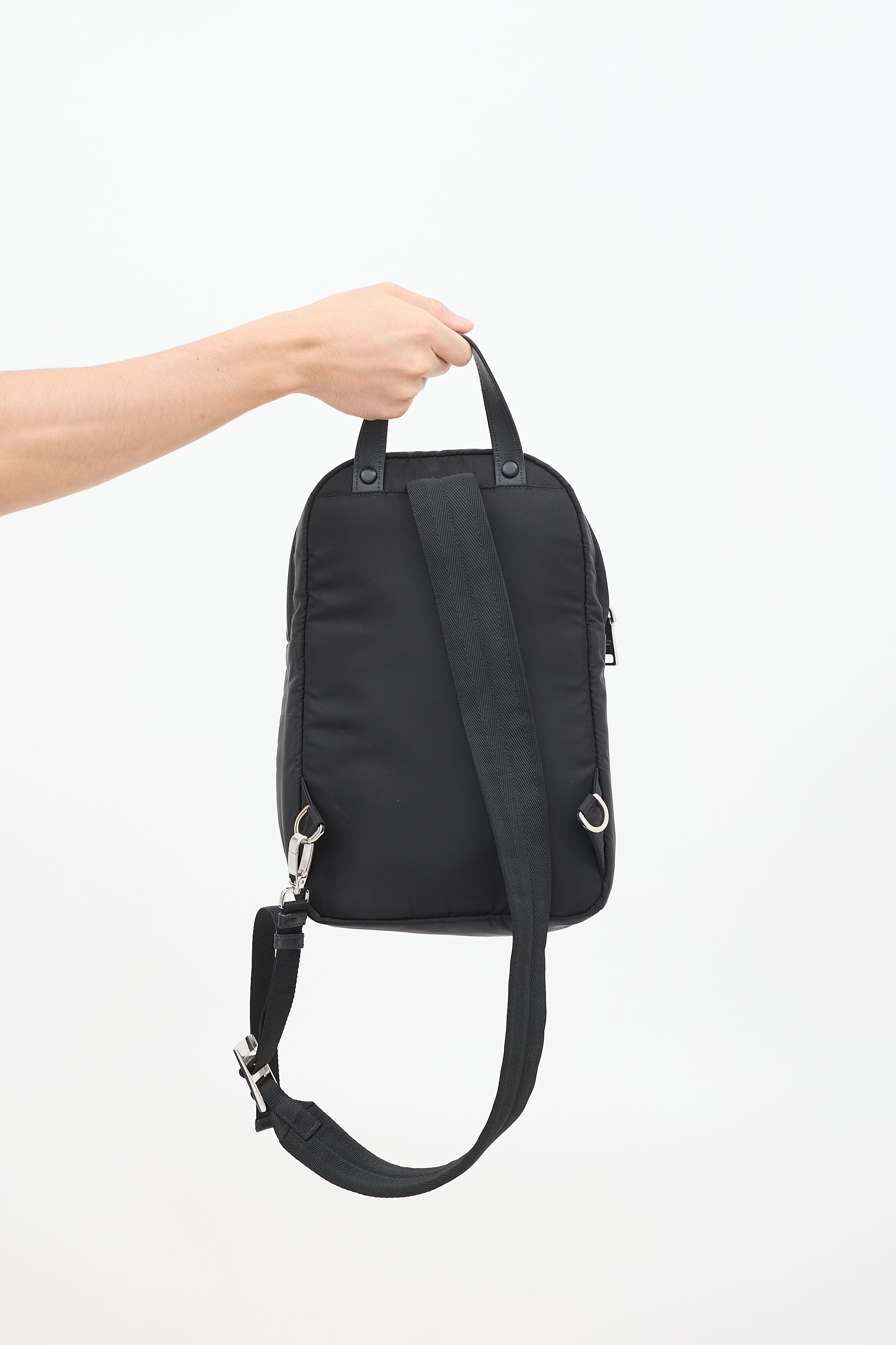 Pre-owned Prada black nylon sling backpack featuring tonal stitching, silver tone hardware, single flat leather top handle, single adjustable webbed strap, rubber logo panel at left side, single exterior zip compartment at front, and one main compartment with one zip pocket, one slip pocket, and zip closure. Comes with original dust bag.