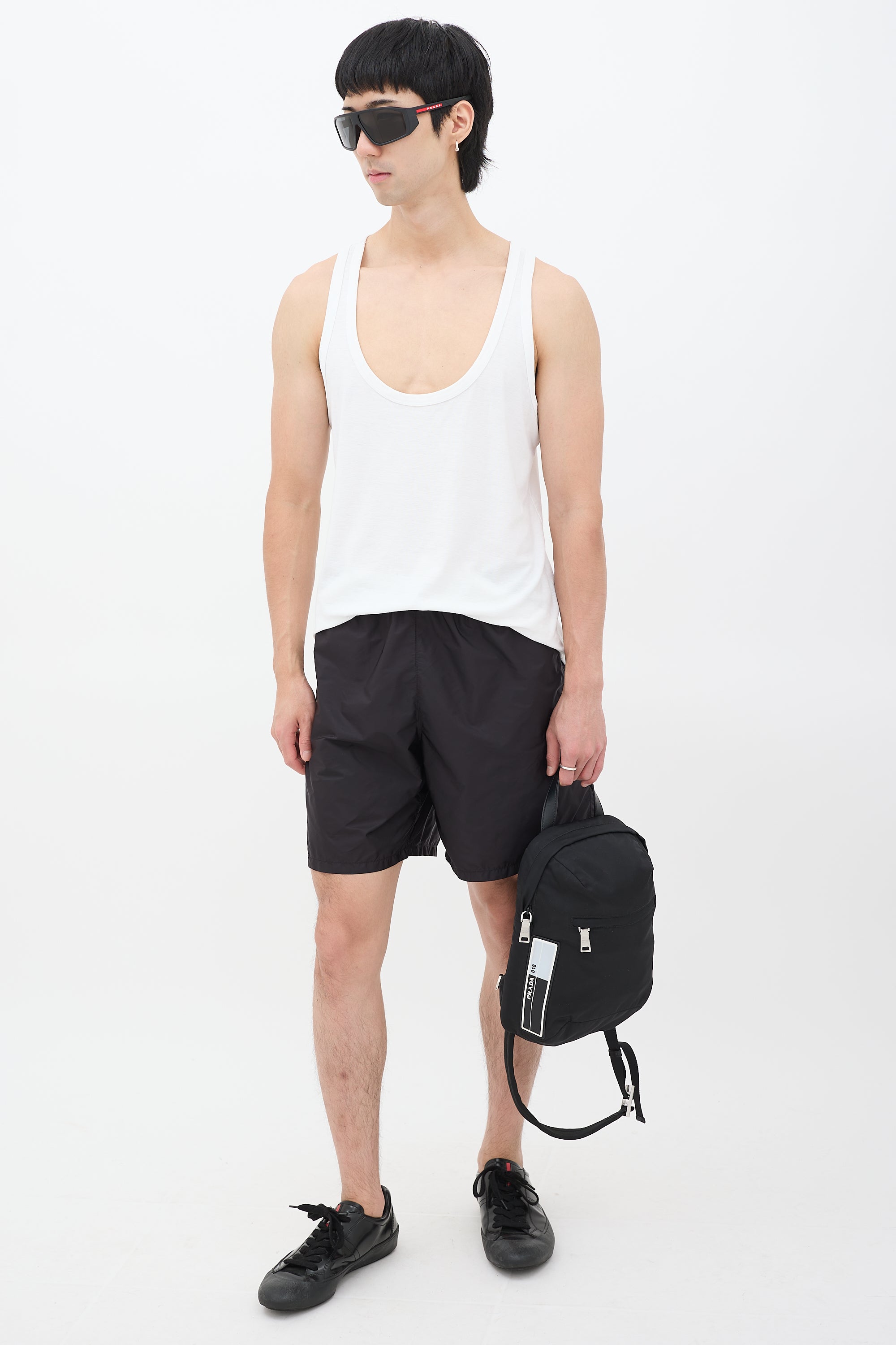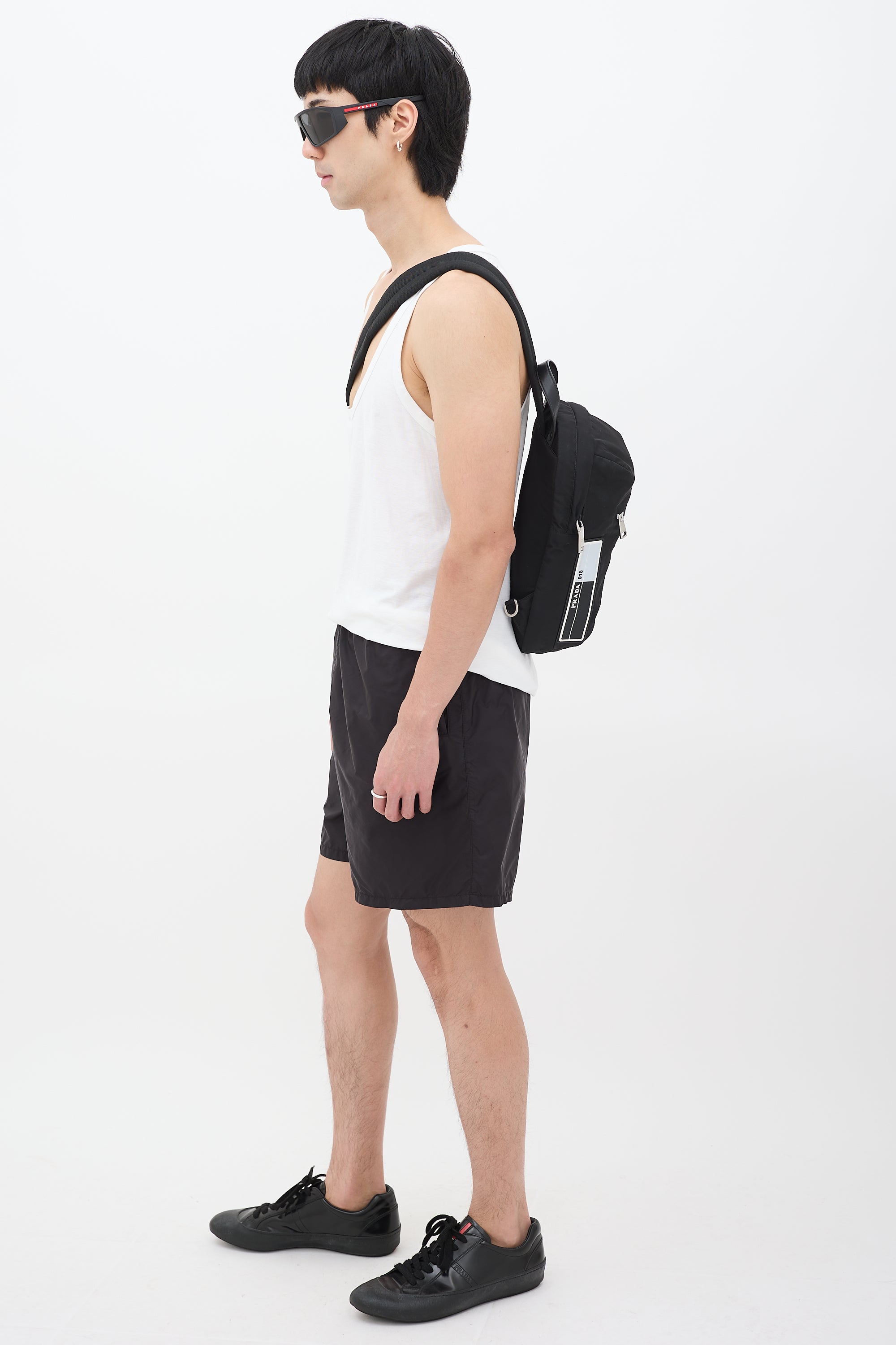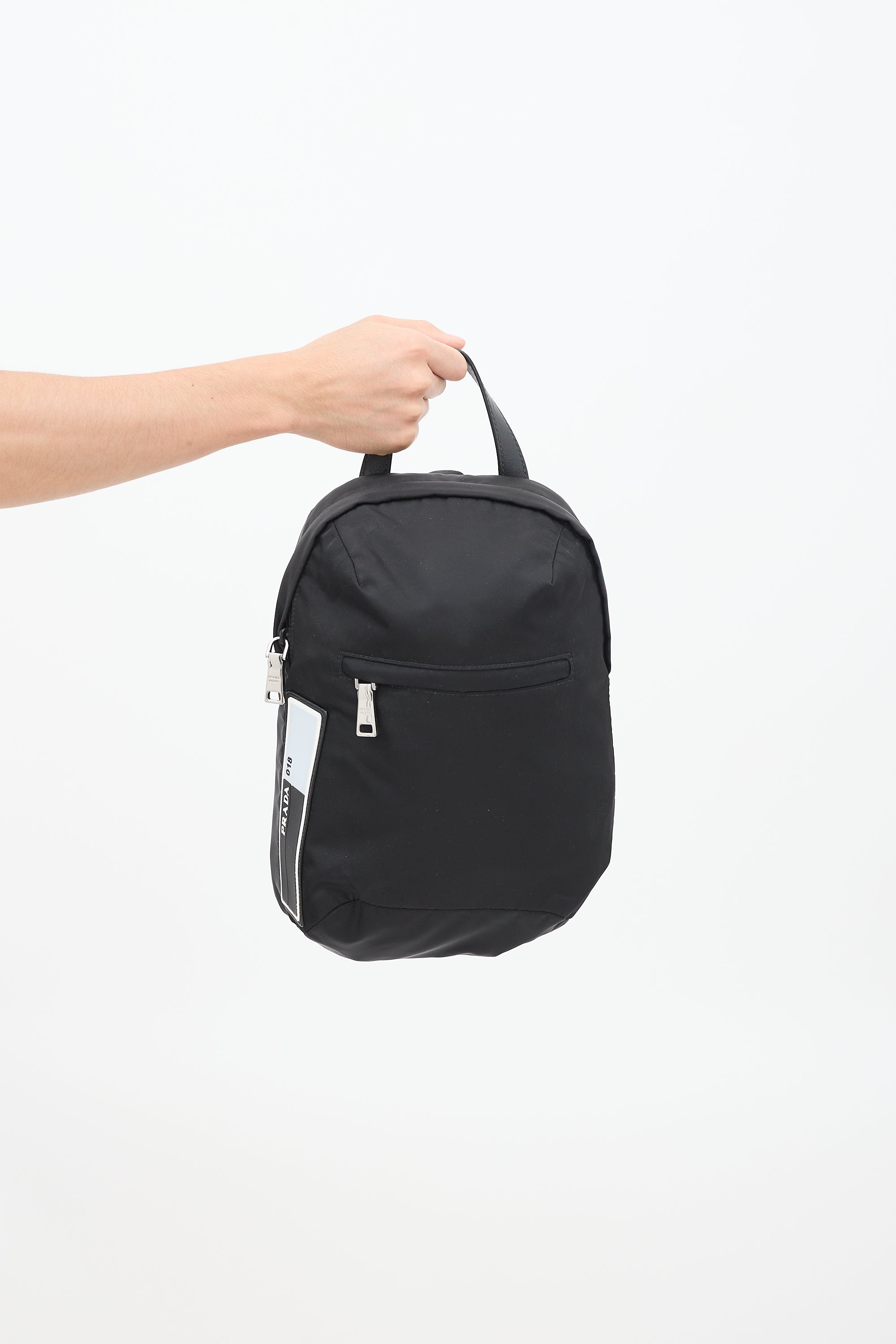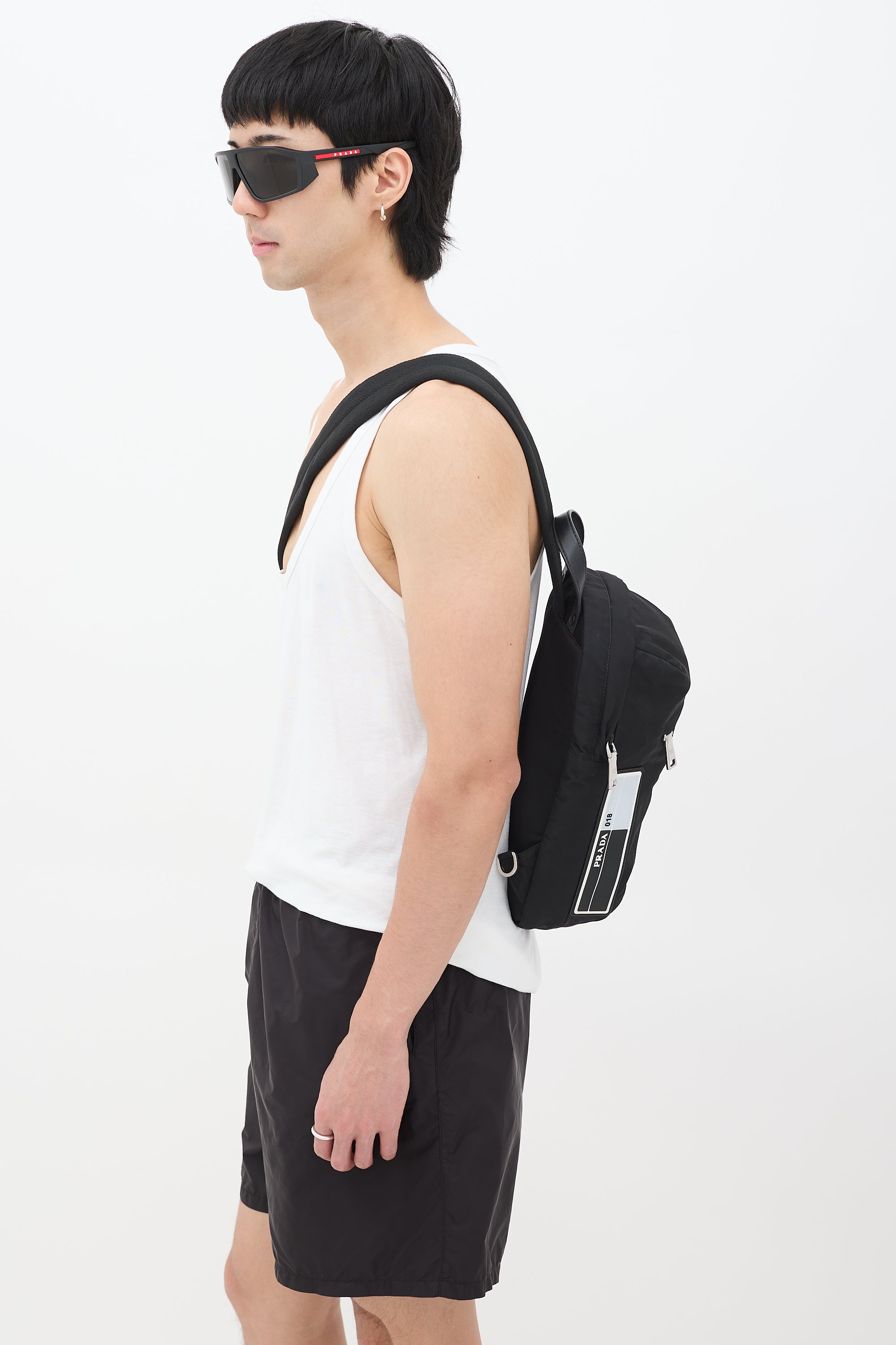 Pre-owned Prada black nylon sling backpack featuring tonal stitching, silver tone hardware, single flat leather top handle, single adjustable webbed strap, rubber logo panel at left side, single exterior zip compartment at front, and one main compartment with one zip pocket, one slip pocket, and zip closure. Comes with original dust bag.