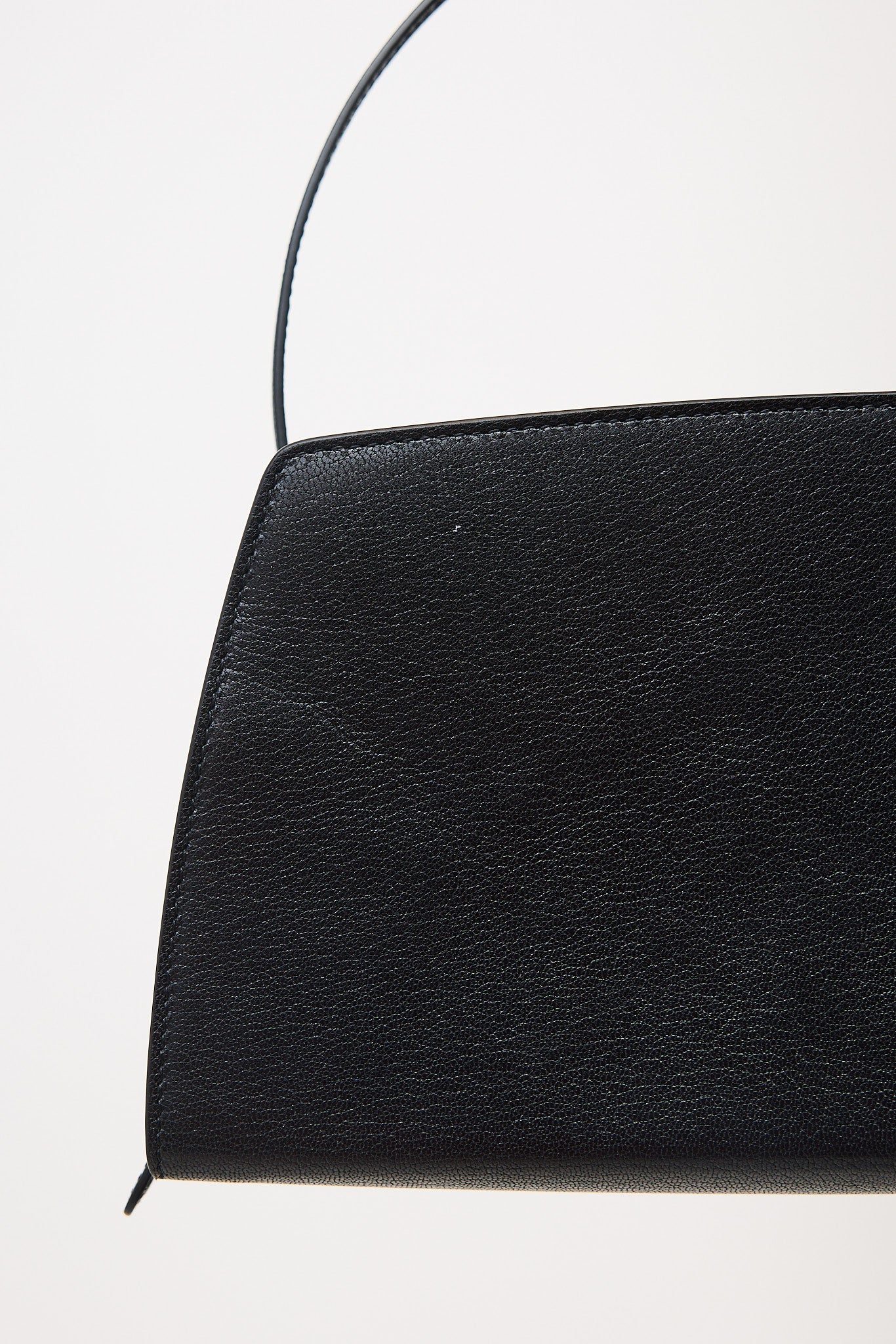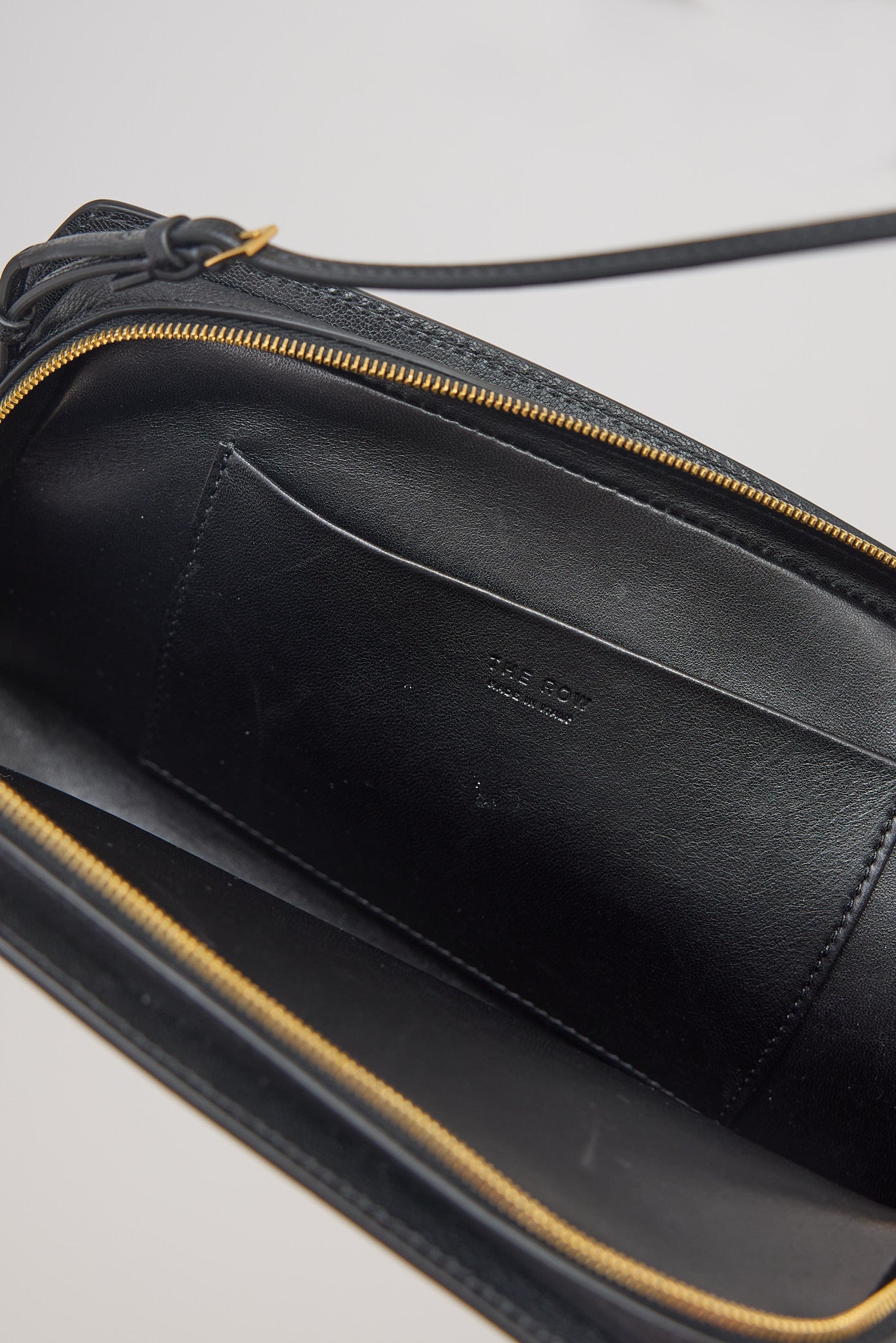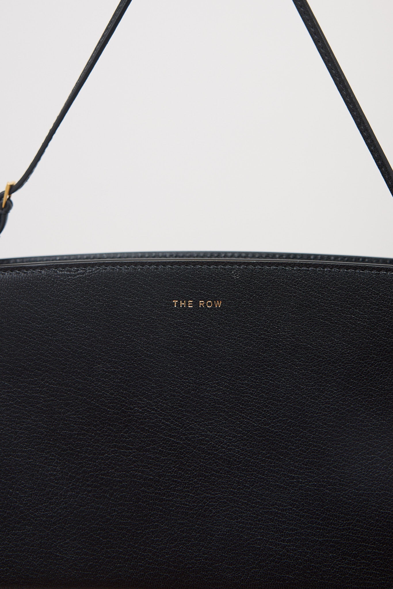 Pre-owned The Row black leather Dalia Baguette bag featuring an adjustable shoulder strap, gold stamped logo at front face, top zip closure, and one main compartment with one slip pocket.