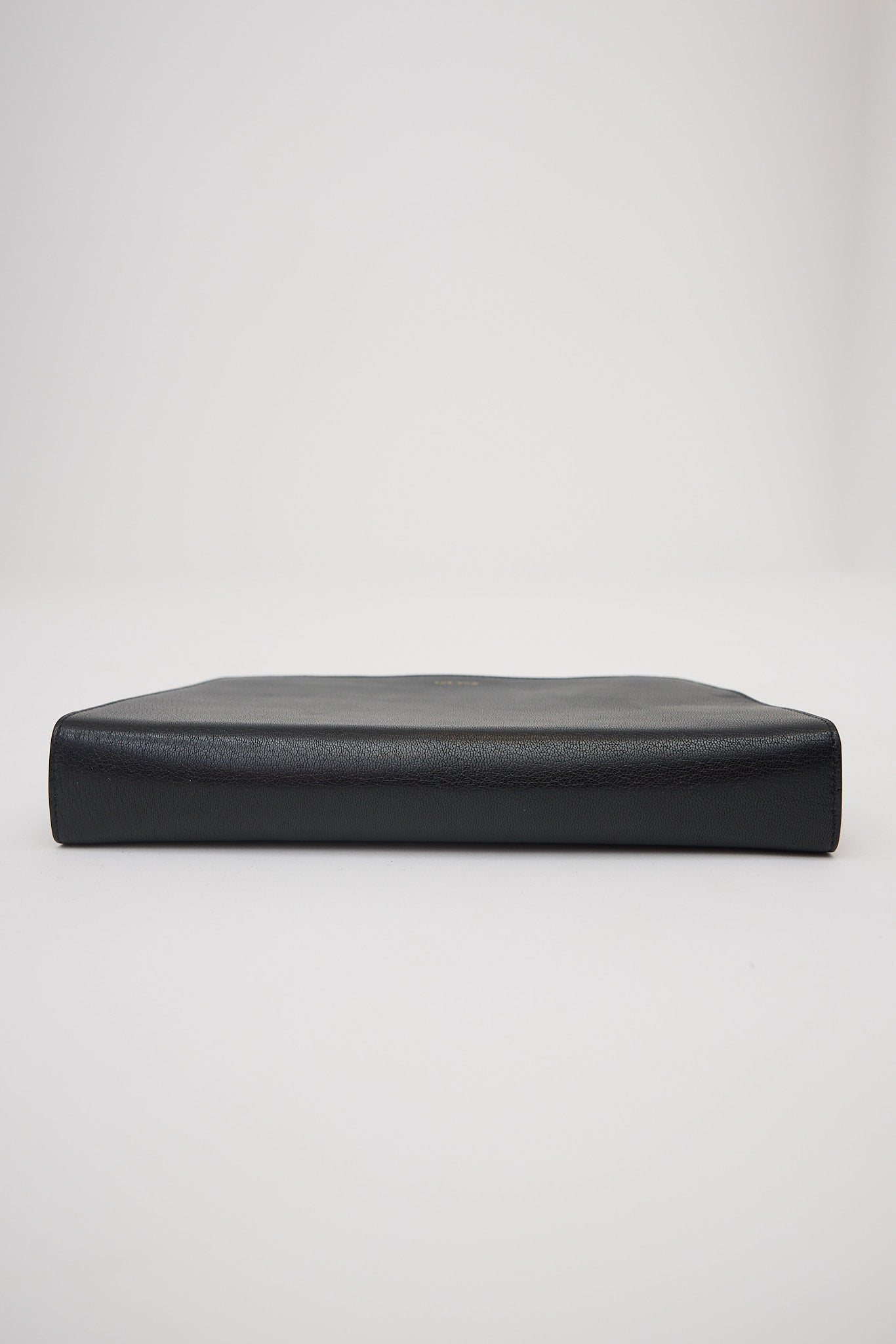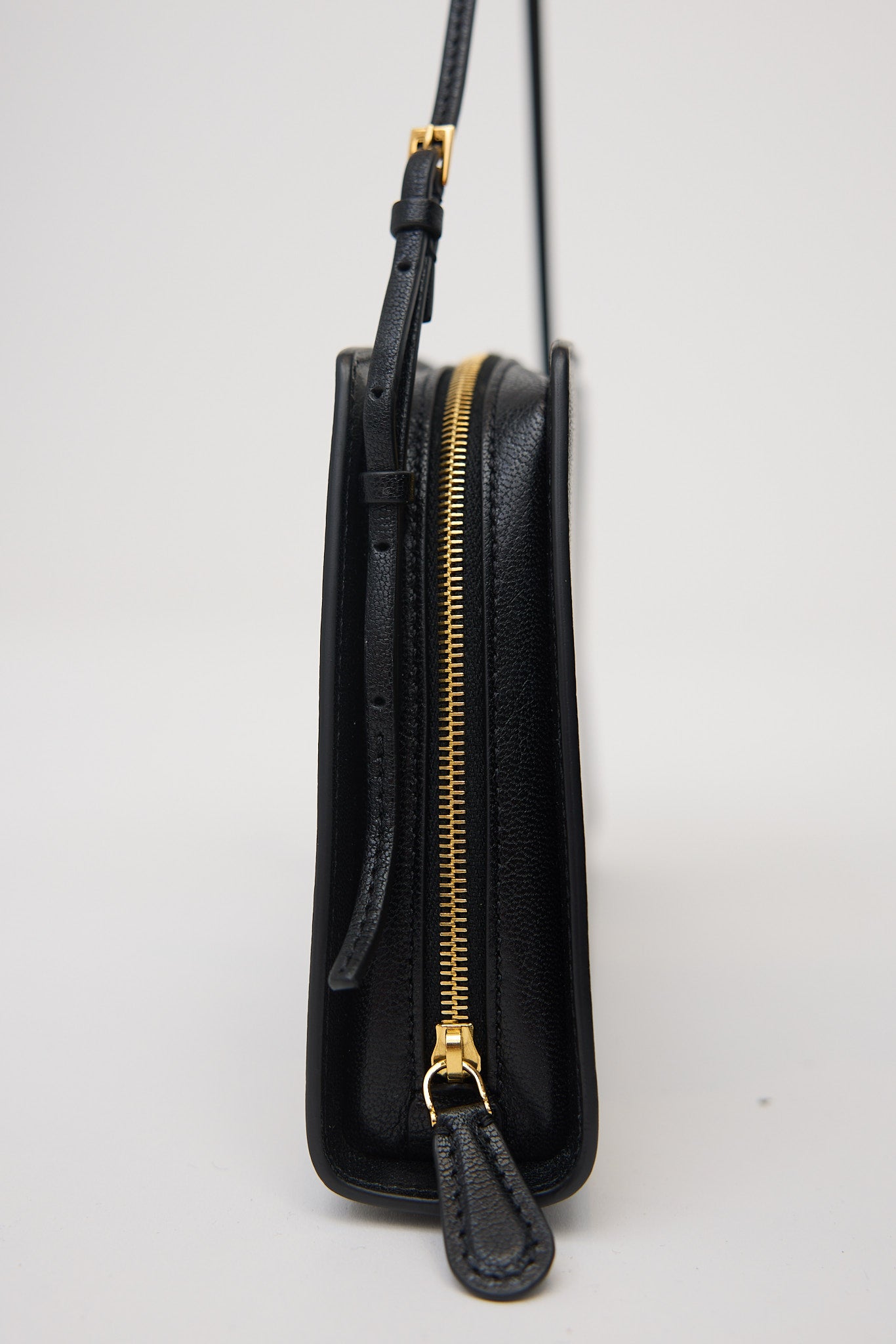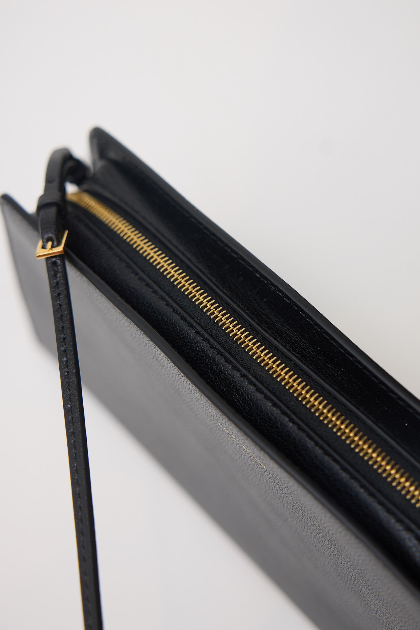 Pre-owned The Row black leather Dalia Baguette bag featuring an adjustable shoulder strap, gold stamped logo at front face, top zip closure, and one main compartment with one slip pocket.
