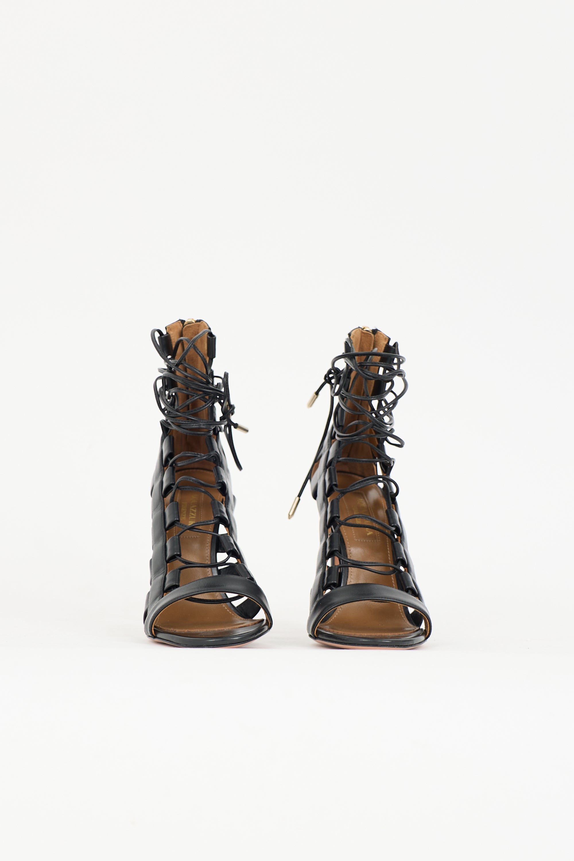 Pre-owned Aquazzura black Amazon heels featuring pointed toe, zip closure at back, covered stiletto heel, and wraparound tie with gold tone tips. Includes original dust bag.