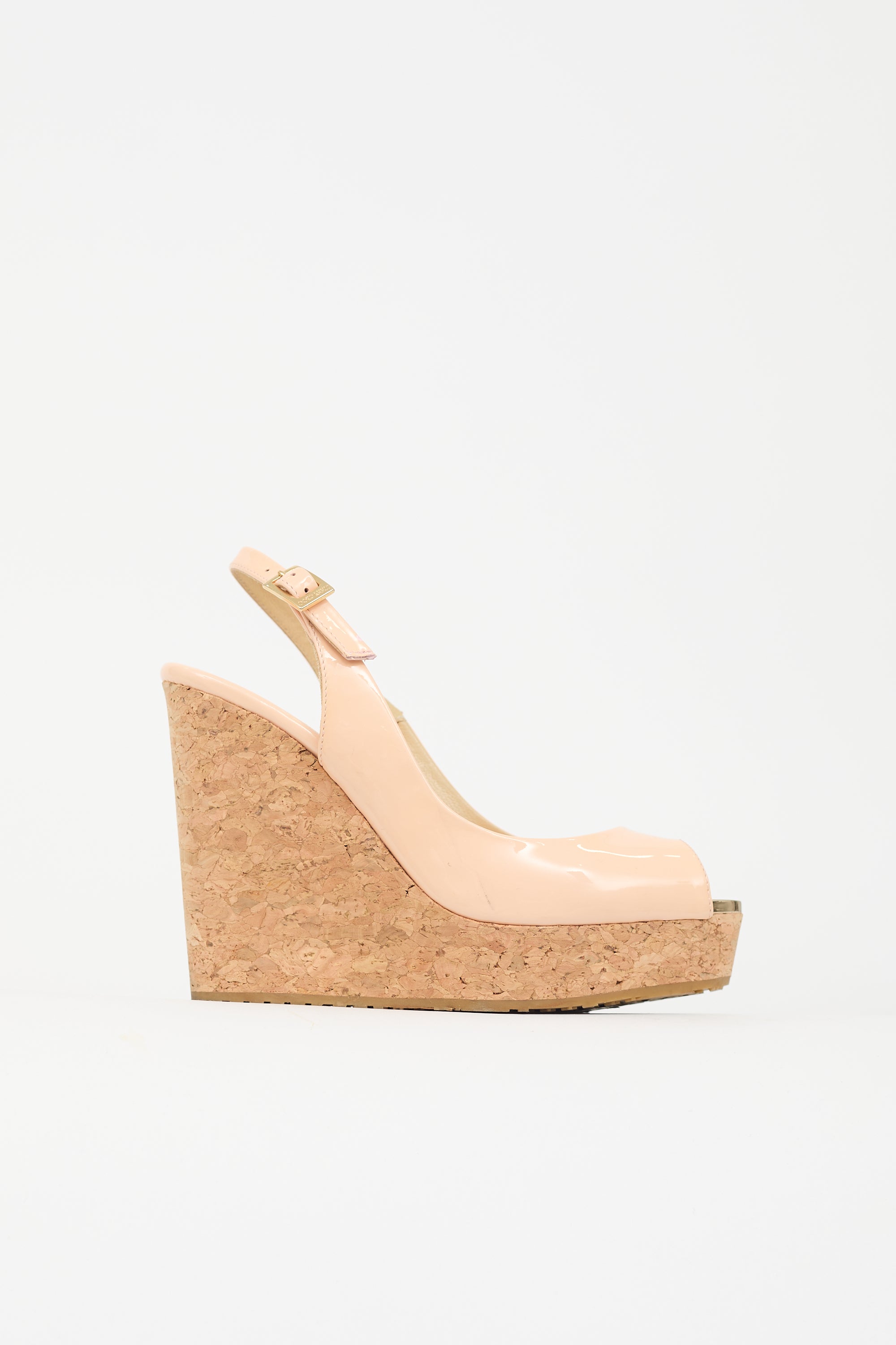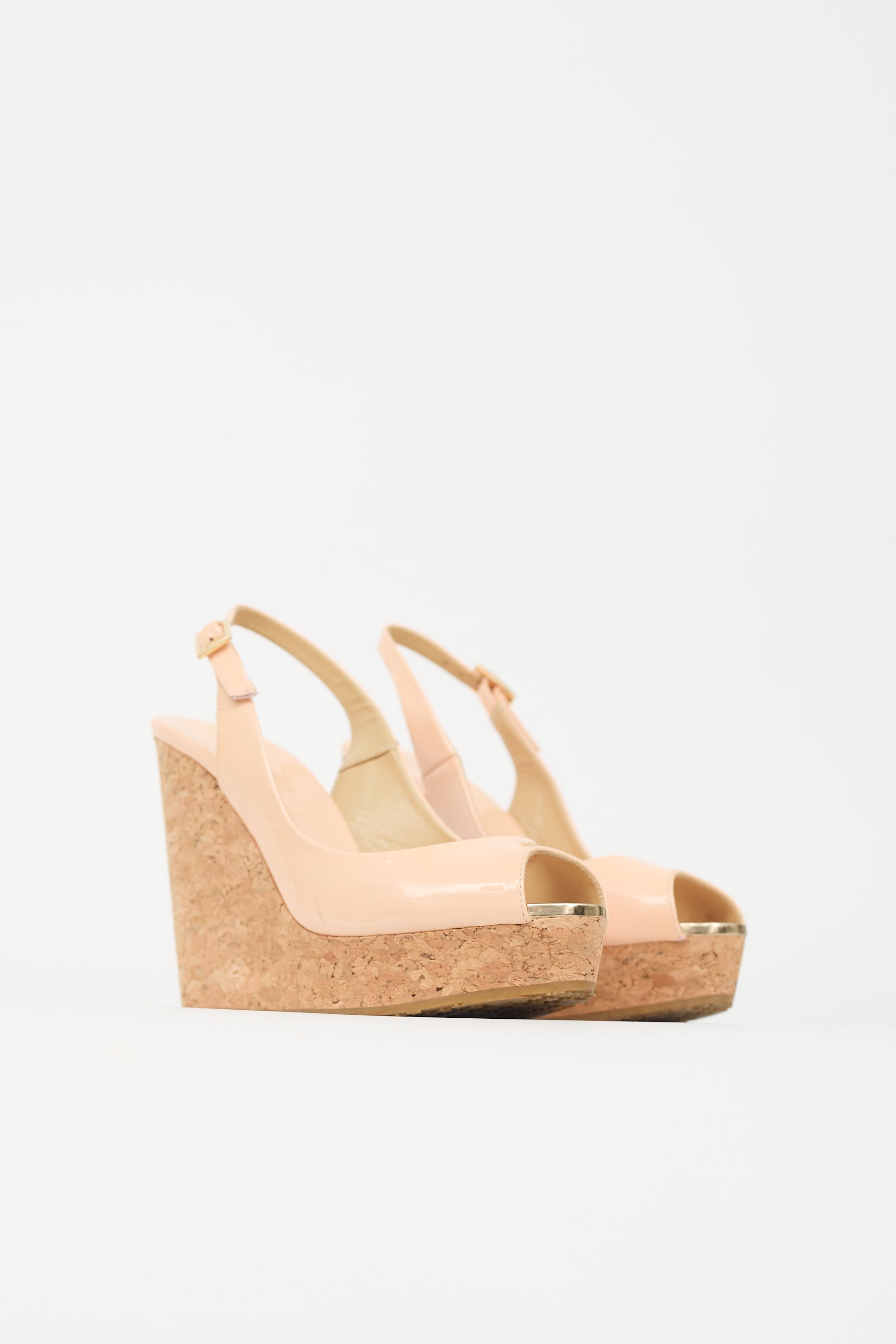 Pre-owned Jimmy Choo pink patent leather Prova heels featuring a rounded peep toe with gold tone logo embossed plate, adjustable slingback ankle strap, and cork wedge and platform.