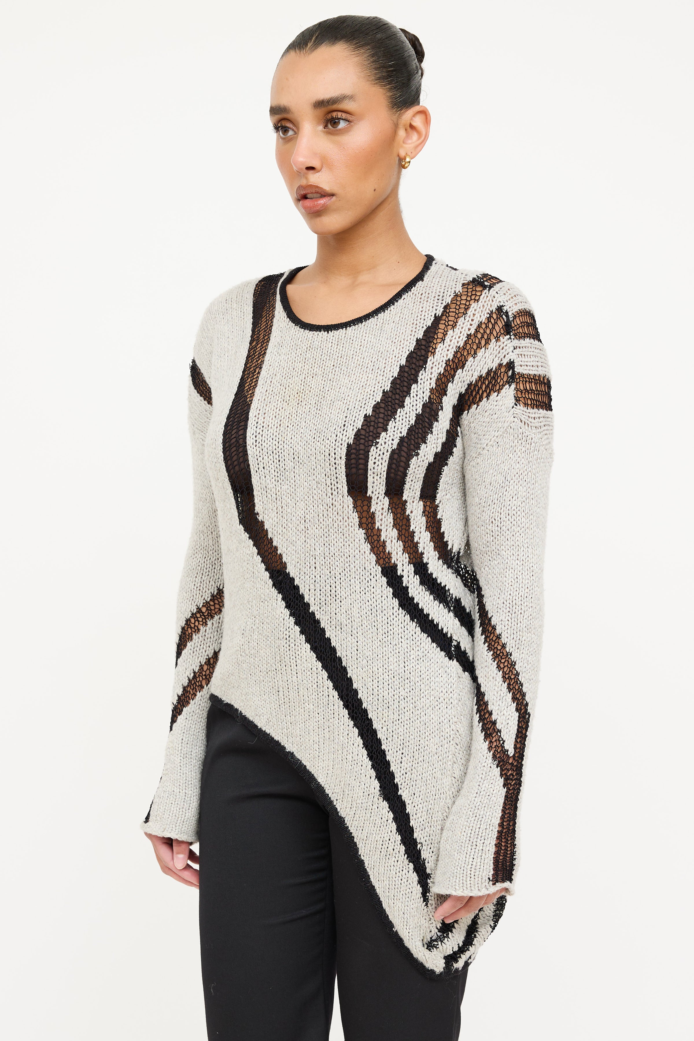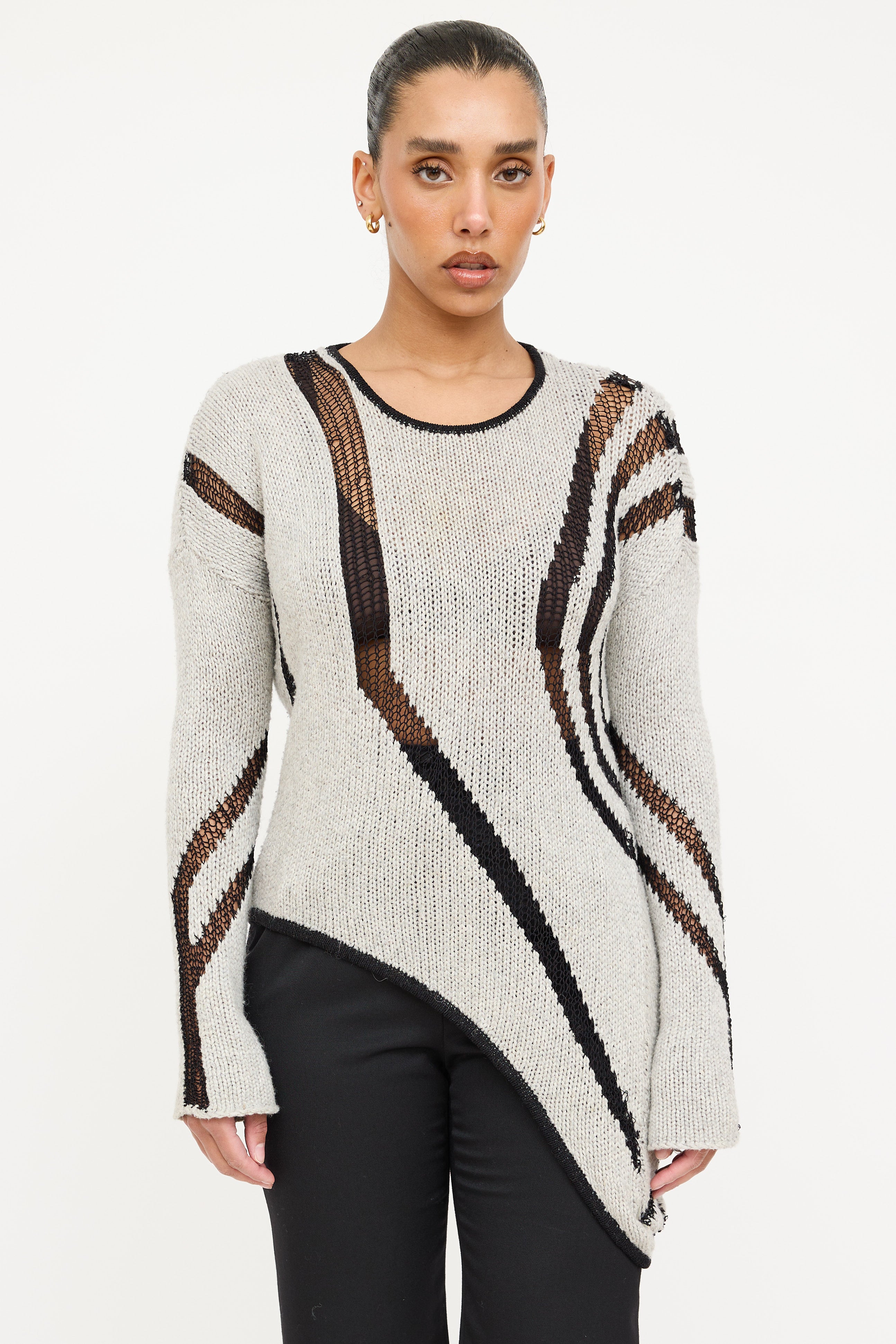 Pre-owned Helmut Lang grey knit sweater featuring black open weave inserts throughout, round neckline, long sleeves, and asymmetrical hem.
