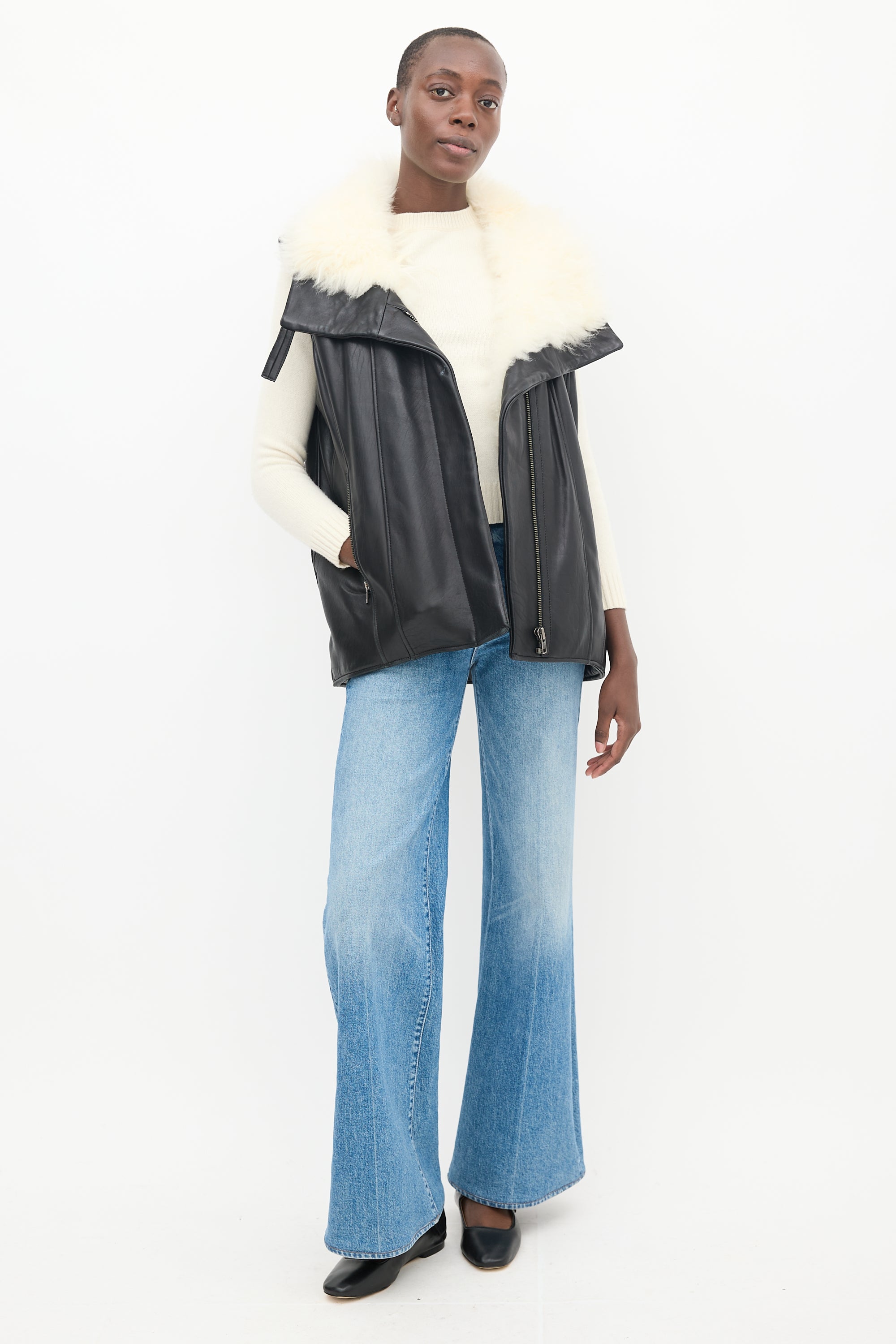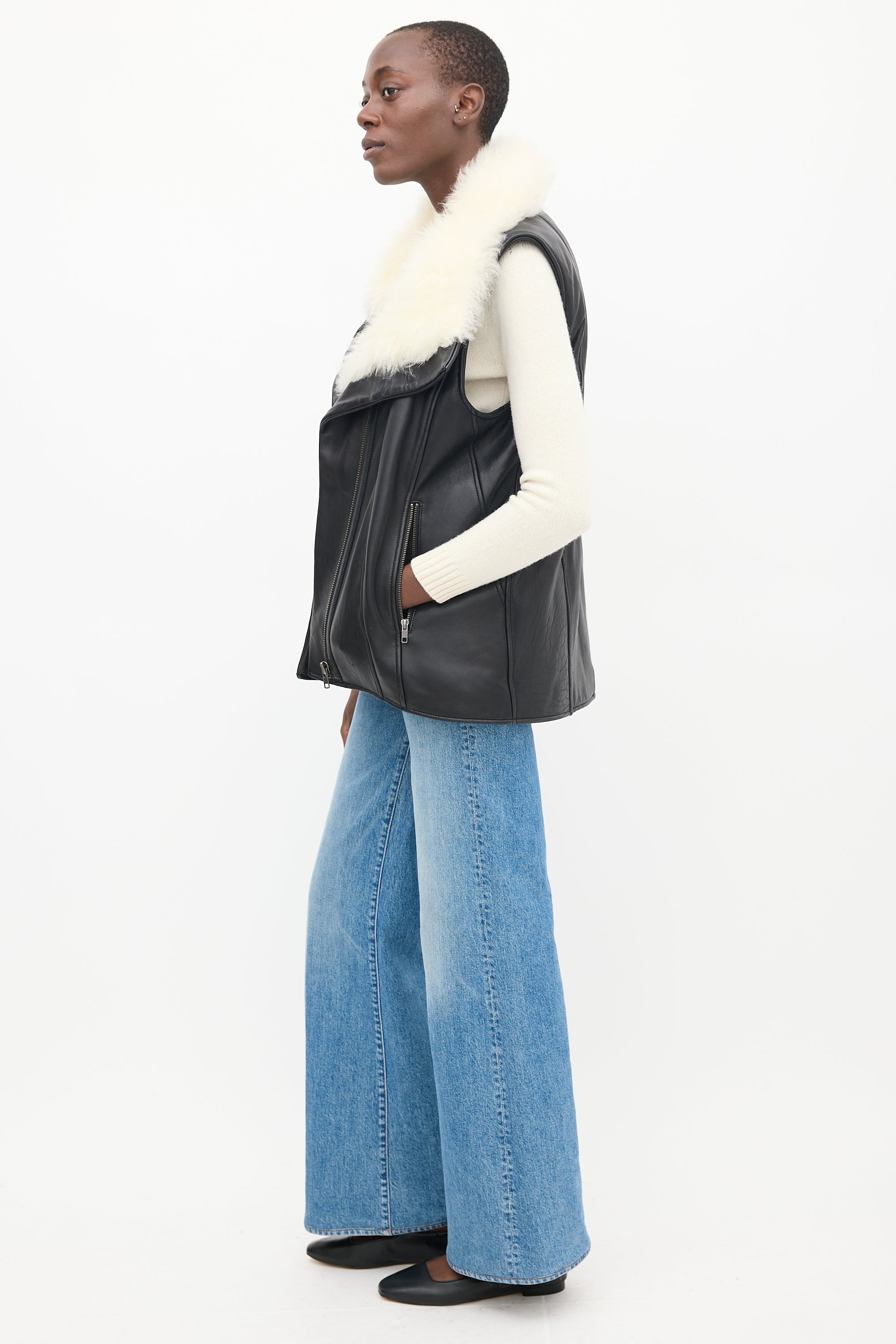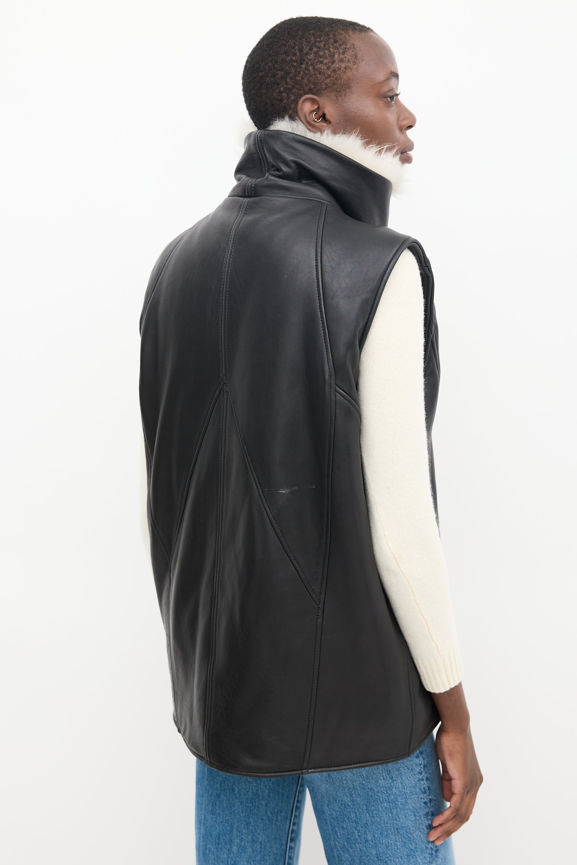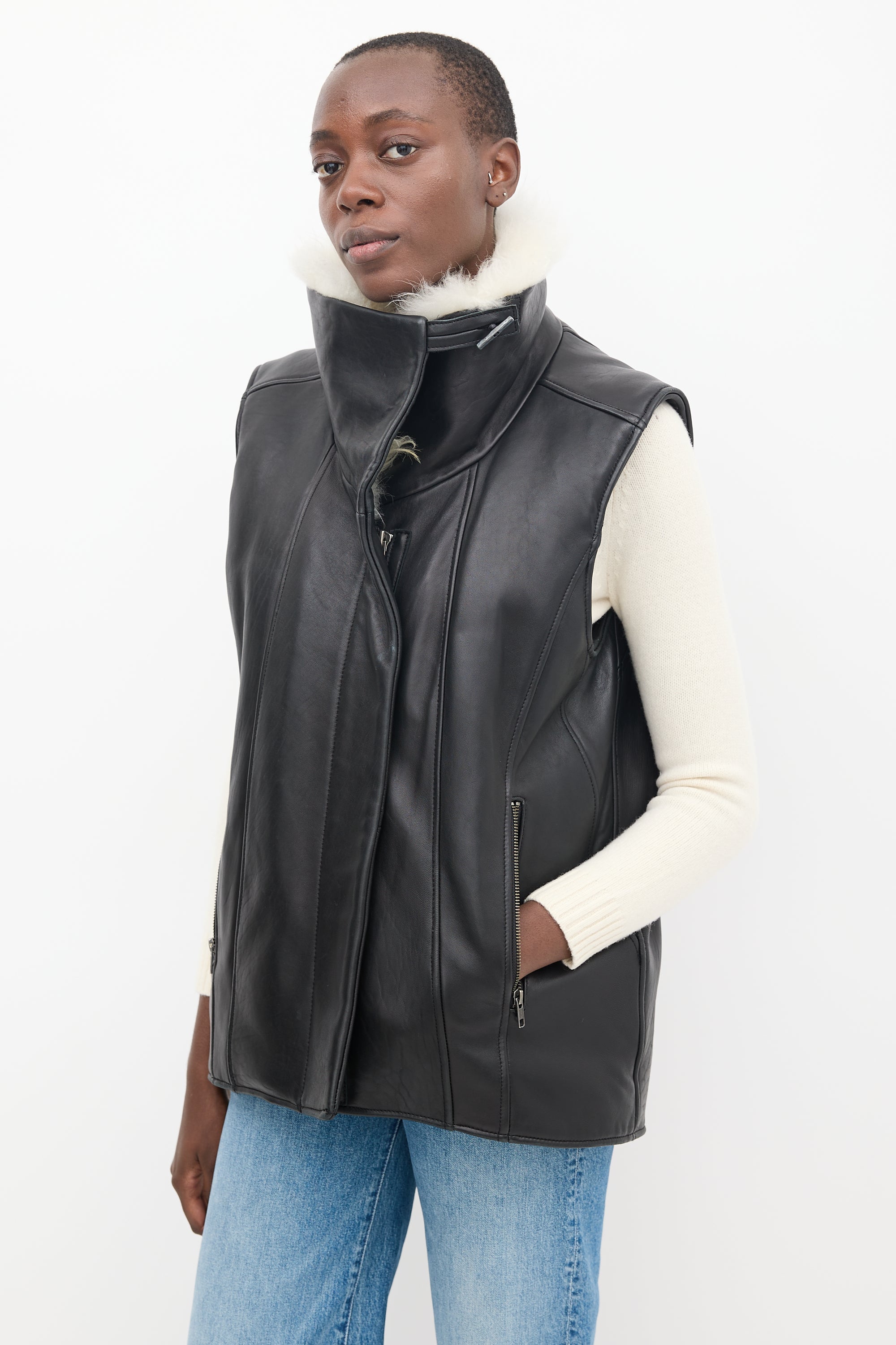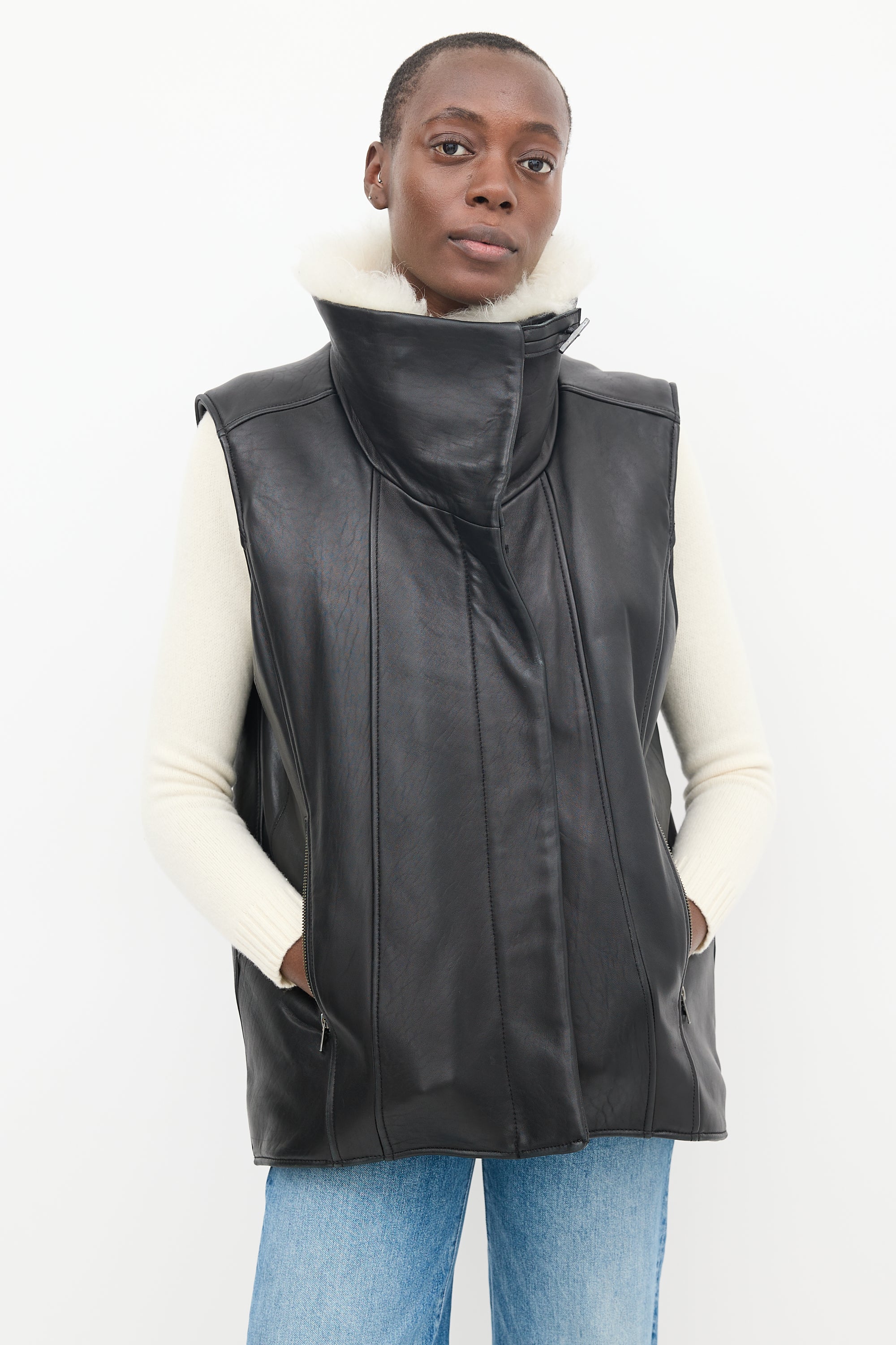 Pre-owned Helmut Lang black leather vest featurng a cream shearling collar, sleeveless styling, two zip pockets at hip, and zip closure. Lined.