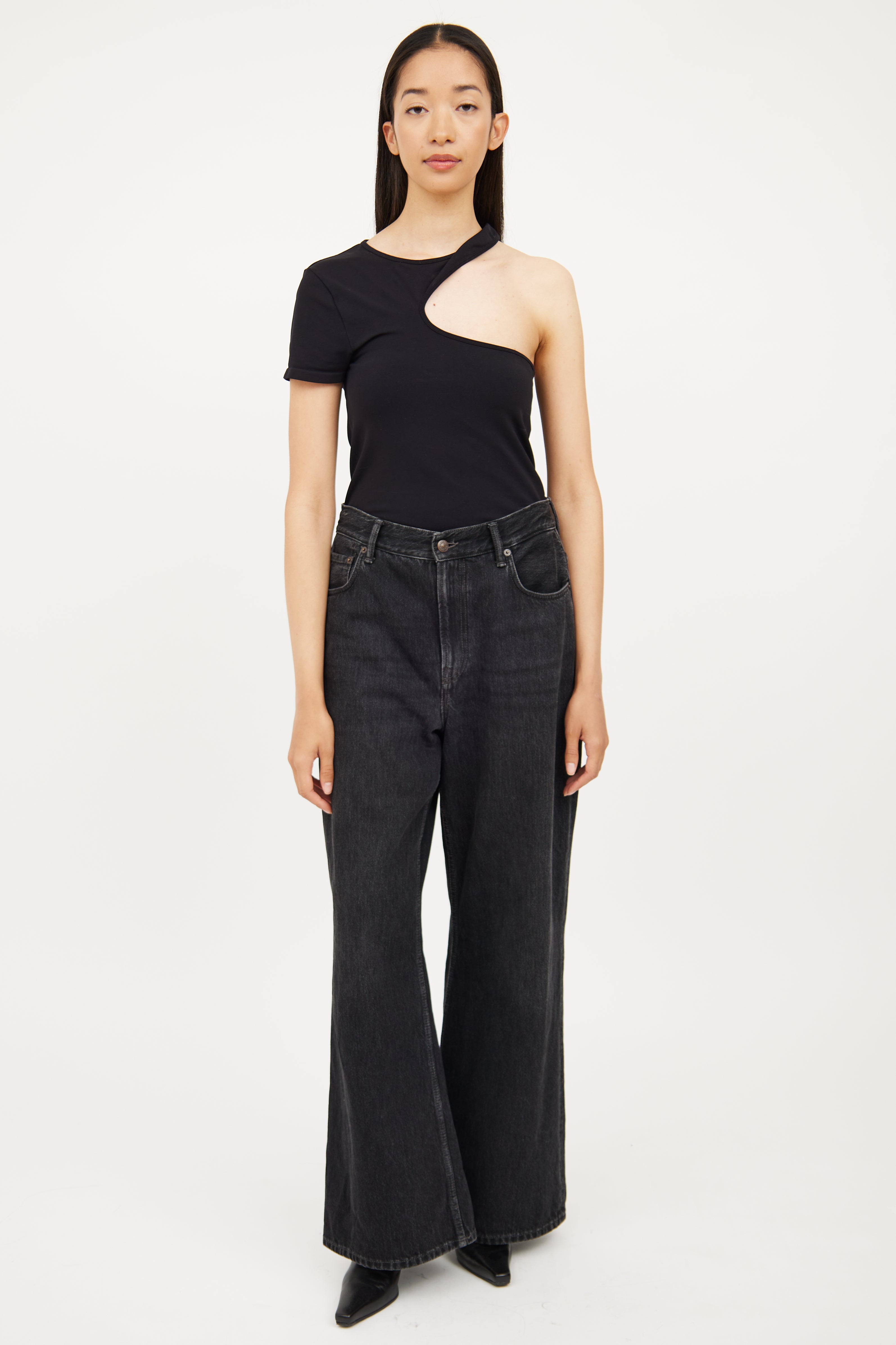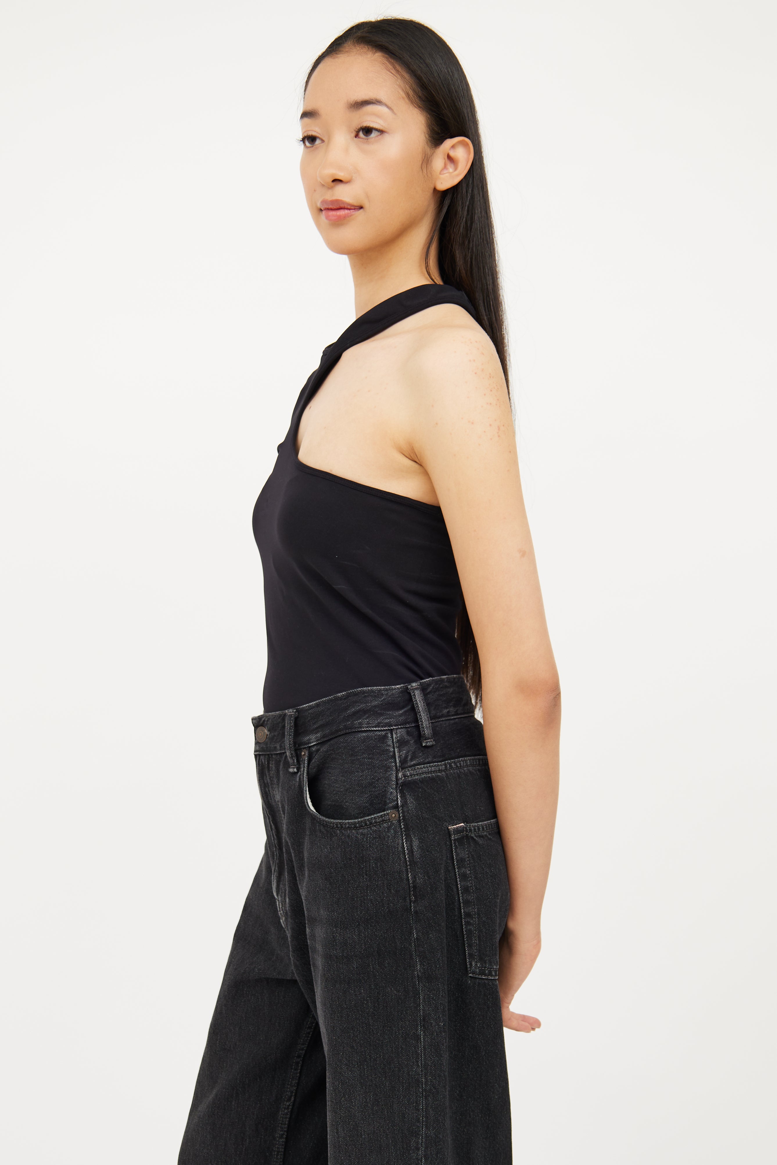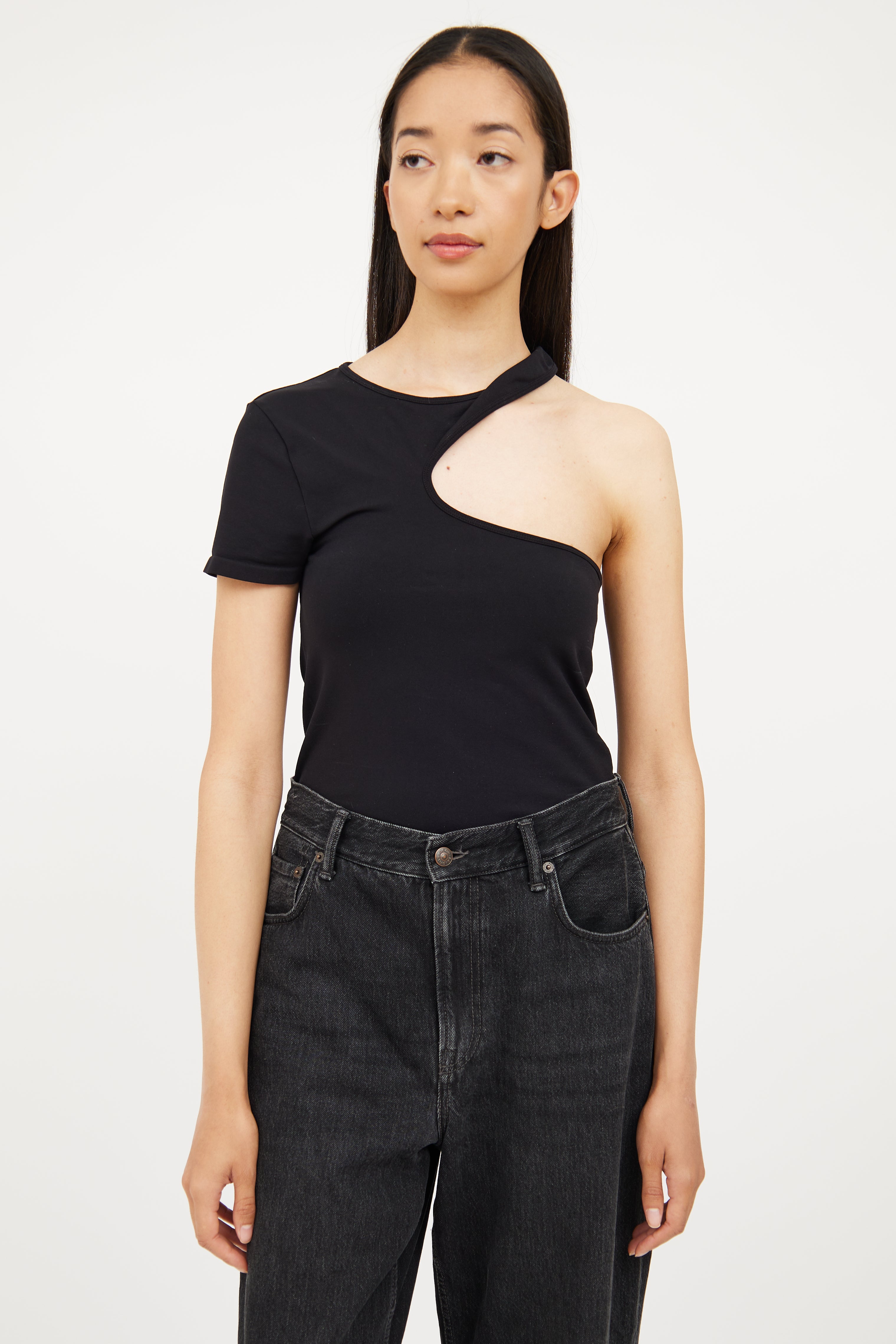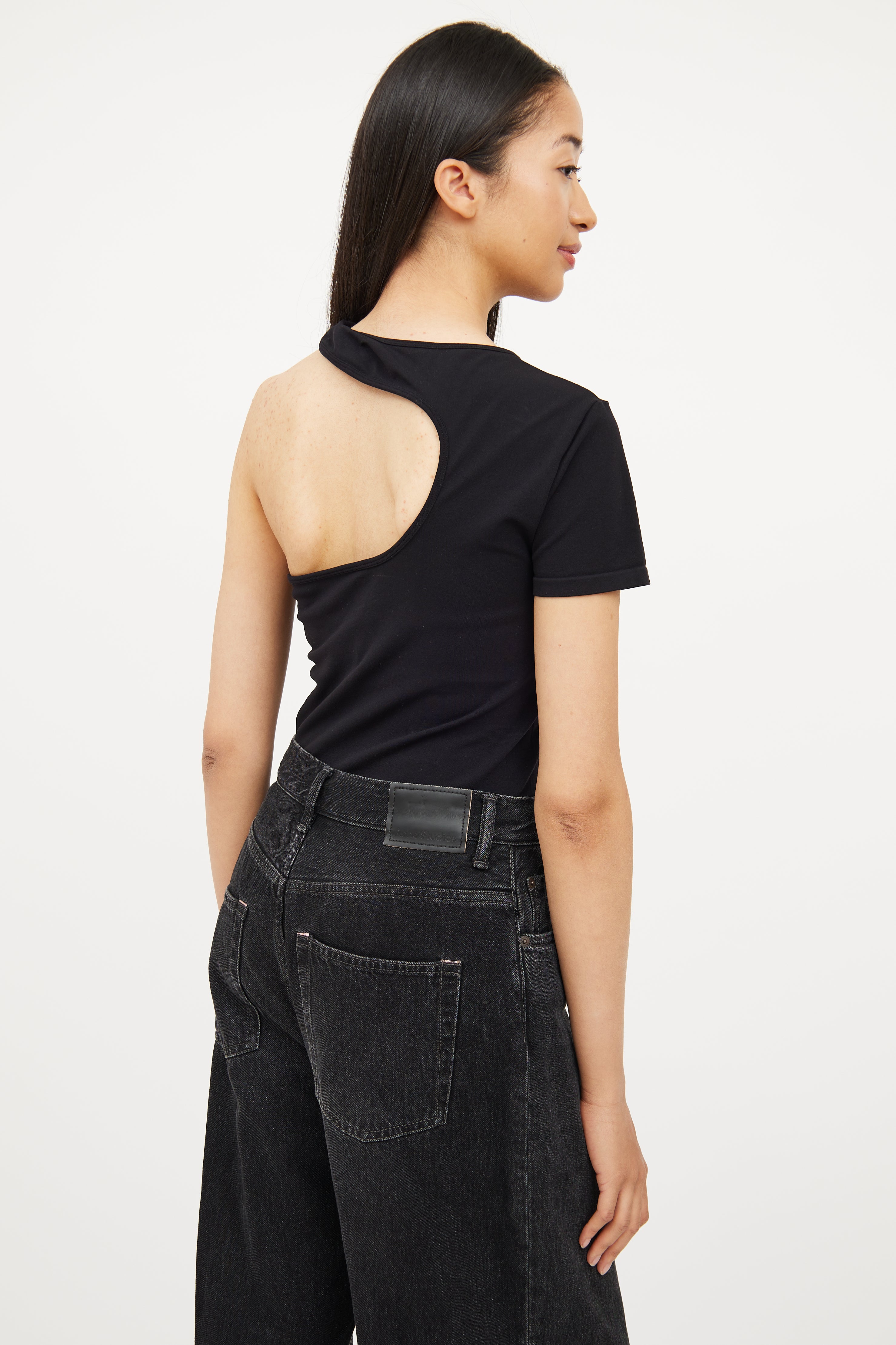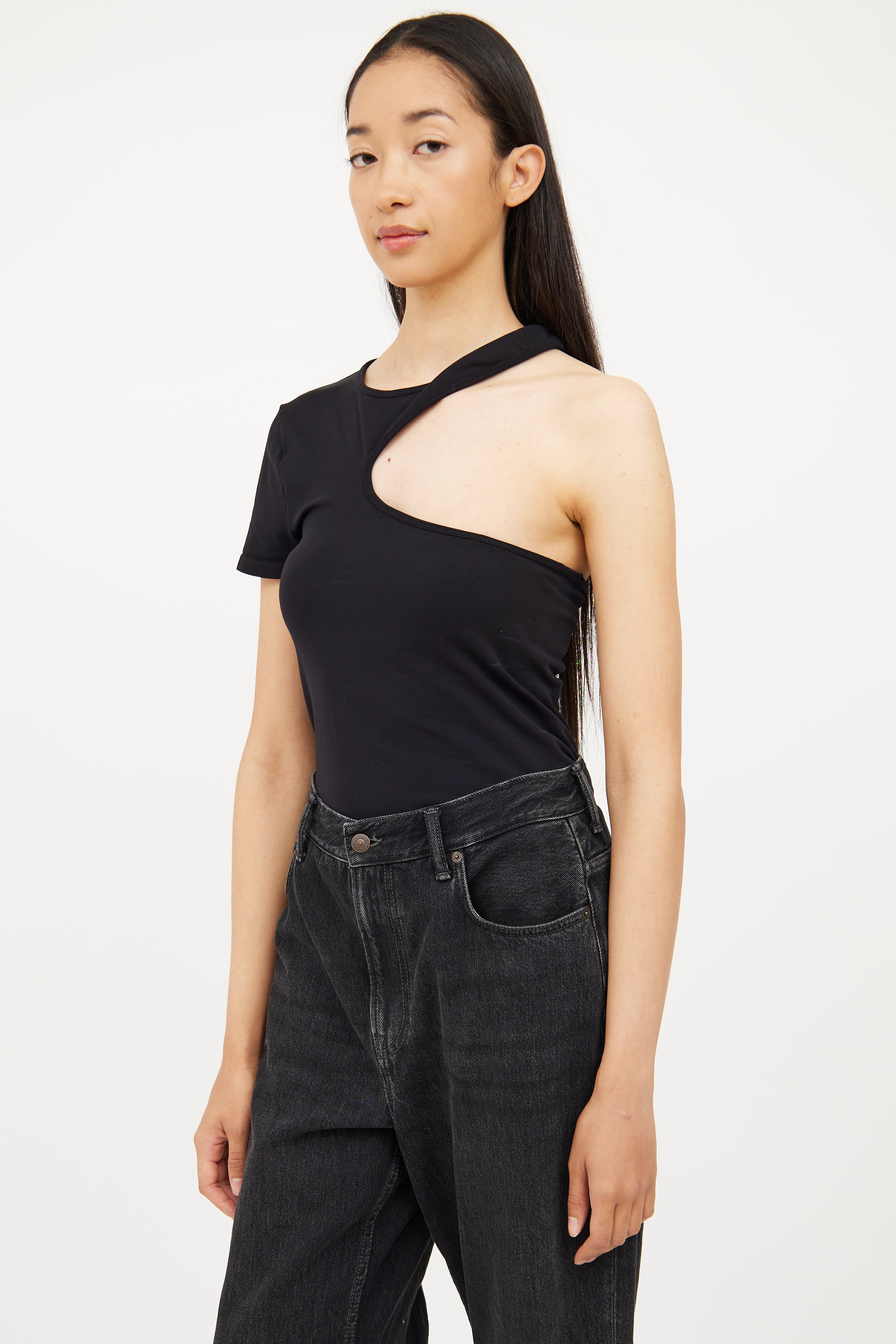 Pre-owned Helmut Lang black short sleeve top featuring round neck, right short sleeve and cut out on left shoulder.