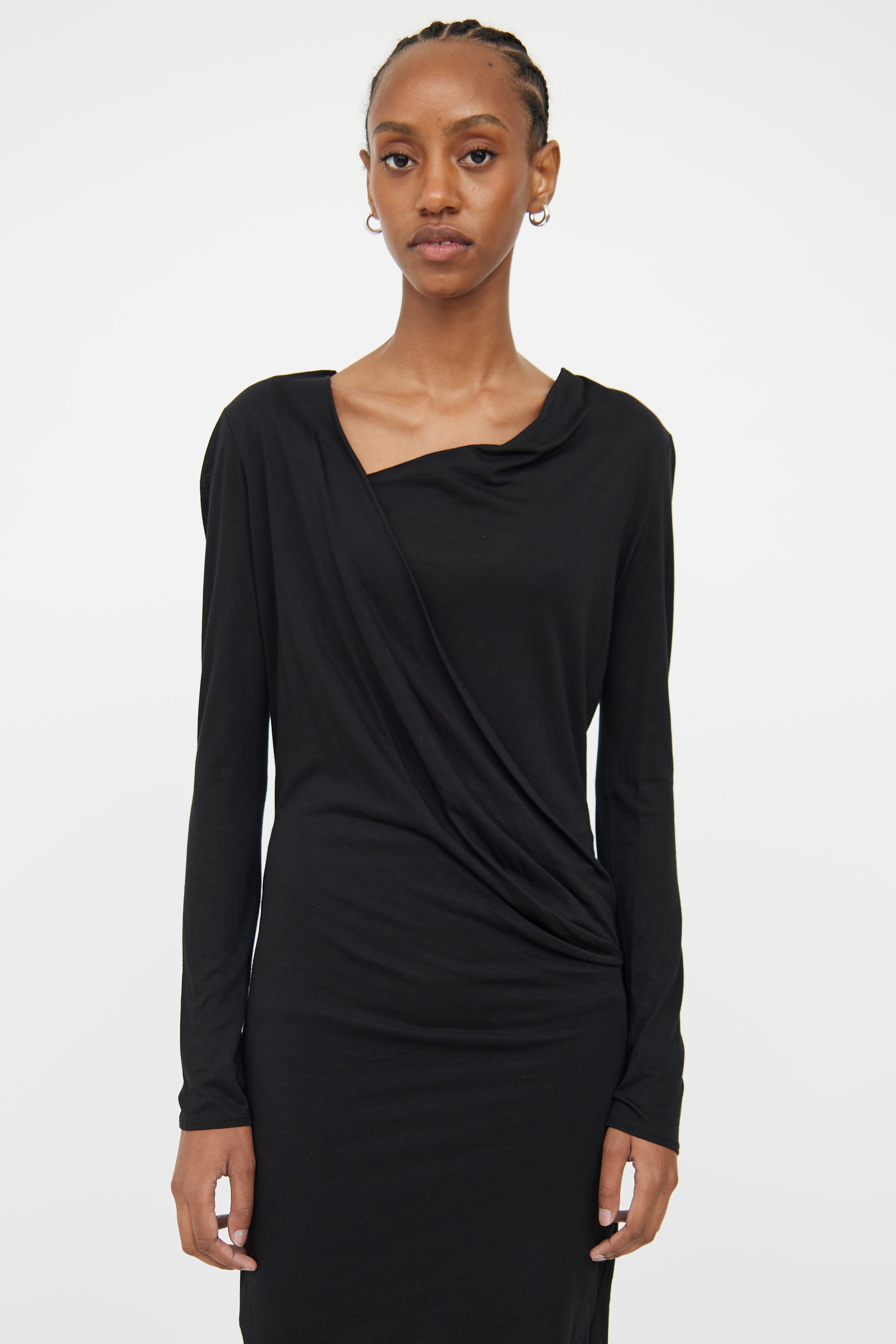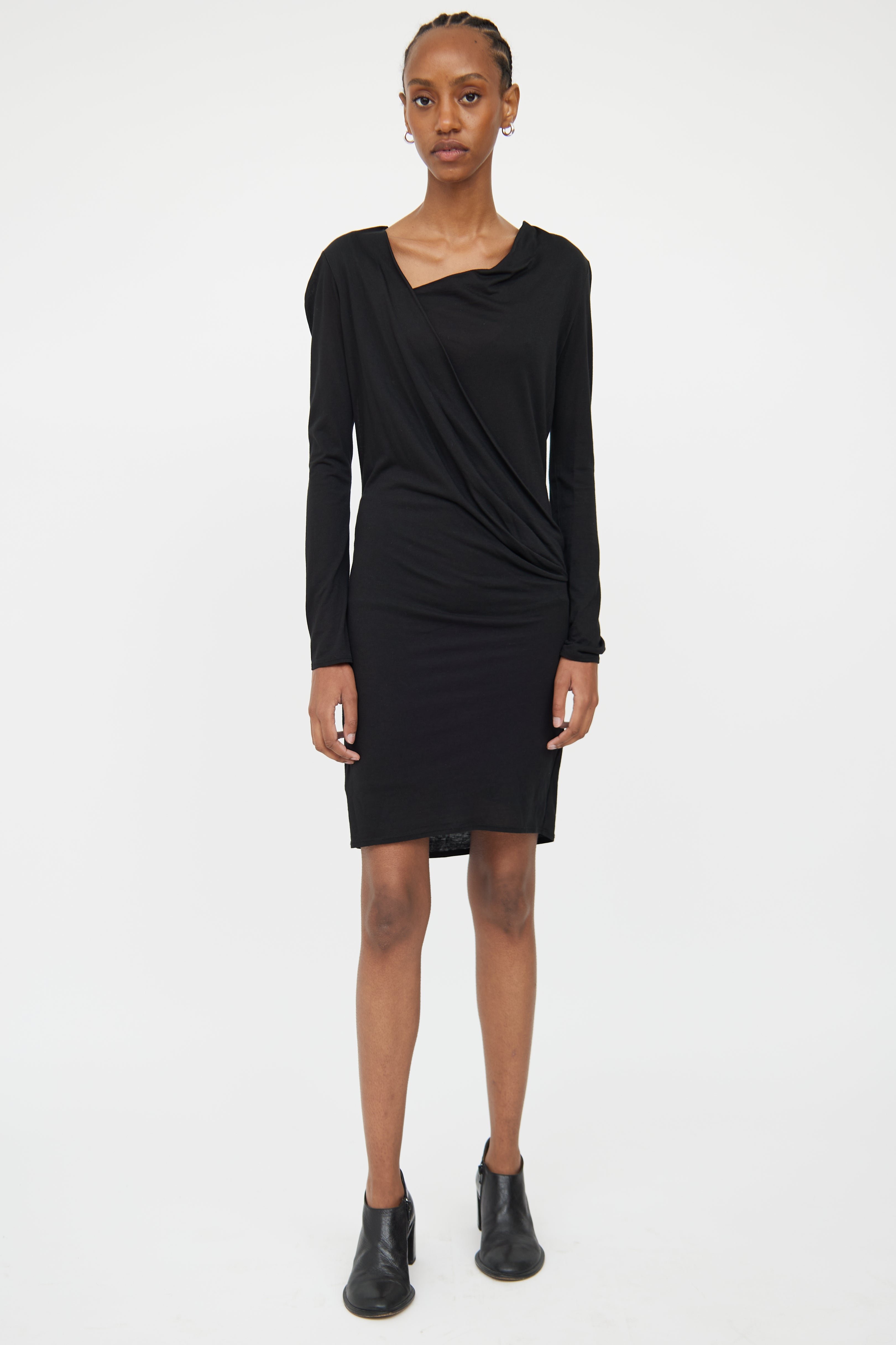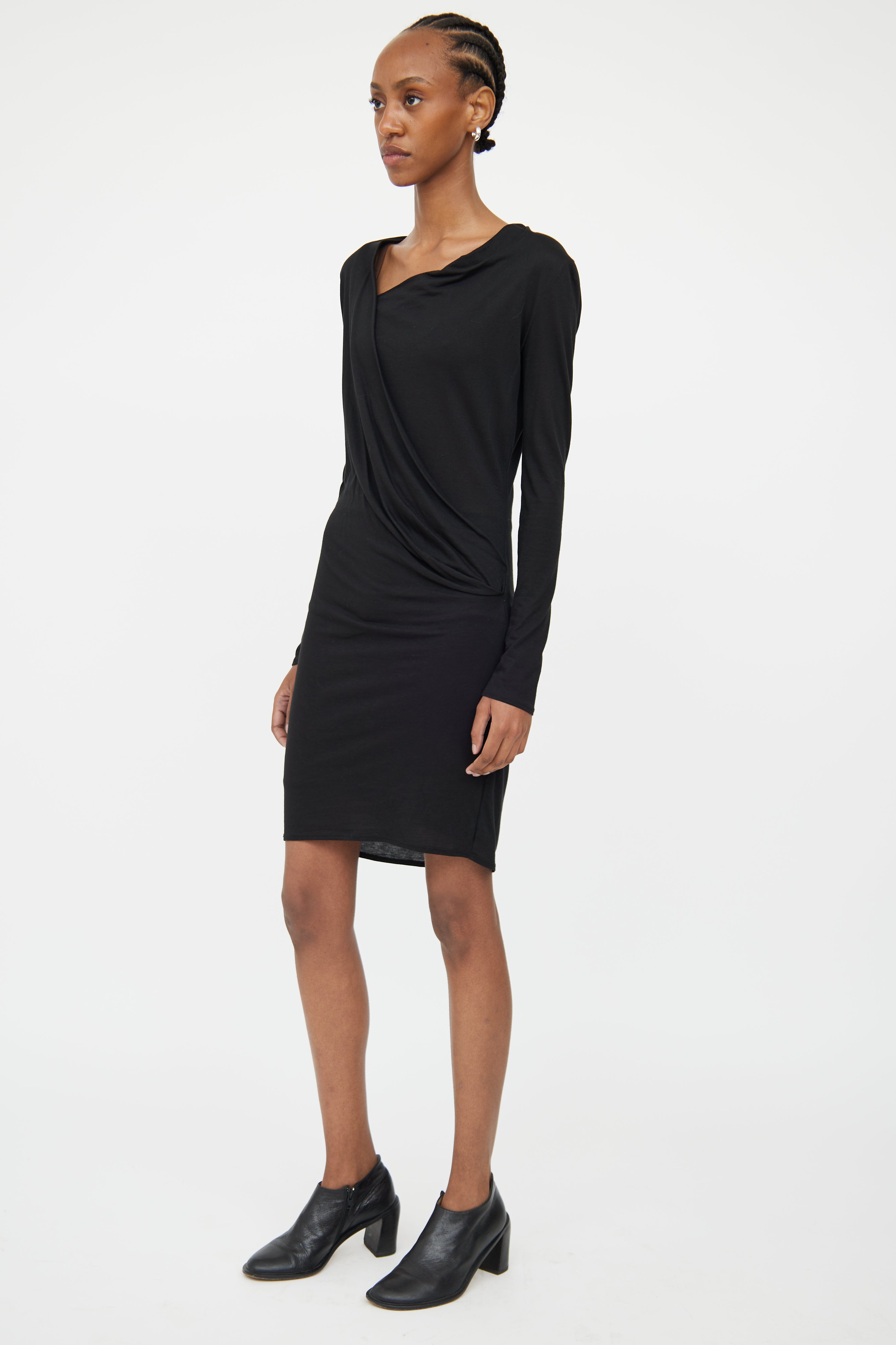 Pre-owned Helmut Lang black fitted dress featuring asymmetrical cowl neckline, long sleeves and draped panel detail at front.