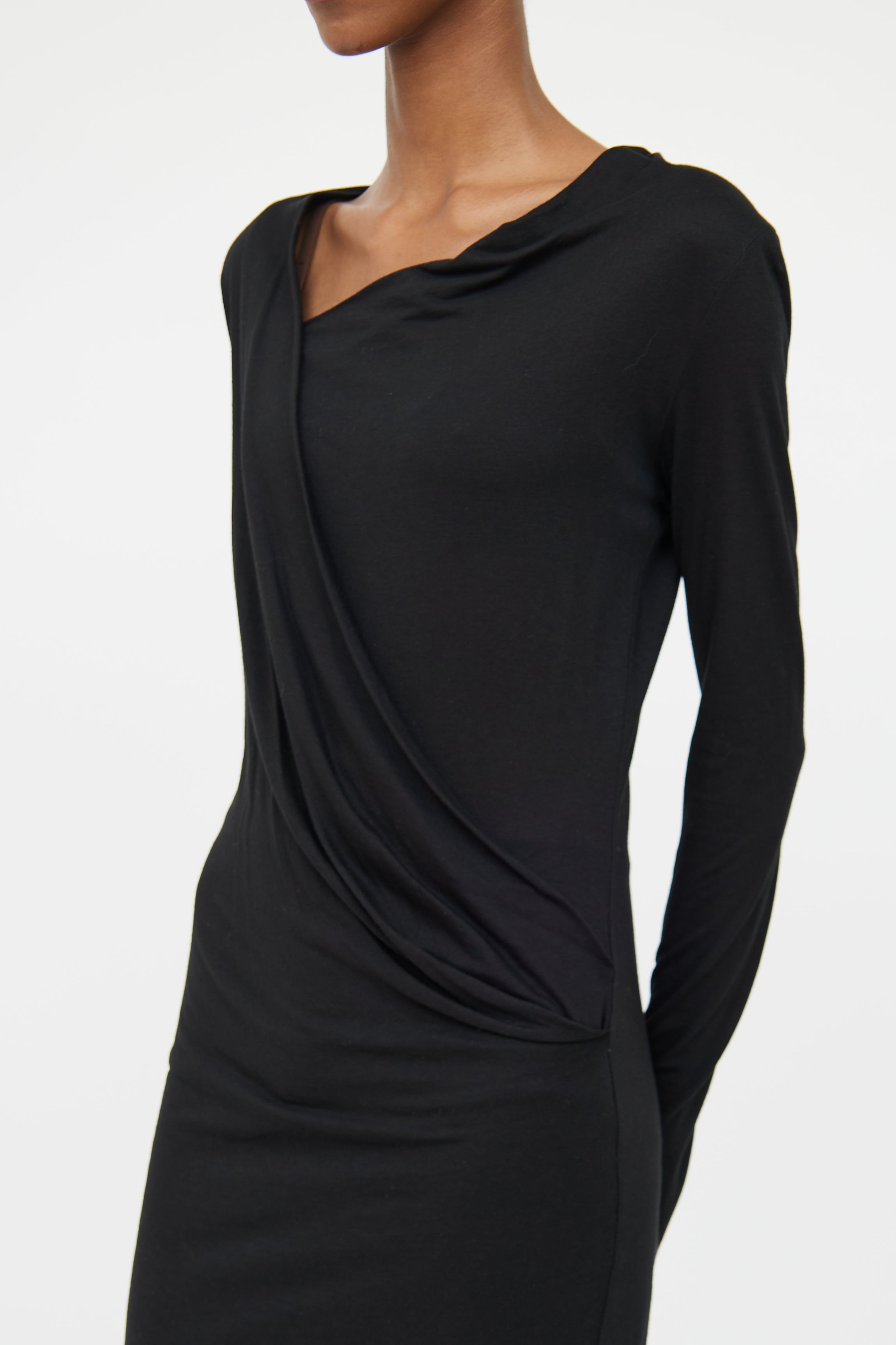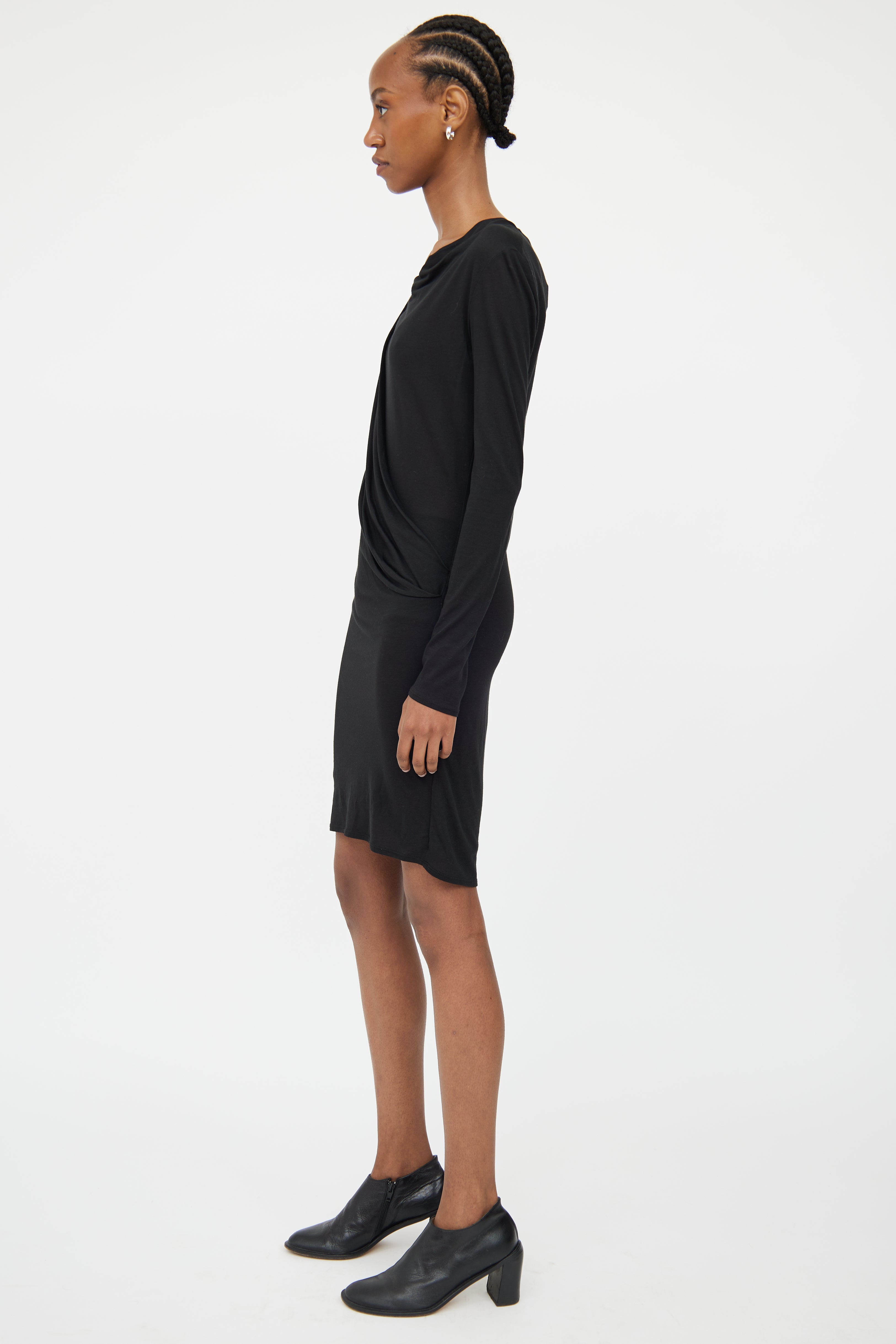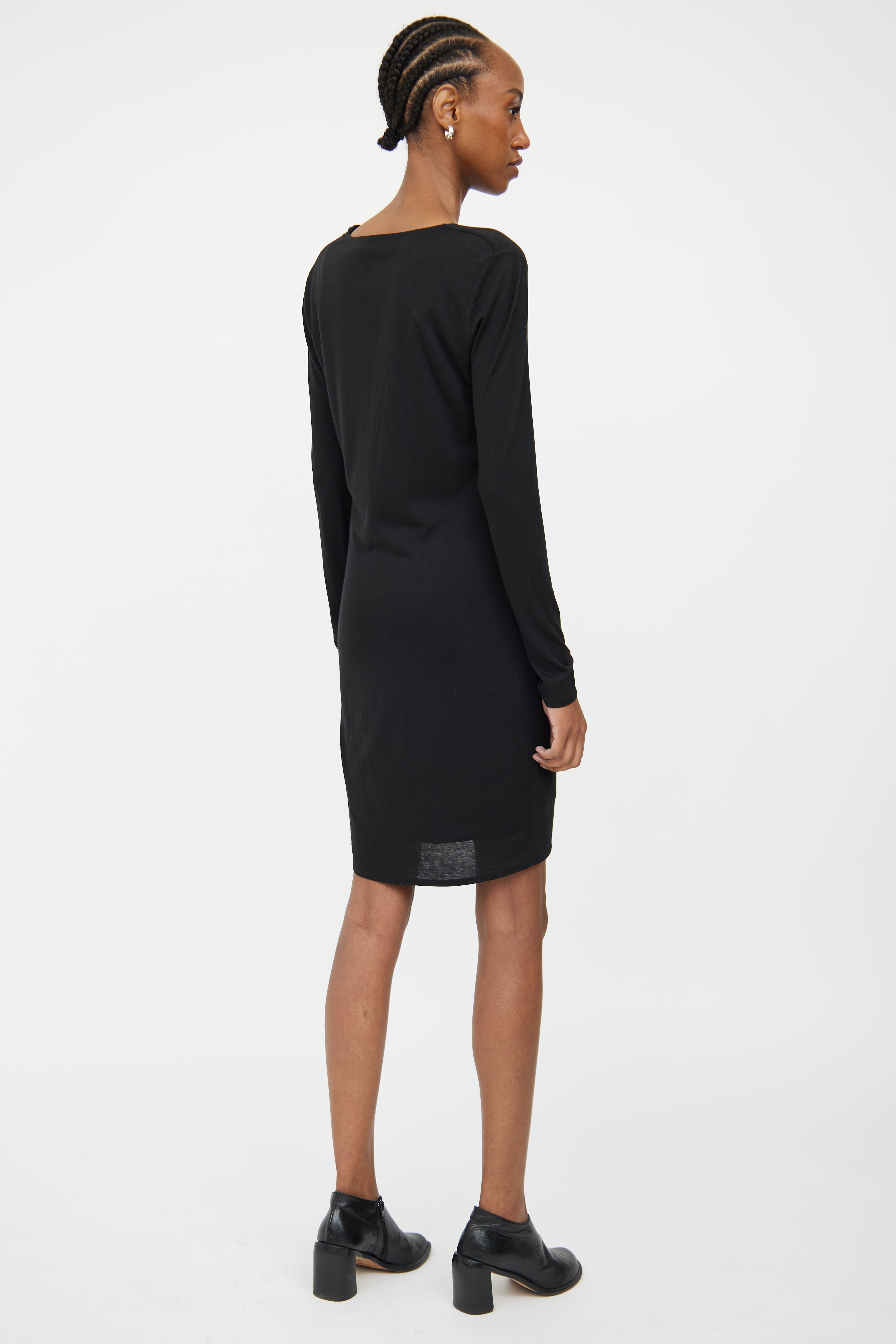 Pre-owned Helmut Lang black fitted dress featuring asymmetrical cowl neckline, long sleeves and draped panel detail at front.