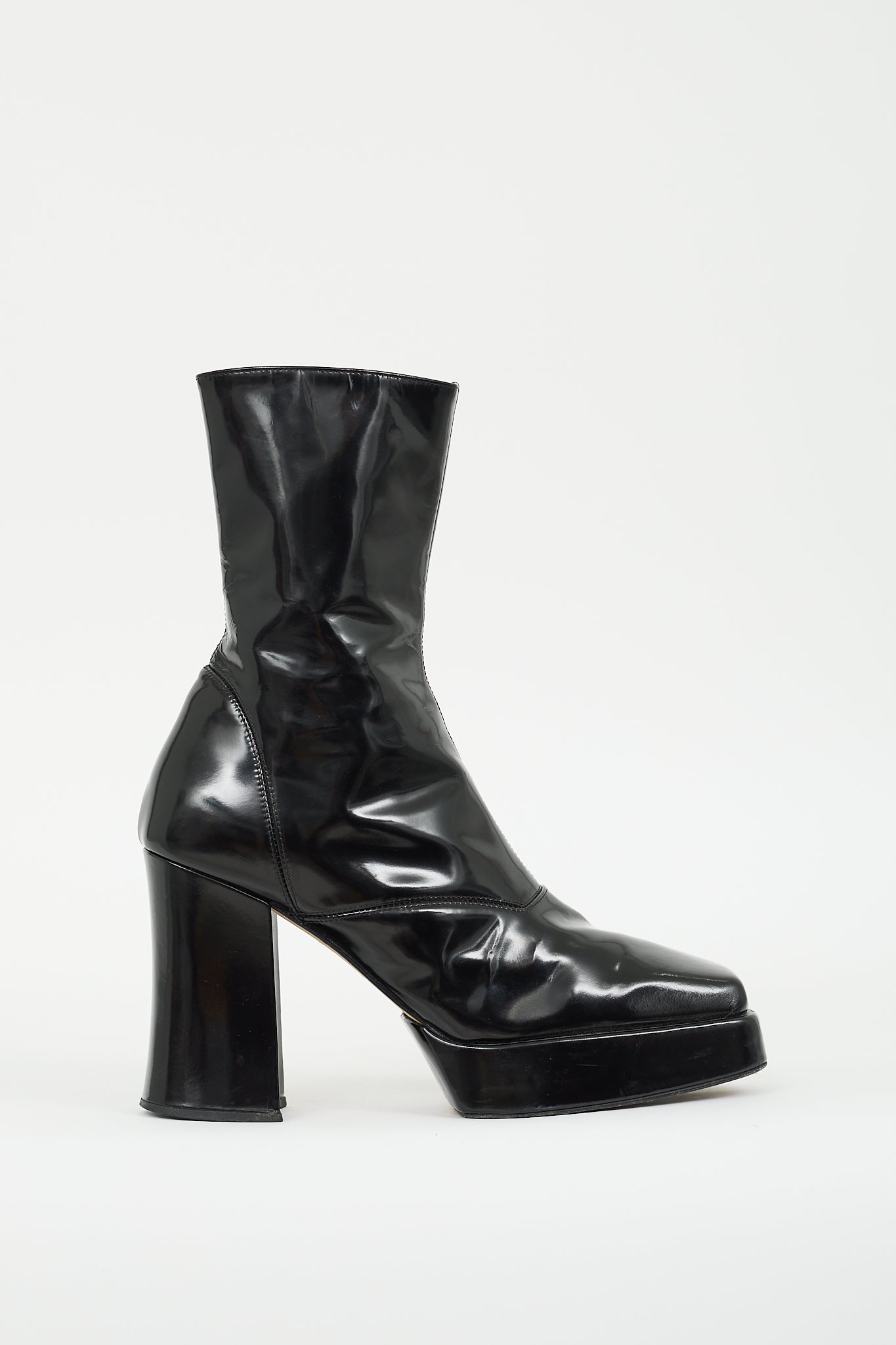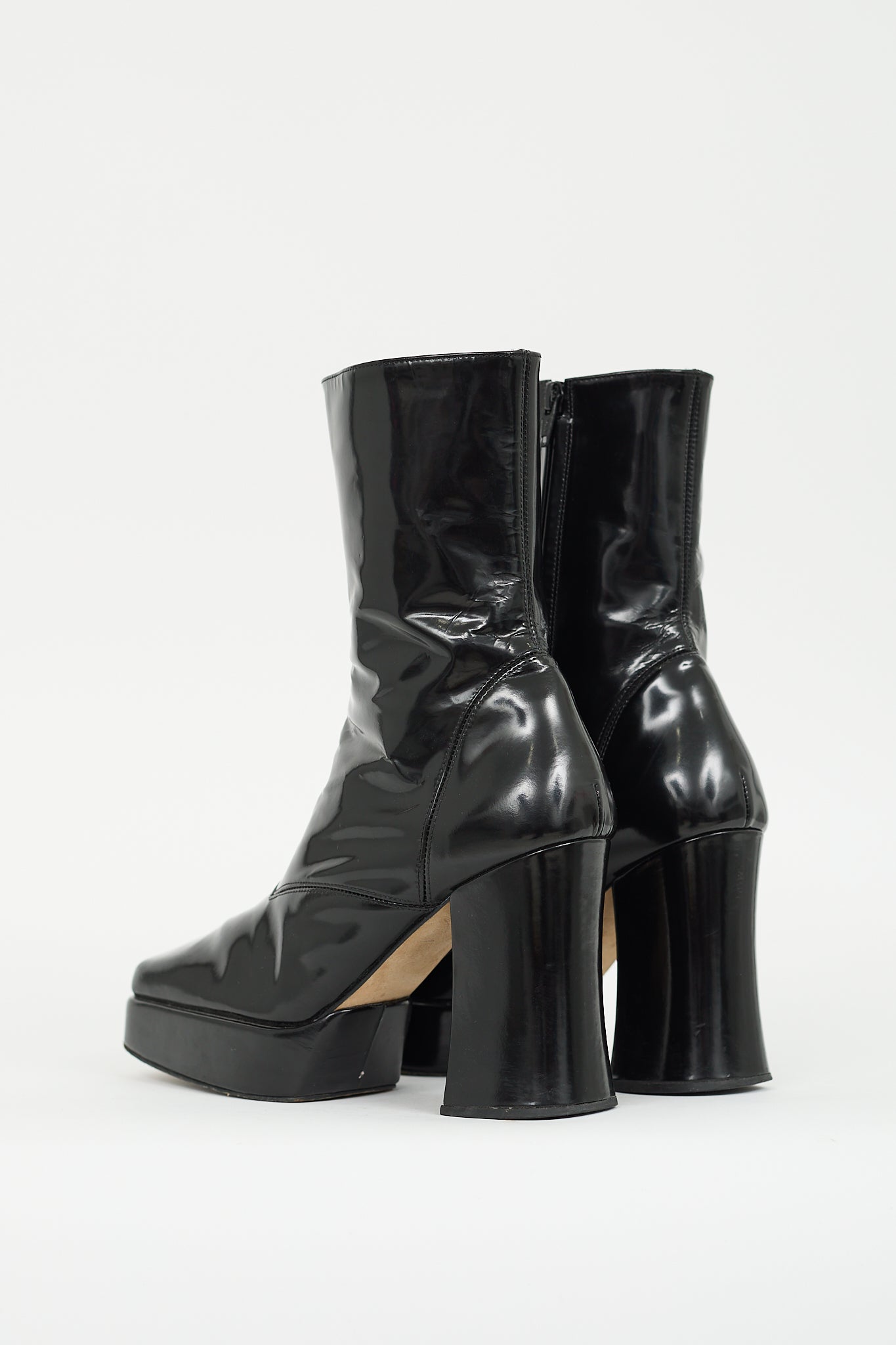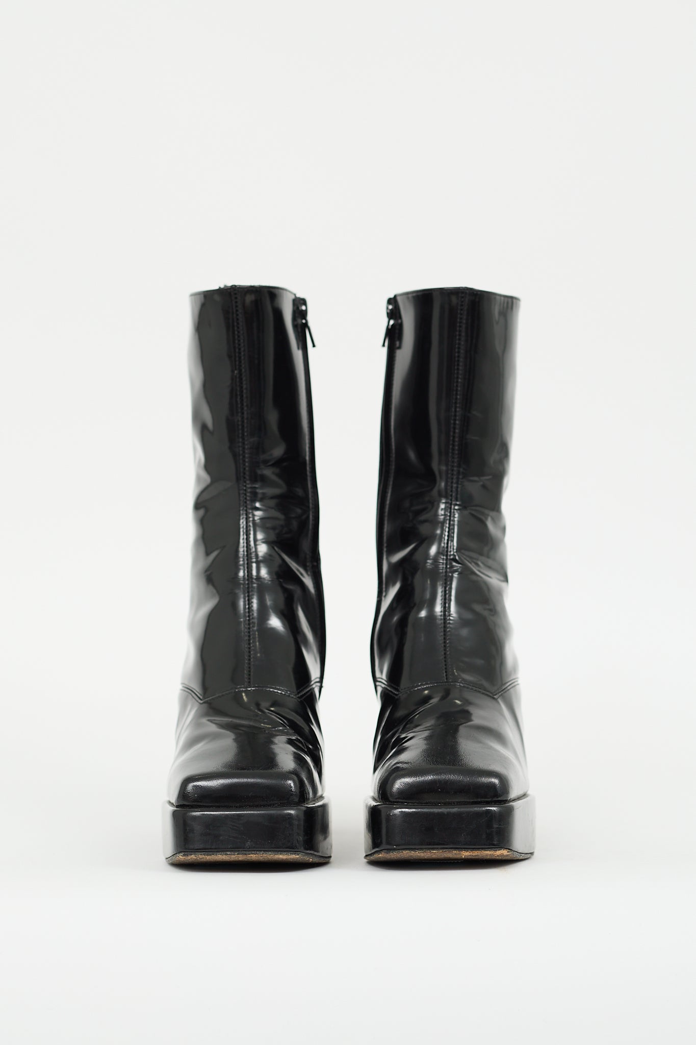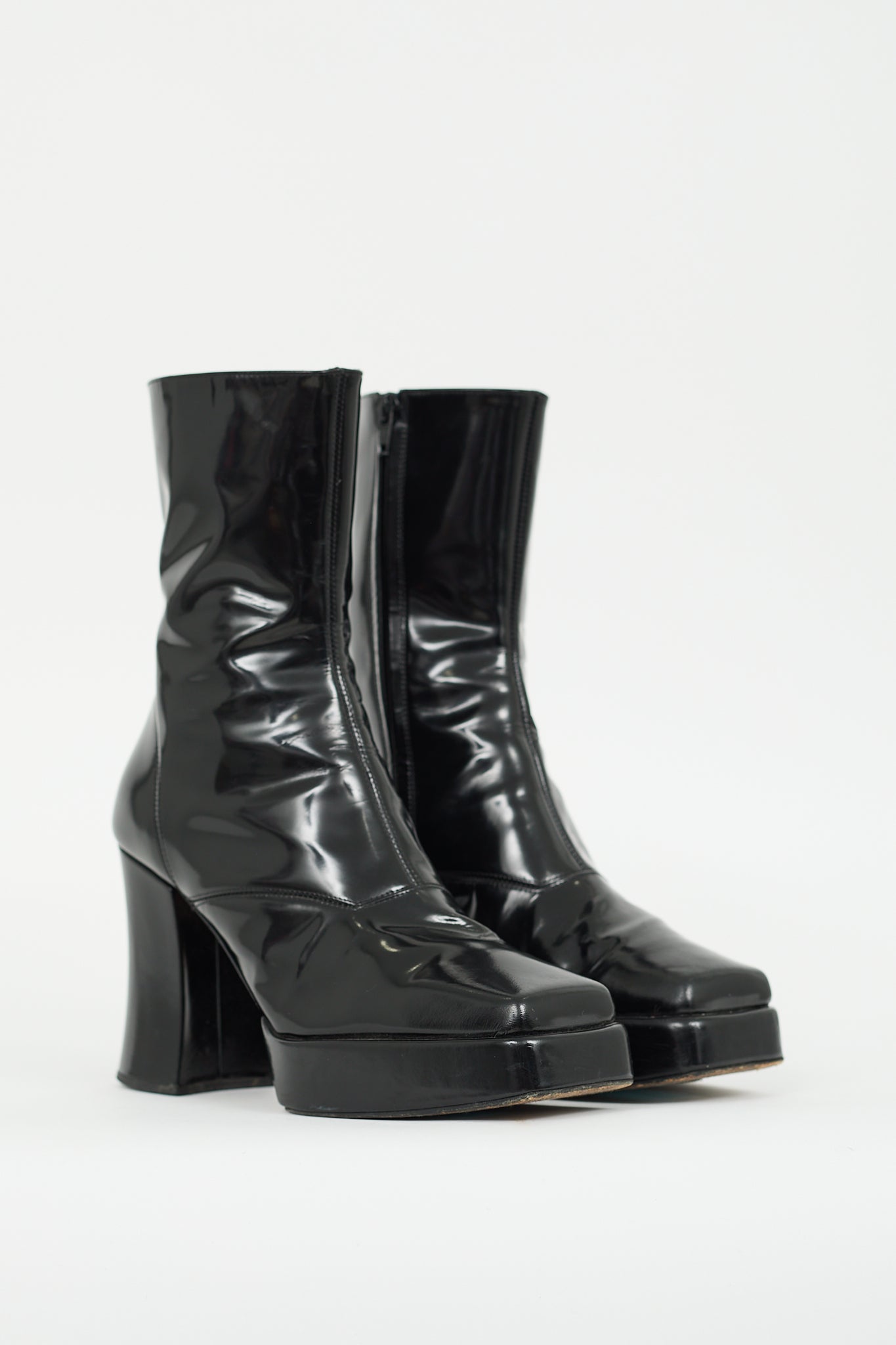 Pre-owned Helmut Lang black patent leather boots featuring square toe, zip closure at side, platform toe box, and block heel.
