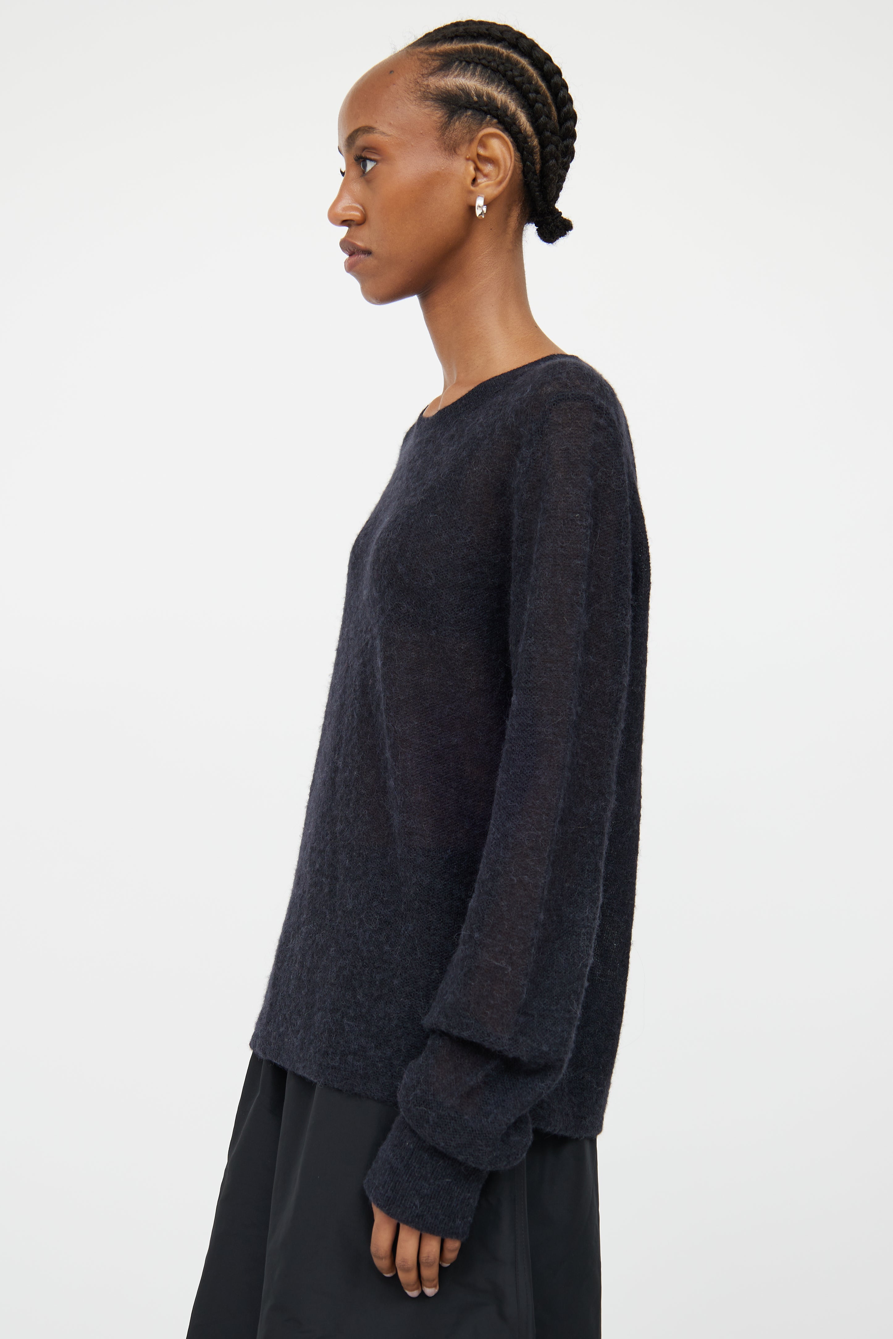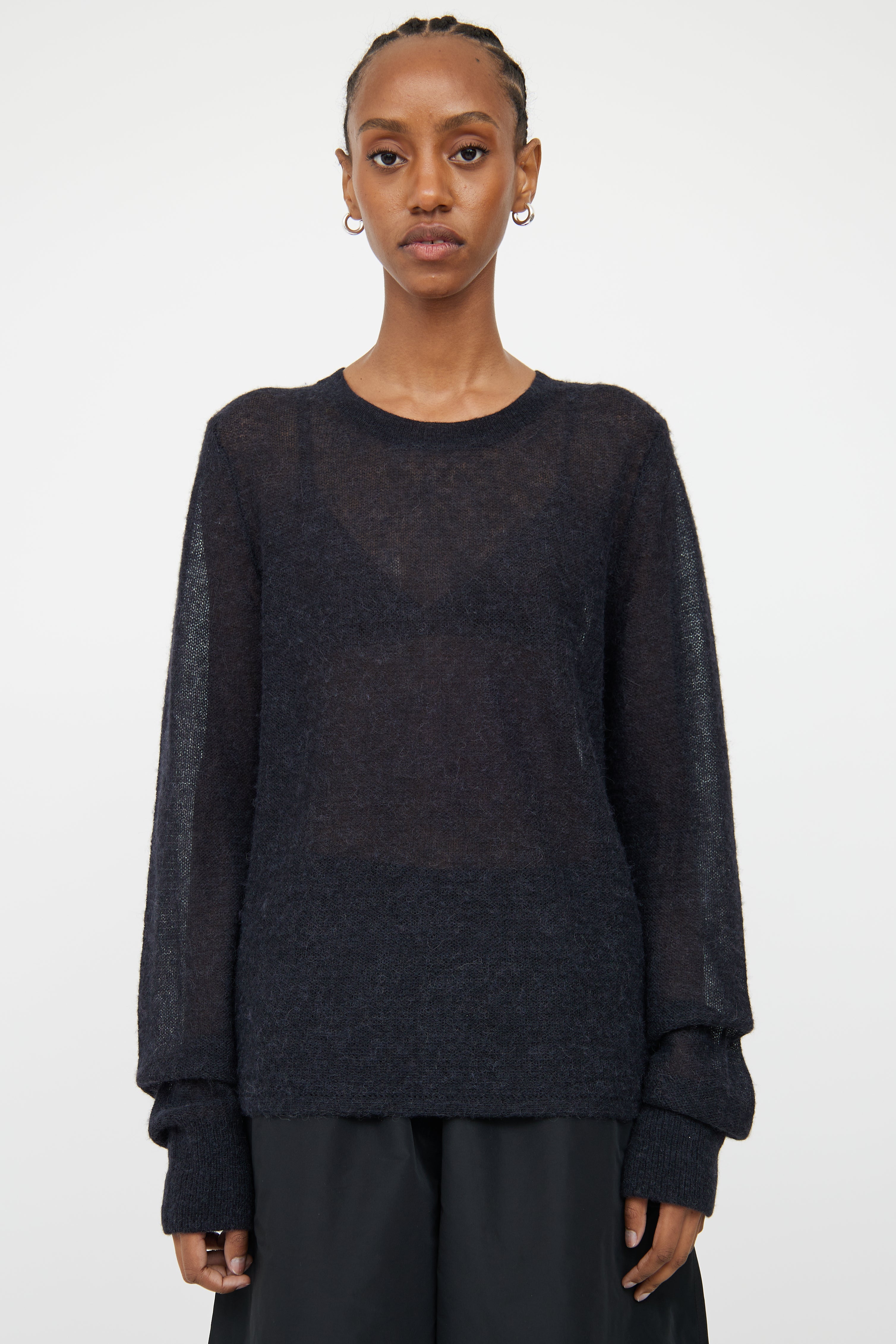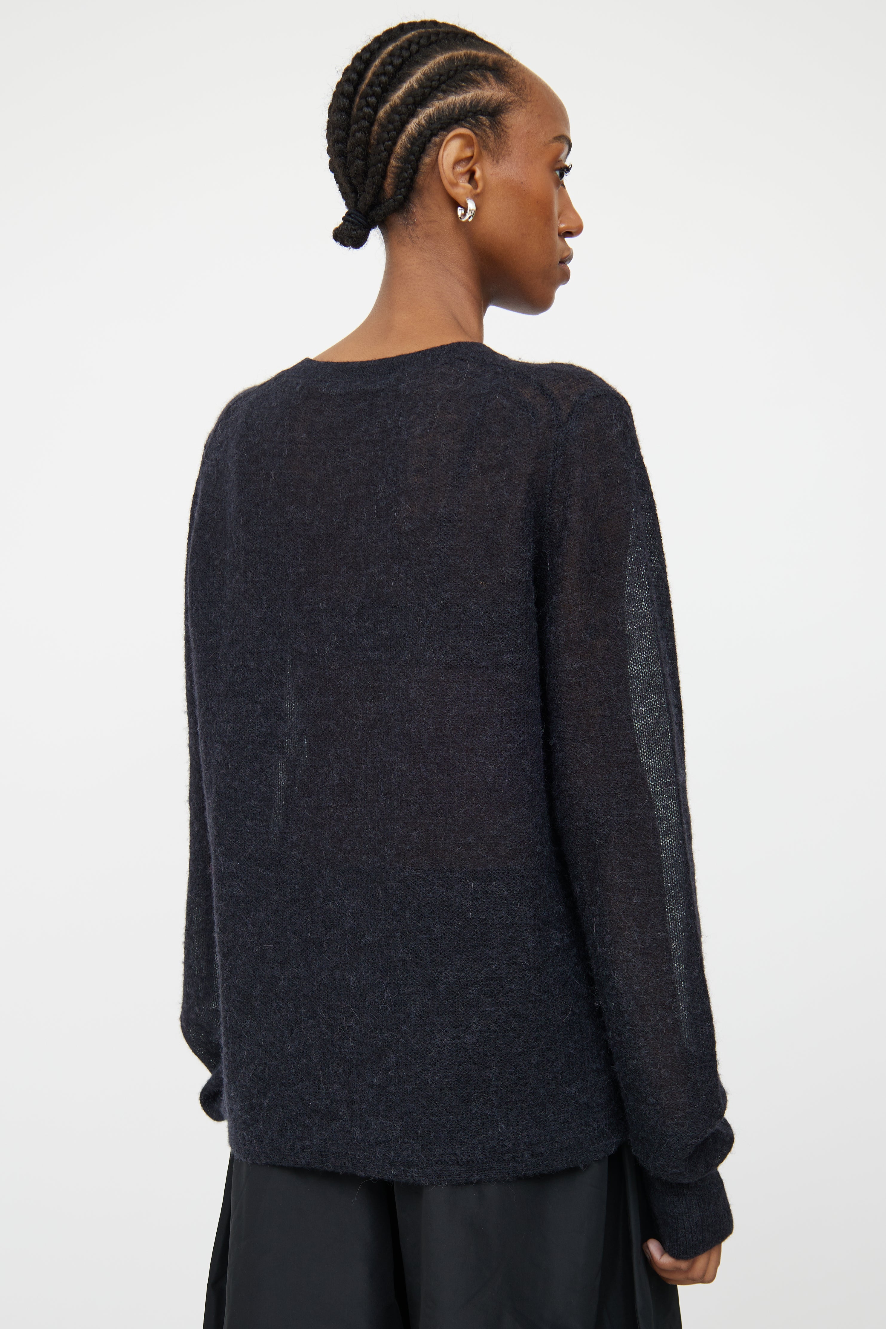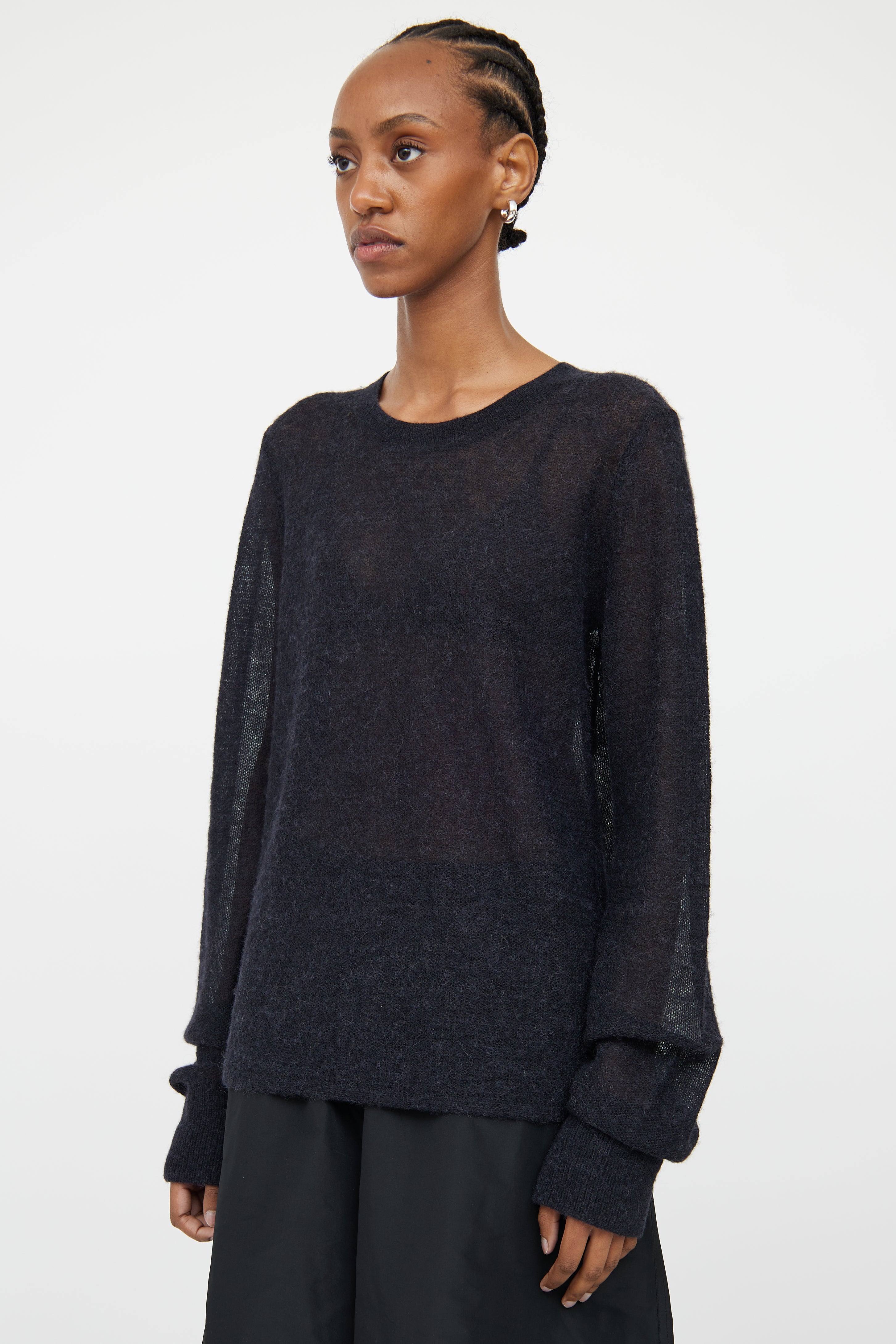 Pre-owned Helmut Lang black sheer knit sweater featuring round rib knit neckline and long sleeves with with rib knit cuffs.