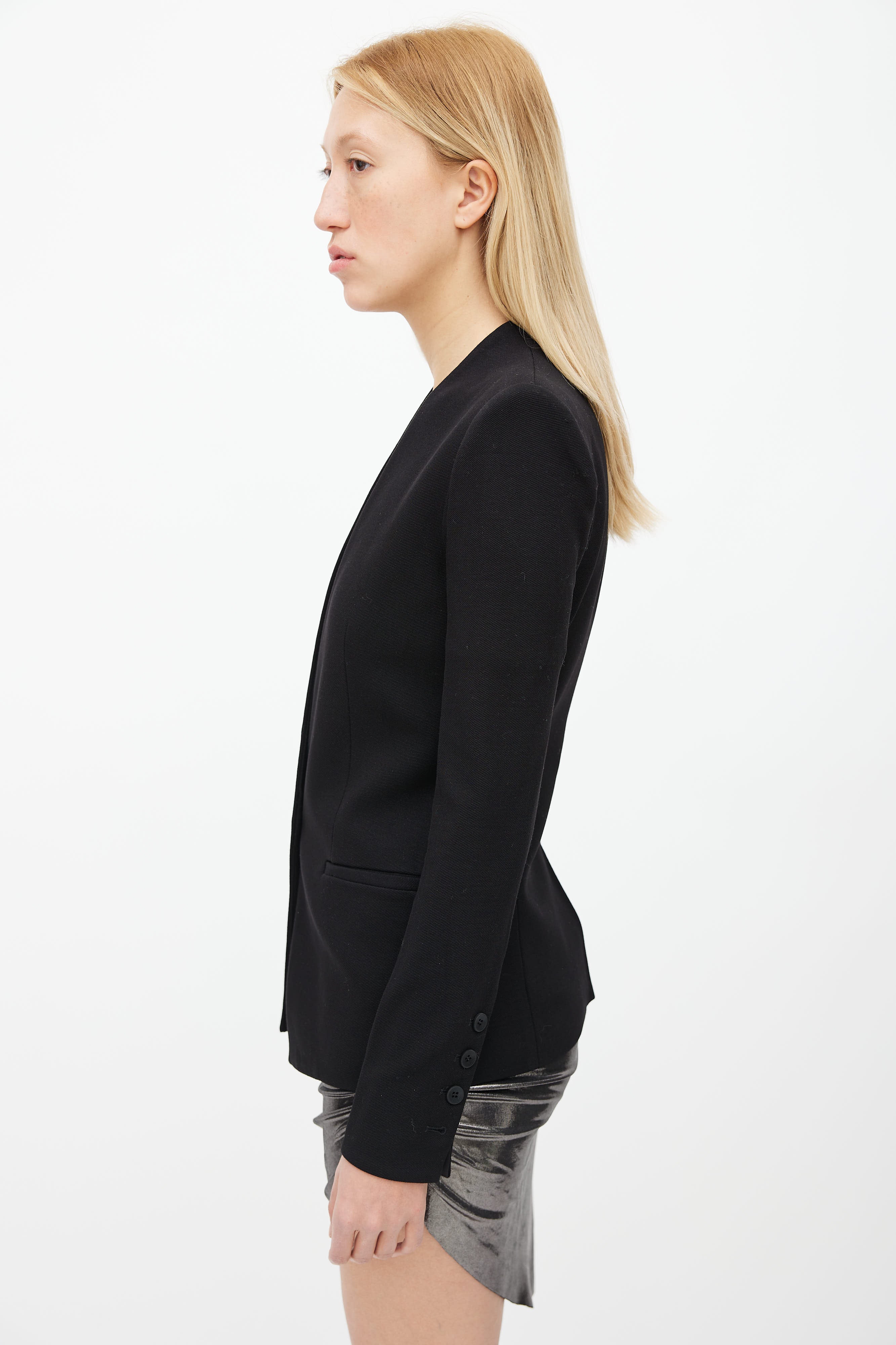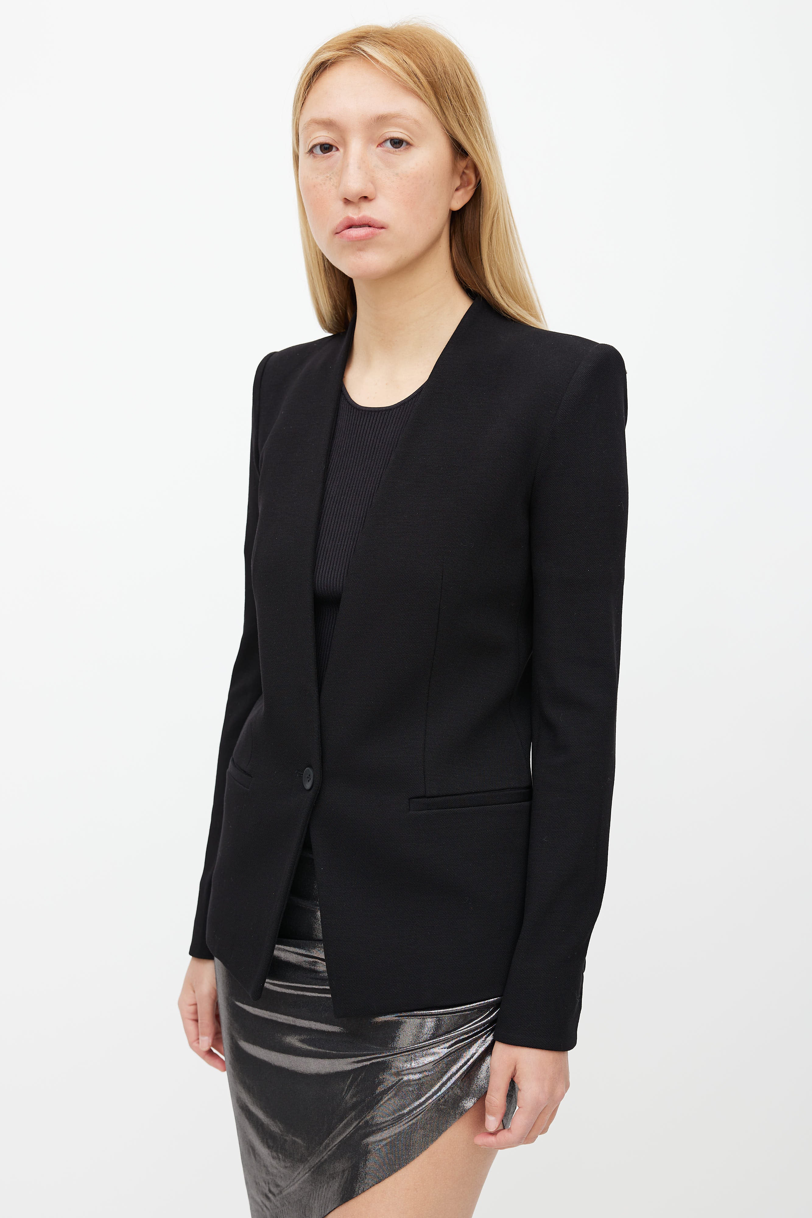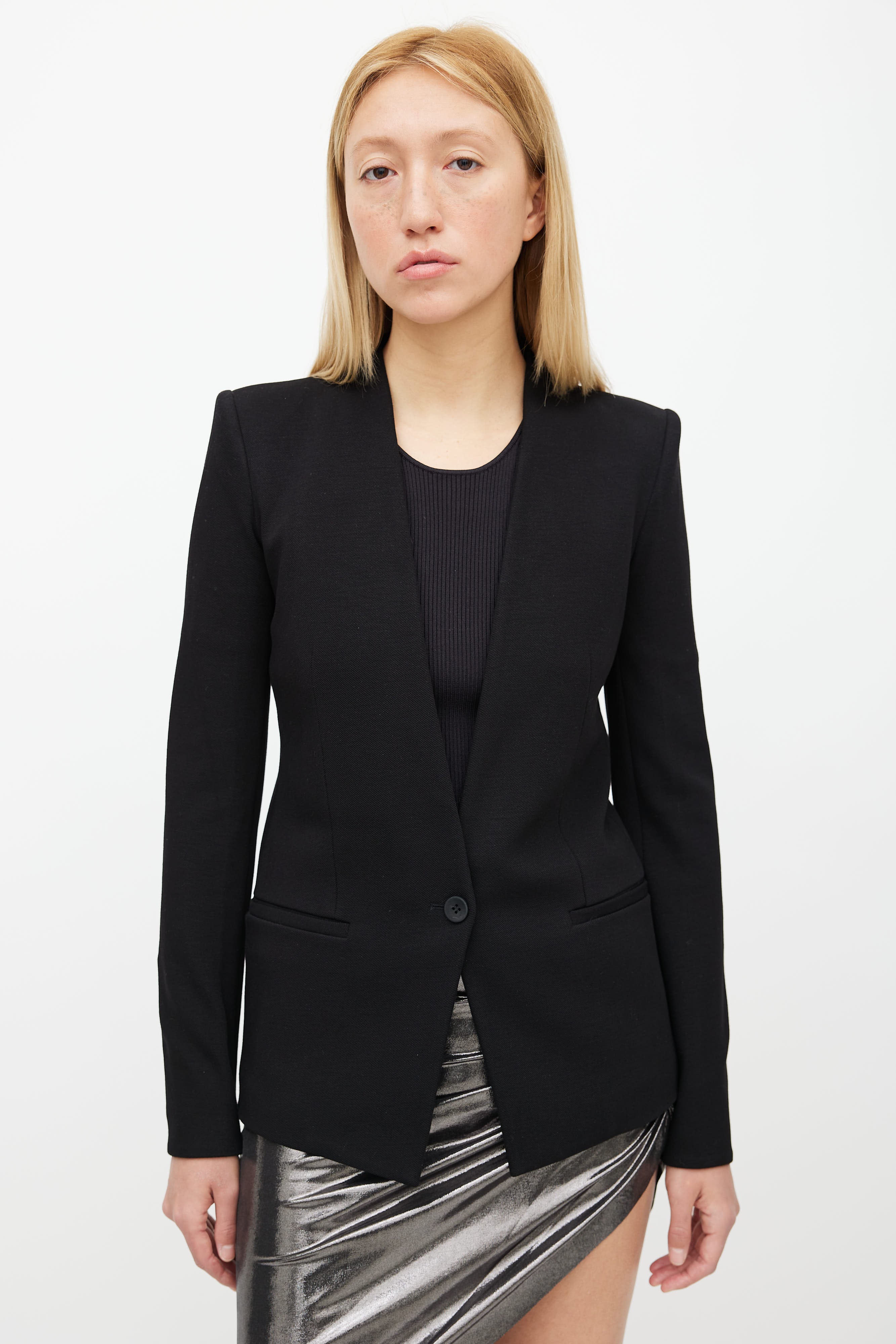 Helmut Lang collarless blazer in black featuring a single button closure, and two pocket styling.