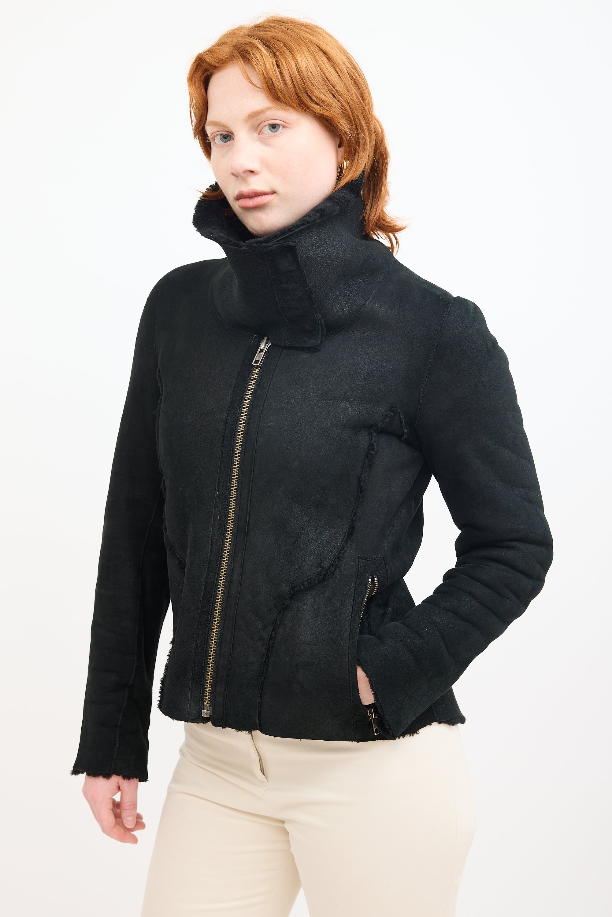 Pre-owned Helmut Lang black Wrecked Shearling jacket featuring convertible asymmetrical collar with snap button fastening, zip up front, two zip pockets at waist, and zippered cuffs. Lined.