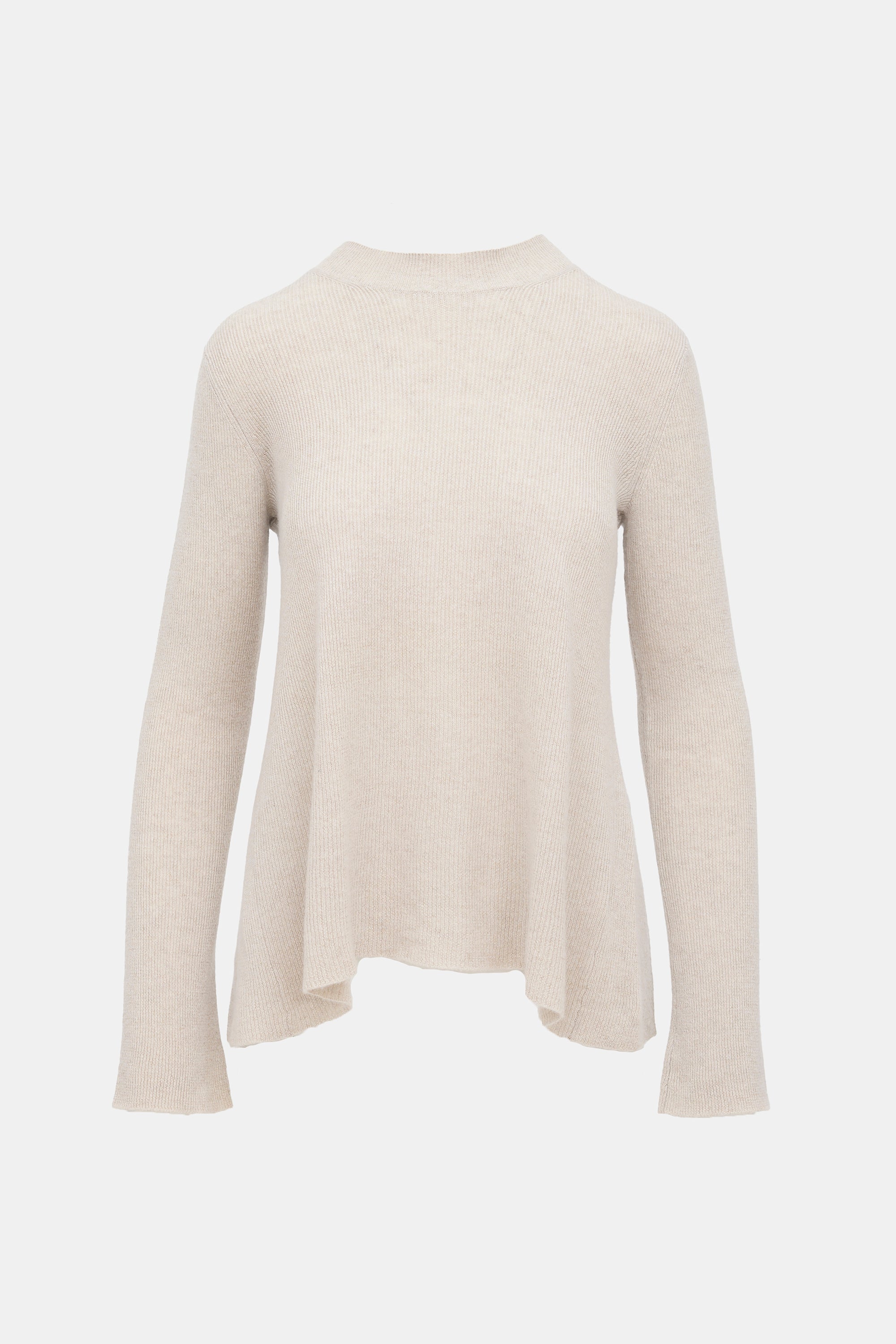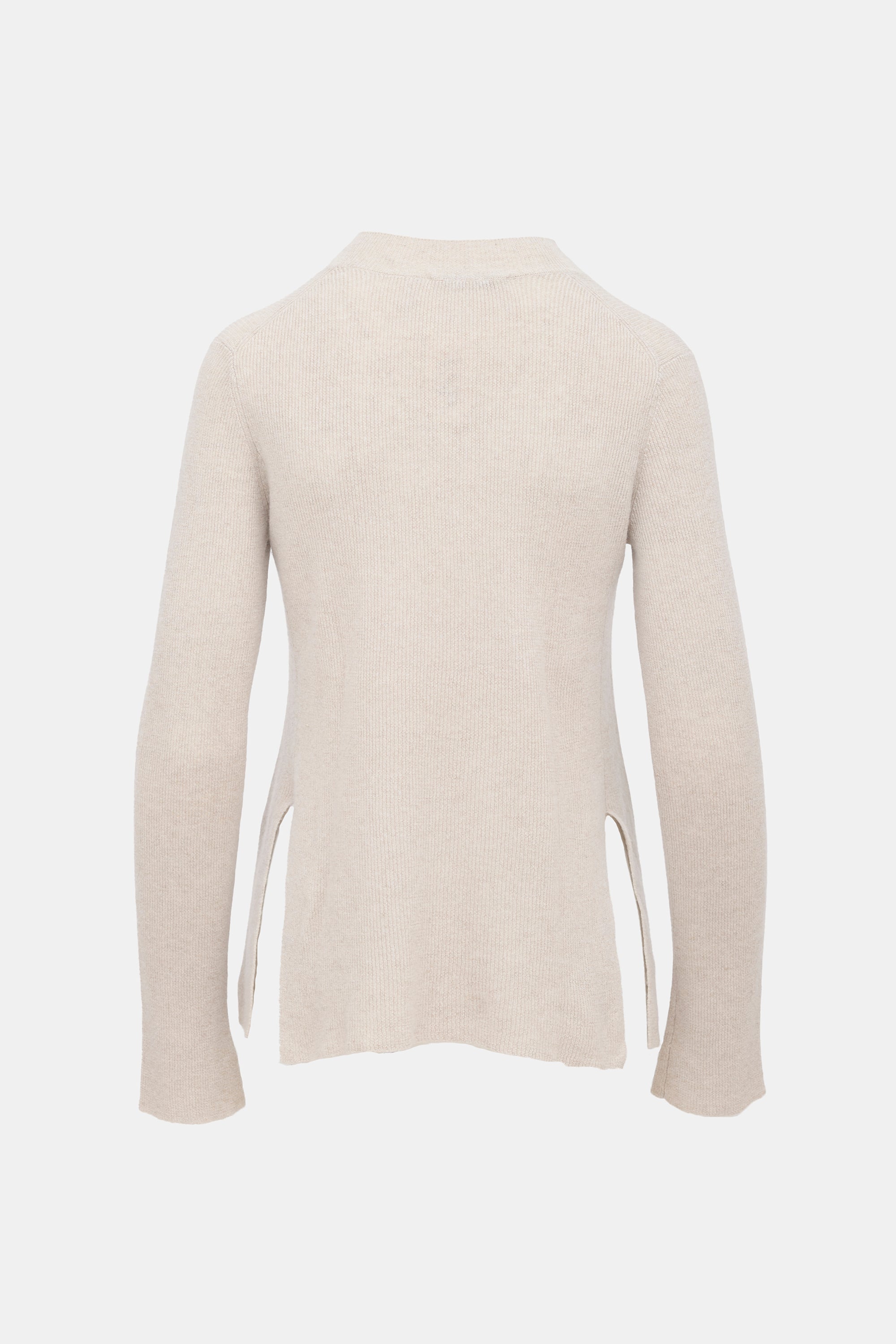 Pre-owned Helmut Lang beige cashmere and linen sweater featuring a ribbed knit styling, mock neckline, and side vents.