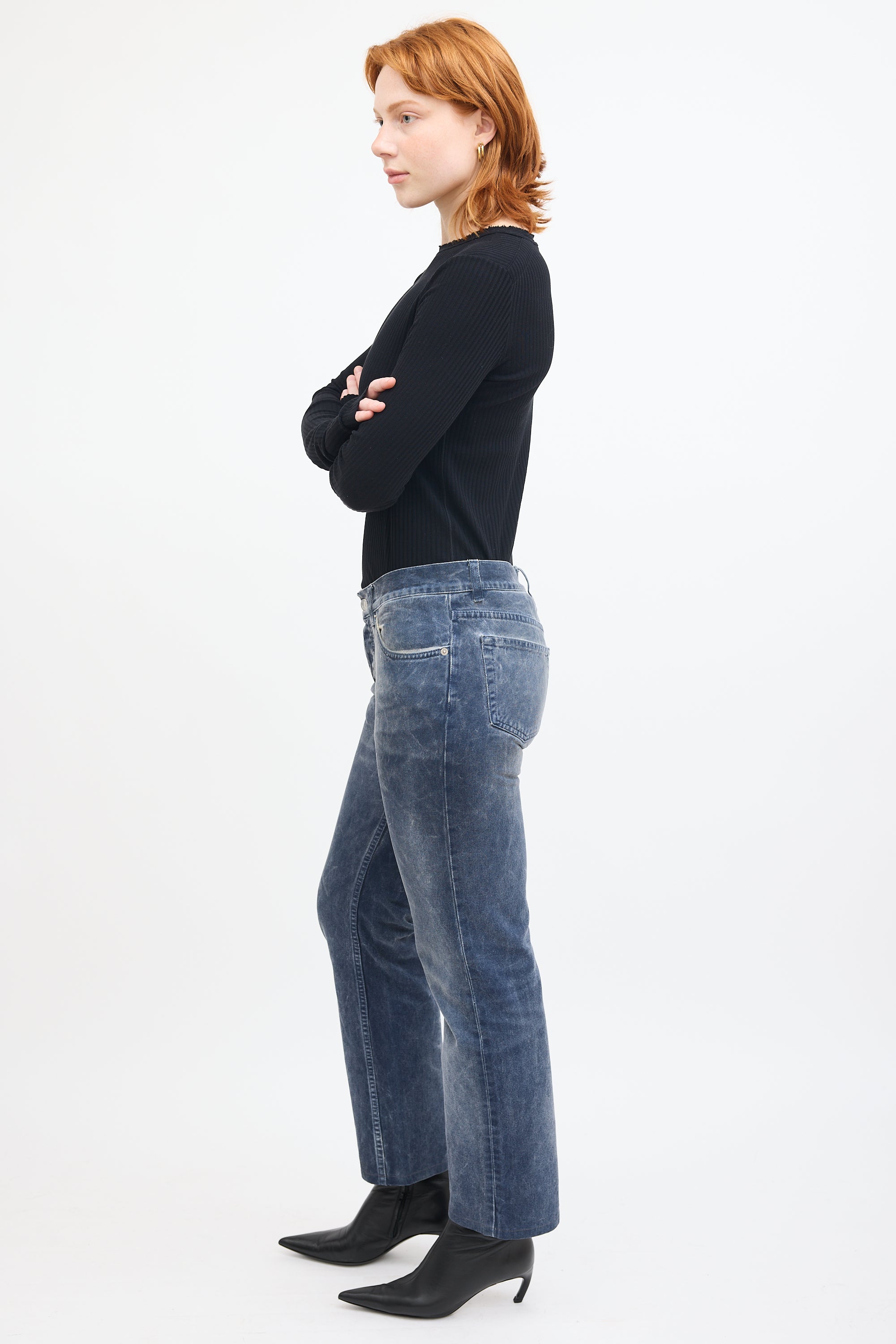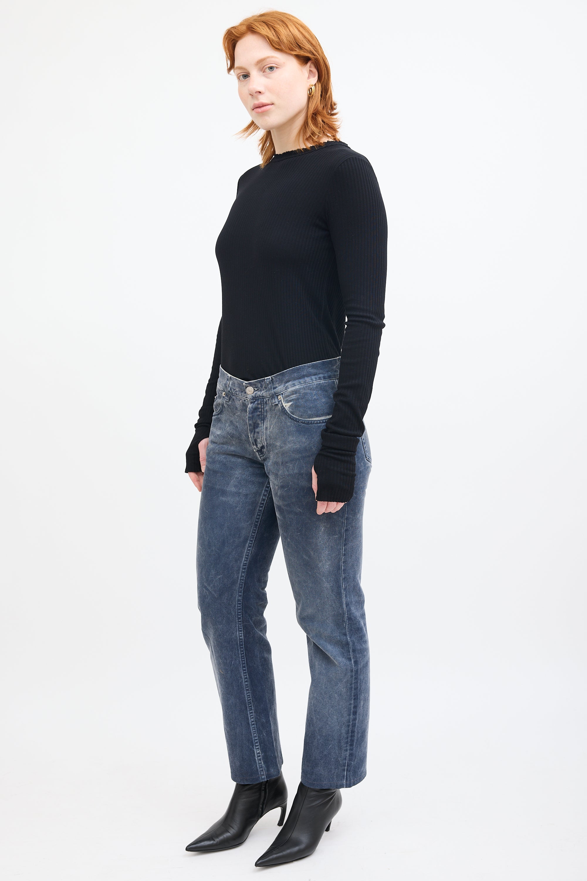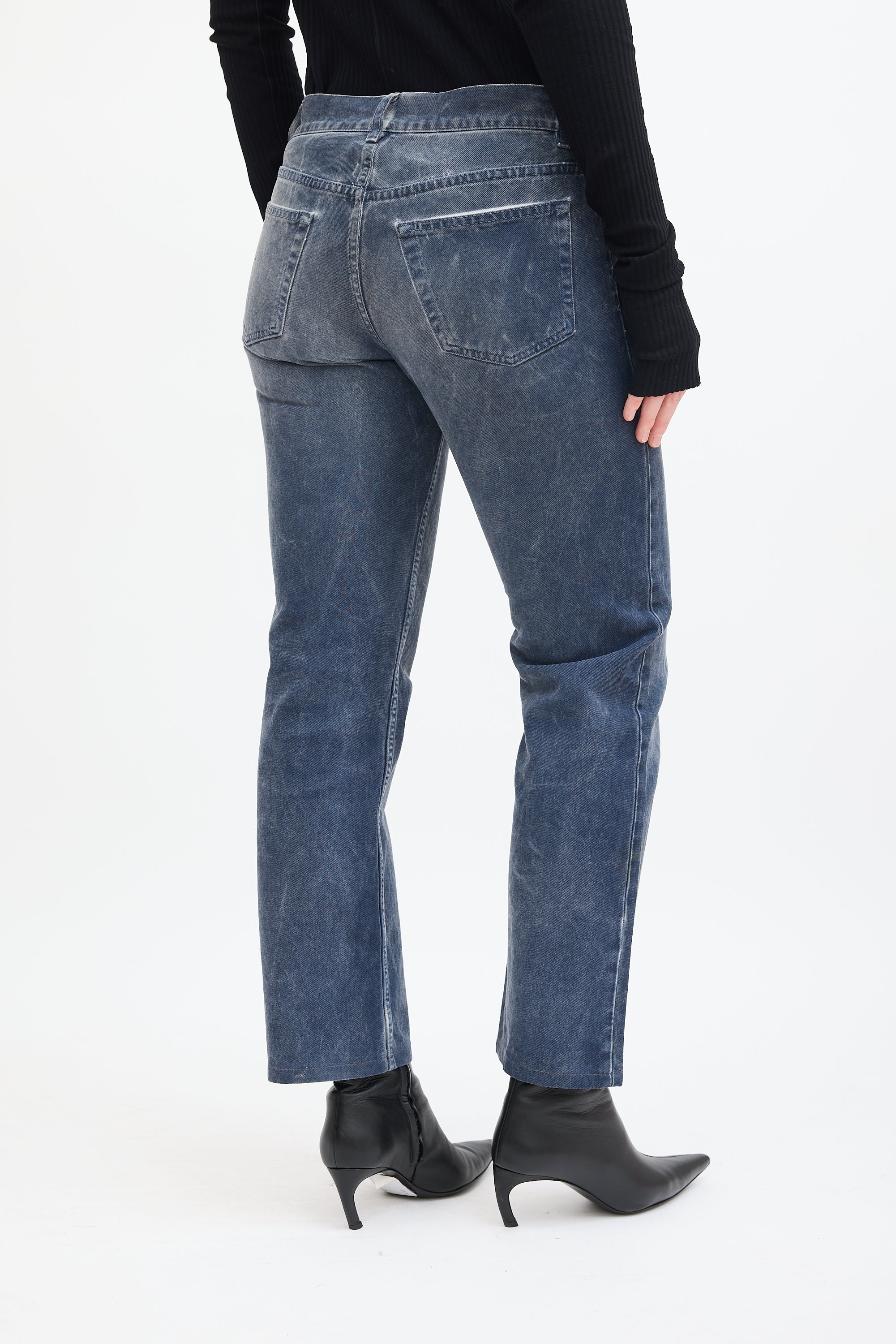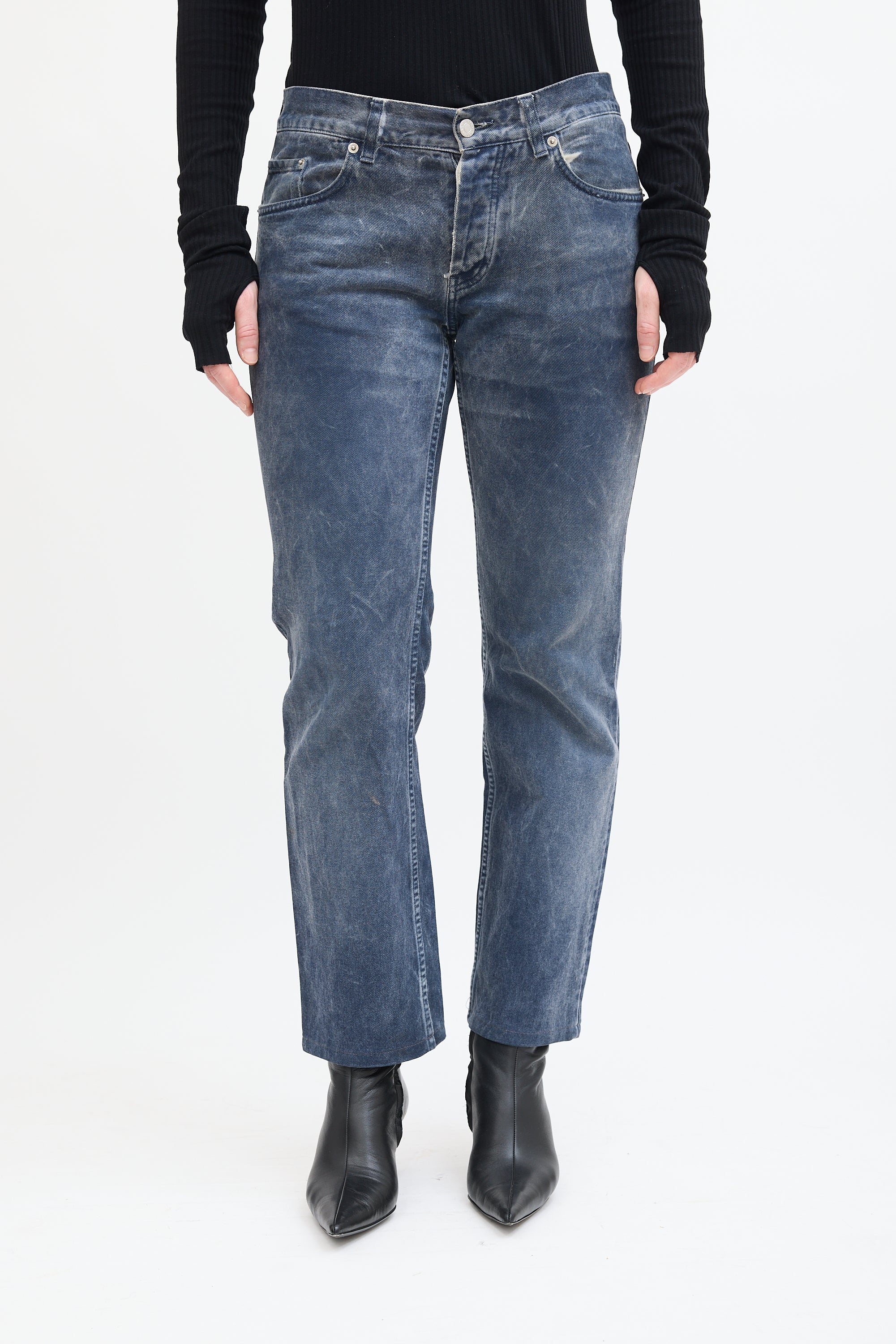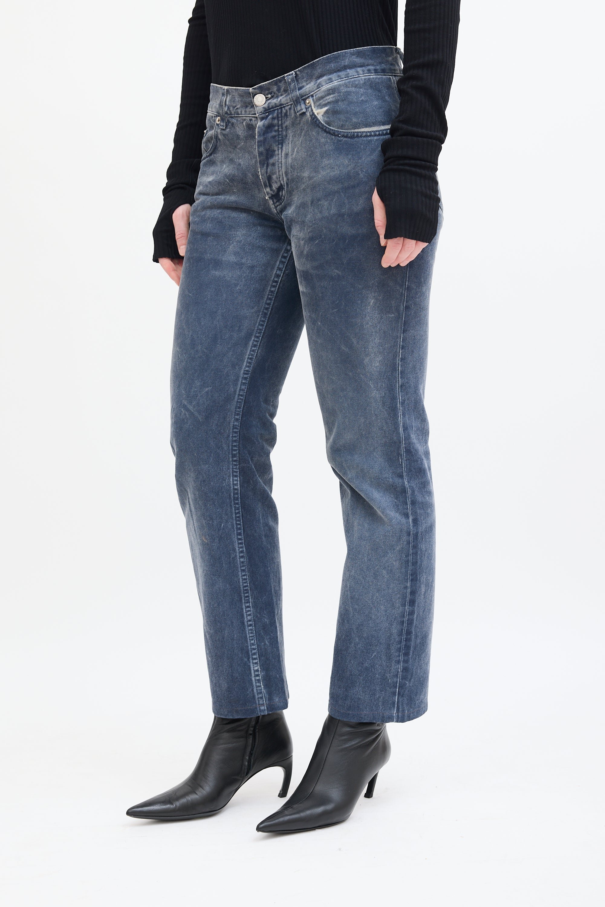 Pre-owned Helmut Lang dark grey Over Printed jeans featuring low waist contour fit, belt loops, five pocket styling, buttoned fly, and straight leg.