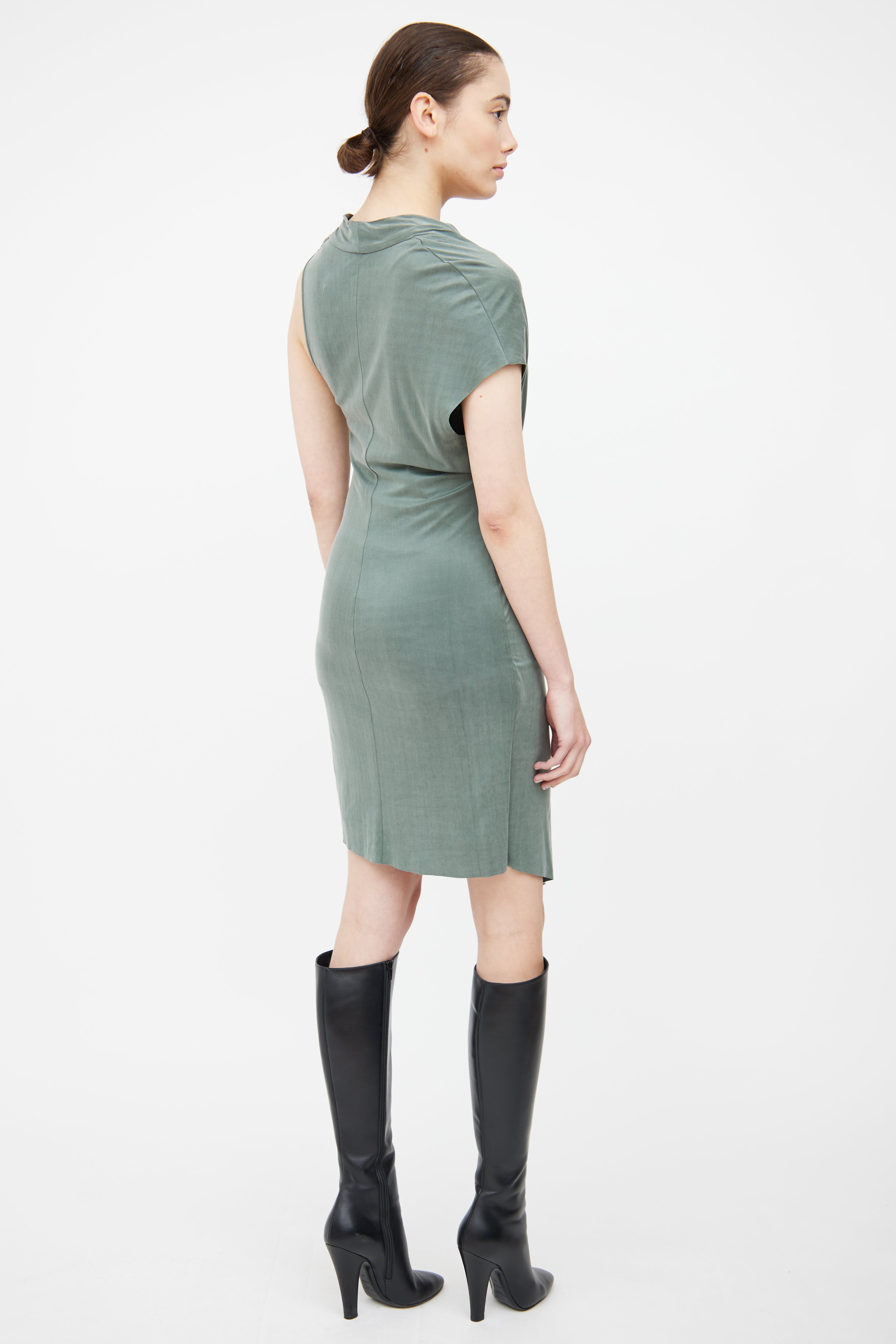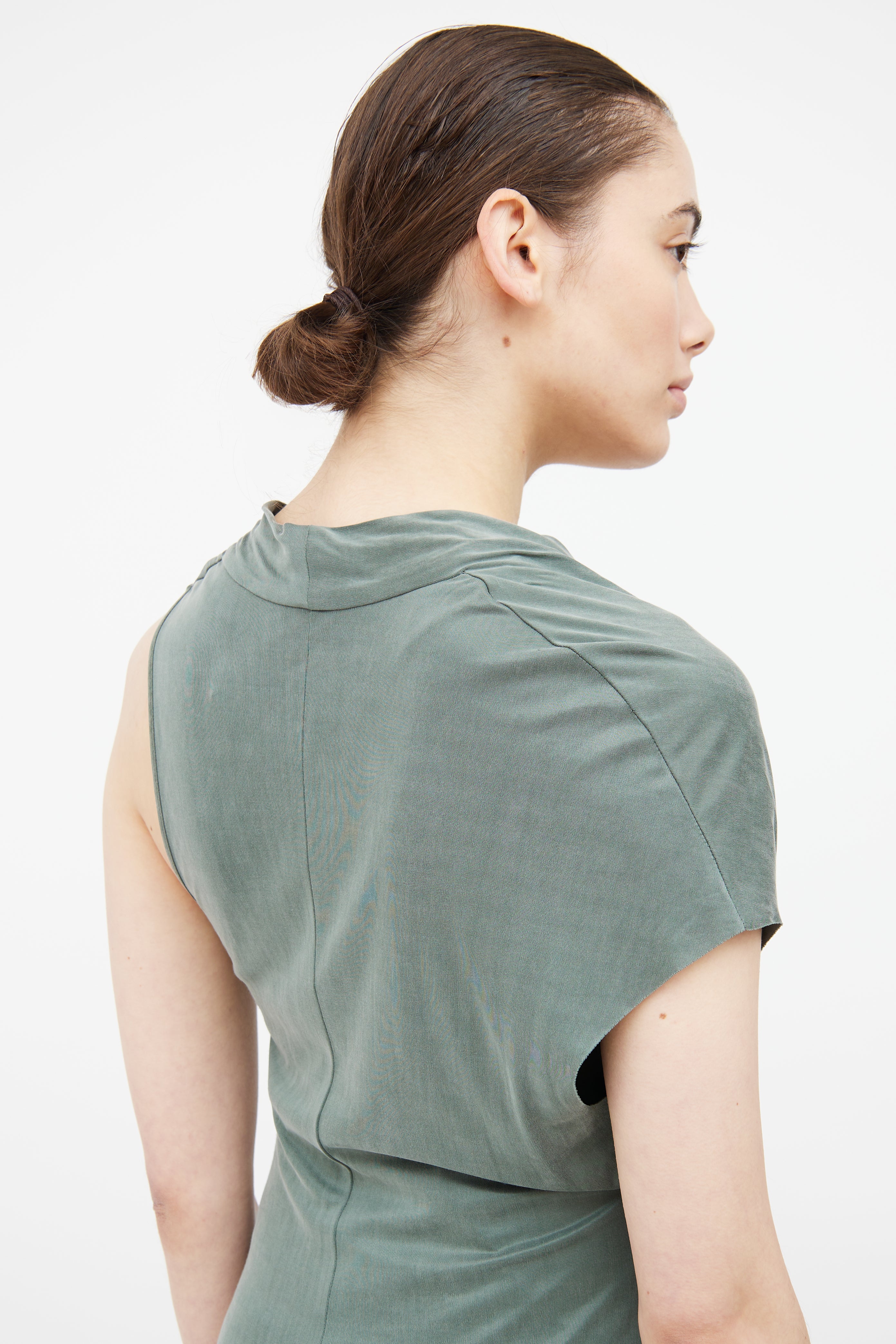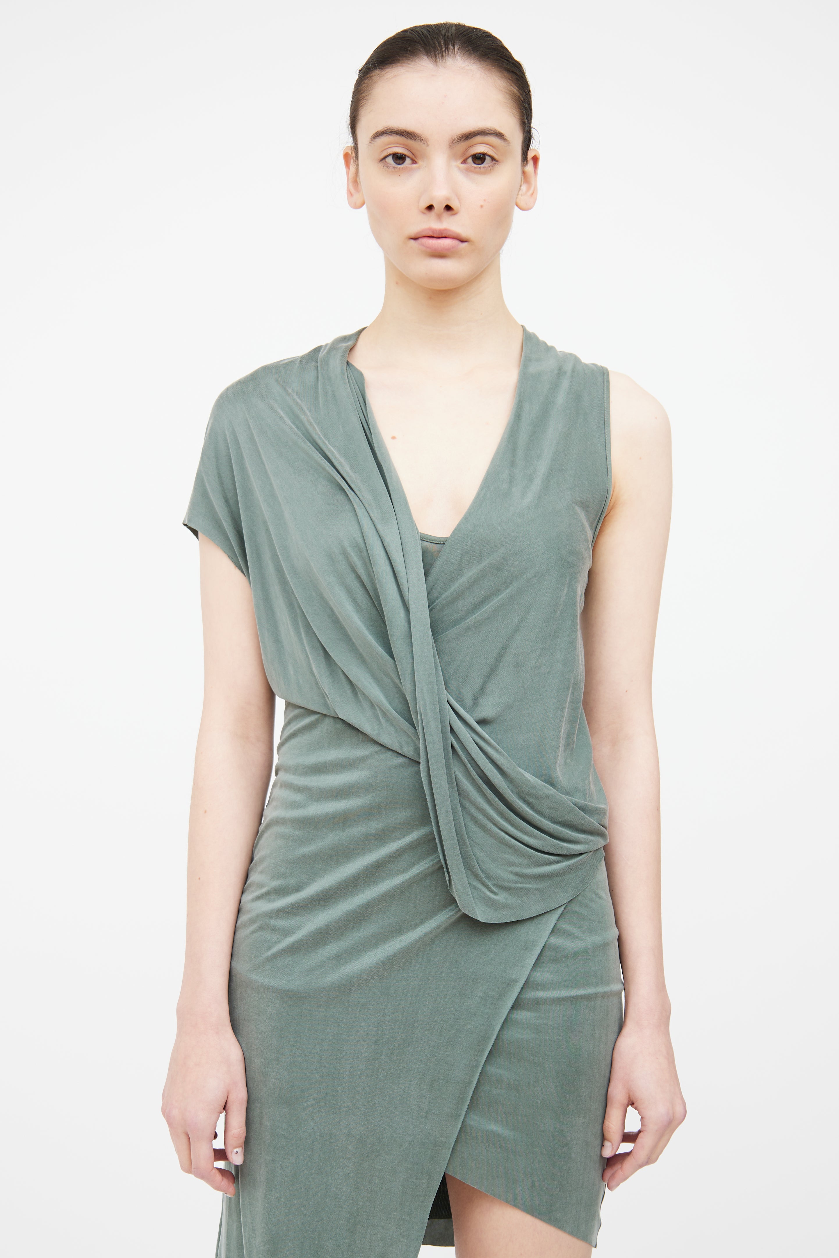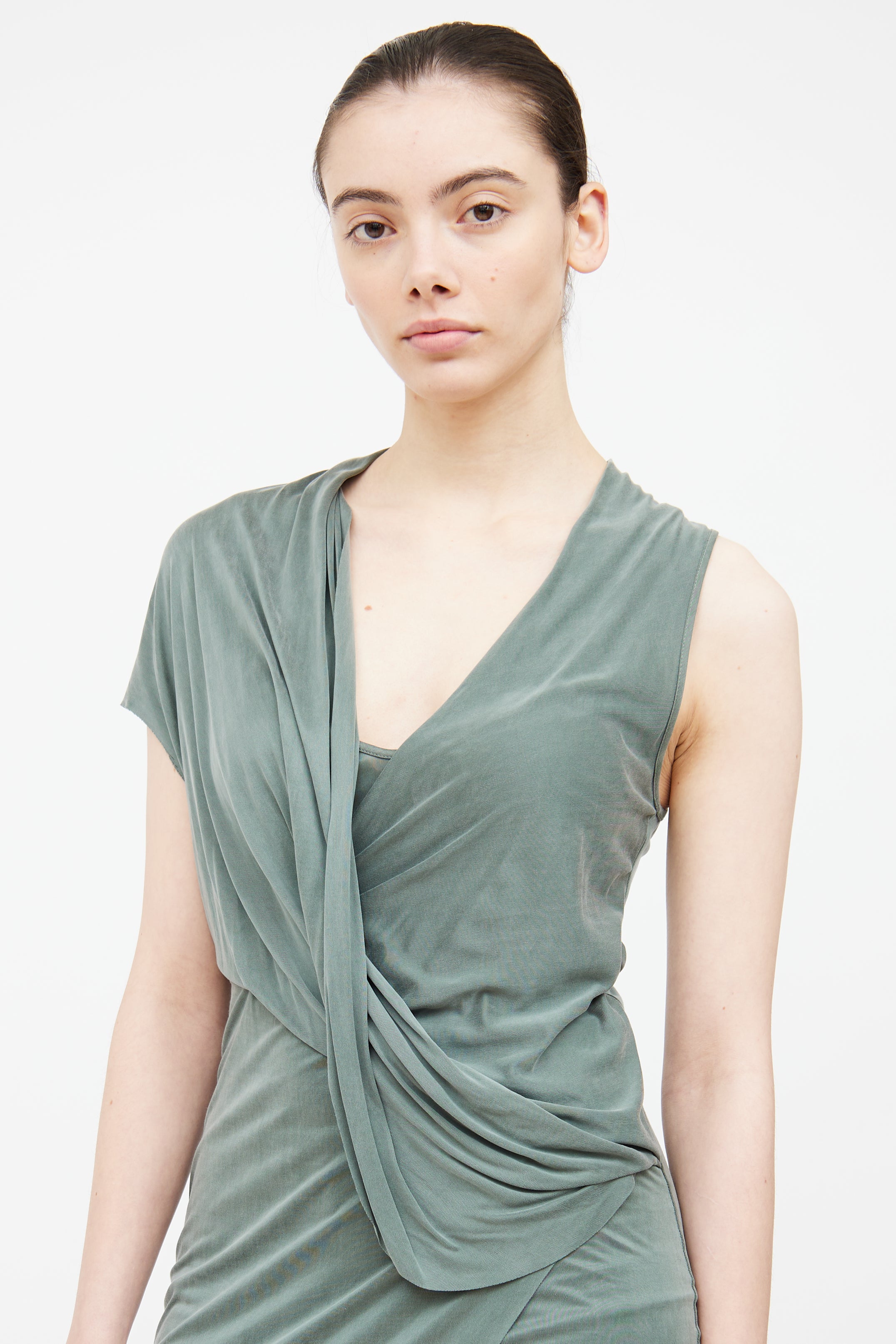 Pre-owned Helmut Lang green draped midi dress featuring scoop neck, single cap sleeve, layered design with gathered draping at front, attached slip and asymmetrical hemline.