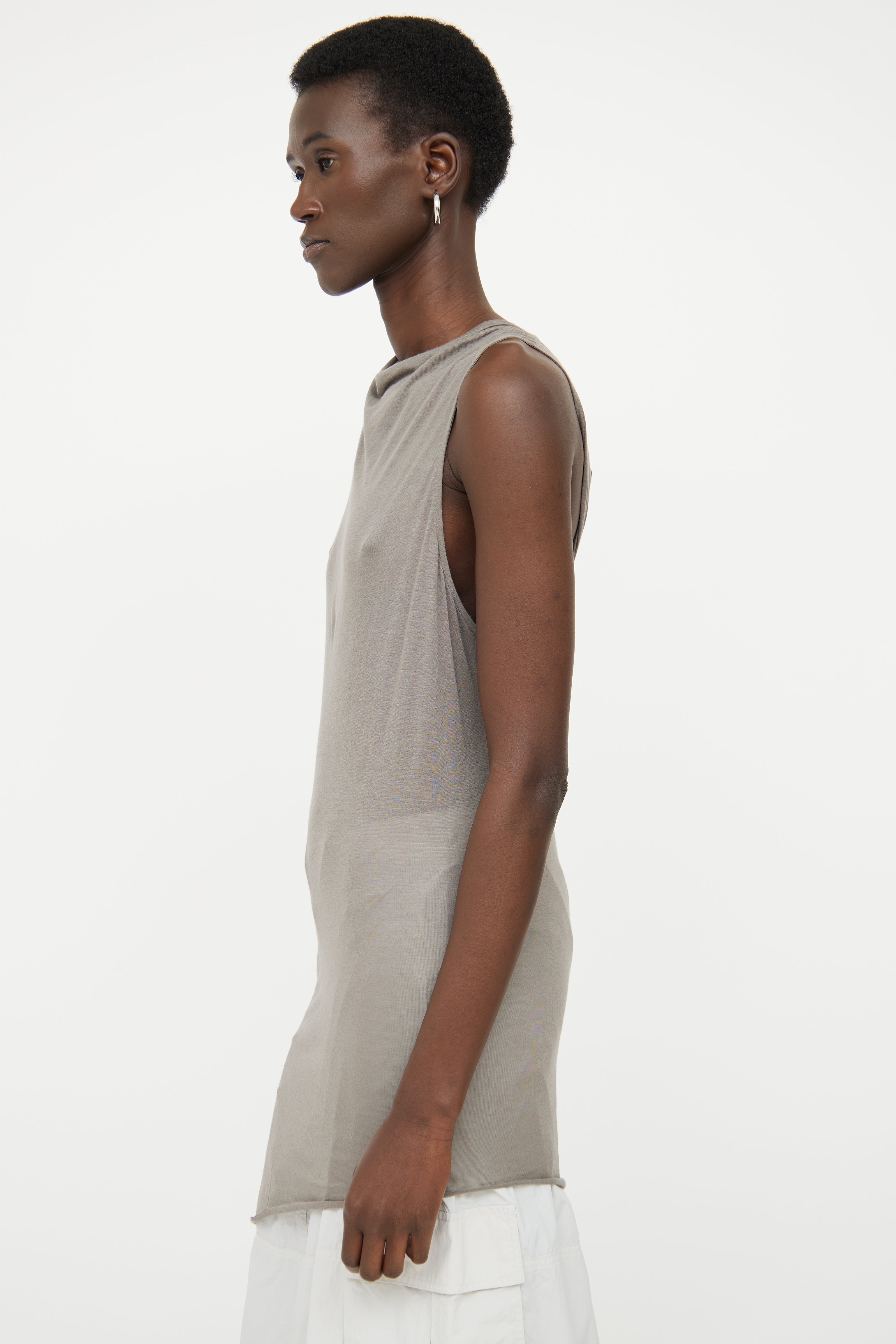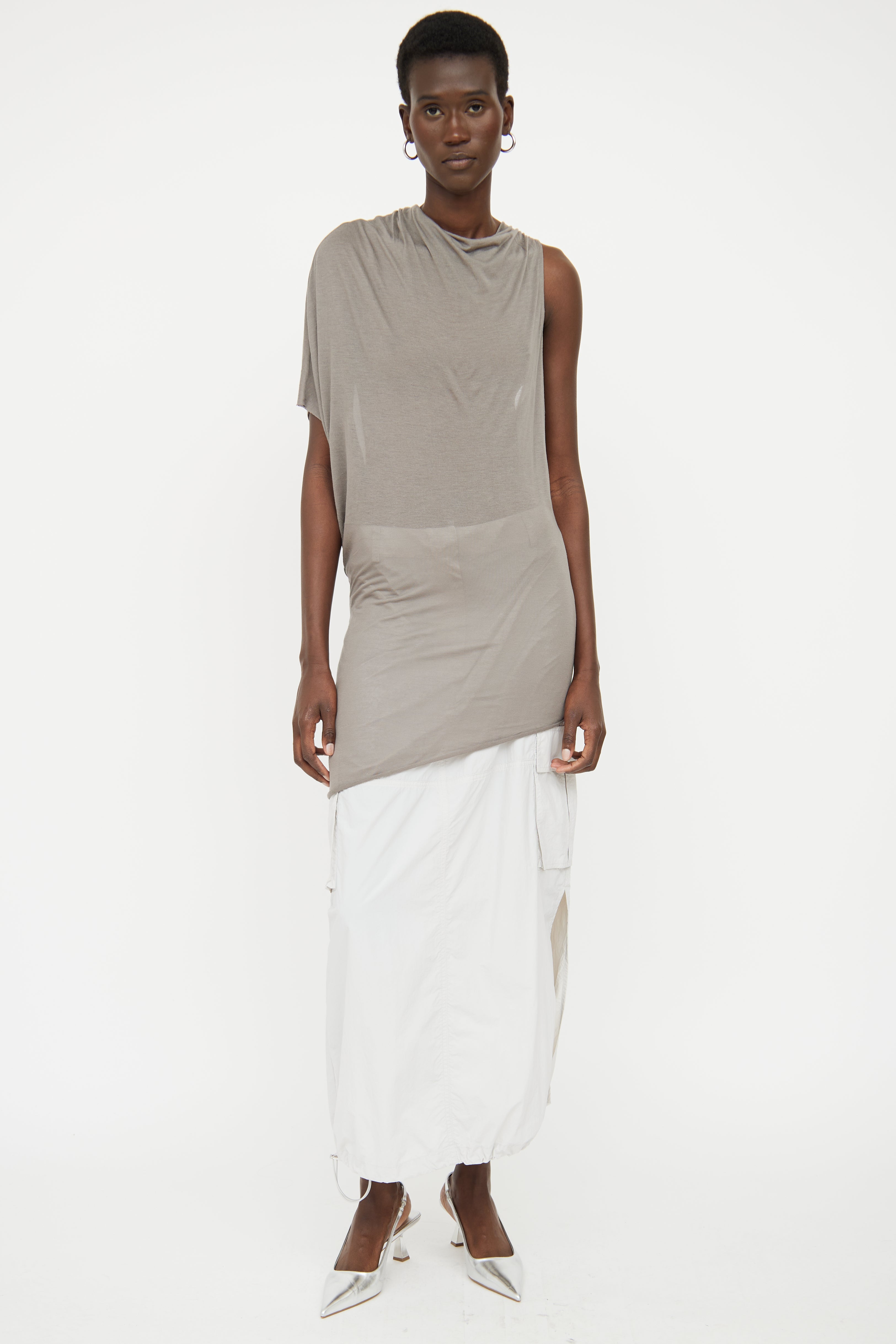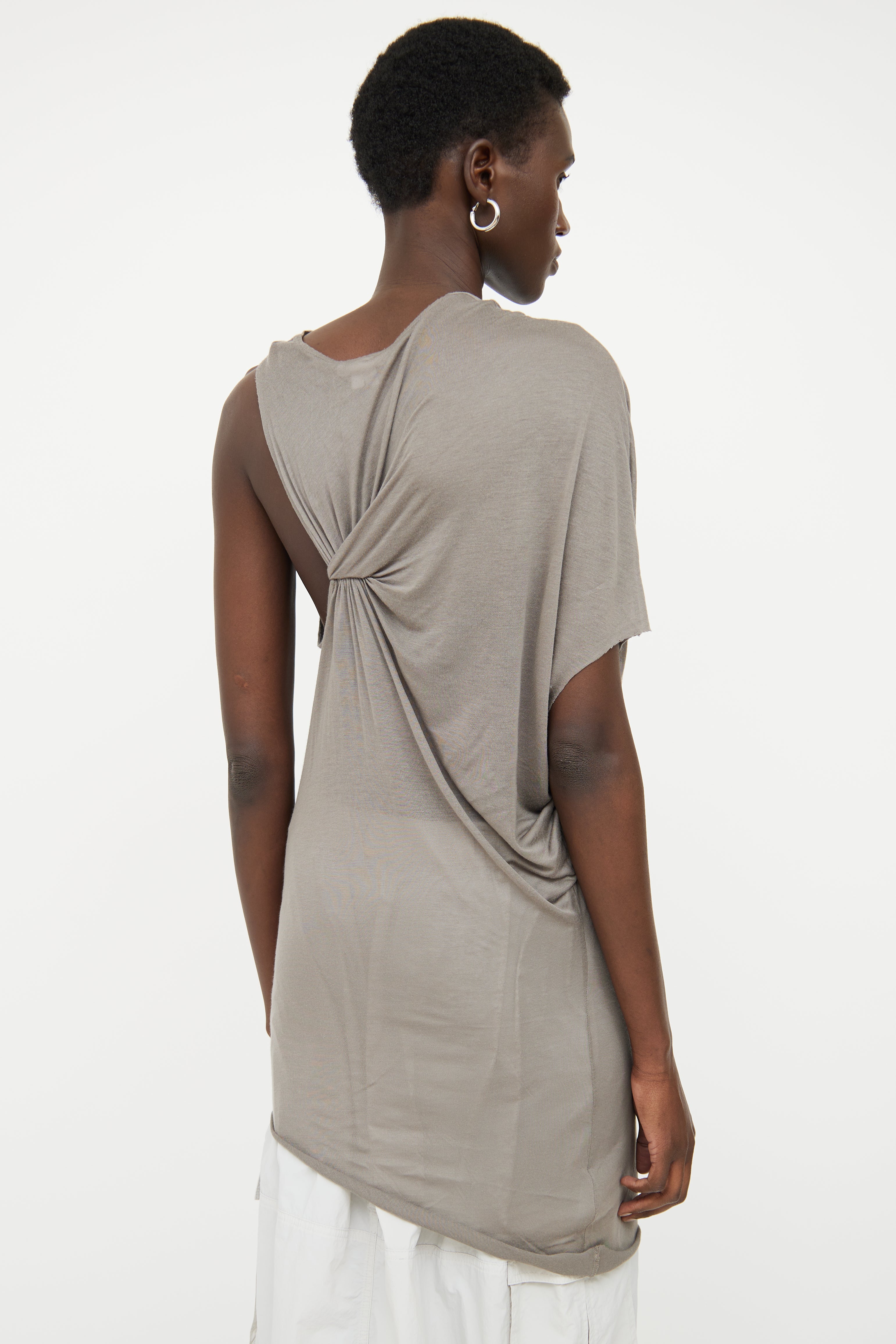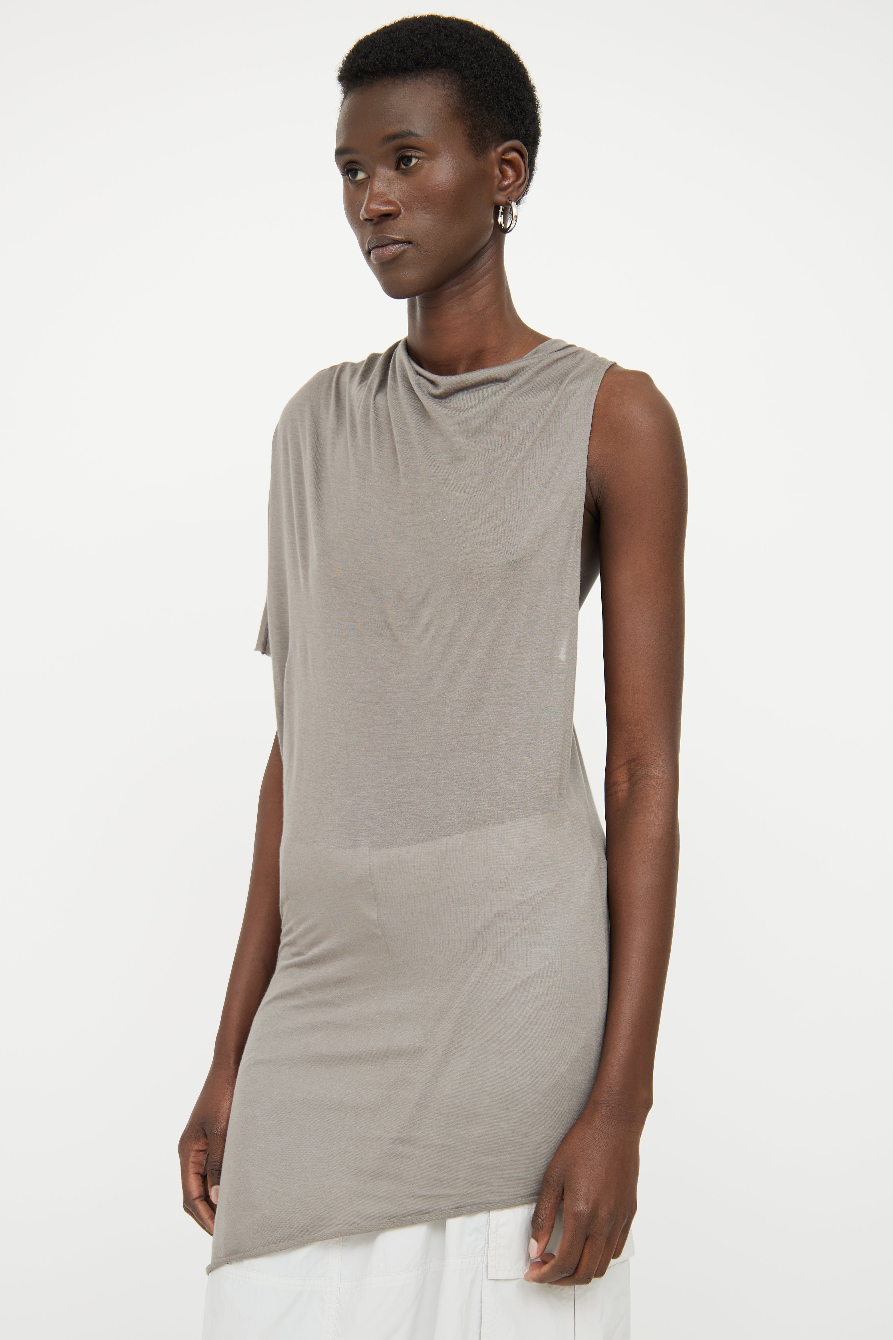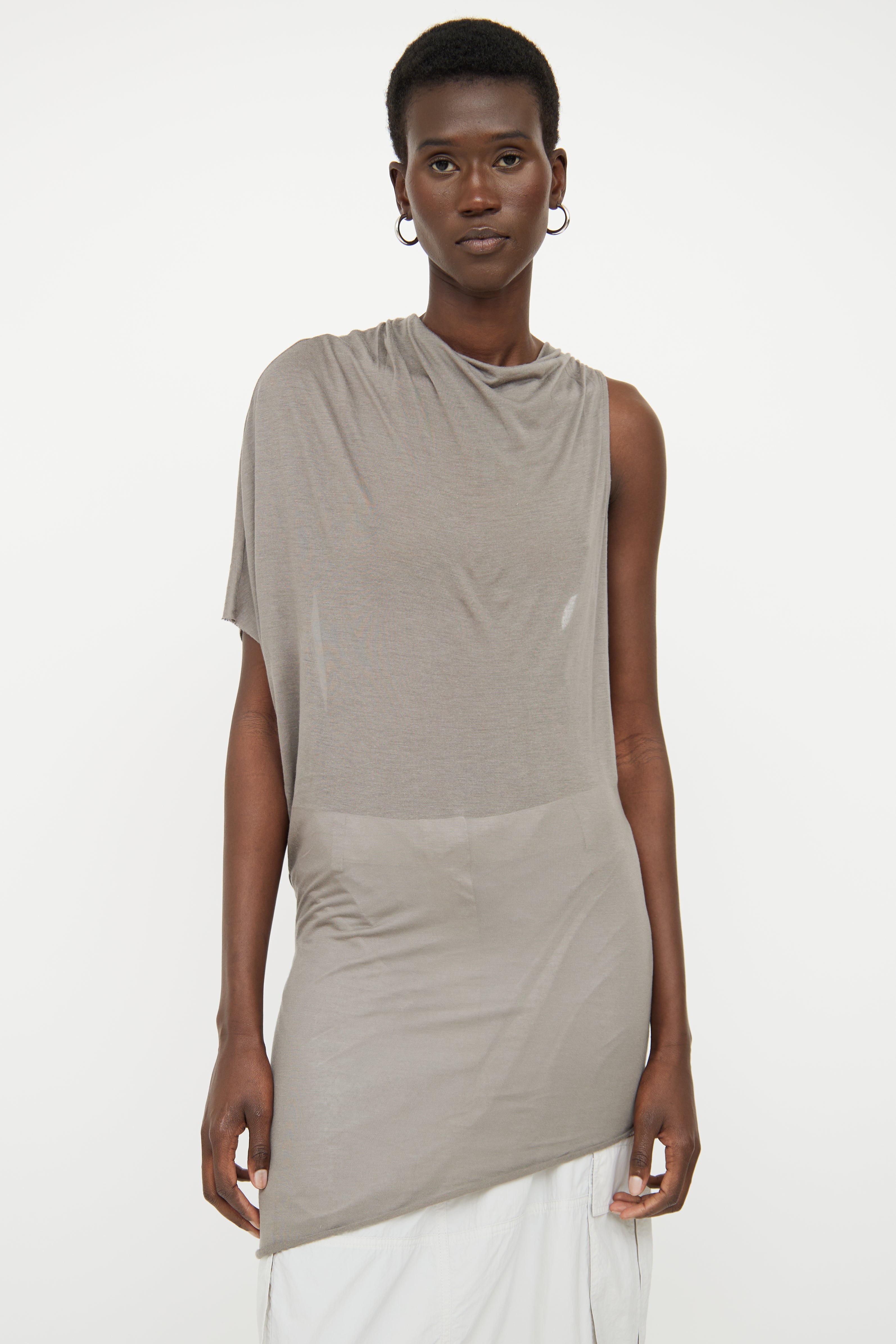 Pre-owned Helmut Lang grey asymmetrical sleeveless top featuring draped weighted neckline, right short sleeve, sleeveless left side and semi sheer.