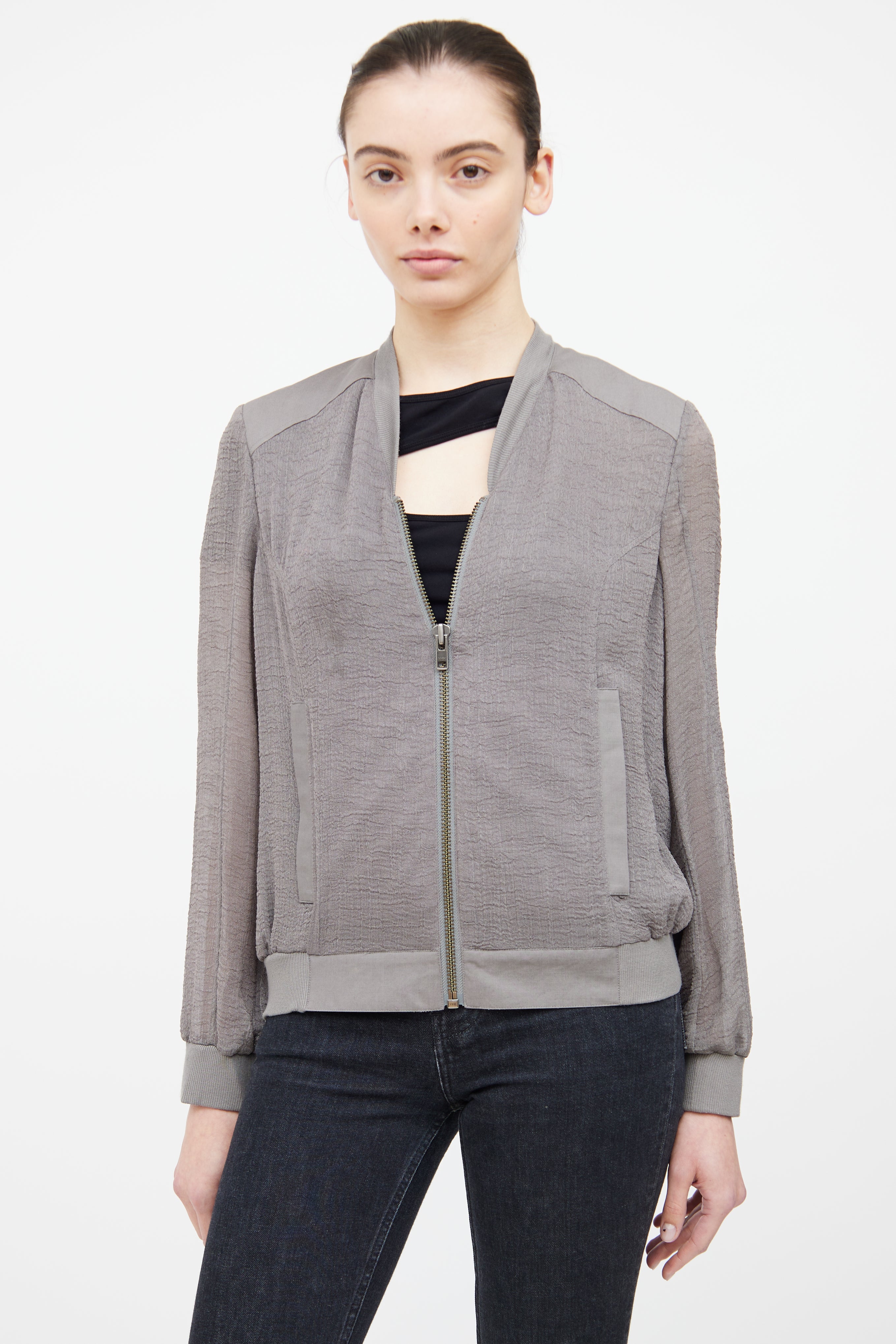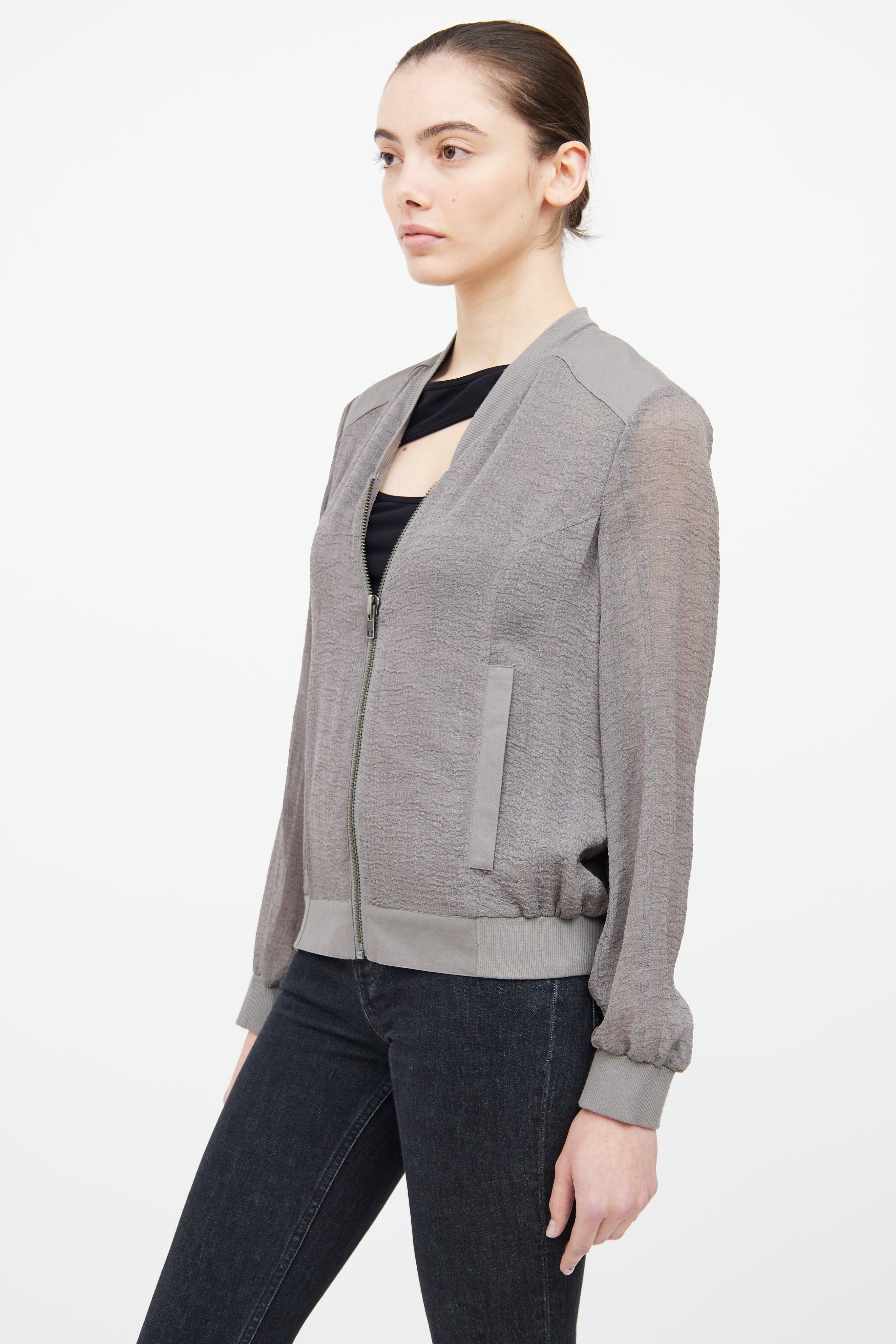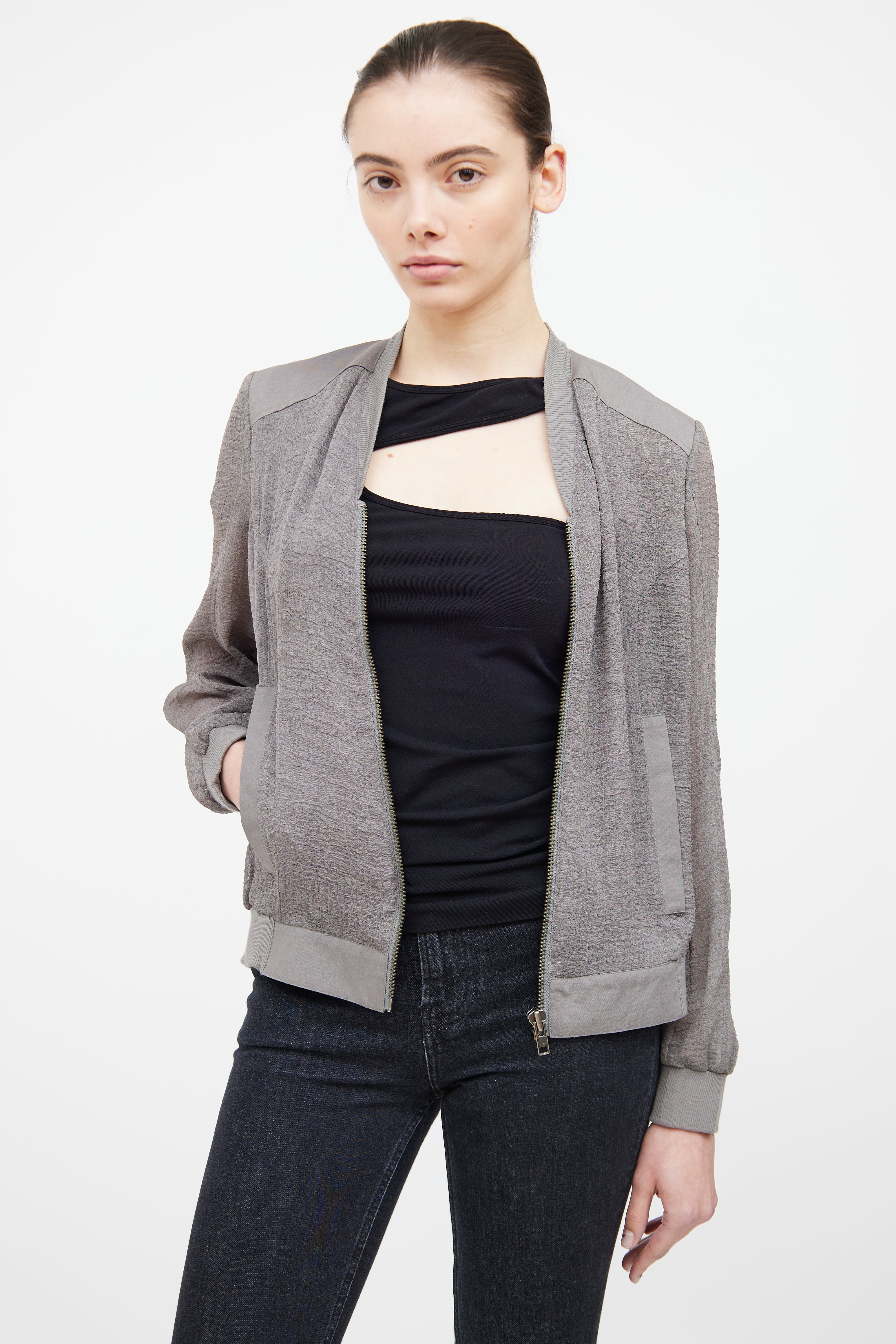 Pre-owned Helmut Lang grey textured bomber jacket featuring a rib knit collar, paneled shoulders, long sleeves with rib knit cuffs, dual pockets, rib knit hem, zip closure at front and pleat detailing at back.