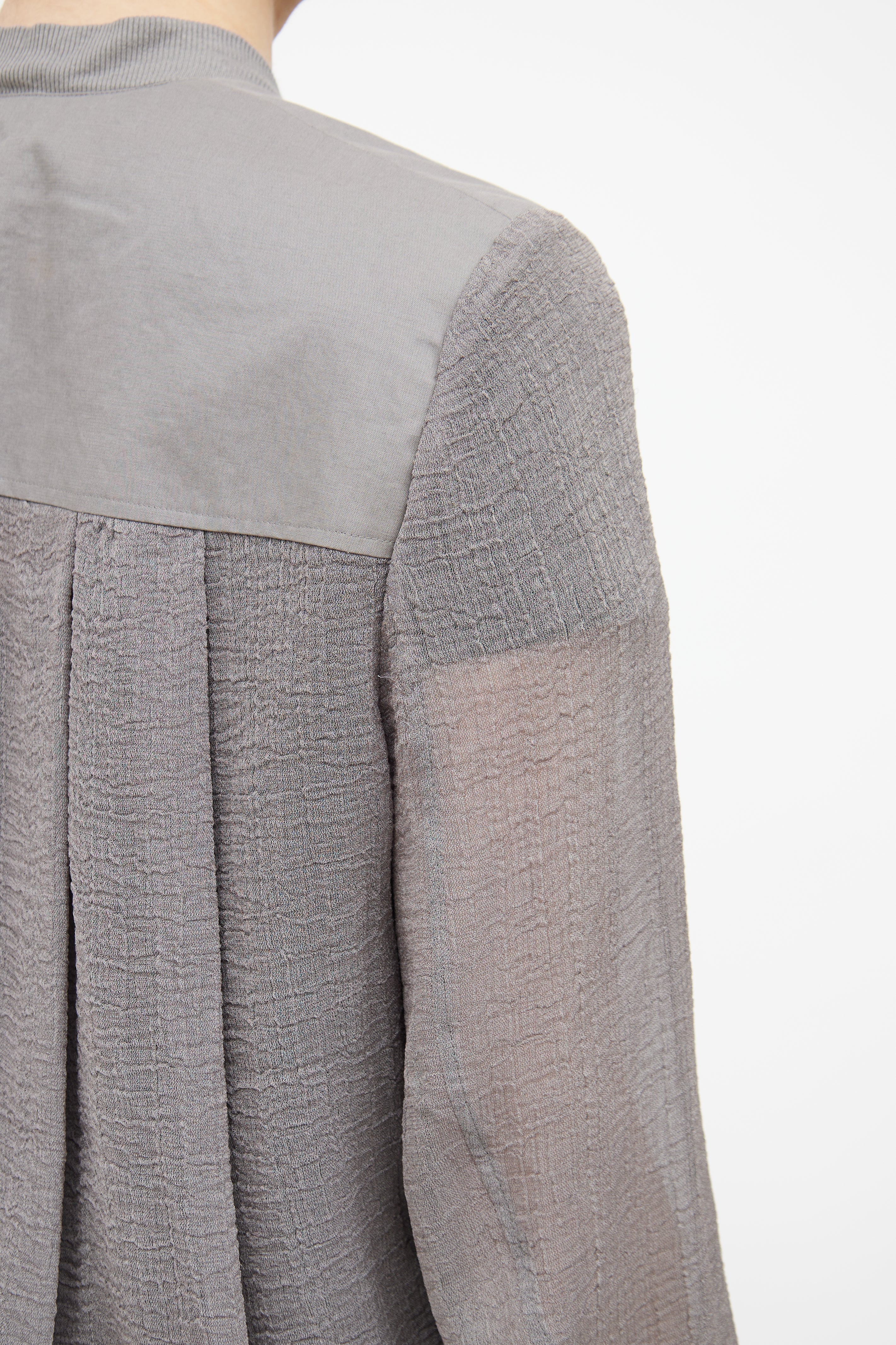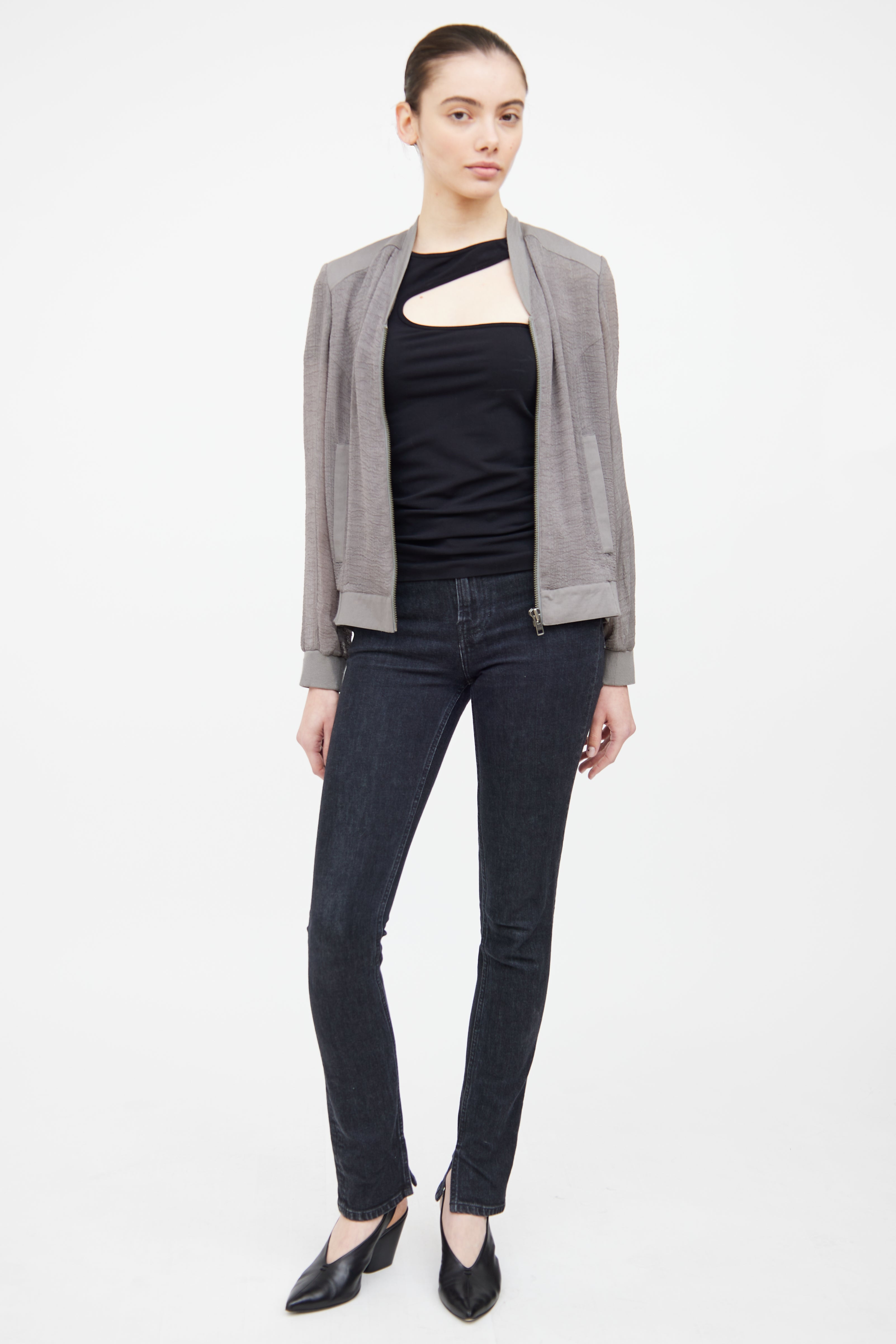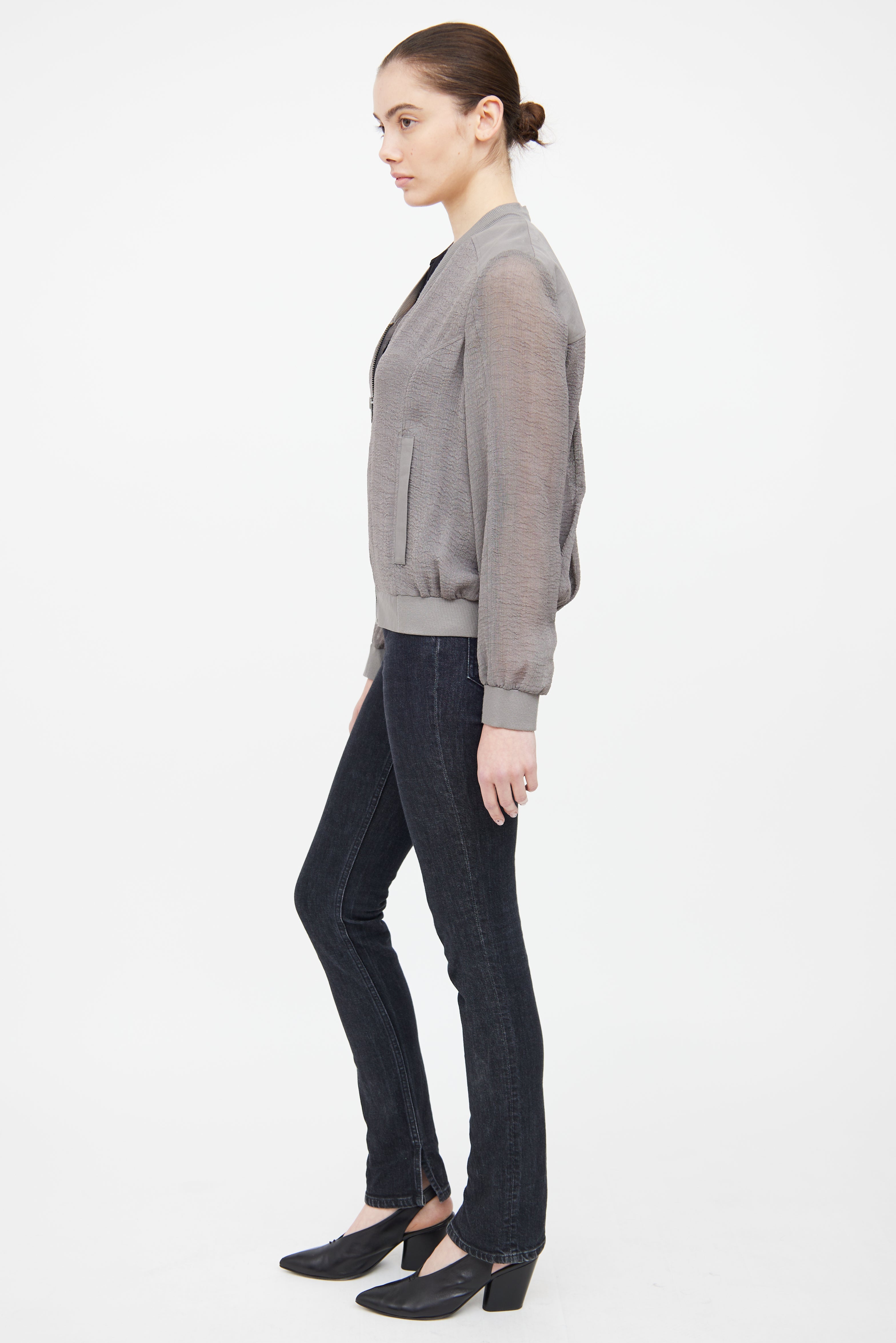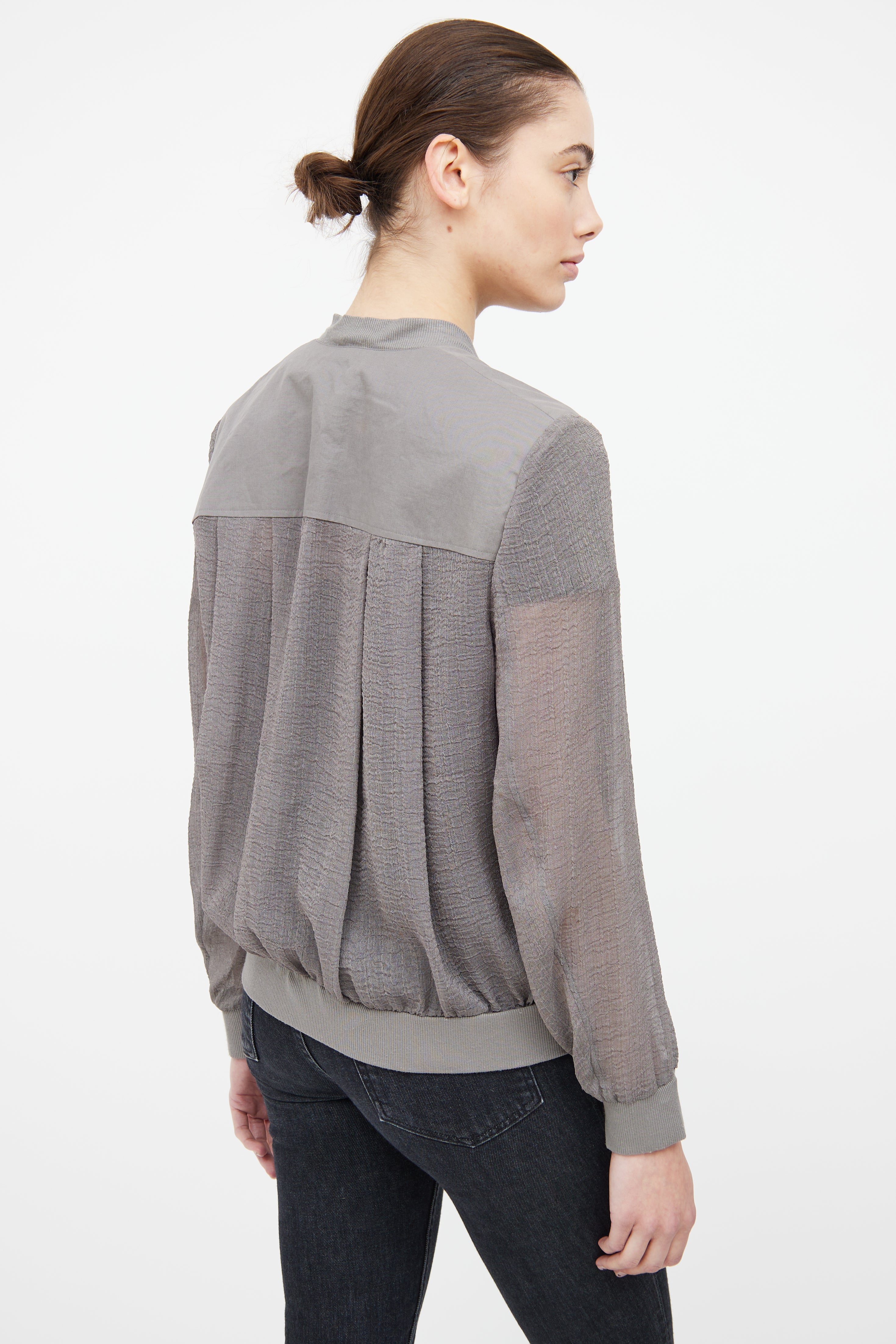Pre-owned Helmut Lang grey textured bomber jacket featuring a rib knit collar, paneled shoulders, long sleeves with rib knit cuffs, dual pockets, rib knit hem, zip closure at front and pleat detailing at back.
