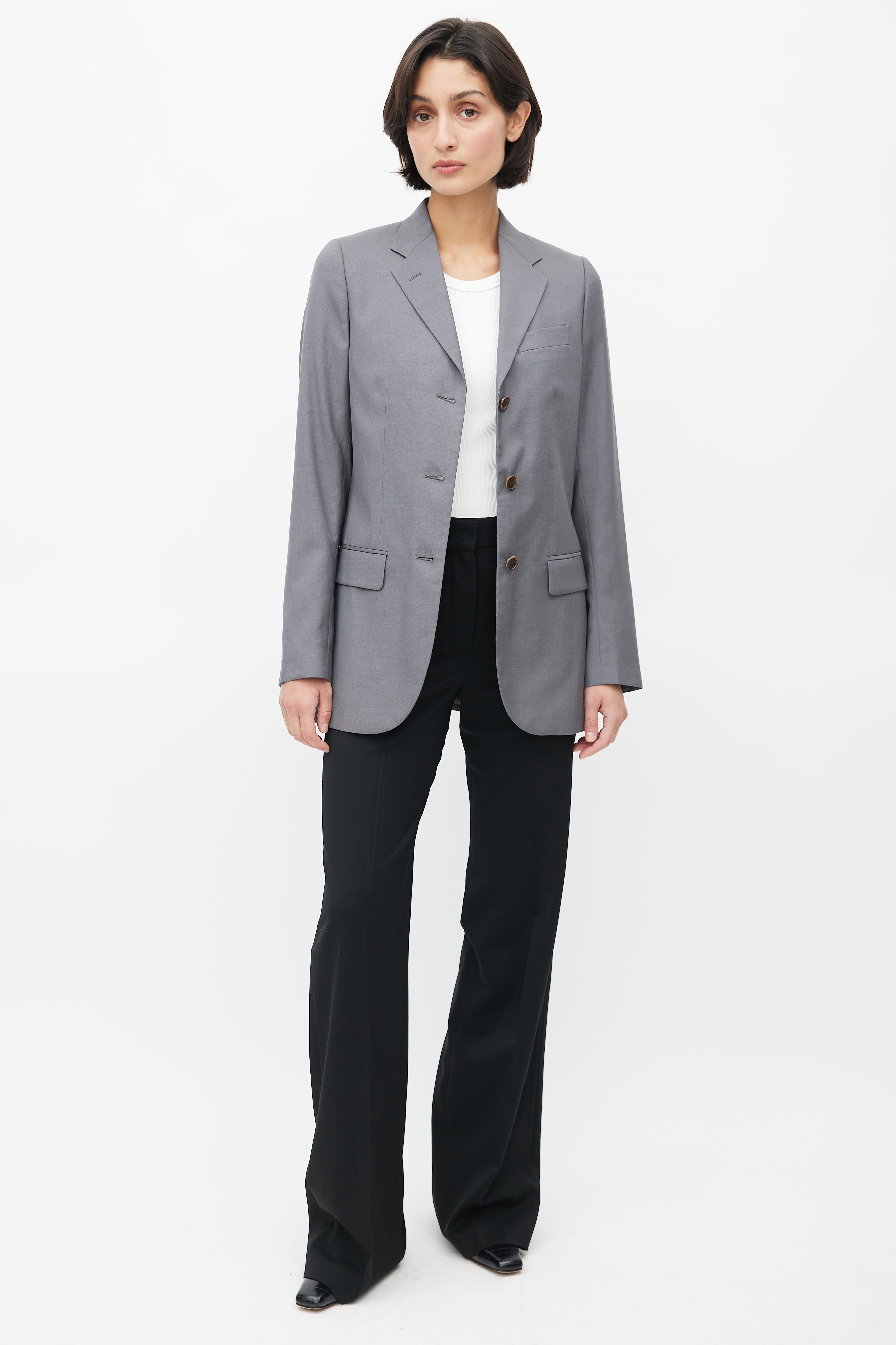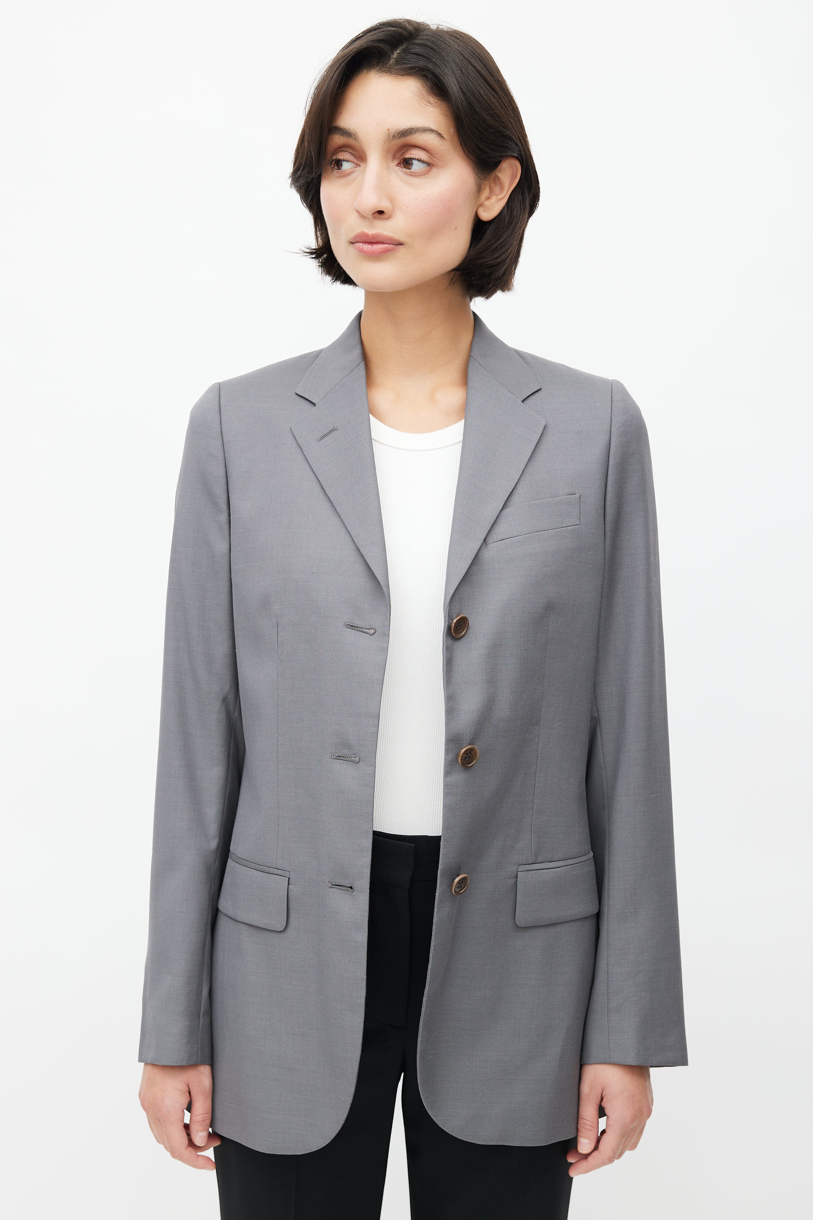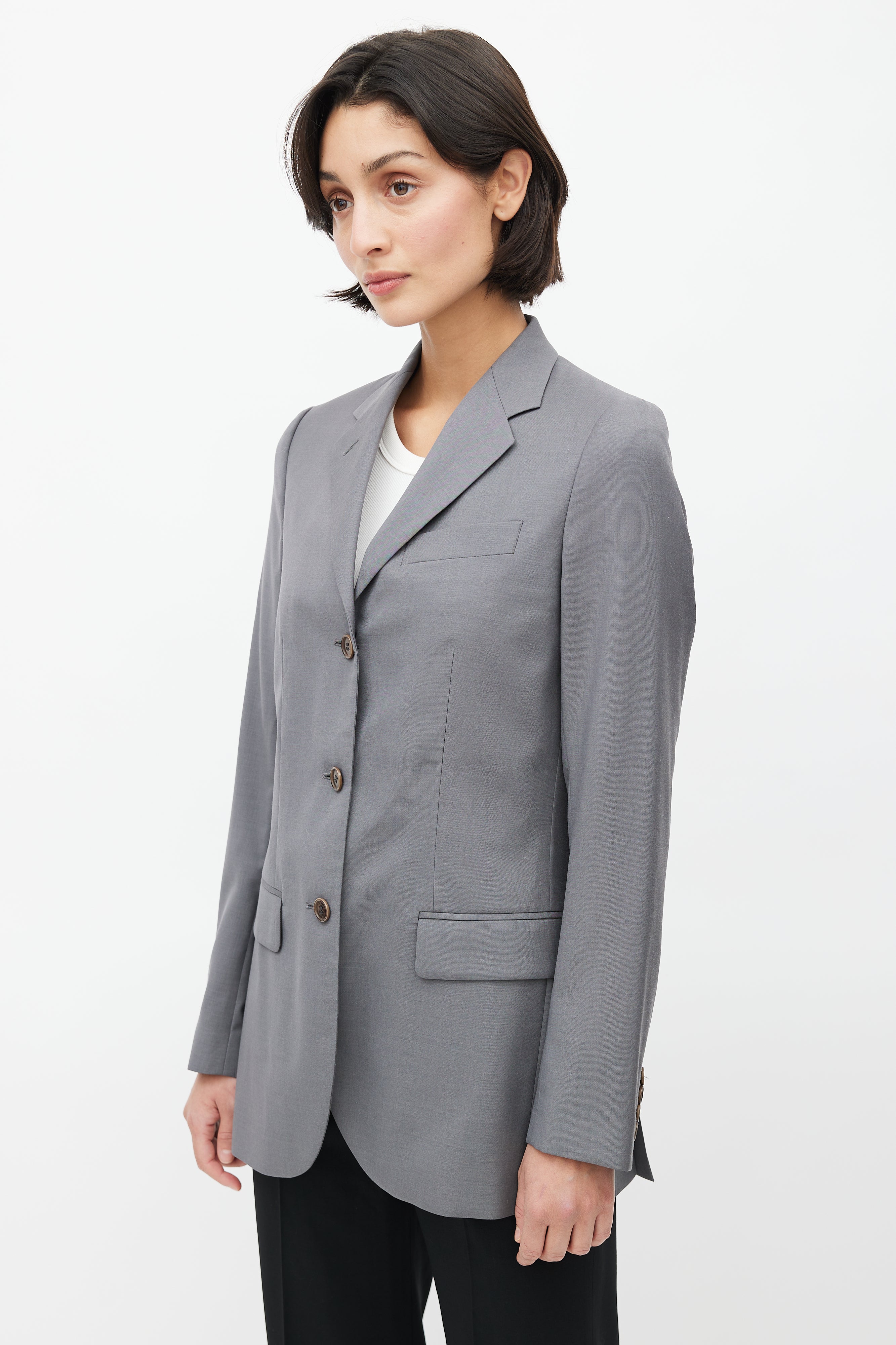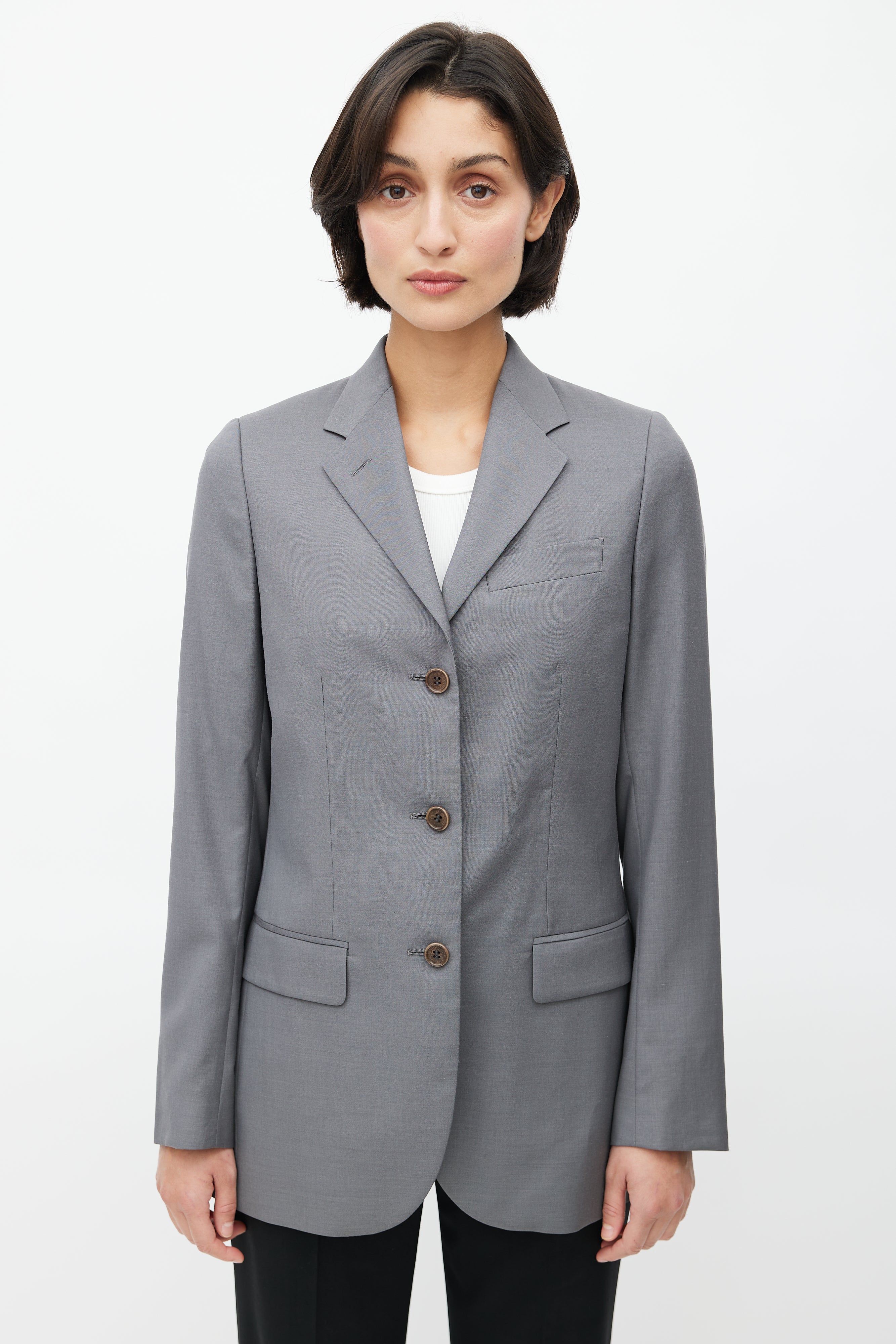 Pre-owned Helmut Lang 1990's grey wool blazer featuring a notched lapel, one welt pocket at chest, long sleeves with buttoned cuffs, two flap pockets at hip, adjustable interior criss cross straps, and button up front. Lined. Original Helmut Lang era design.