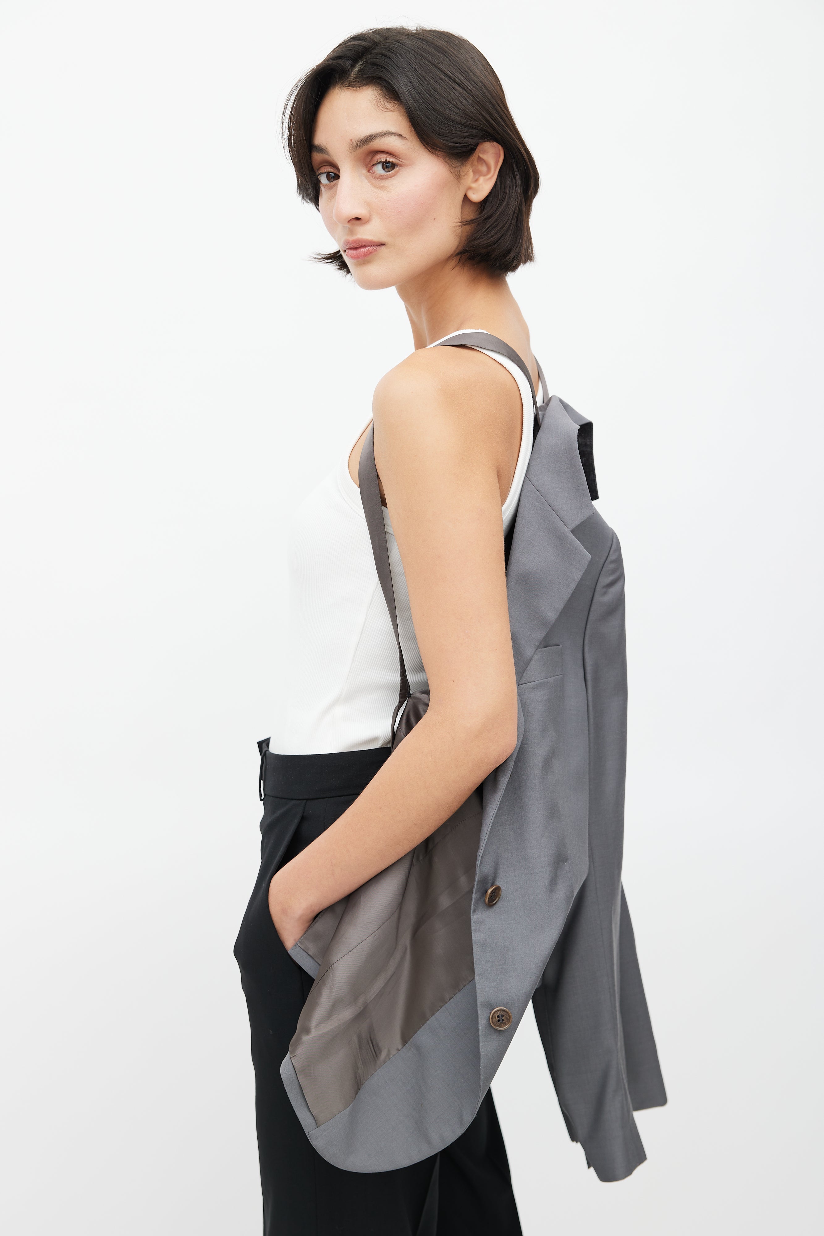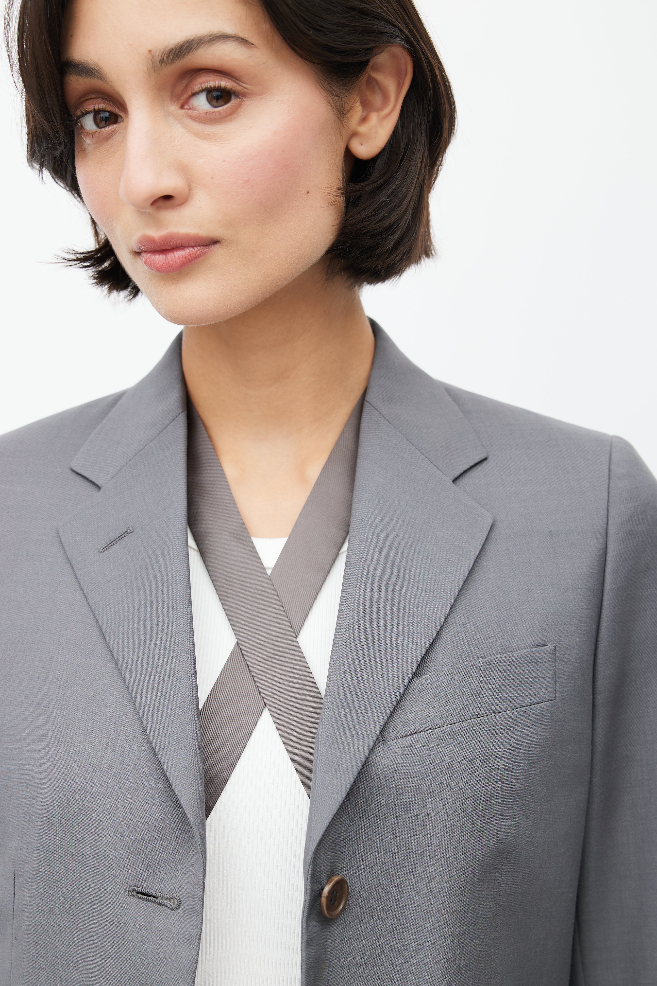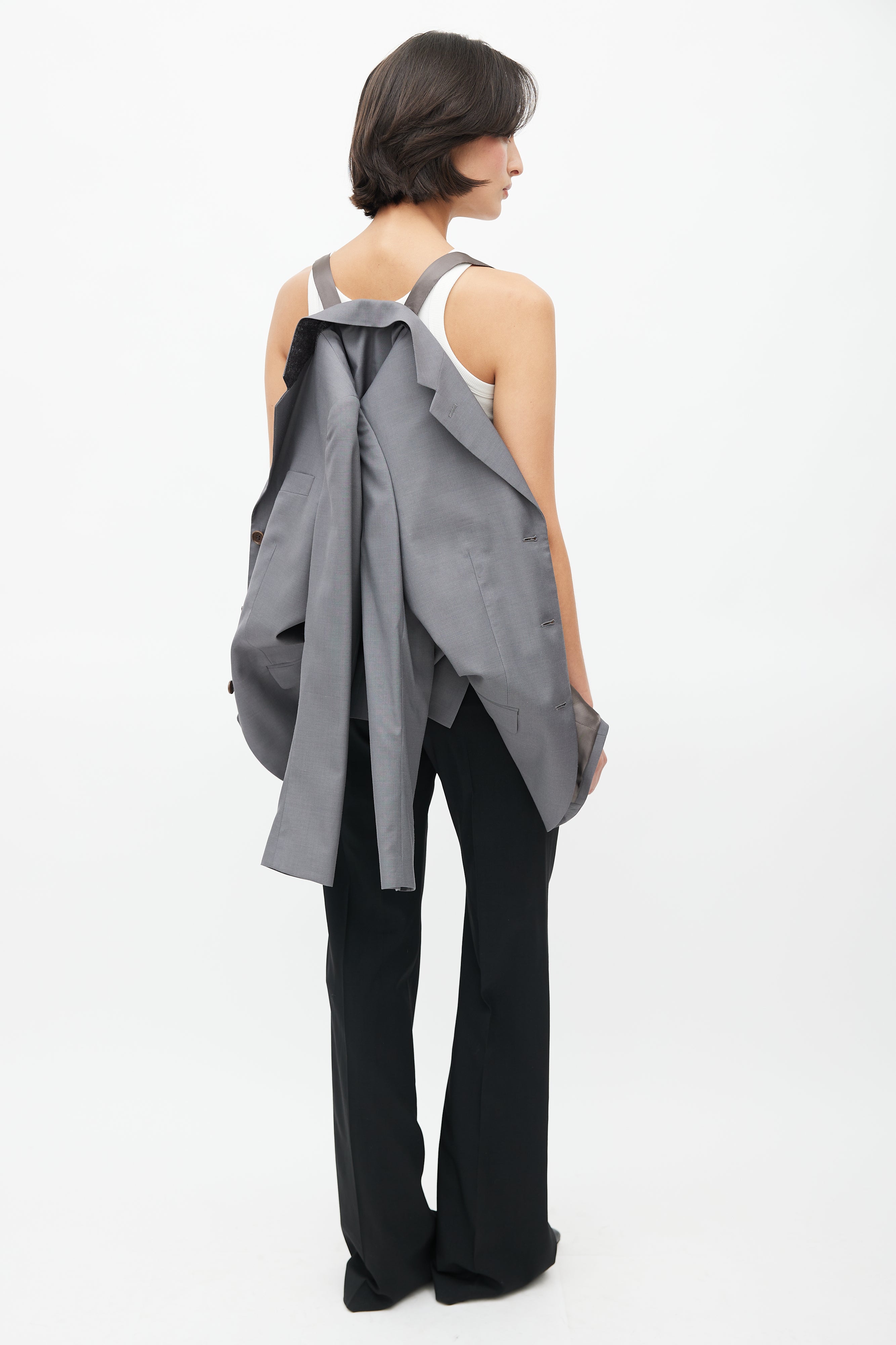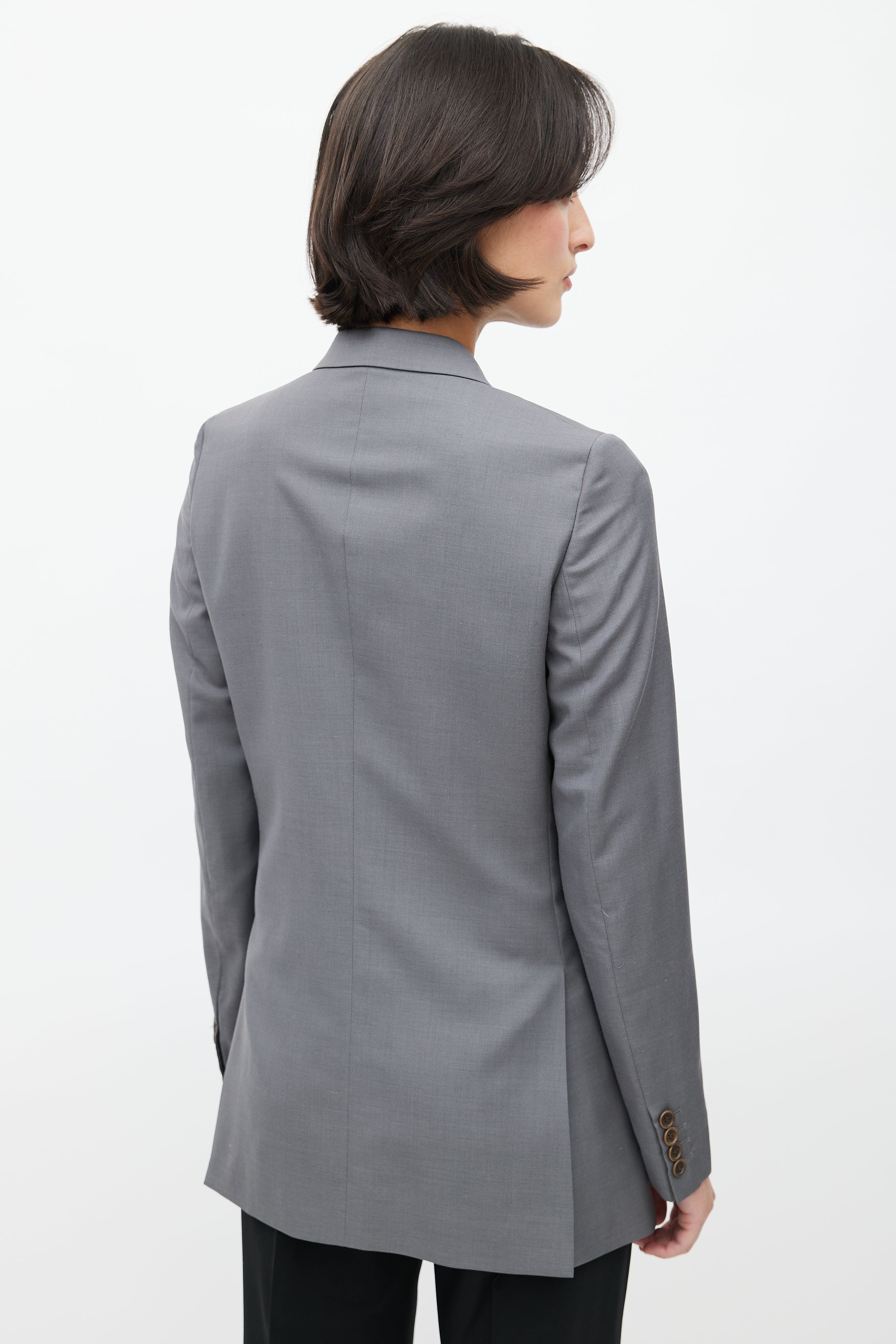 Pre-owned Helmut Lang 1990's grey wool blazer featuring a notched lapel, one welt pocket at chest, long sleeves with buttoned cuffs, two flap pockets at hip, adjustable interior criss cross straps, and button up front. Lined. Original Helmut Lang era design.