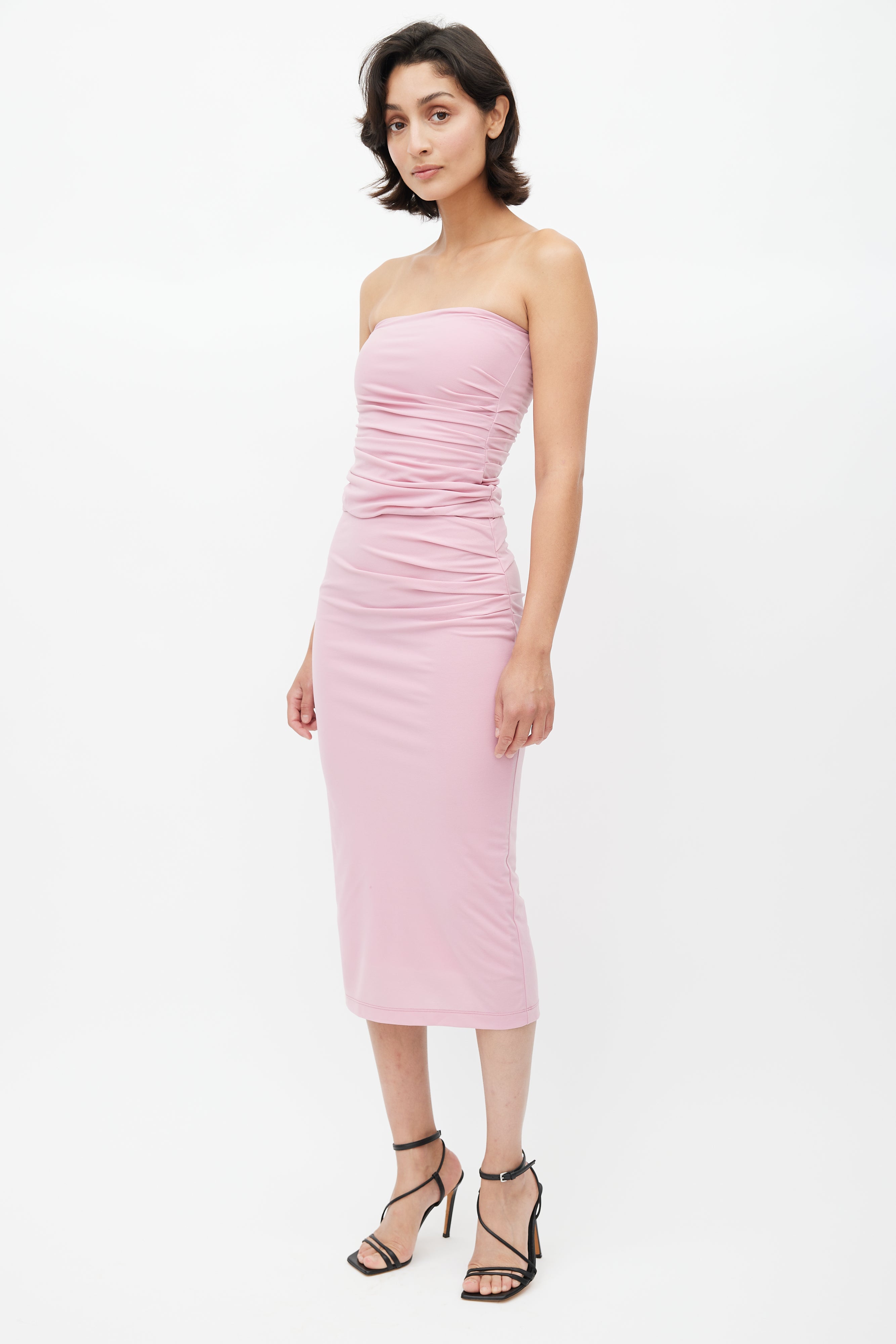 Pre-owned Helmut Lang pink tube top featuring a straight across neckline, and gathered detailing throughout. Matching skirt features an elasticized waist, and gathered detailing throughout.