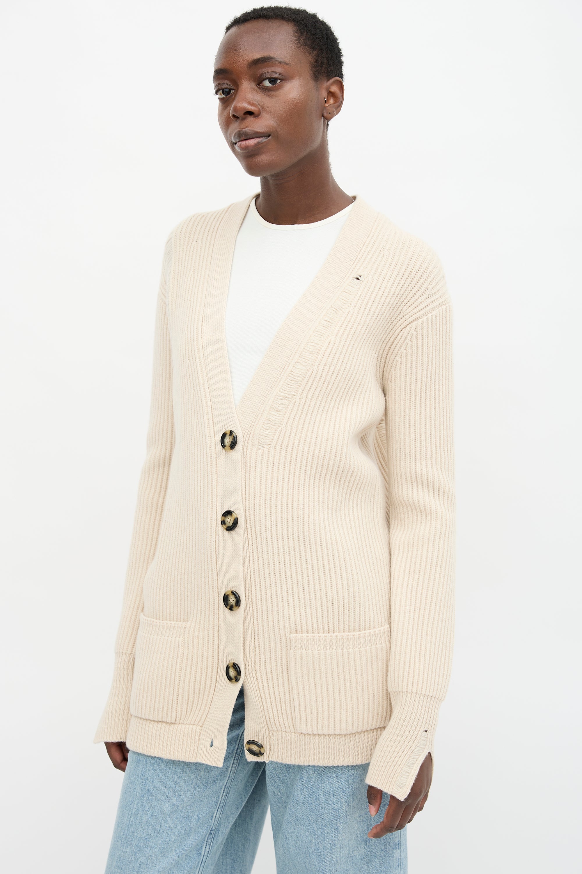 Pre-owned Helmut Lang cream wool oversized cardigan featuring intentional distressing, button front, cuff vents, and two patch pockets.