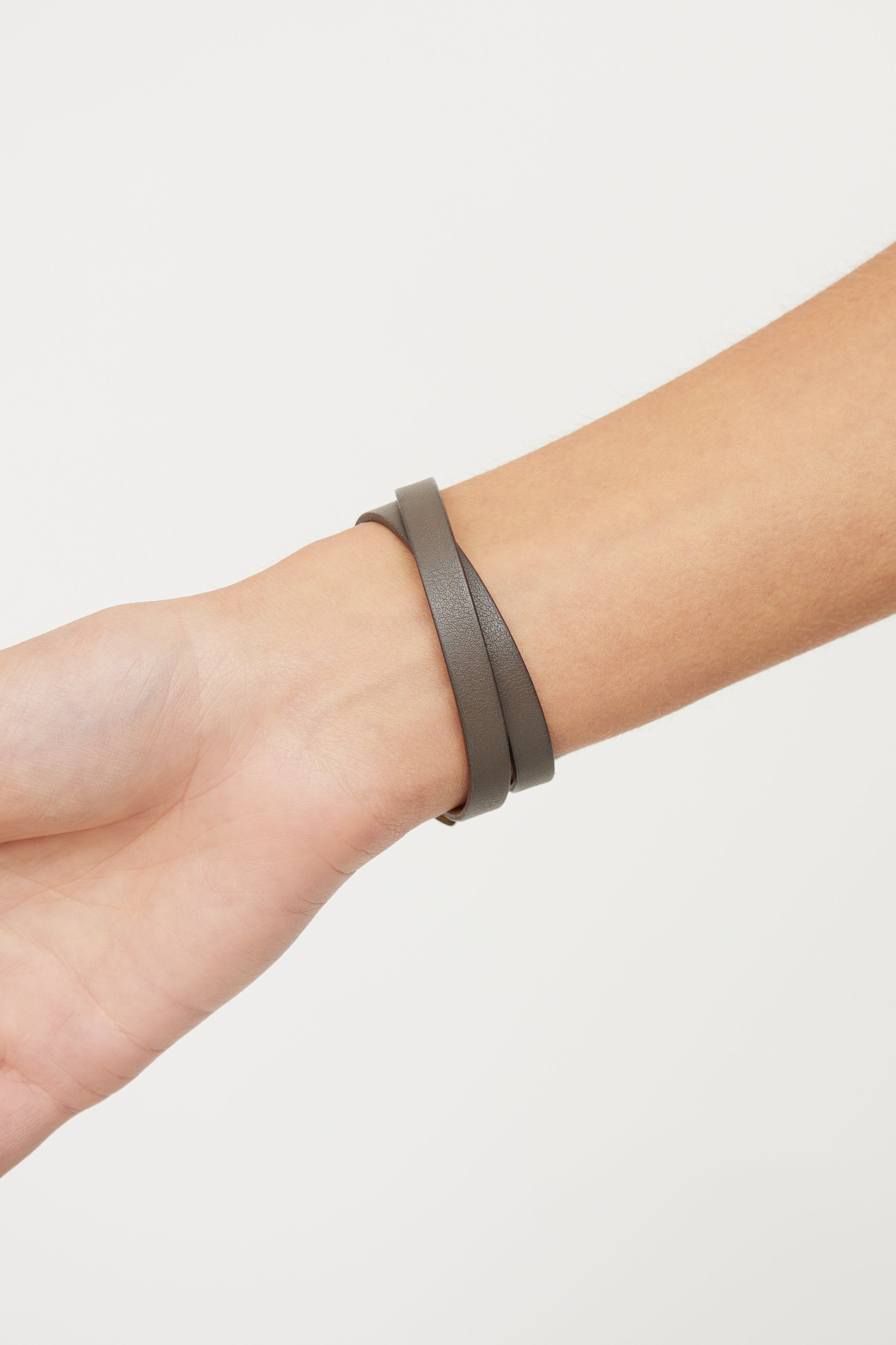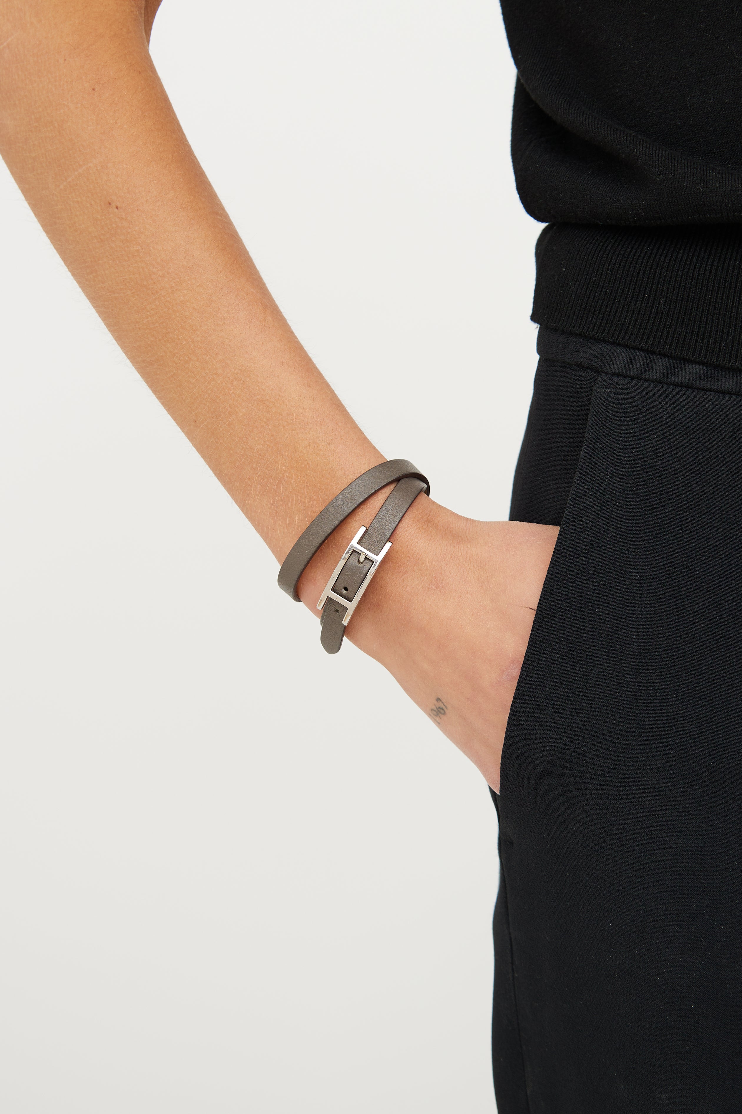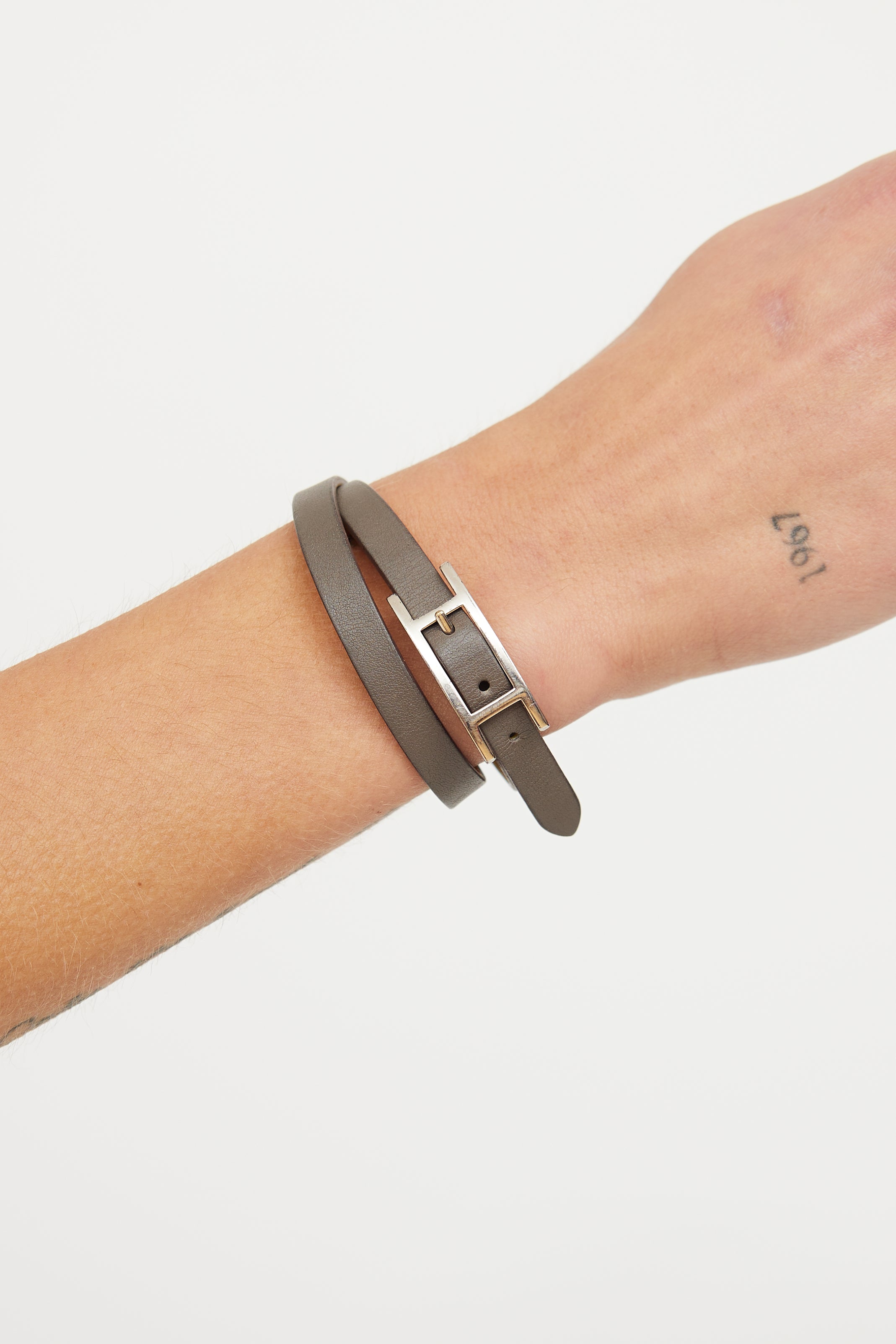 Pre-owned Hermès grey leather Behapi Double Tour adjustable bracelet featuring grained leather exterior, yellow interior and silver-tone hardware.