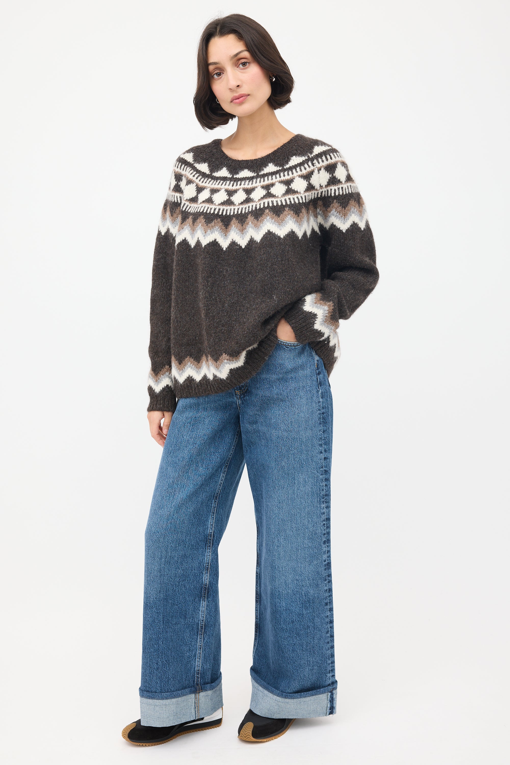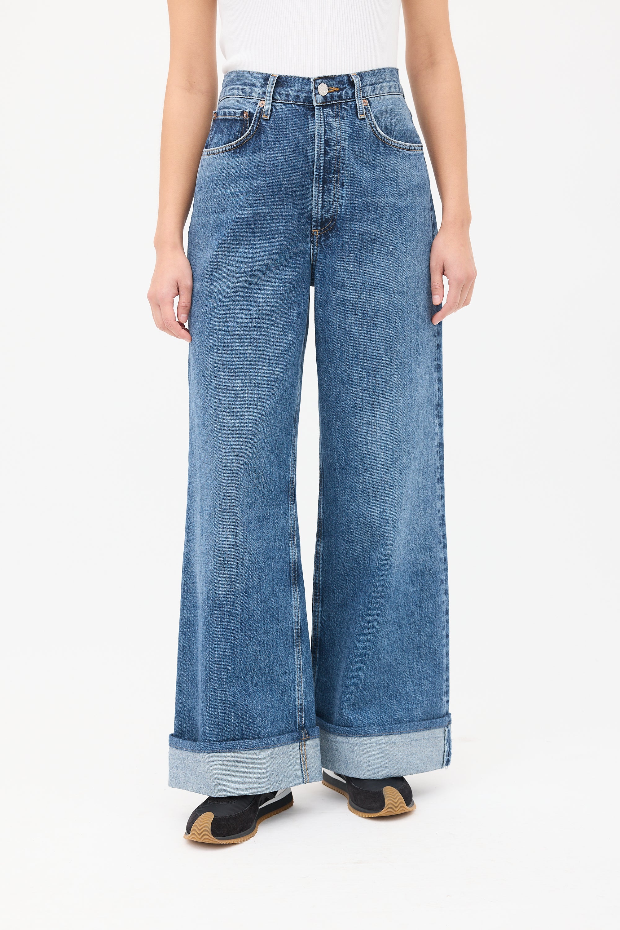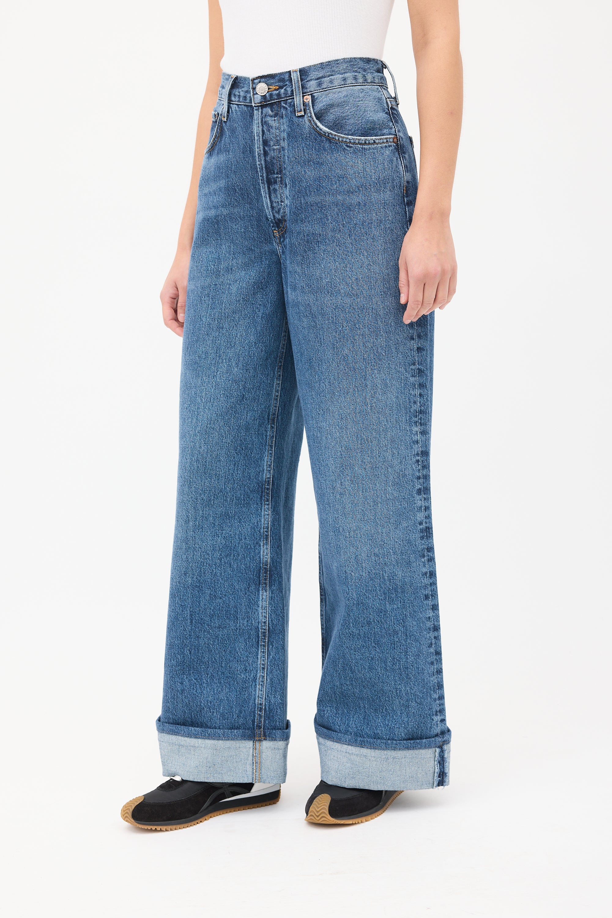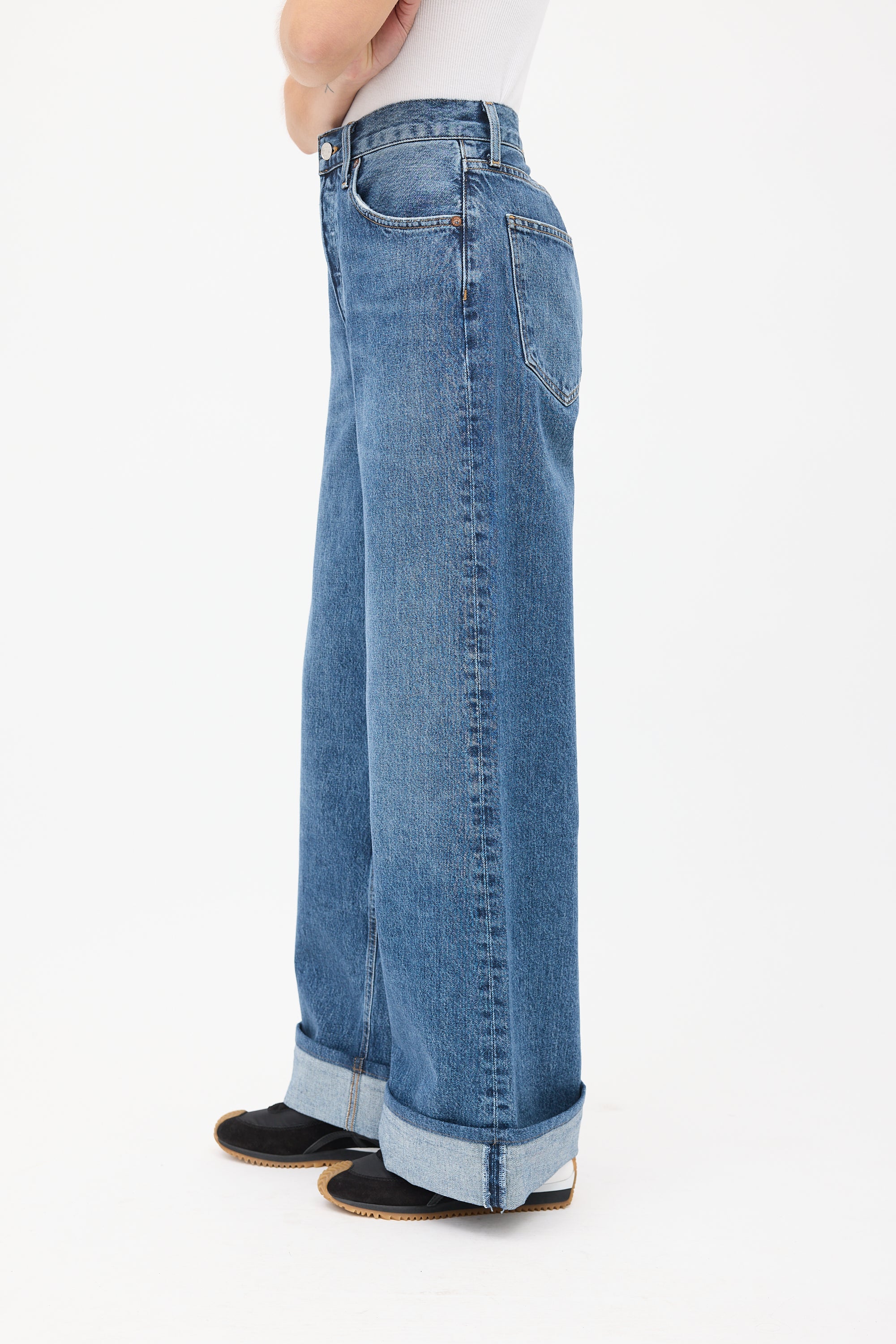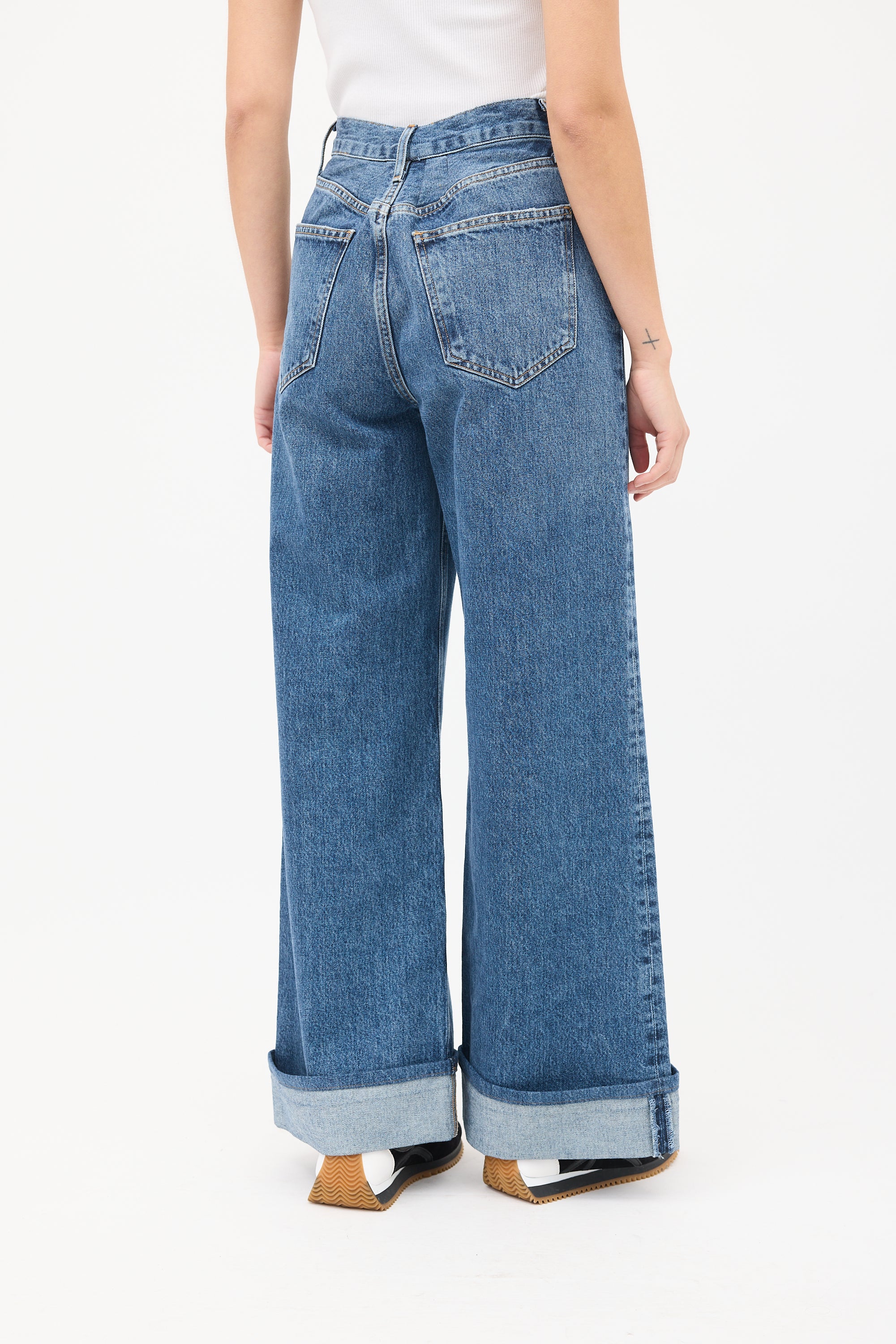 Pre-owned Agolde medium wash Dame jeans featuring a high waist with darting at back, cuffed wide leg, five pocket styling, button fly, and light intentional distressing throughout.