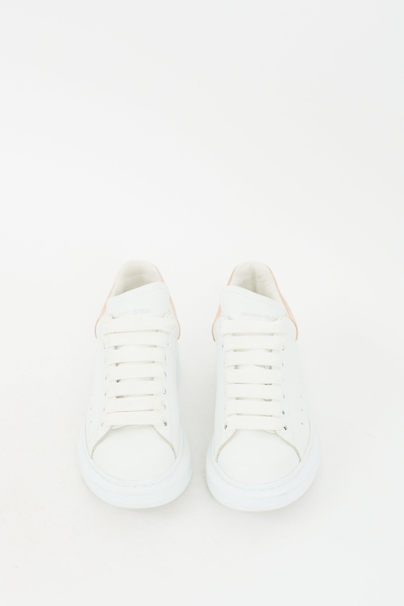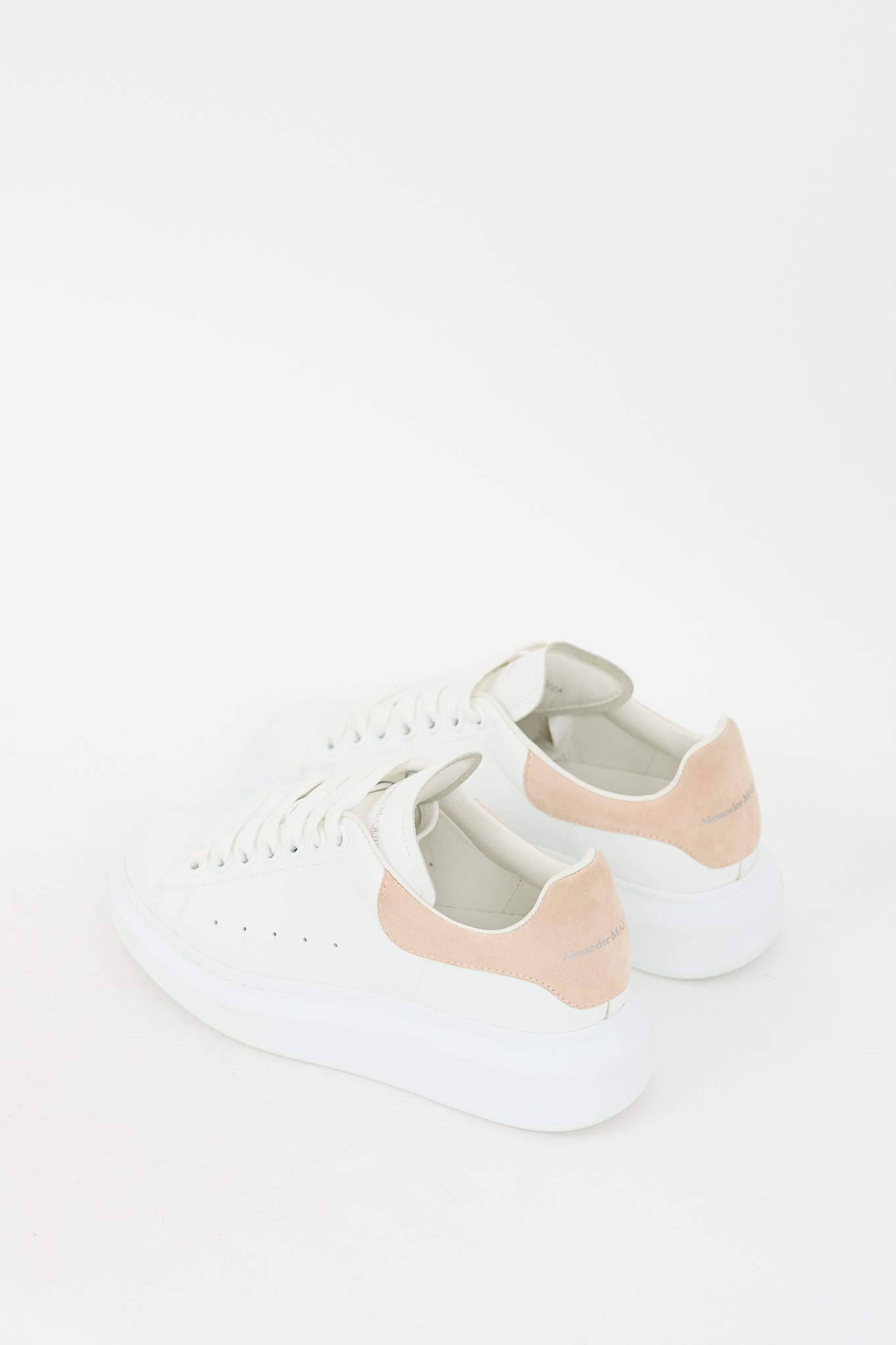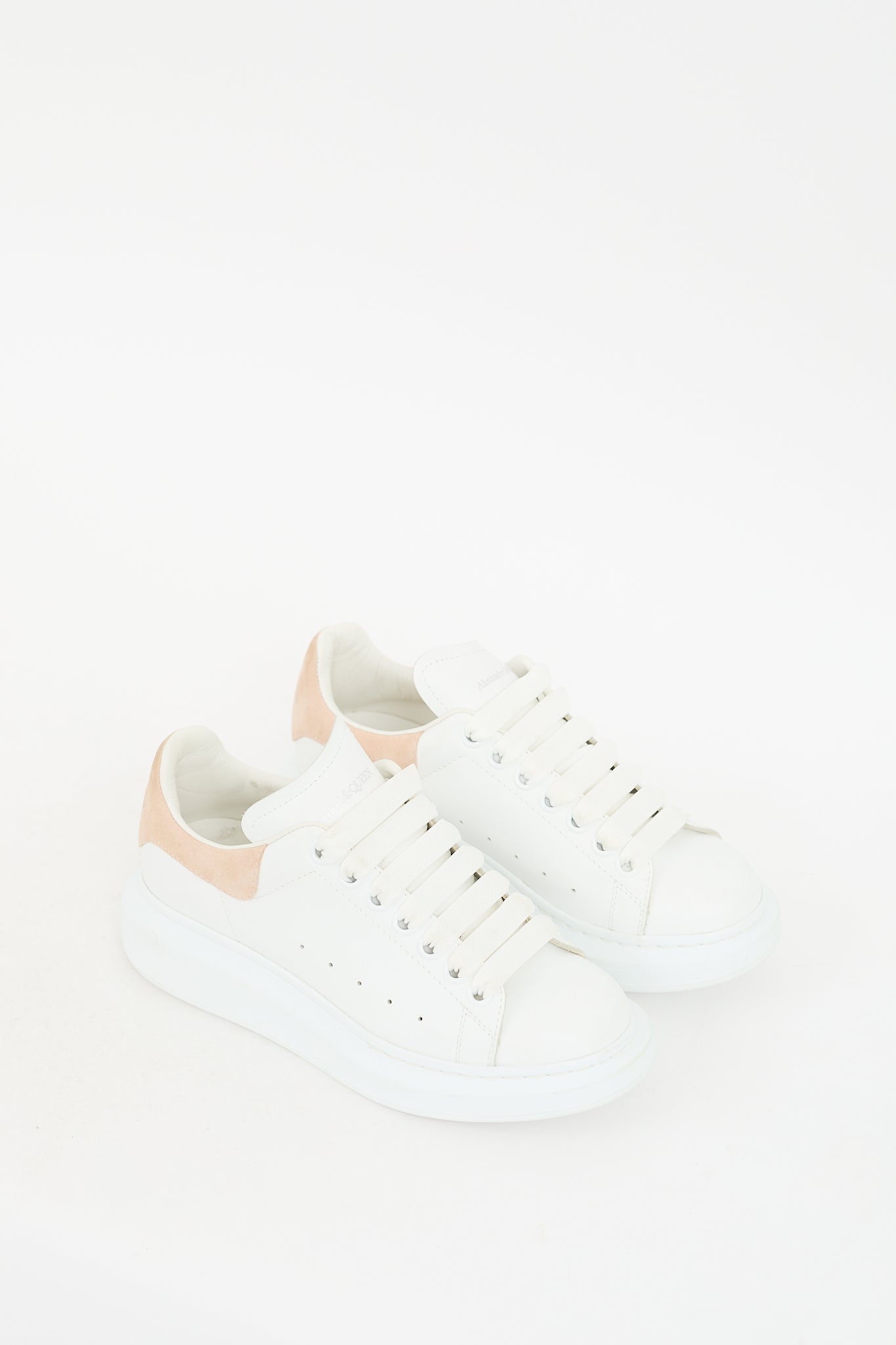 Pre-owned Alexander McQueen white Oversized sneakers featuring a rounded toe, leather upper, lace up front, stamped logo at tongue, beige suede counter with stamped logo, and rubber sole. Comes with original dust bag.