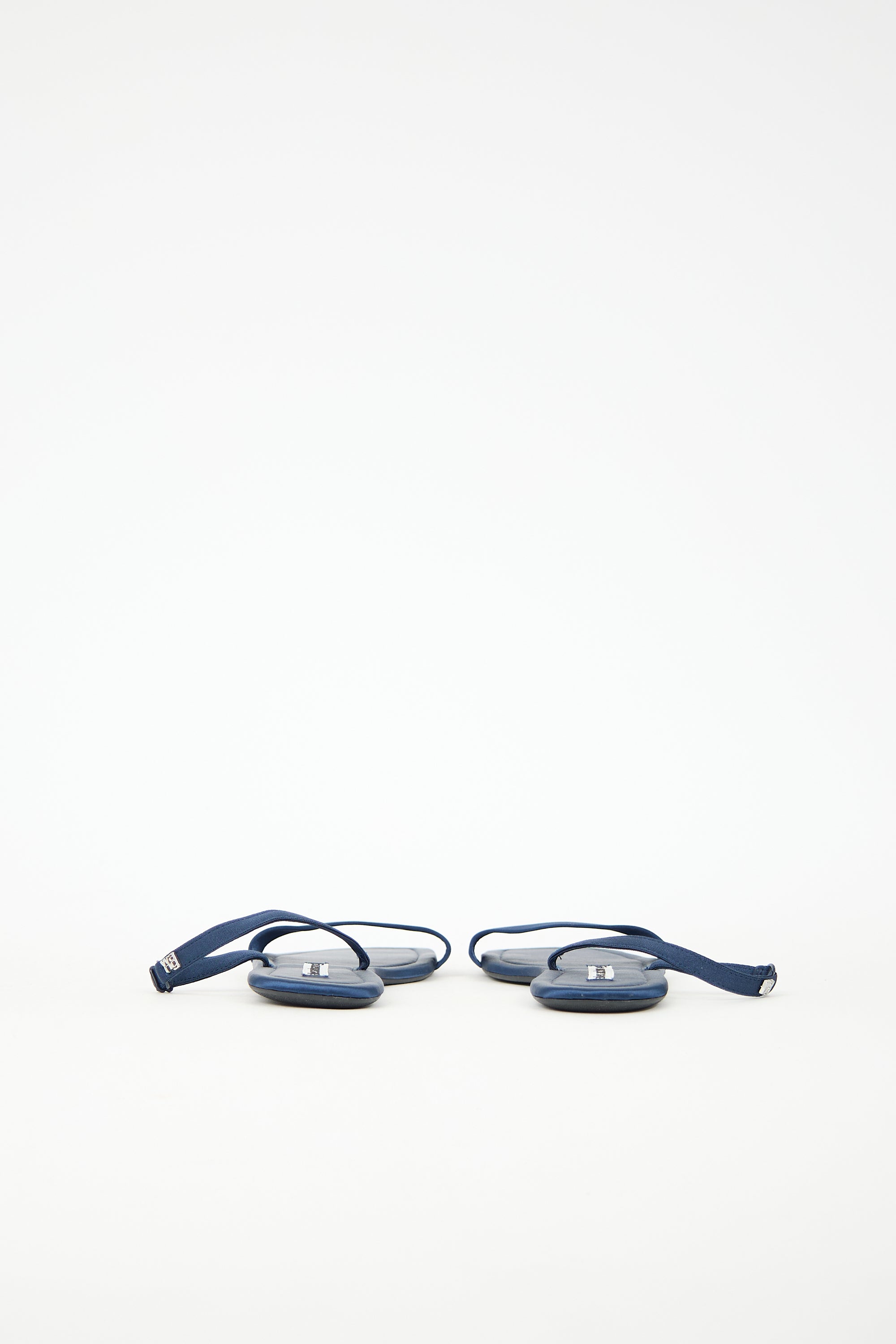 Pre-owned Alexander Wang navy satin sandals featuring open square toe and silver tone logo at adjustable ankle strap.