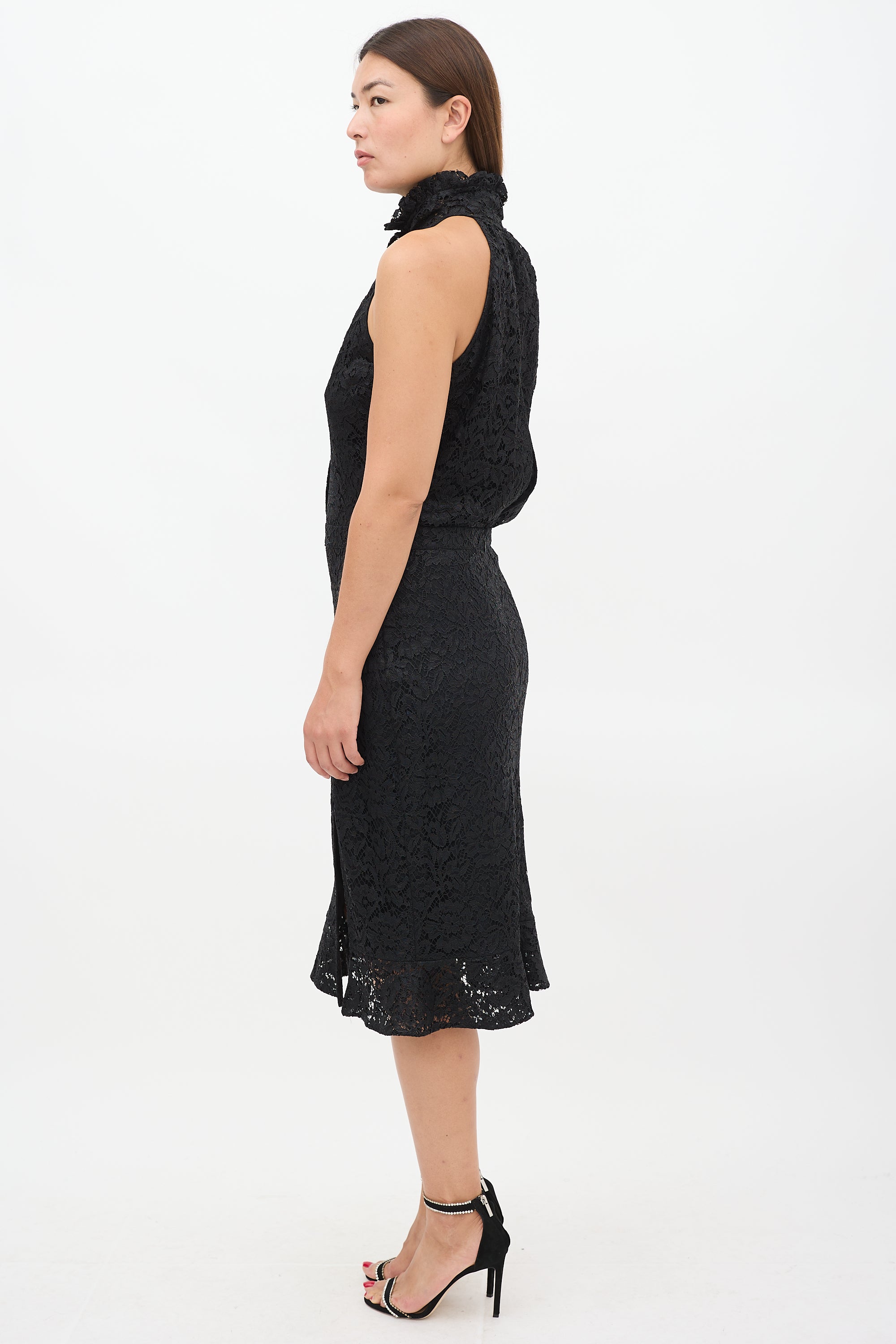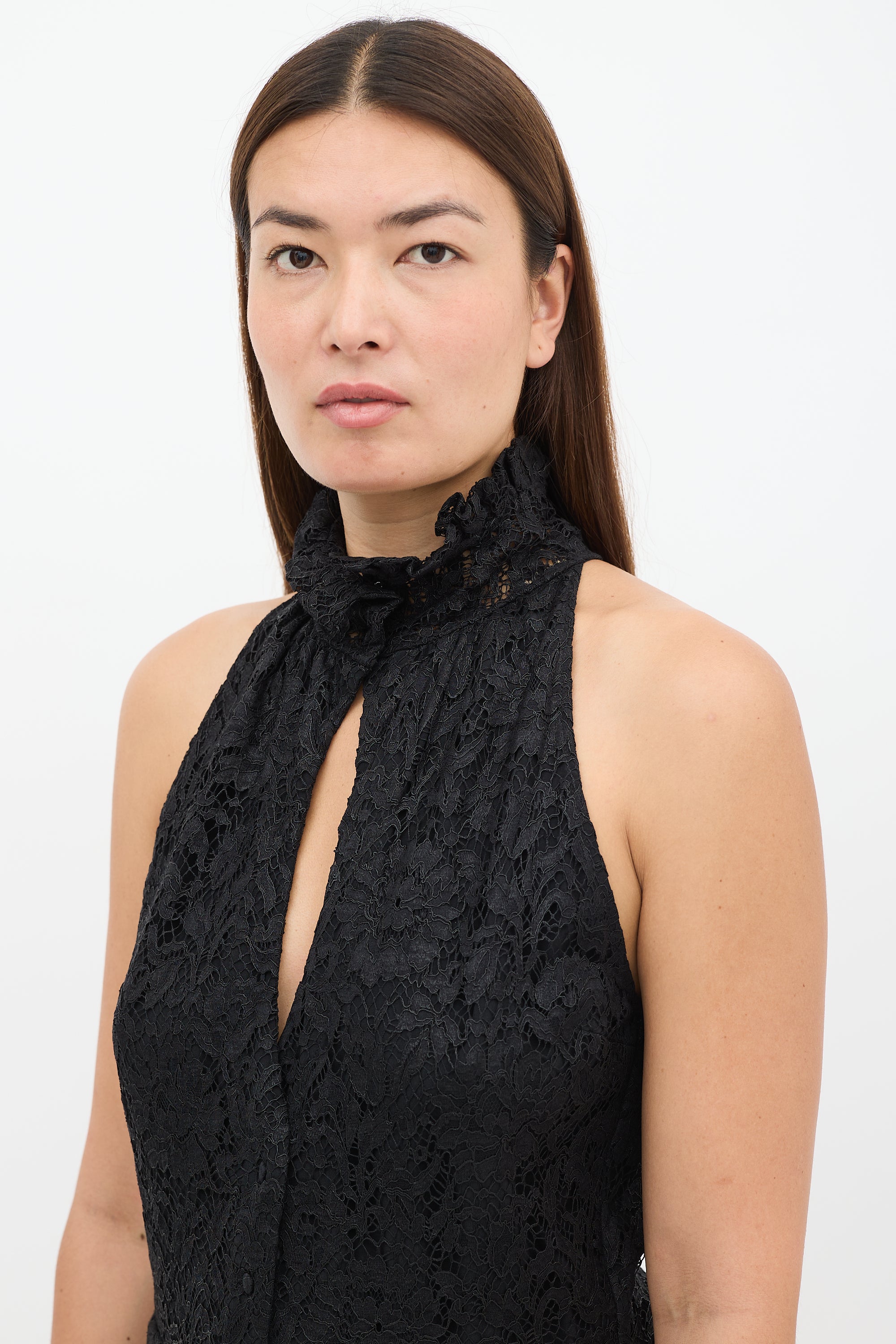 Pre-owned Altuzarra black floral Guipure lace sleeveless midi dress featuring a button up stand collar with ruffle trim, button up front with chest cutout, front leg slit, flounced hem, centre back cutout, and concealed back zip. Lined.