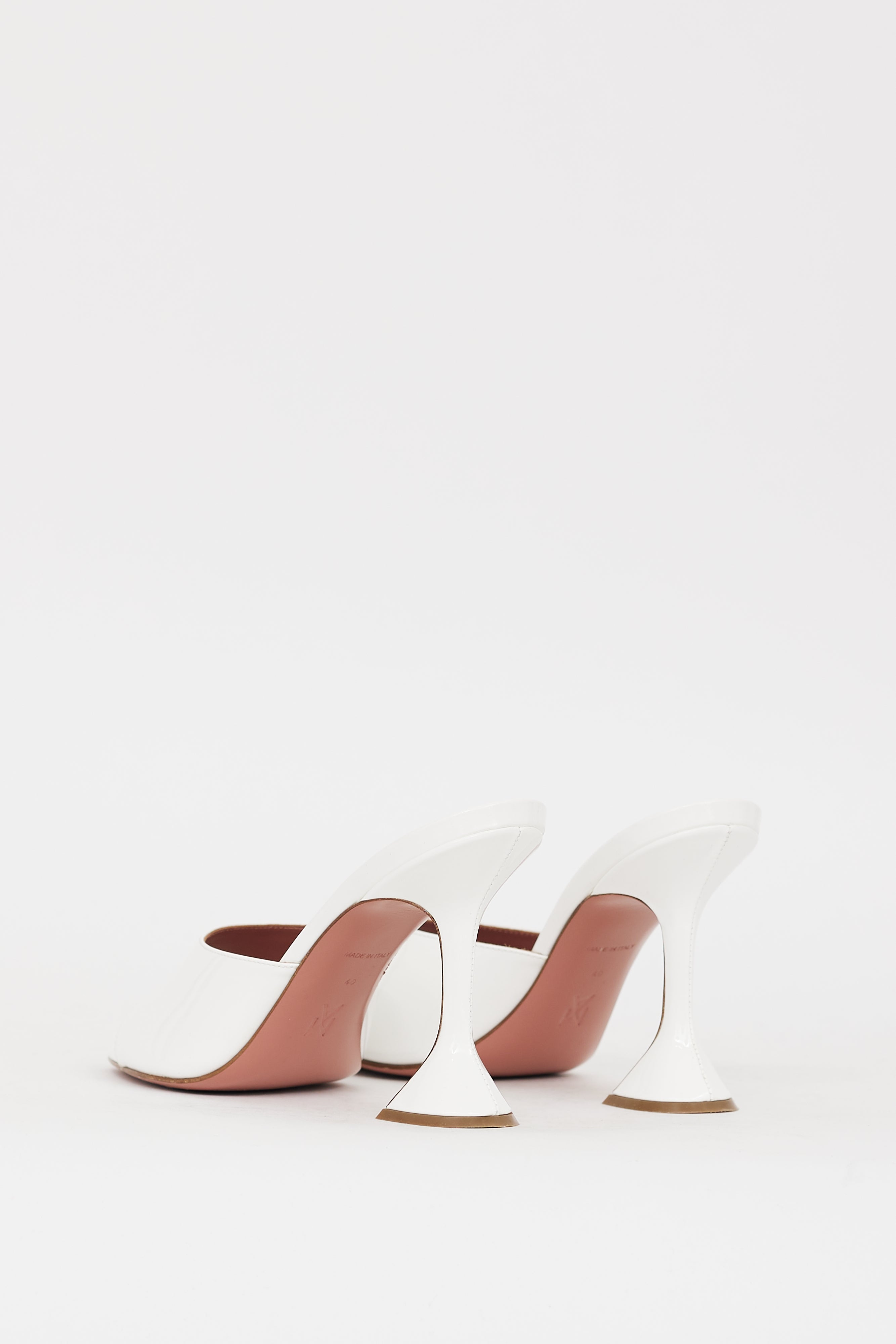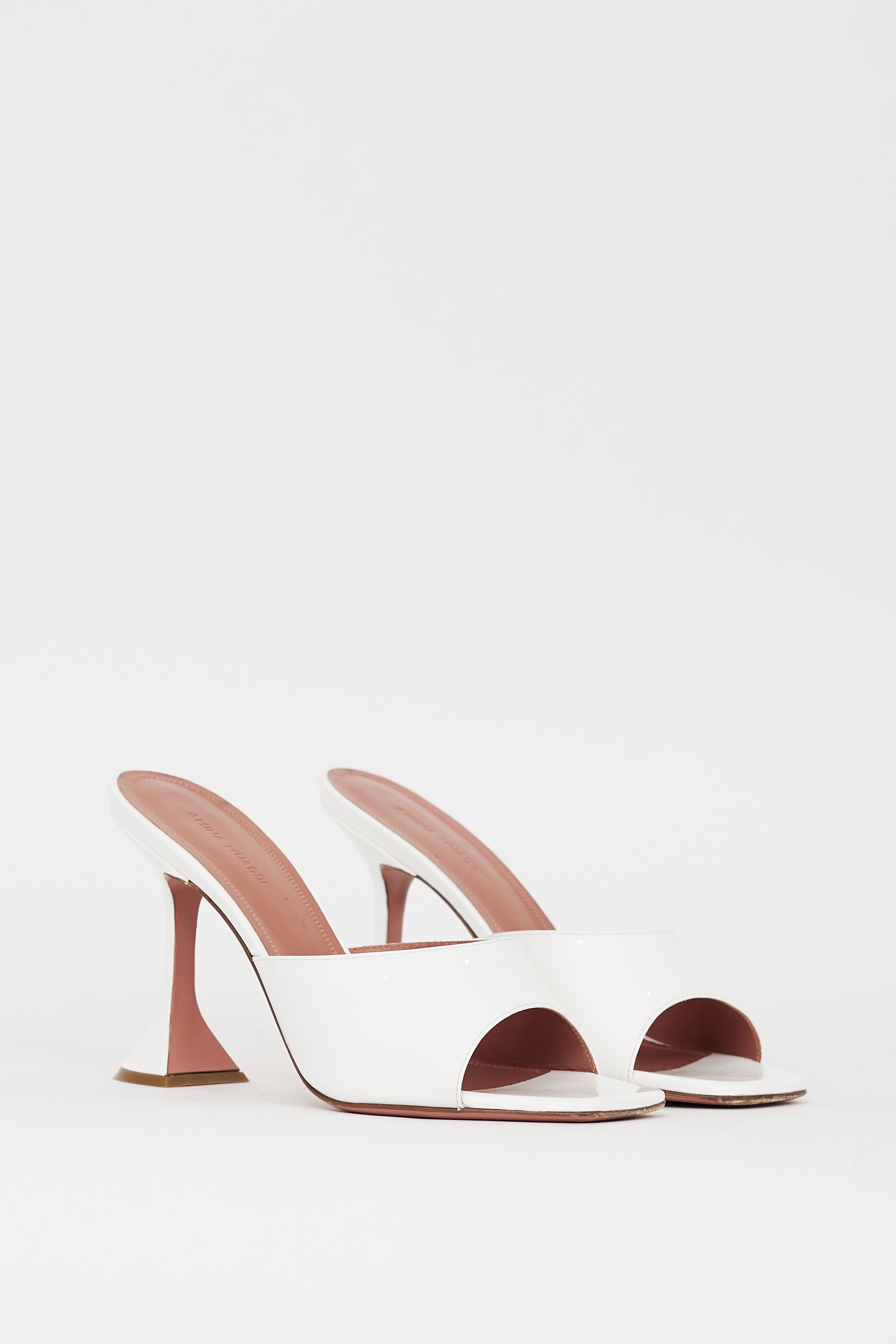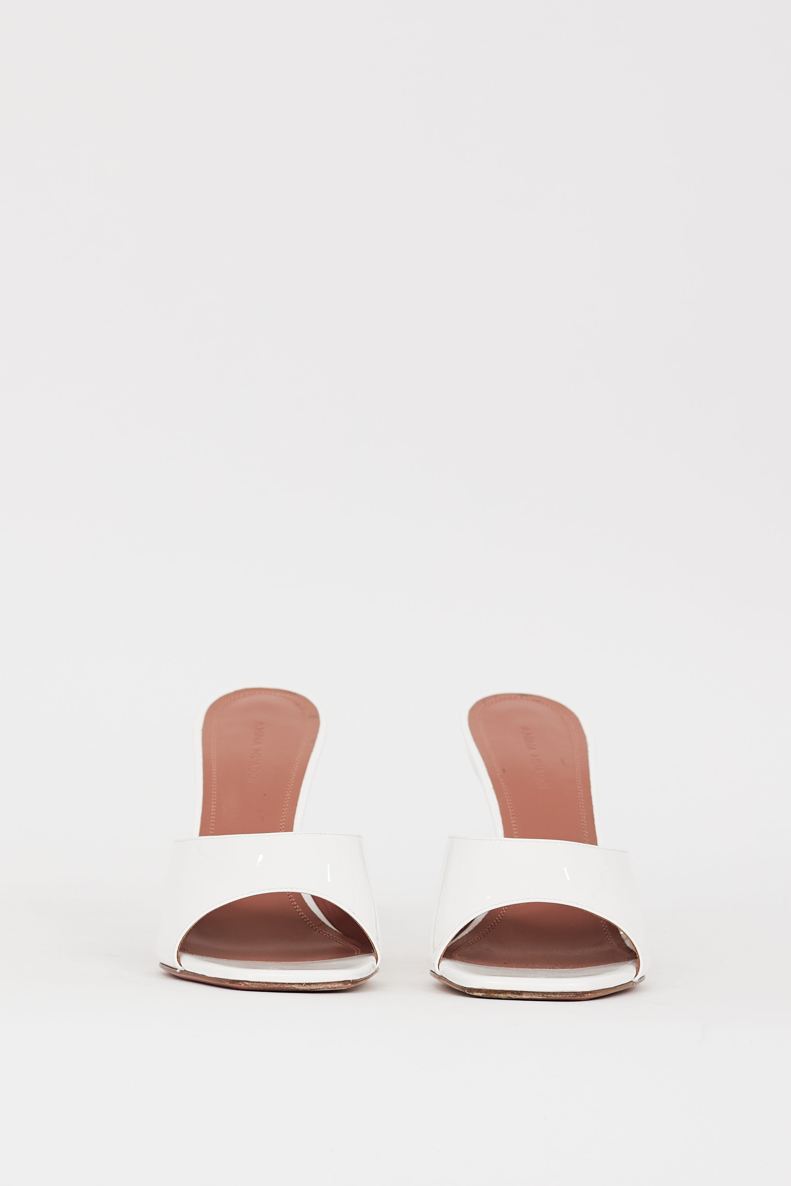 Pre-owned Amina Muaddi white Lupita heels featuring an open square toe, patent leather upper, single strap across vamp, and a covered fluted heel. Comes with original dust bags.