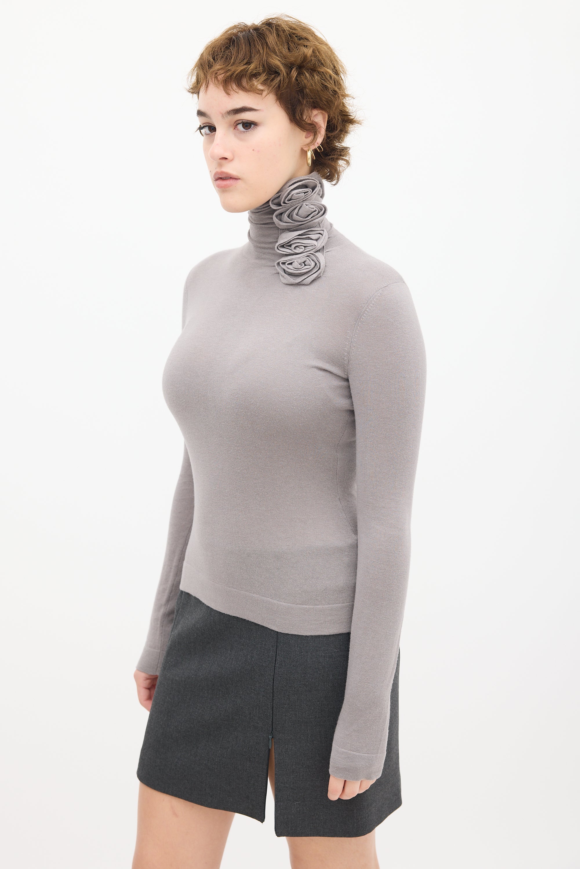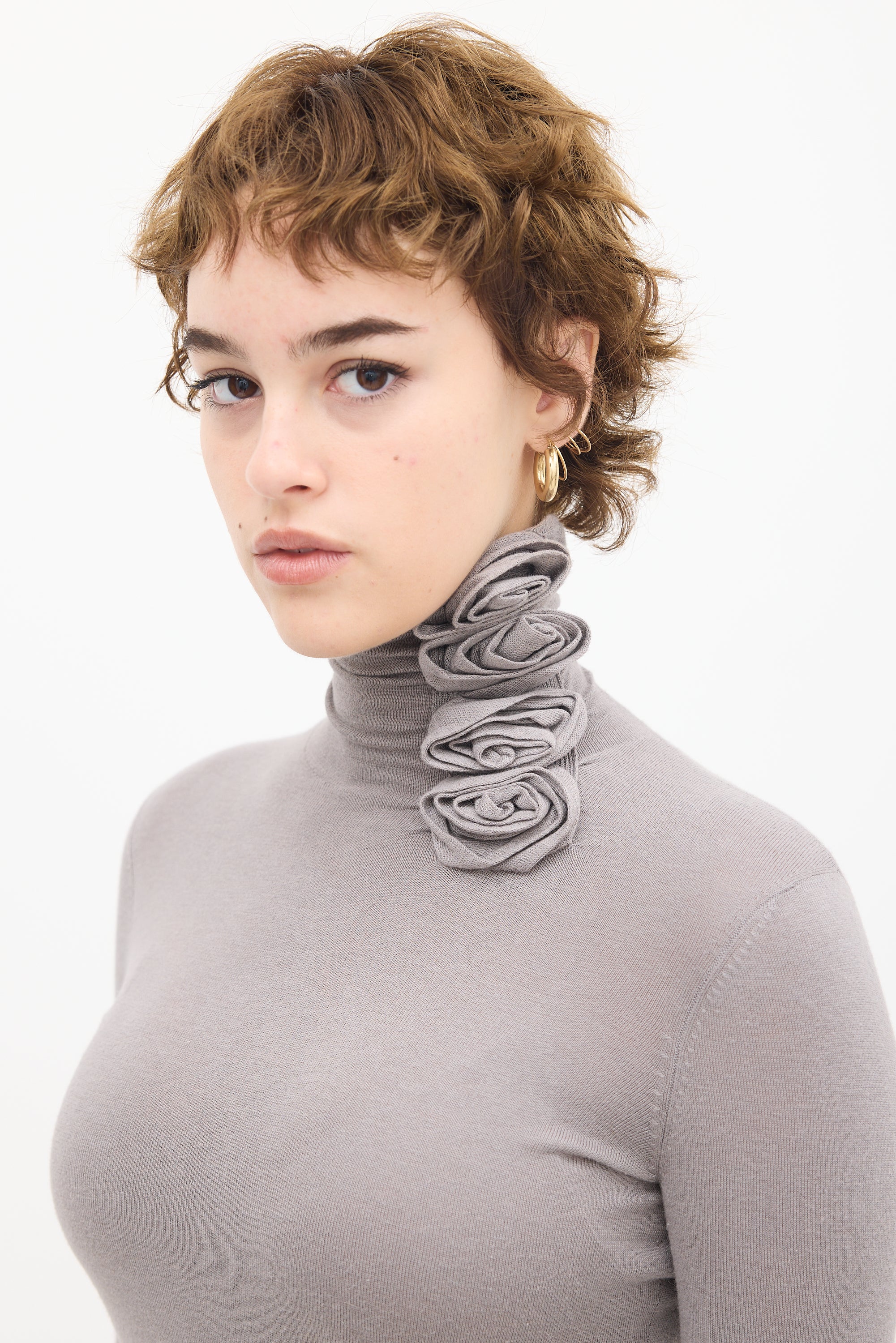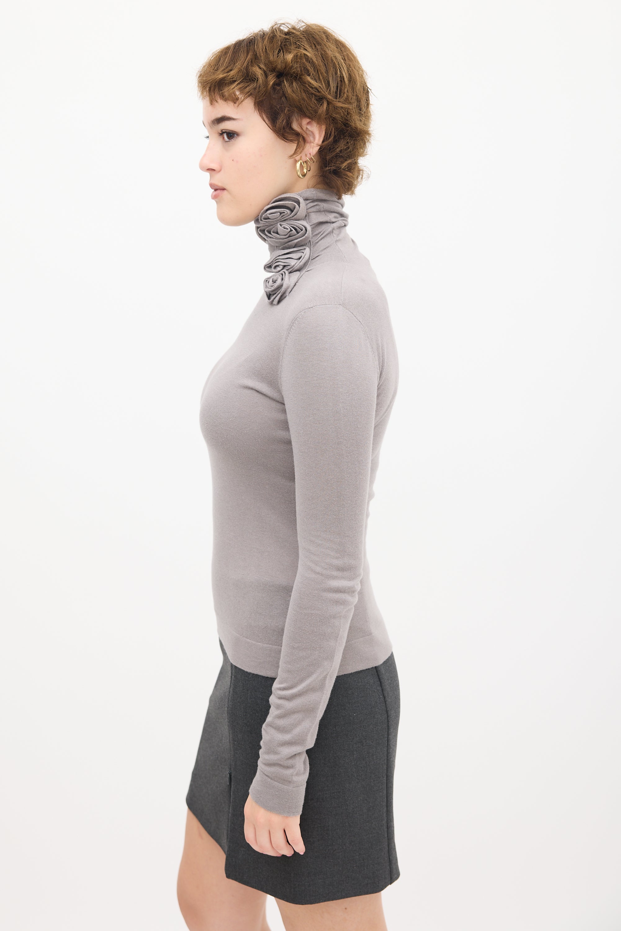 Pre-owned Emporio Armani grey knit sweater featuring a turtleneck with rosette applique, long sleeves, and ribbed hem. Neck clipped to fit model.