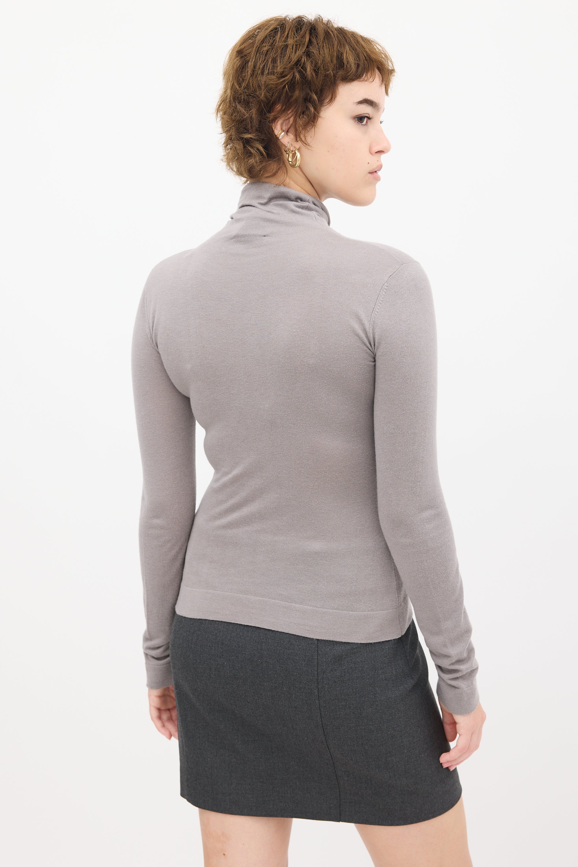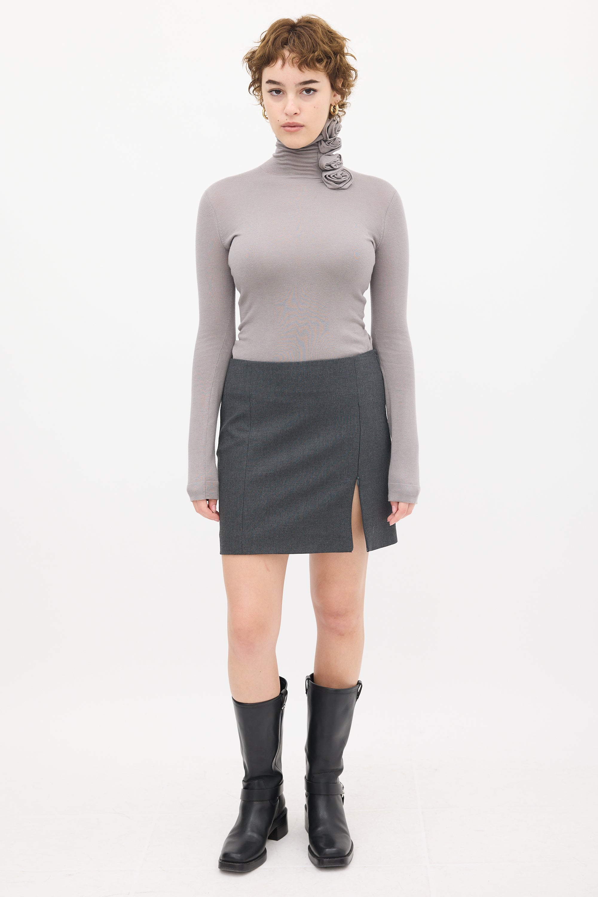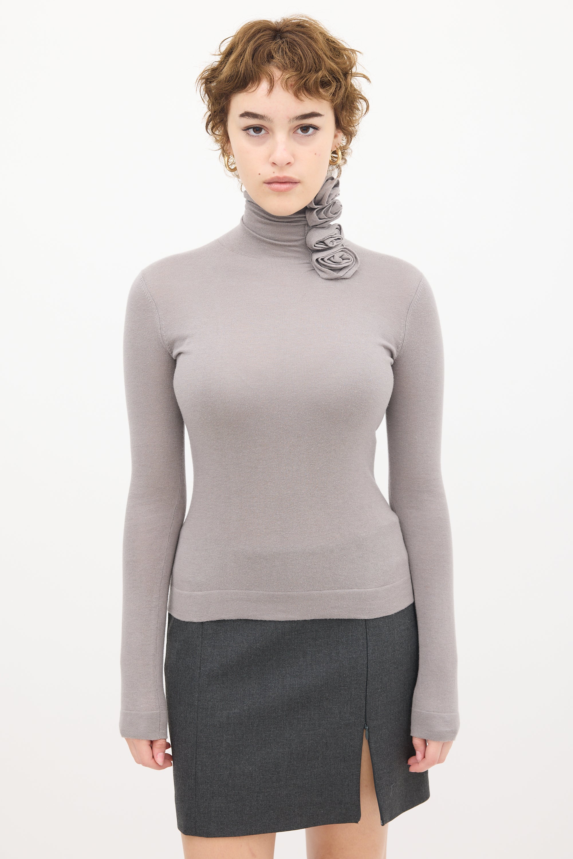 Pre-owned Emporio Armani grey knit sweater featuring a turtleneck with rosette applique, long sleeves, and ribbed hem. Neck clipped to fit model.