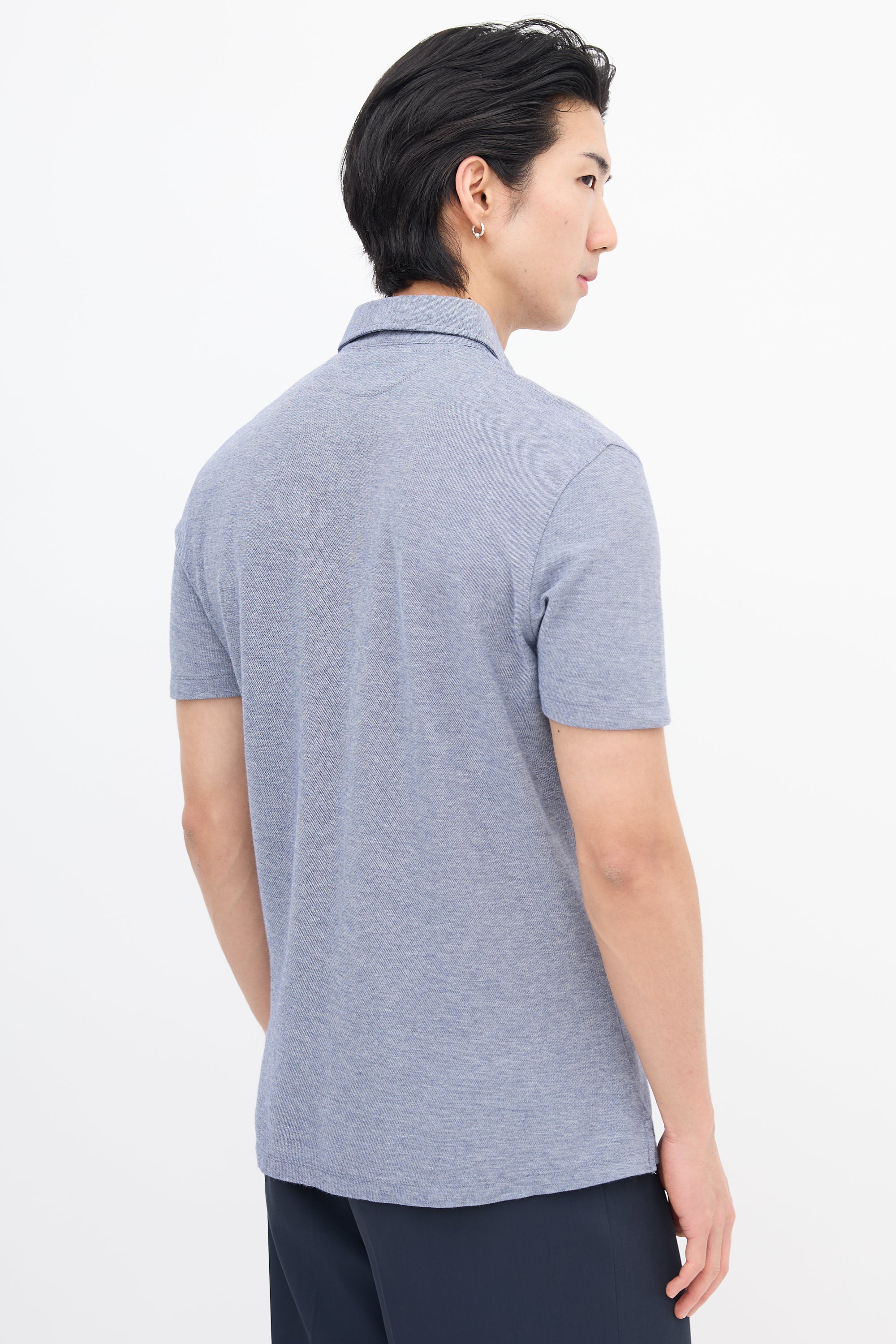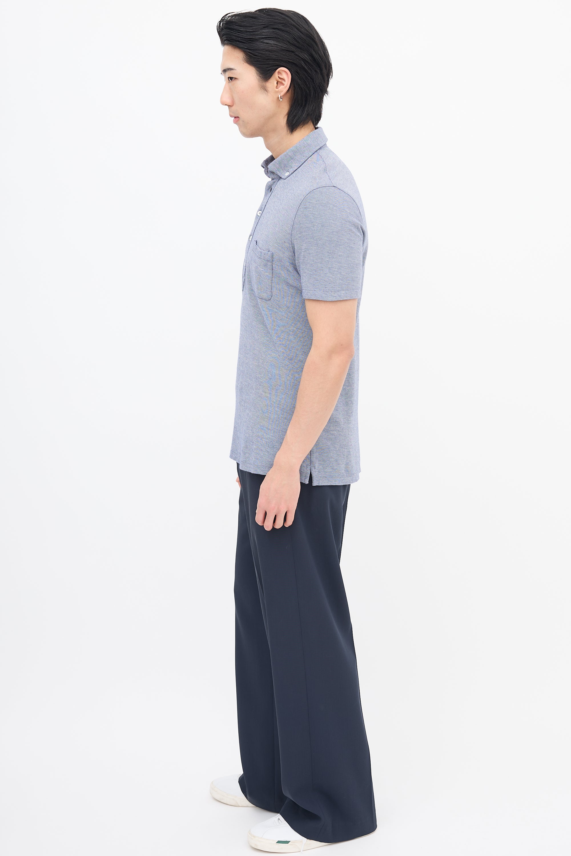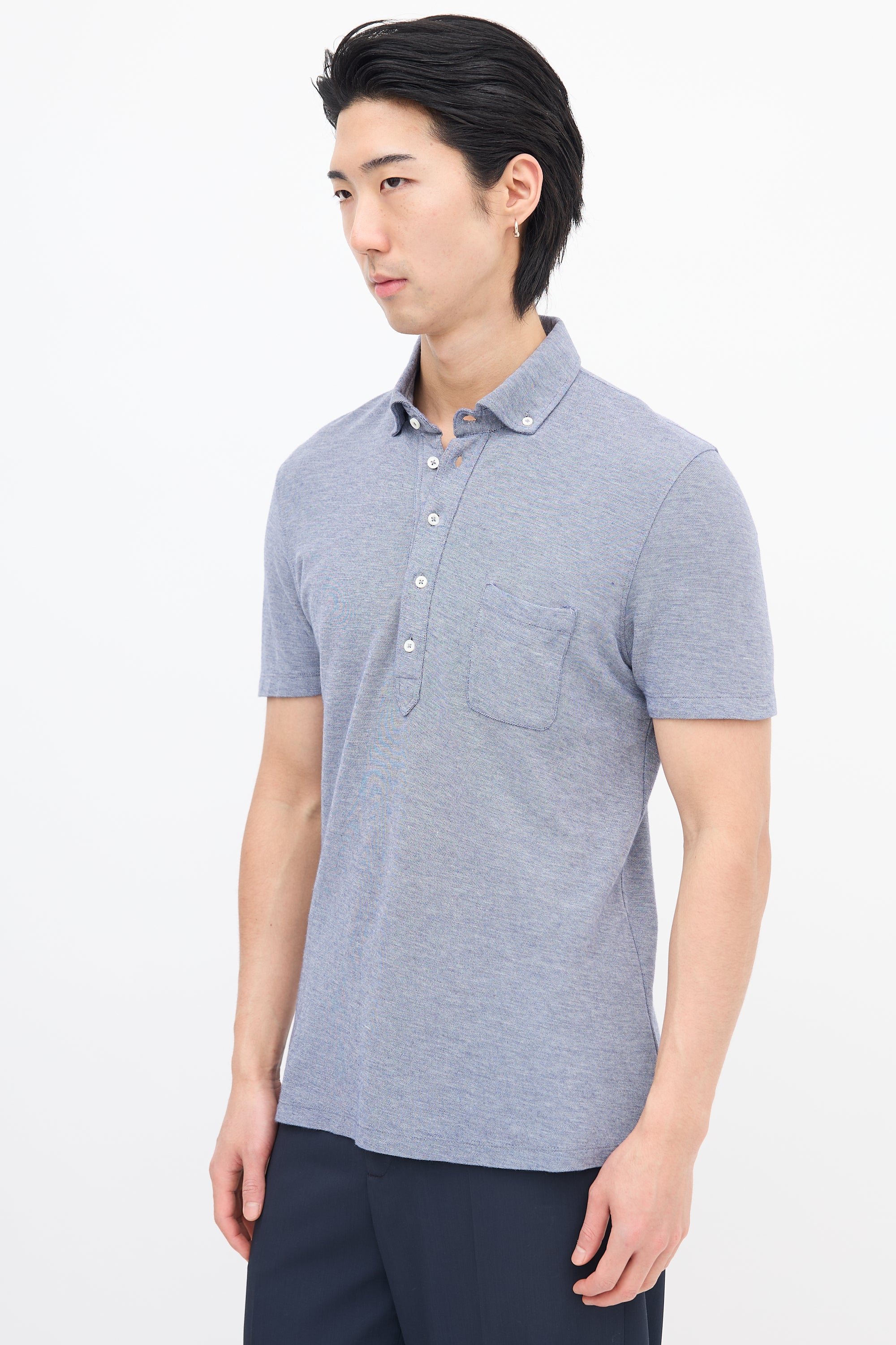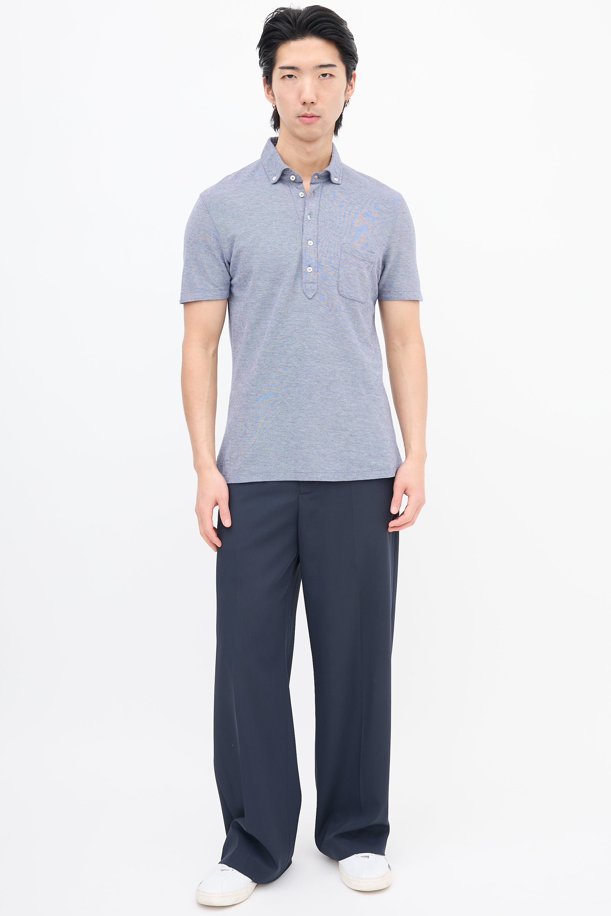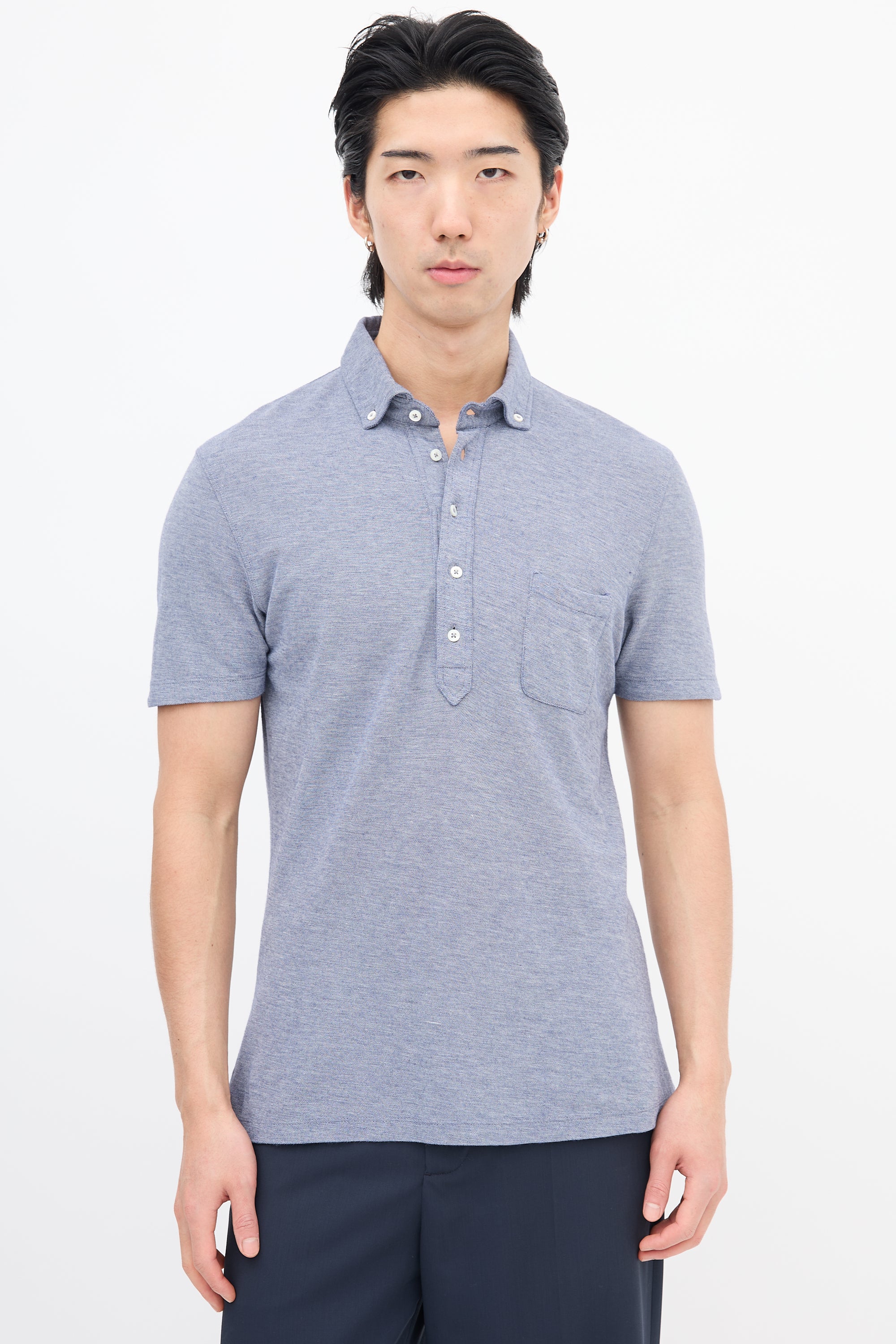 Pre-owned Brunello Cucinelli blue slim fit polo top featuring a buttoned spread collar, button up neckline, patch pocket at left chest, and side vents.