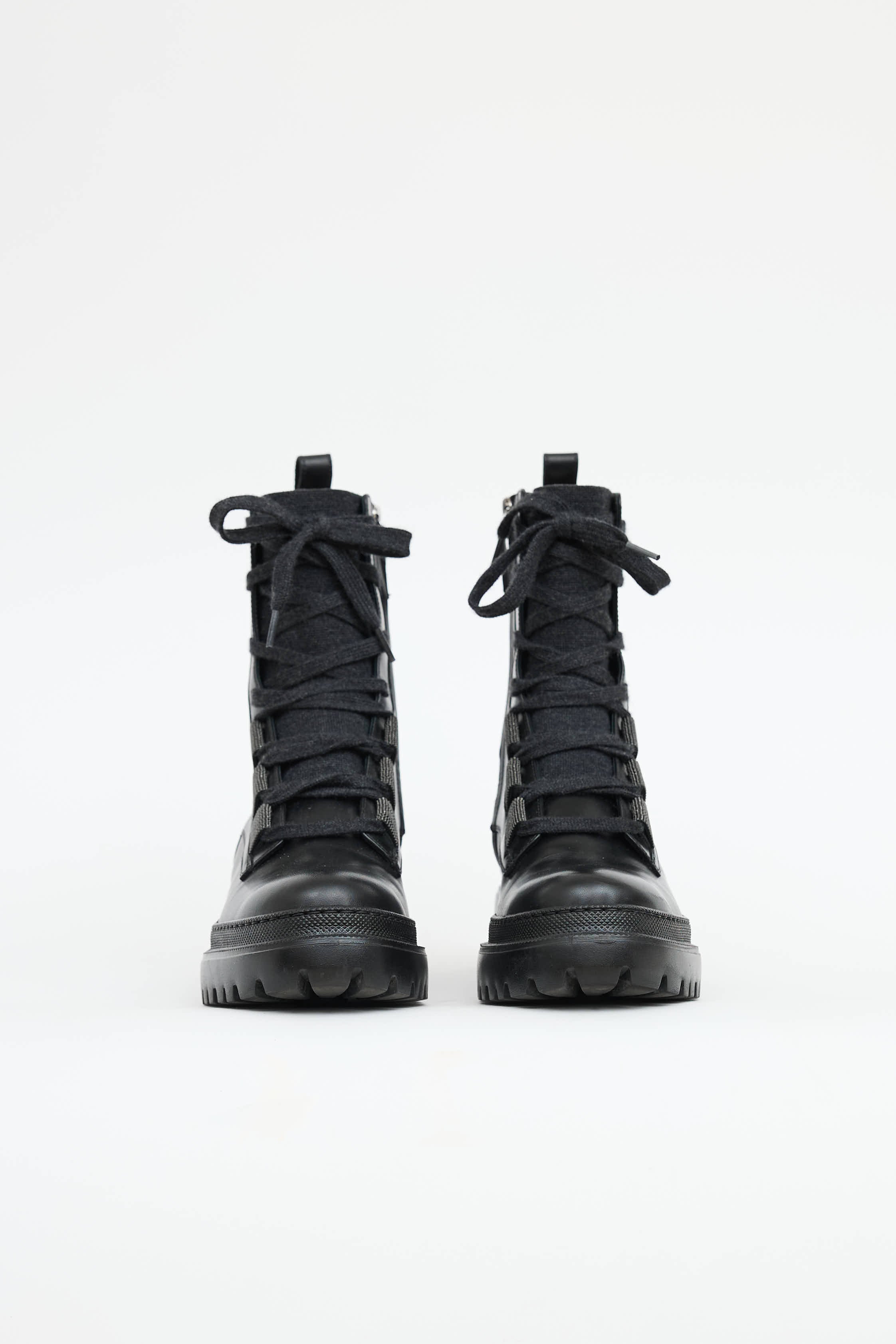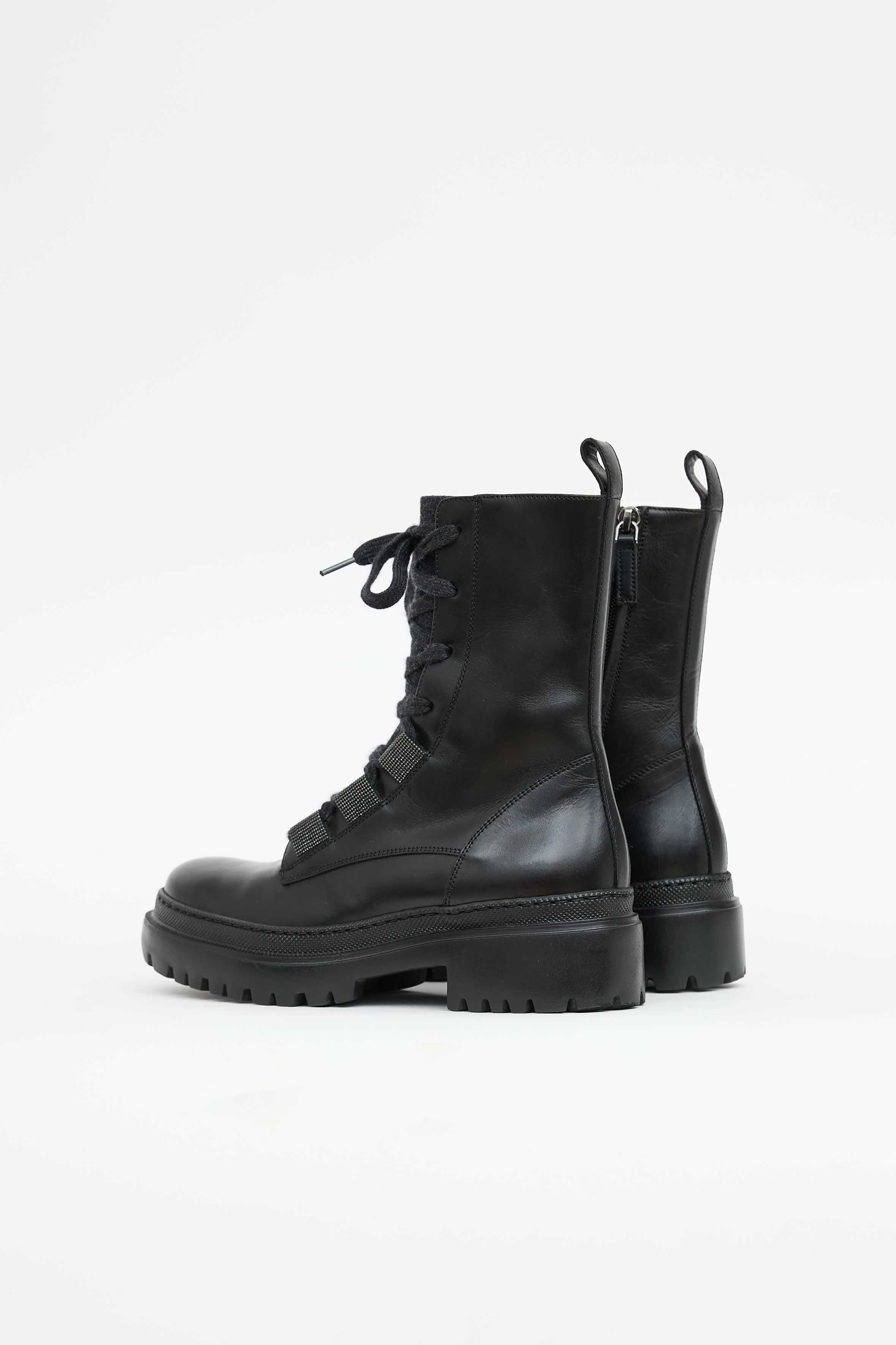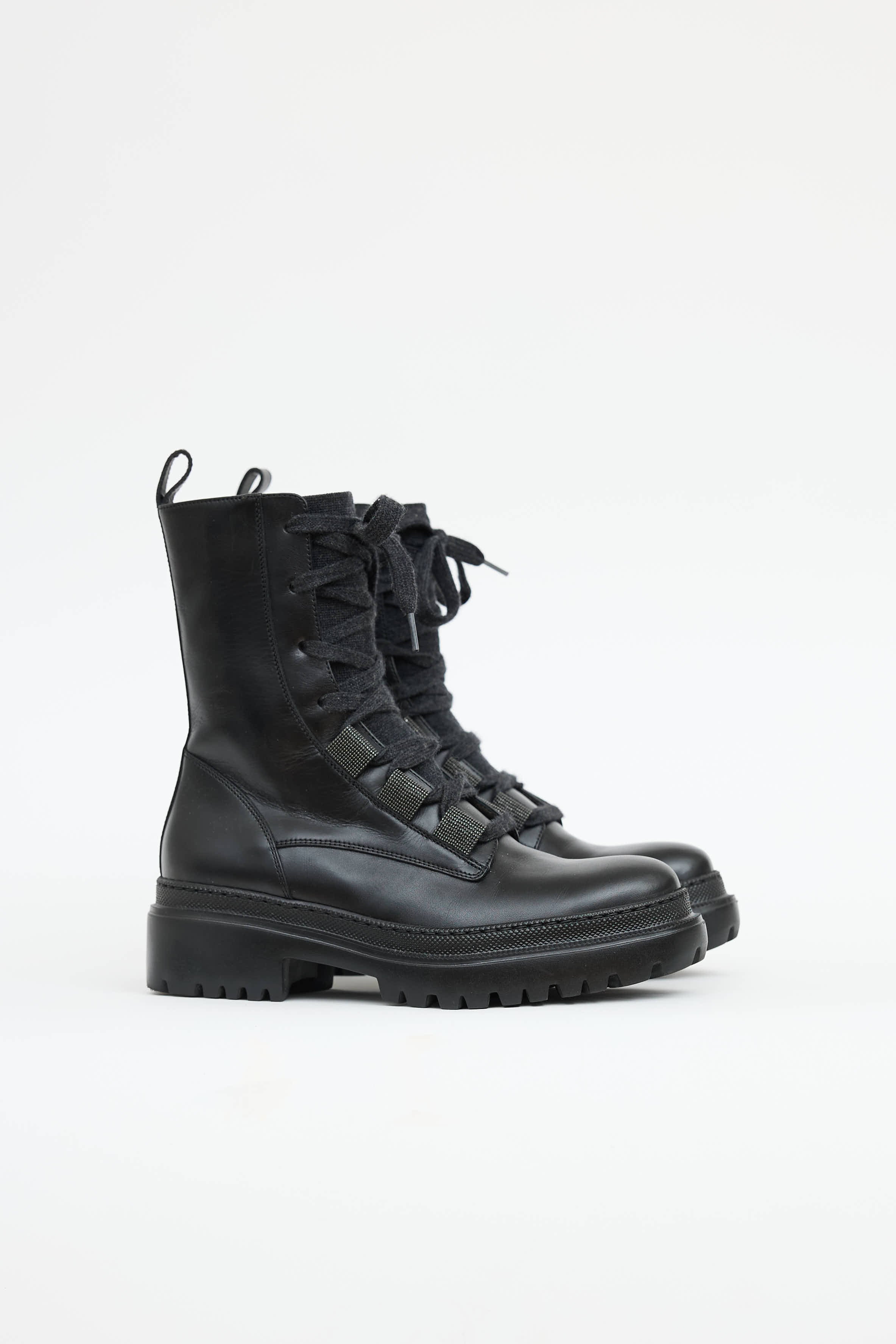 Pre-owned Brunello Cucinelli black leather combat boots featuring a rounded toe, side zip closure, leather pull tab at back, Monili lace loops and knit tongue and laces.