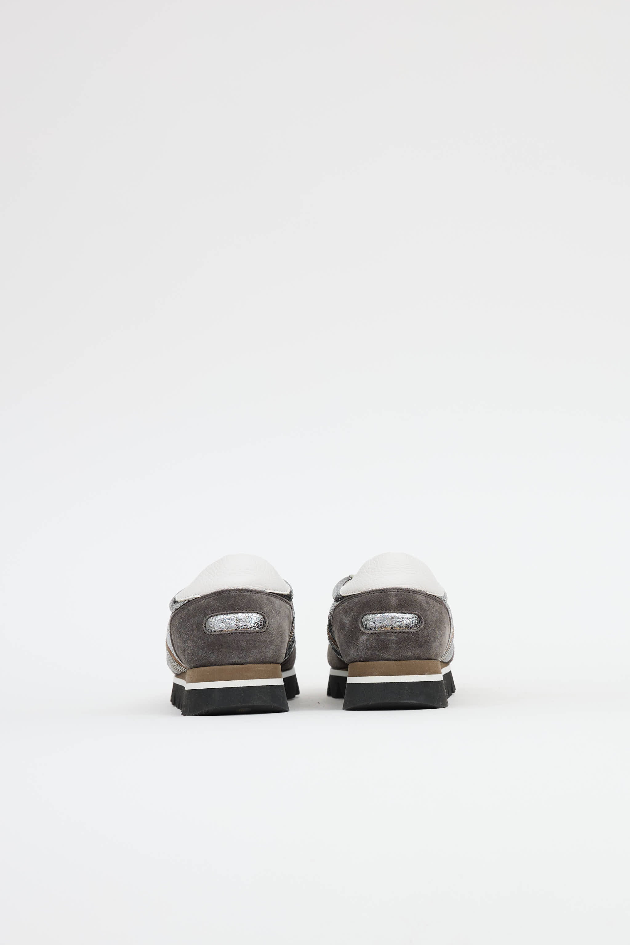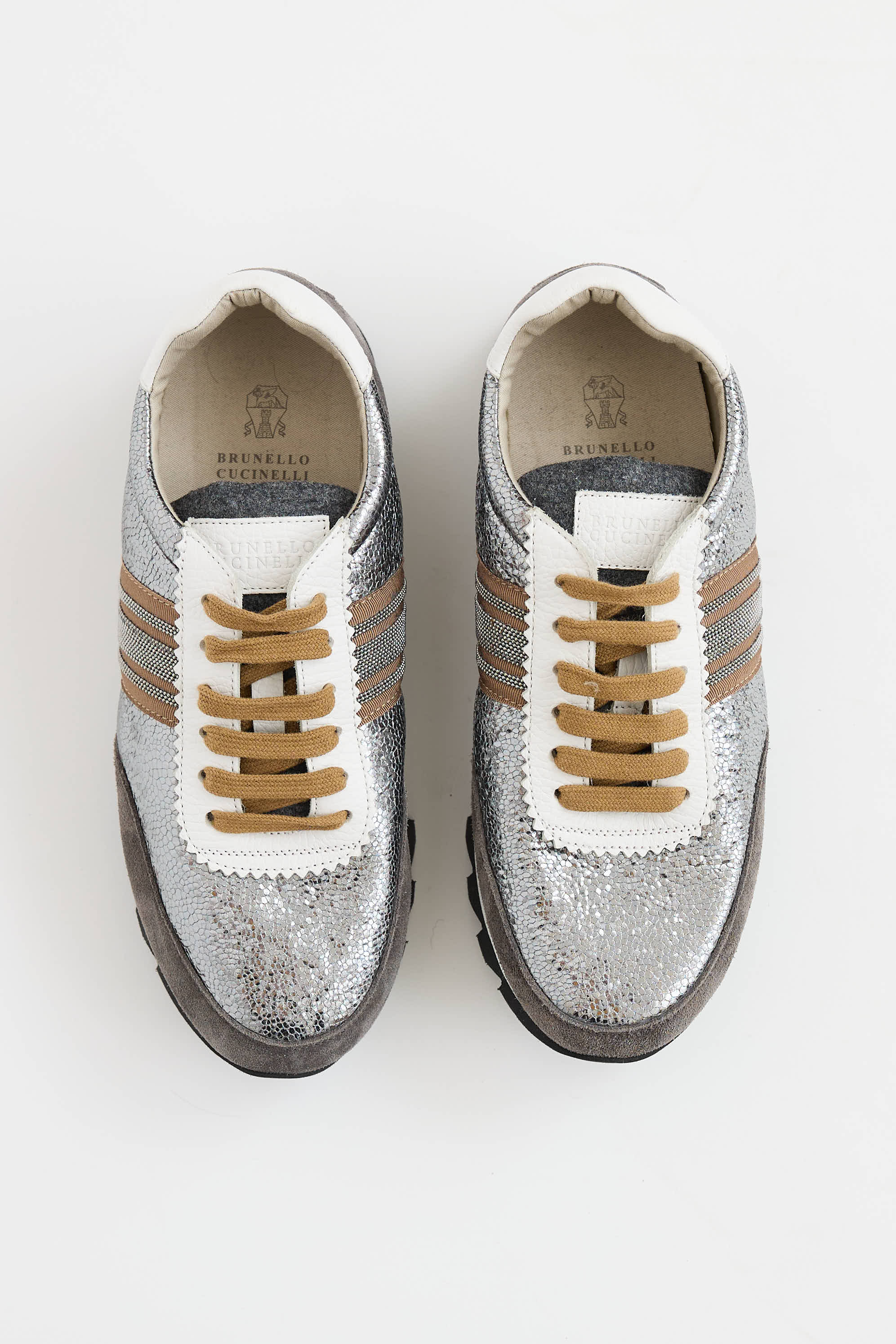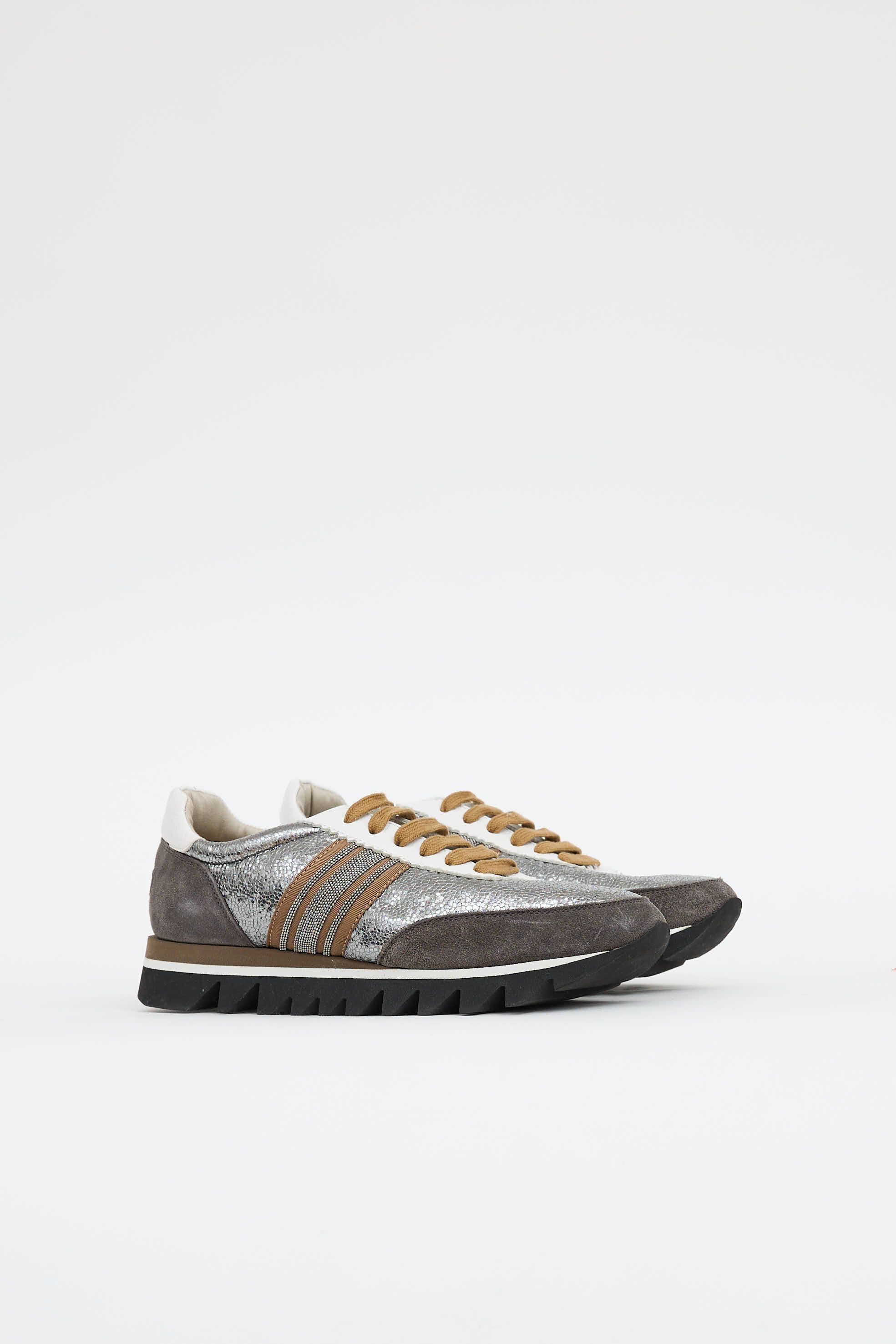 Pre-owned Brunello Cucinelli silver and multicolor sneaker featuring round toe, lace up vamp, suede trim, Monili beads at side, leather logo embossed label at tongue, and treaded sole.
