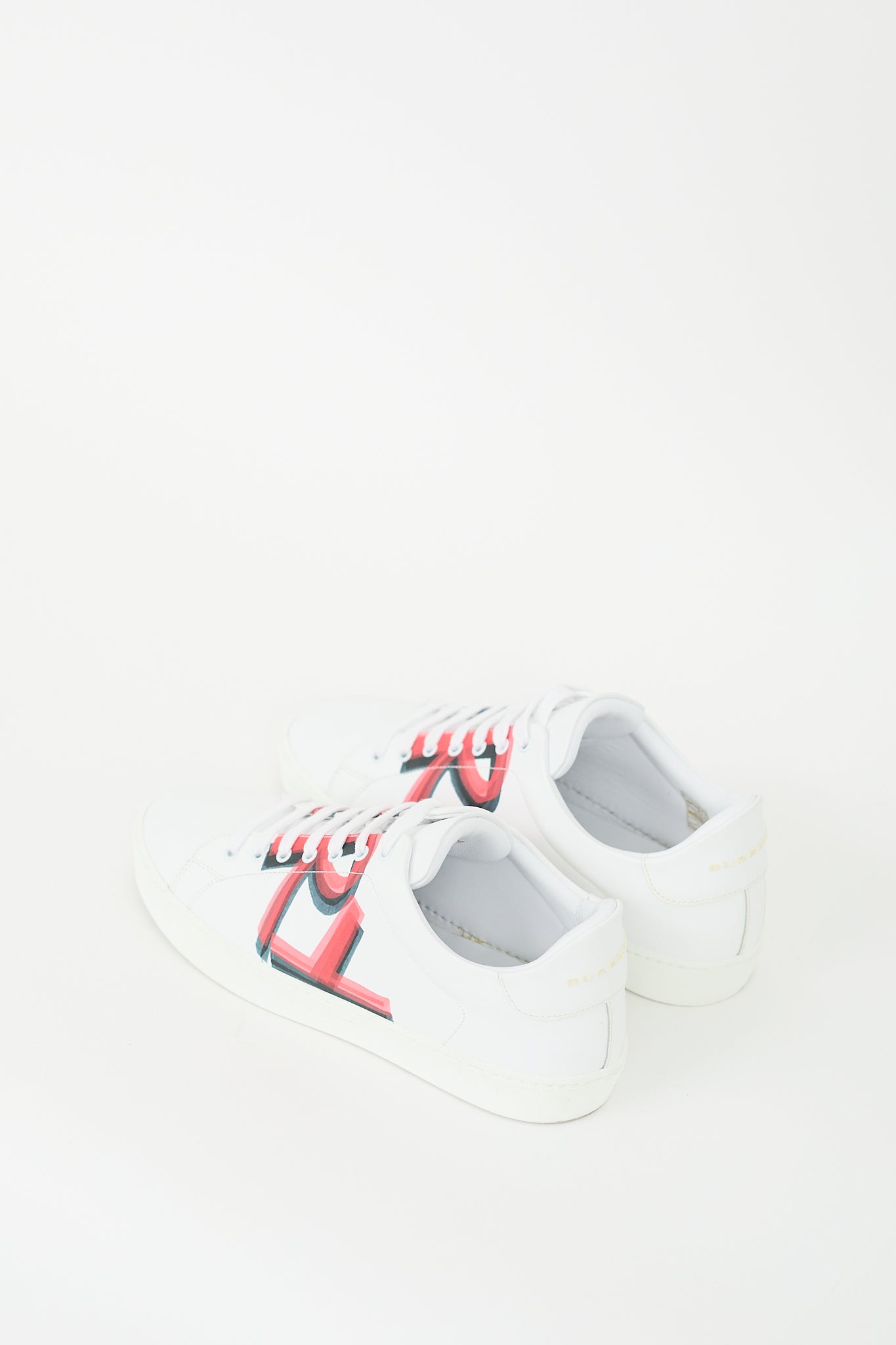 Pre-owned Burberry white leather Graffiti sneakers featuring rounded toe, lace up front, red and black logo at vamp, and rubber logo at counter.