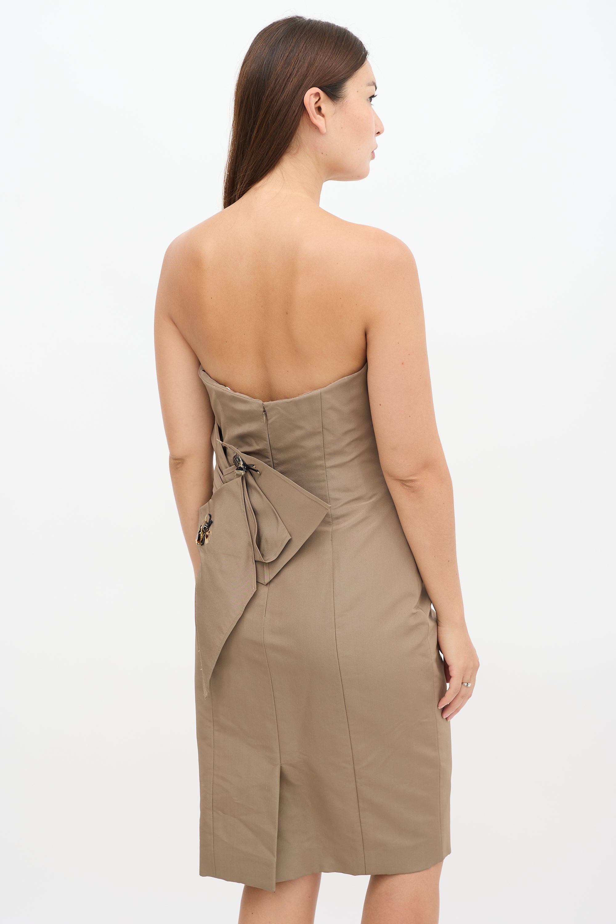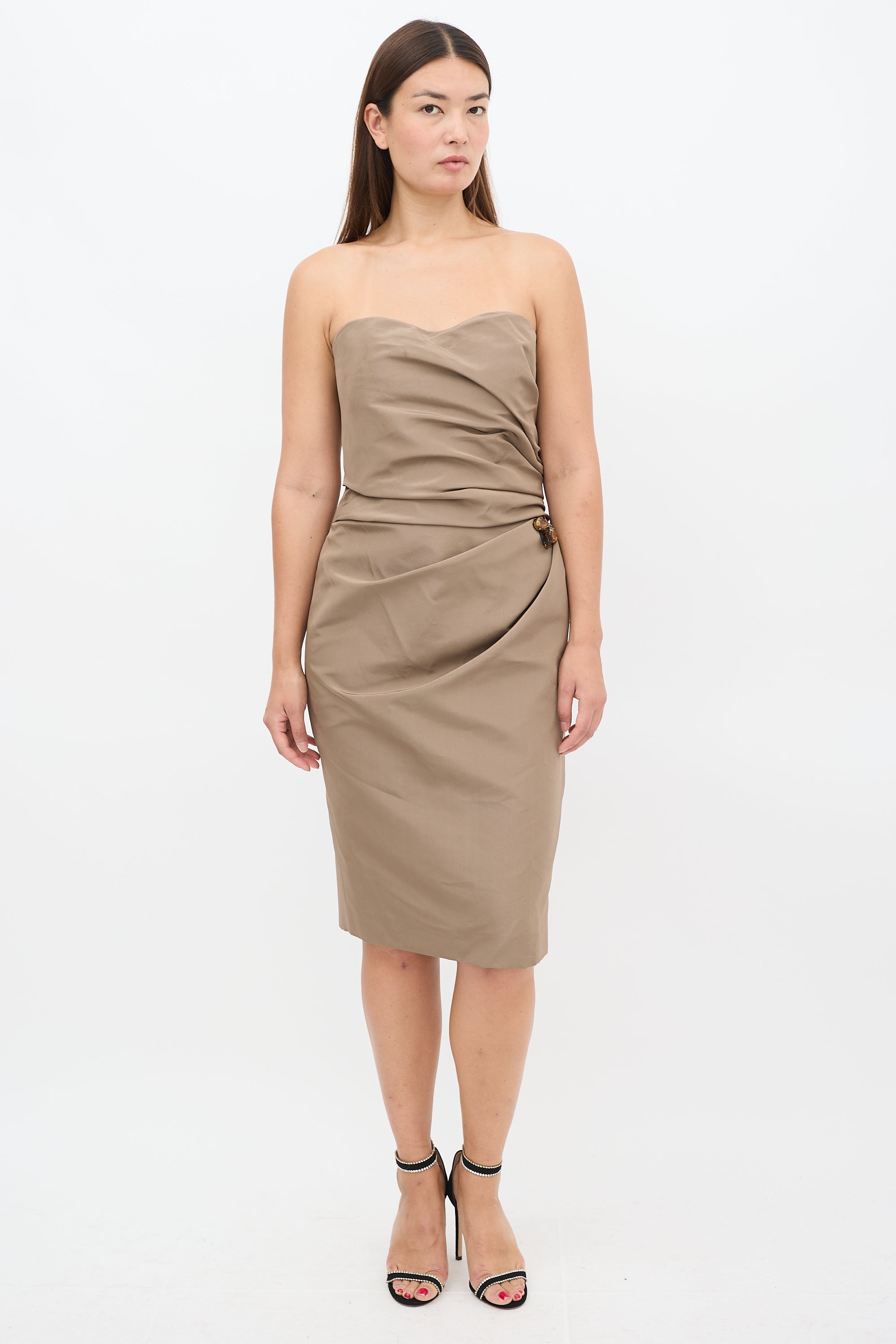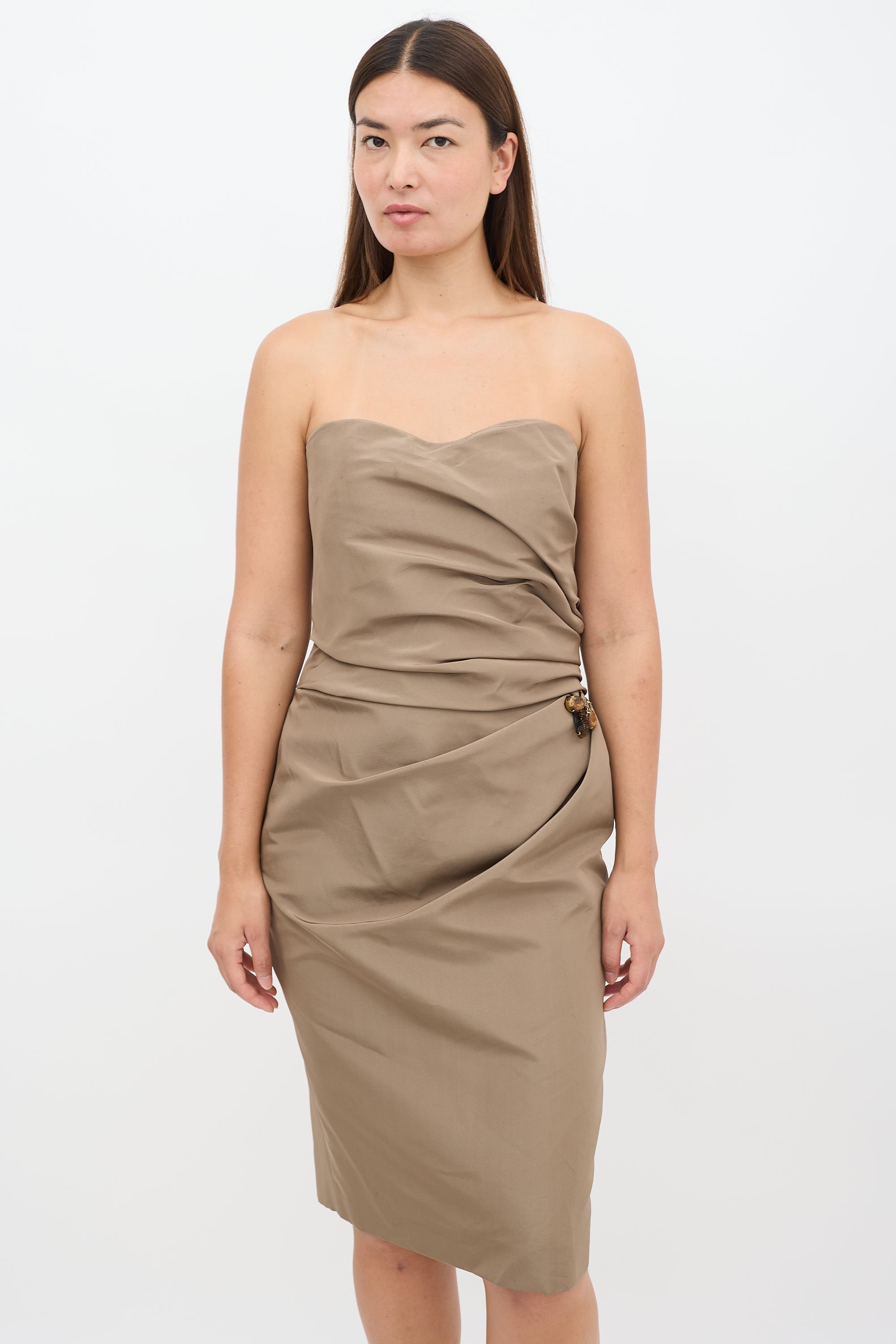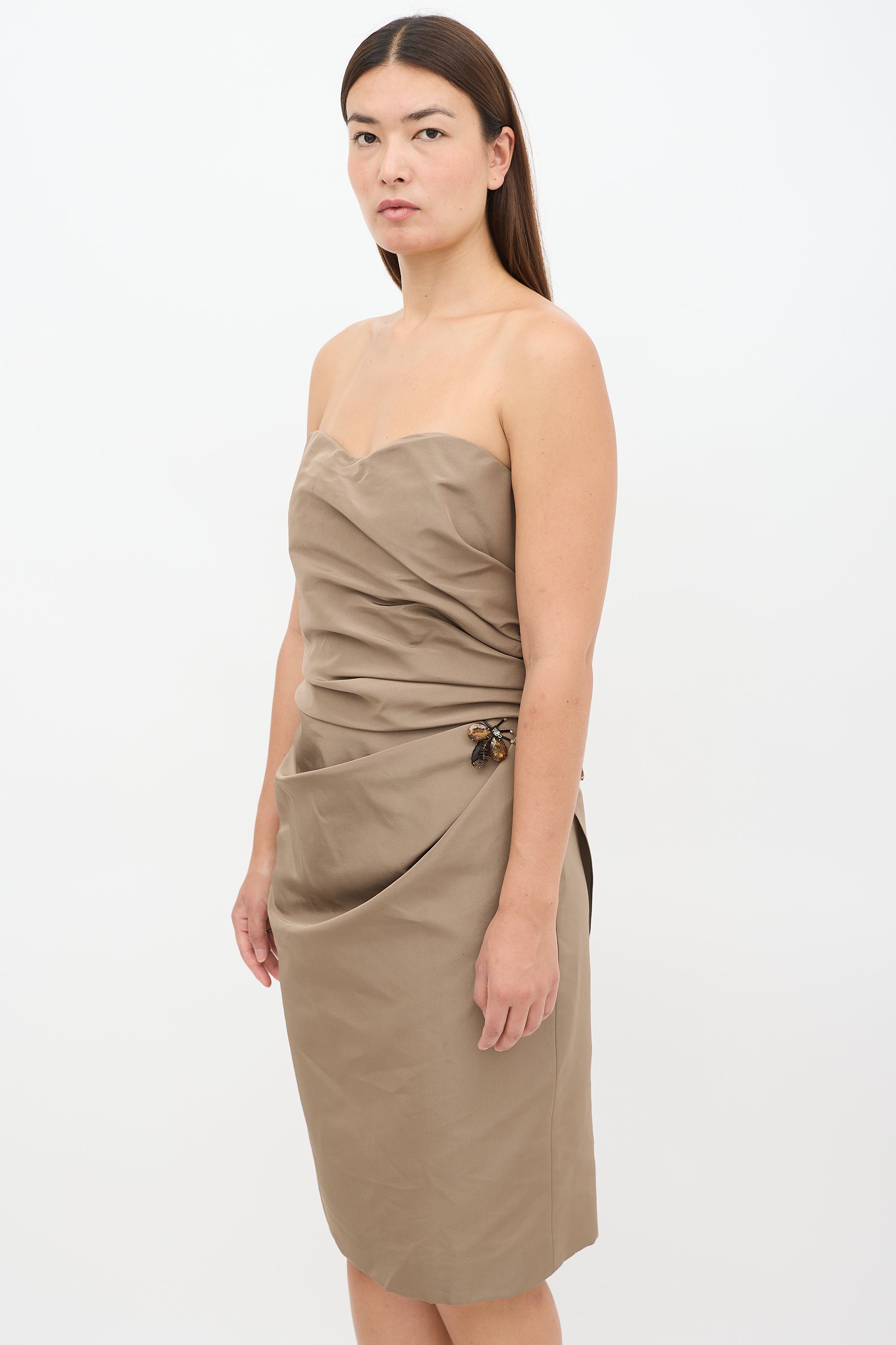 Pre-owned Carolina Herrera brown silk strapless midi dress featuring a sweetheart neckline, interior boned corset, draped design, pleated sash detail at back, three insect motif embellishments at left side, back vent, and concealed back zip. Lined.