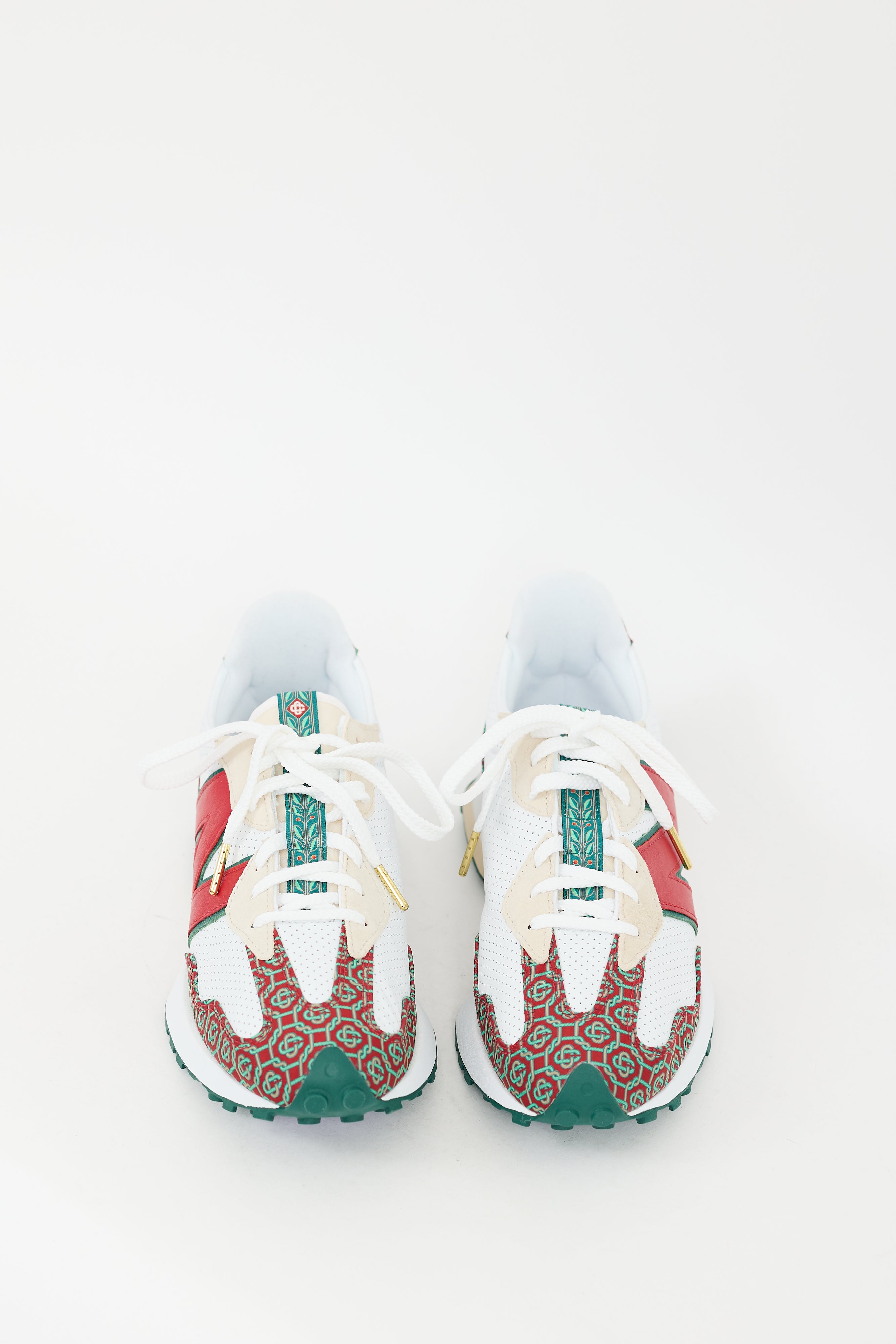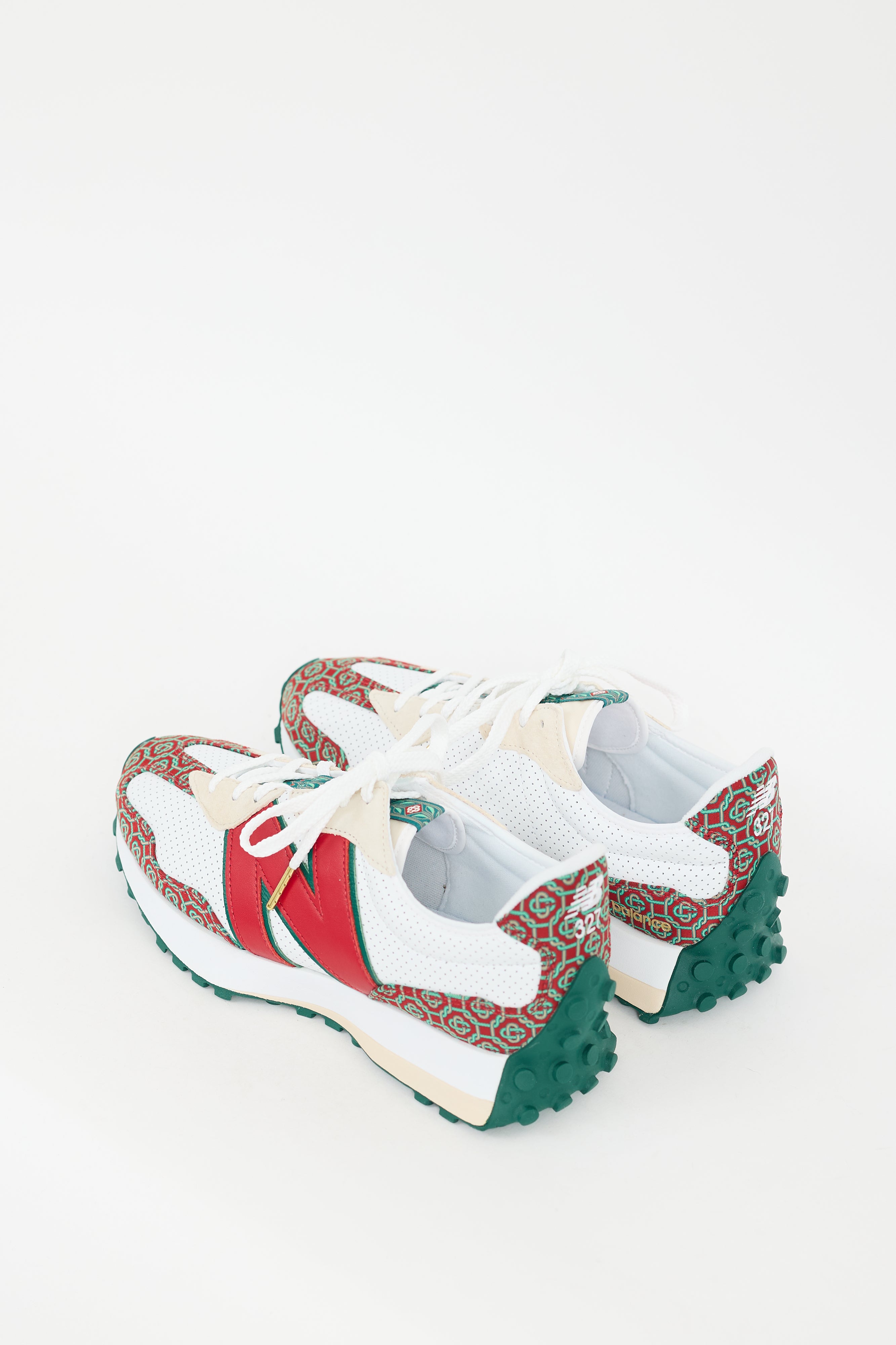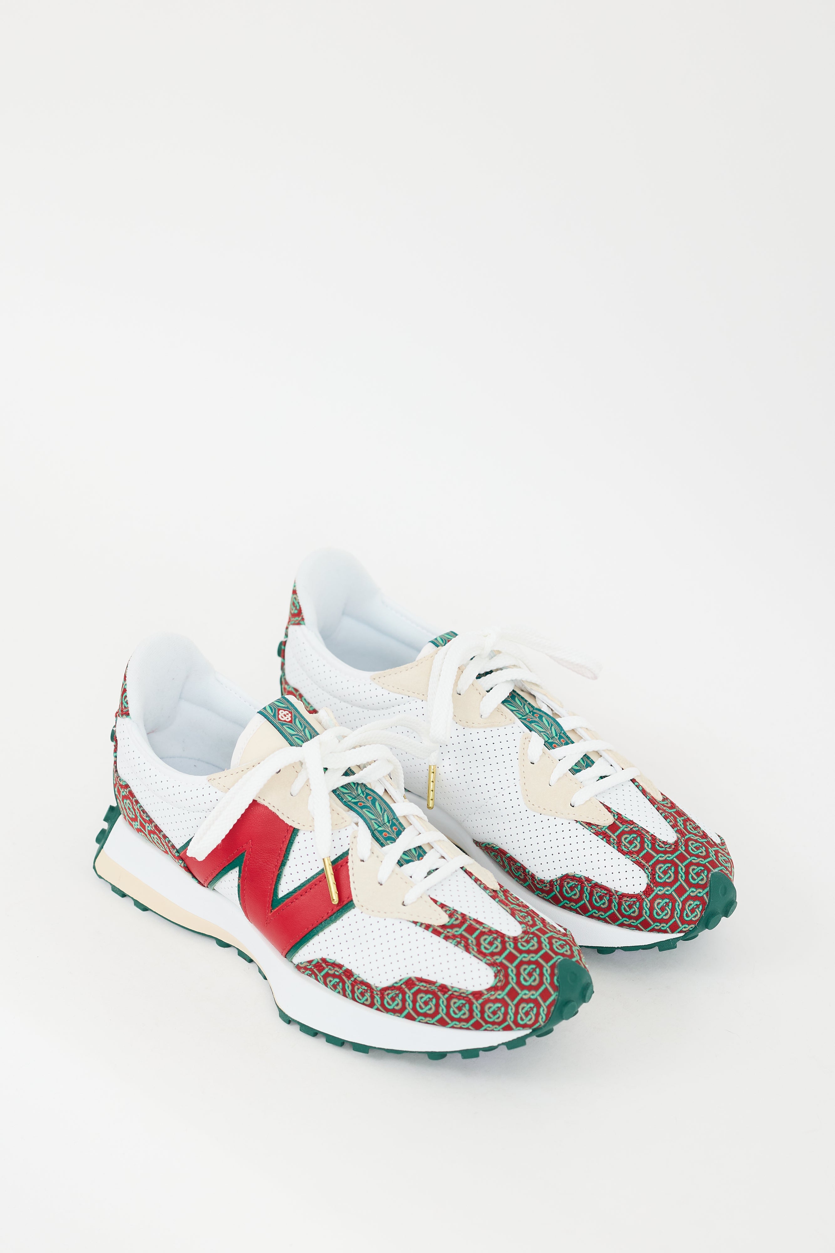 Pre-owned Casablanca X New Balance 327 sneakers featuring a rounded toe, white perforated leather body, red and green patterned accent panelling throughout, lace up front, leather panelled "N" at outer sides of shoe, gold tone printed logo at inner counter, embroidered logo and "327" at counter, and treaded rubber sole. Comes with original box.