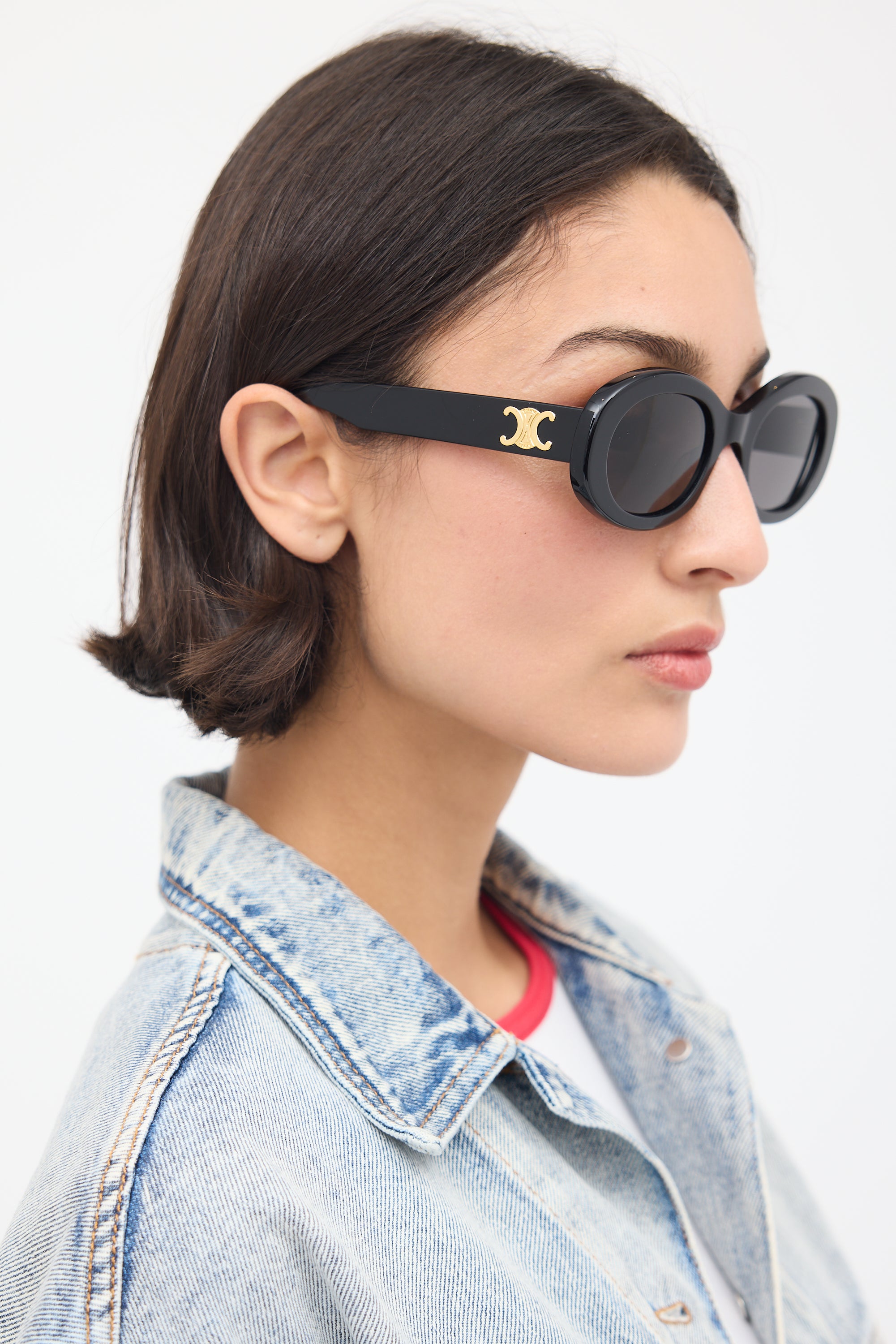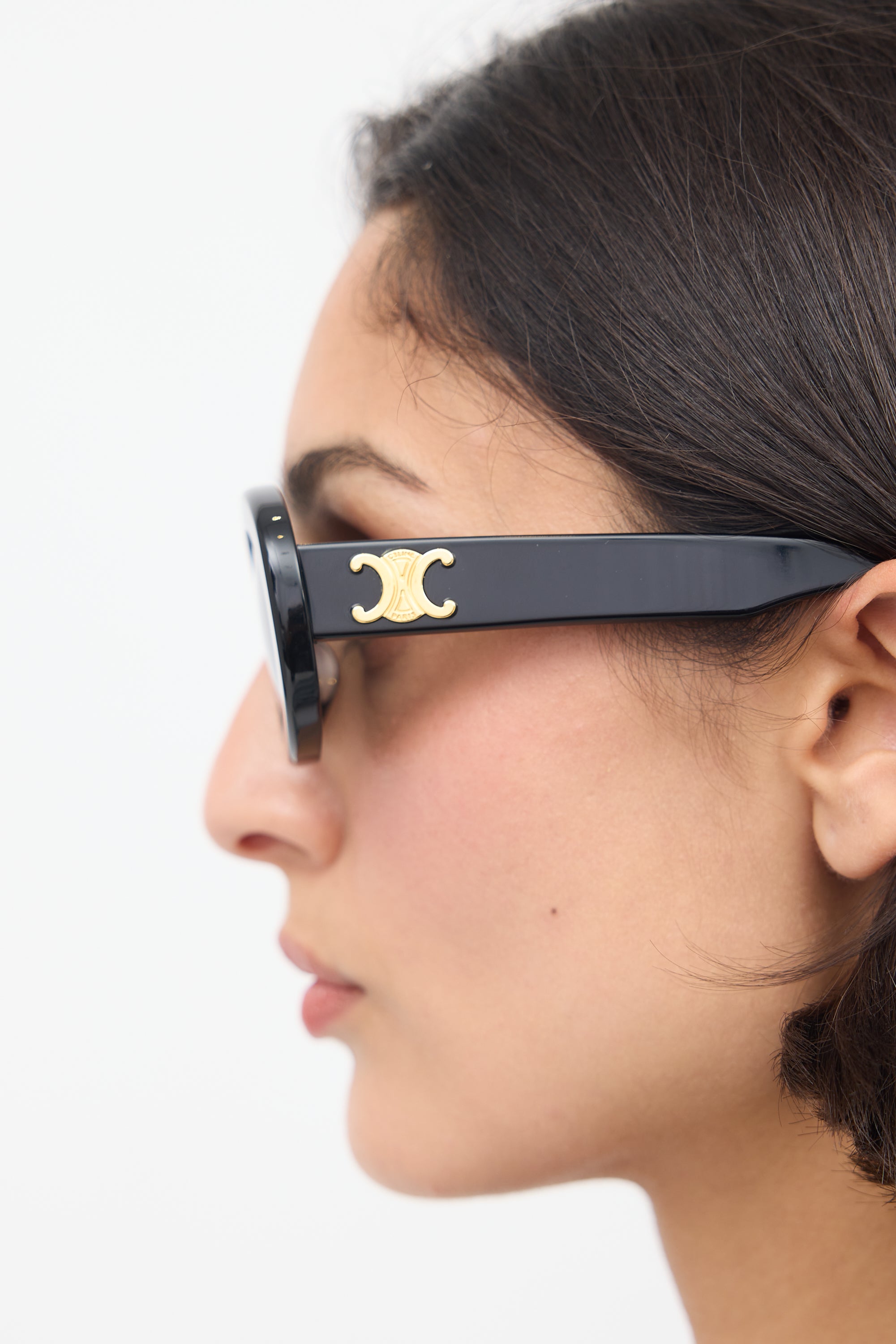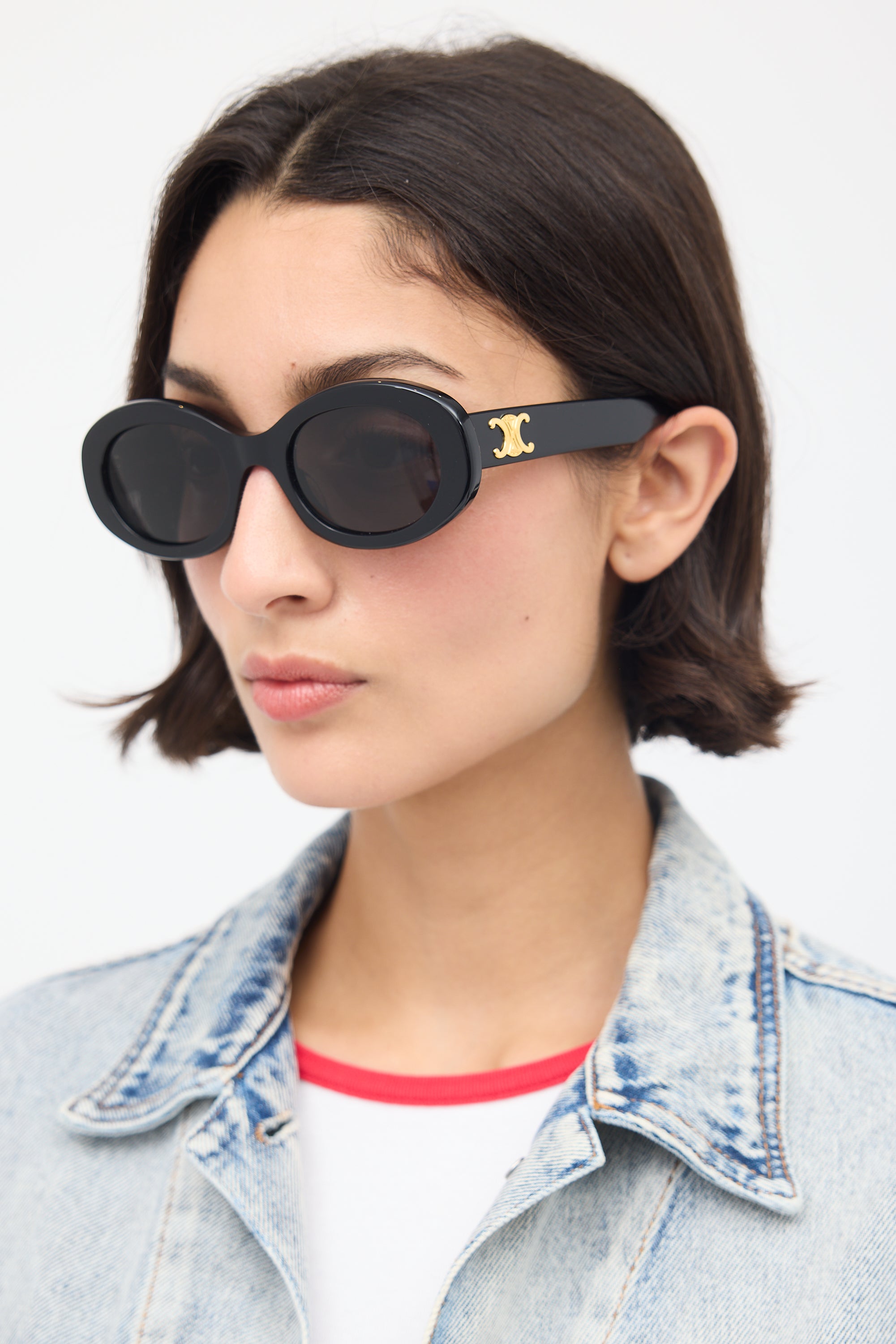 Pre-owned Celine black CL40194U sunglasses featuring rounded frame, black lens, gold tone Triomphe logo at temple, and nose saddle bridge. Comes with original dust bag.