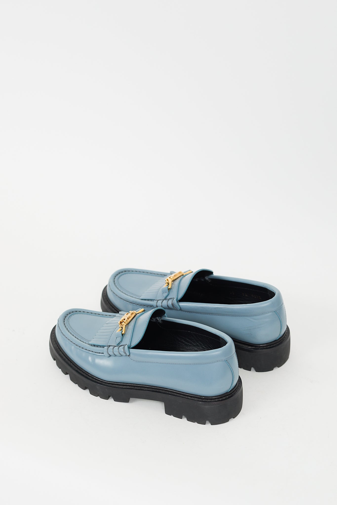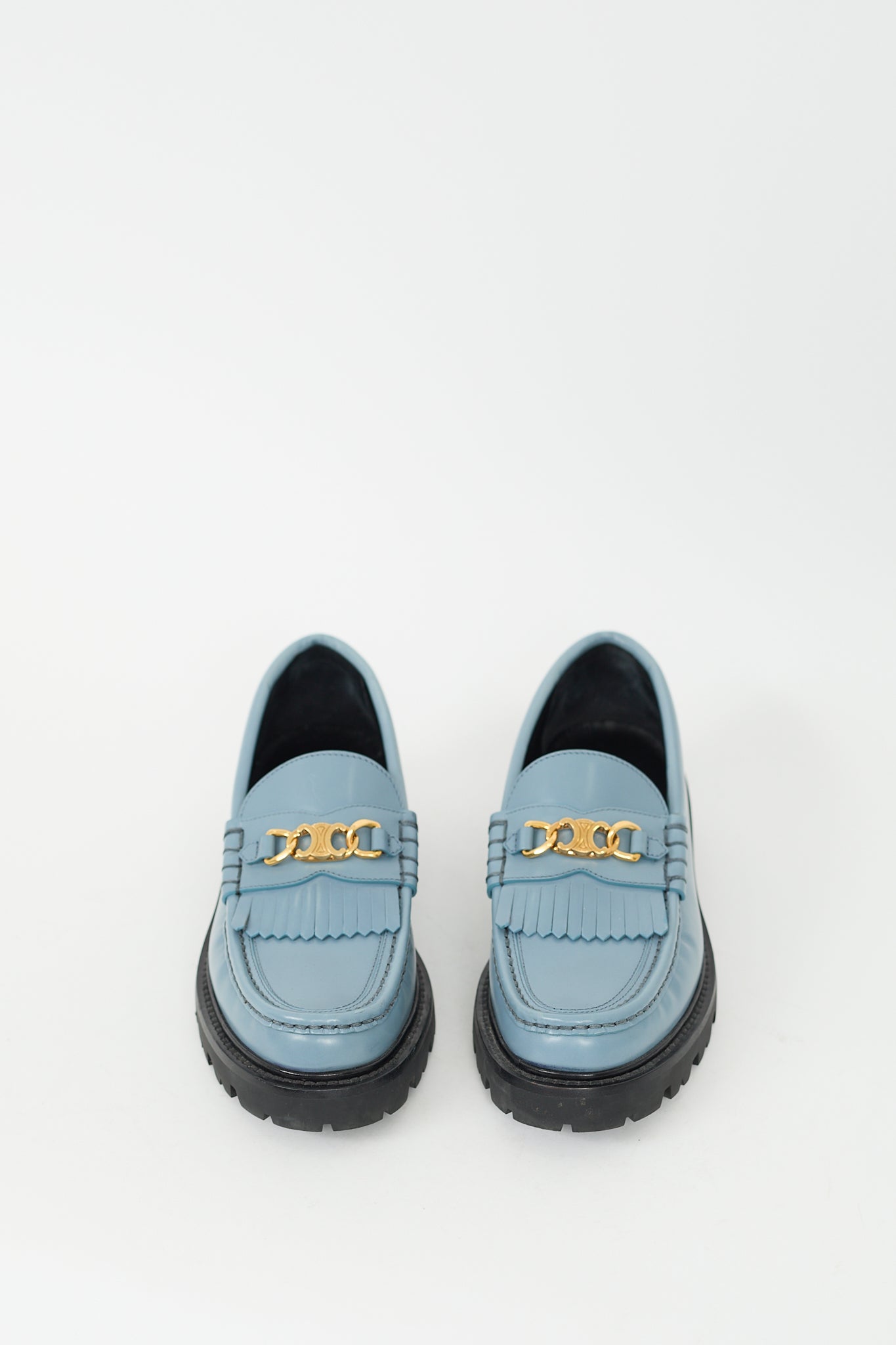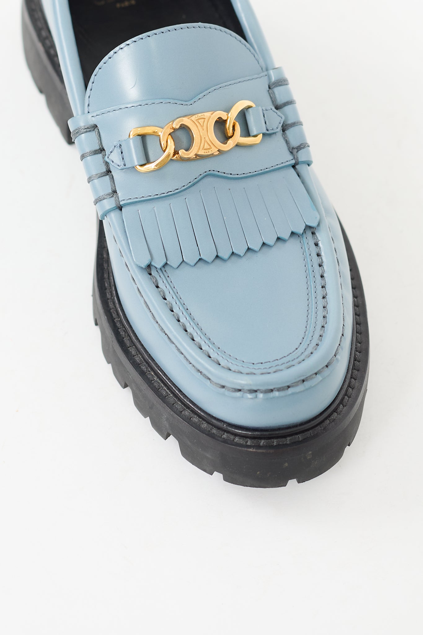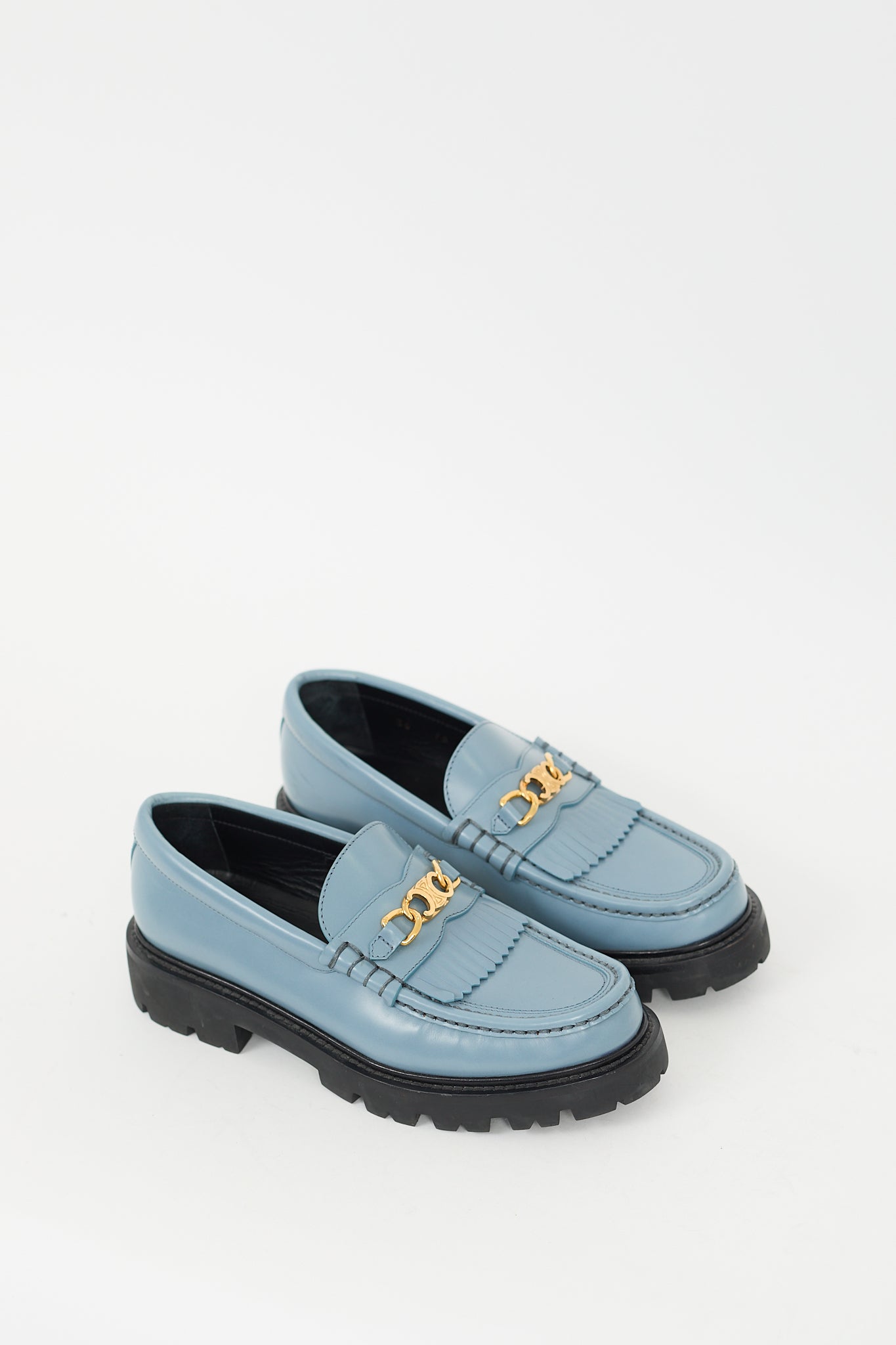 Pre-owned Celine blue Margaret loafers featuring rounded toe, kiltie fringe at vamp, gold tone Triomphe logo hardware, slip on entry, and lug sole.