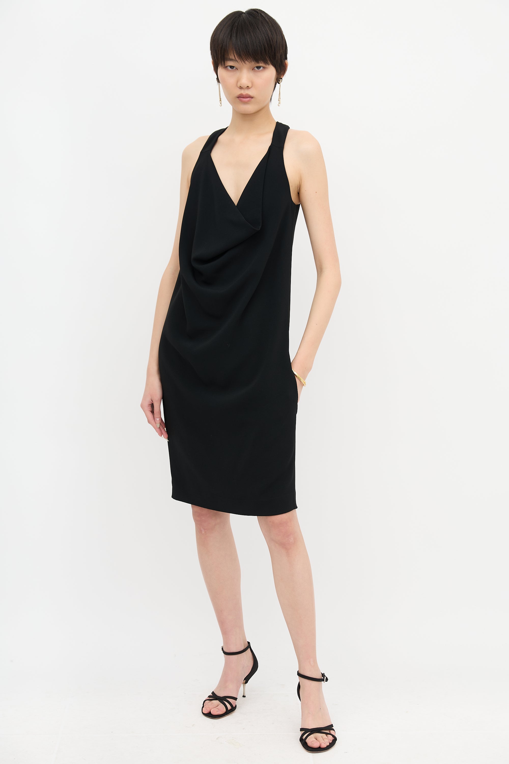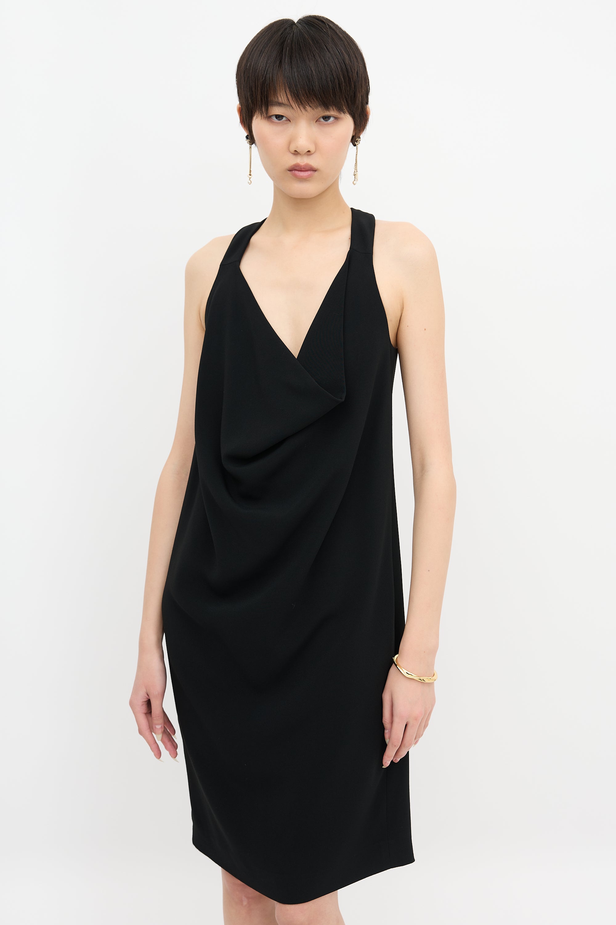 Pre-owned Celine black mini dress featuring cowl neck, halter with back snap button fastening, and in seam pockets. Lined.