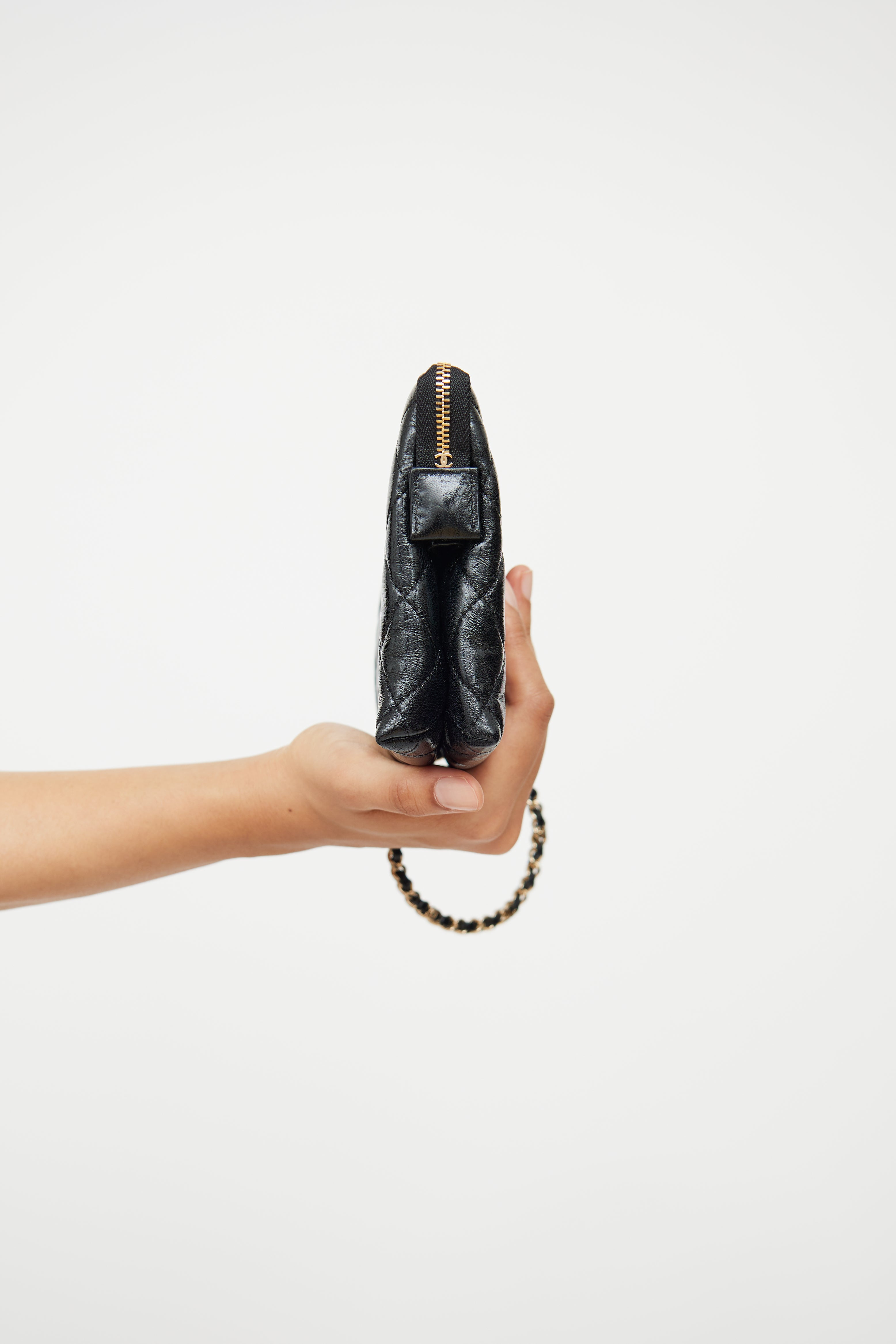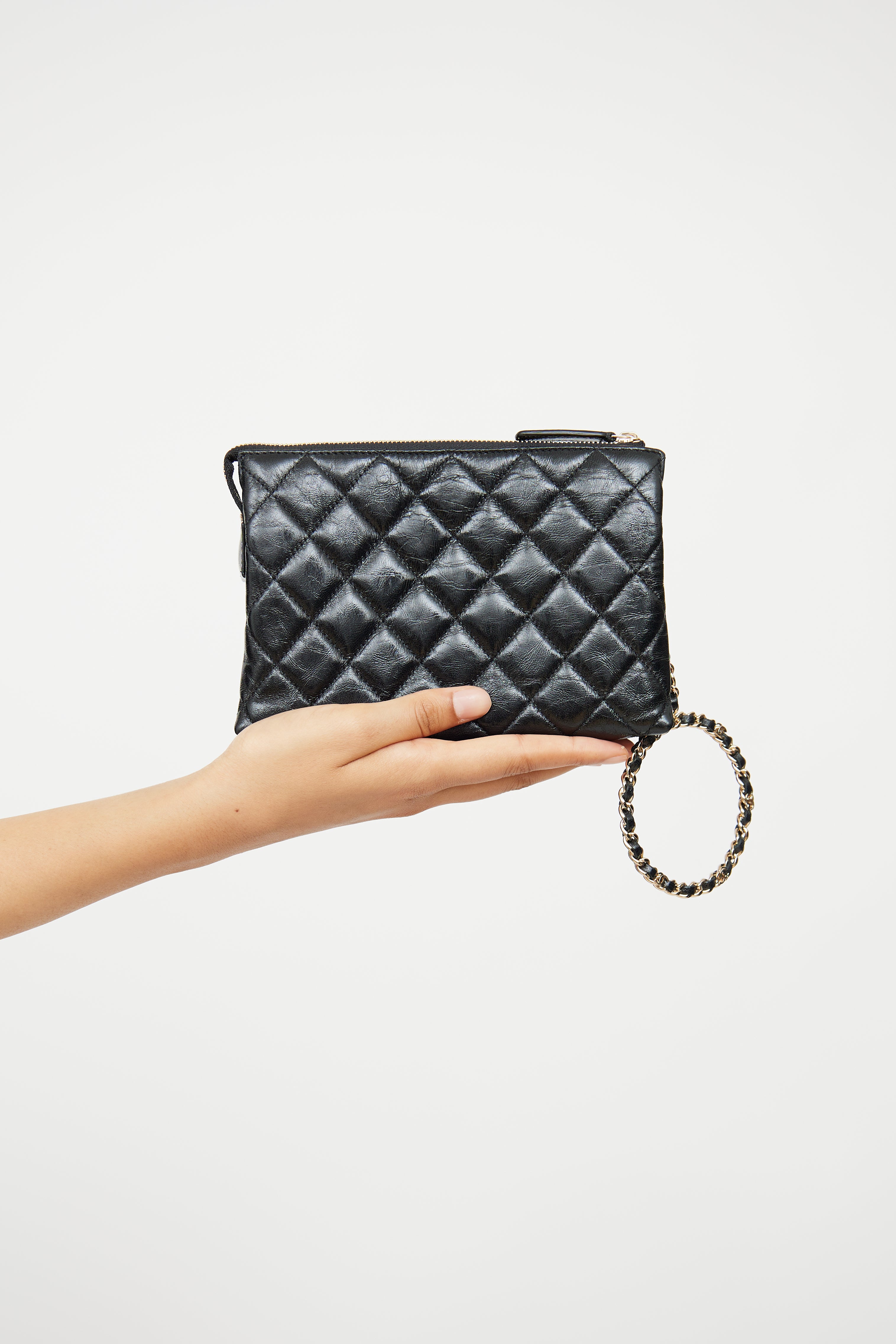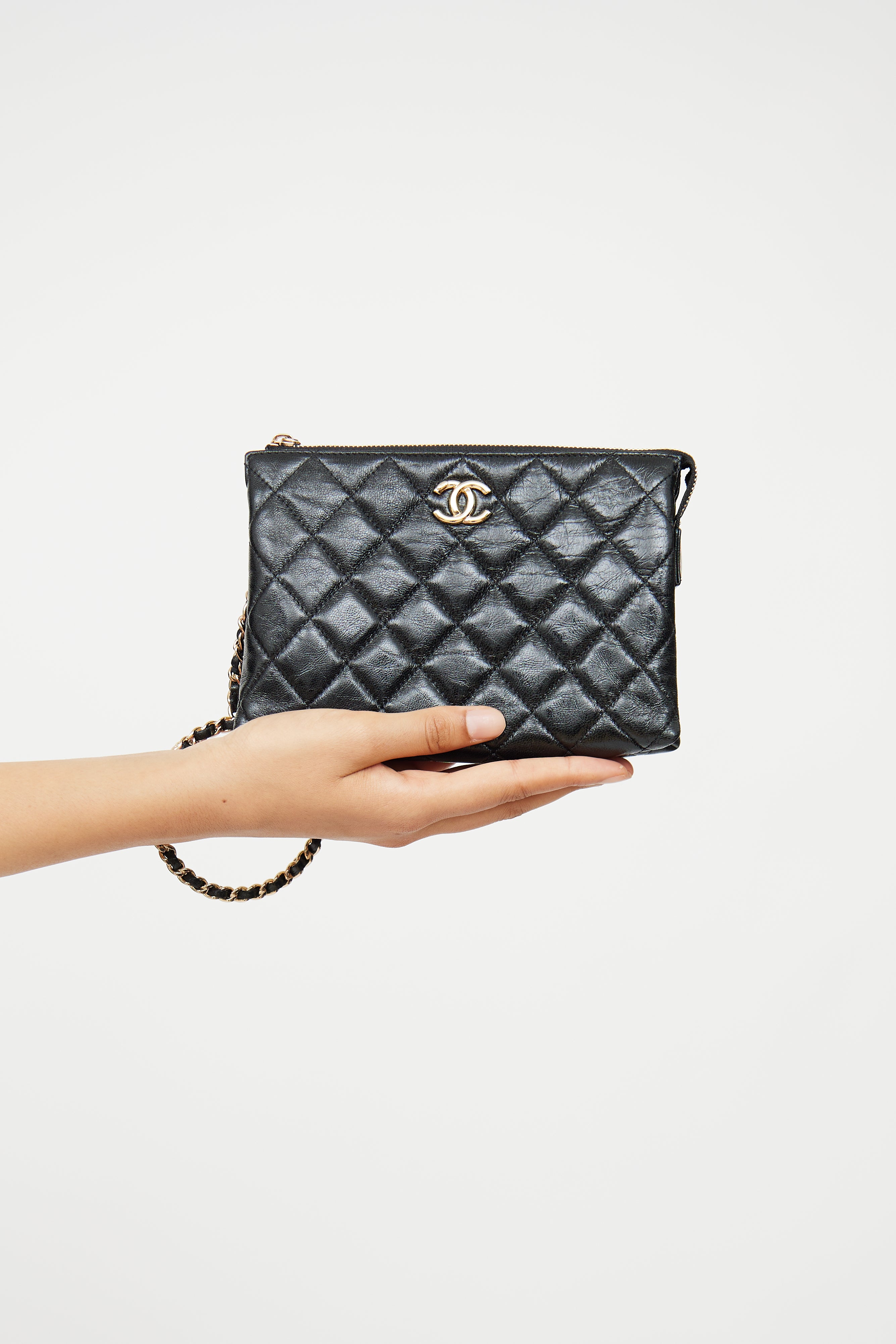 Pre-owned Chanel black quilted clutch featuring glossy Calfskin leather, gold tone hardware, CC logo on front, woven leather chain handle with CC, top zip closure, interior lined in textile, two divided compartments with three card slots. From 23S collection.