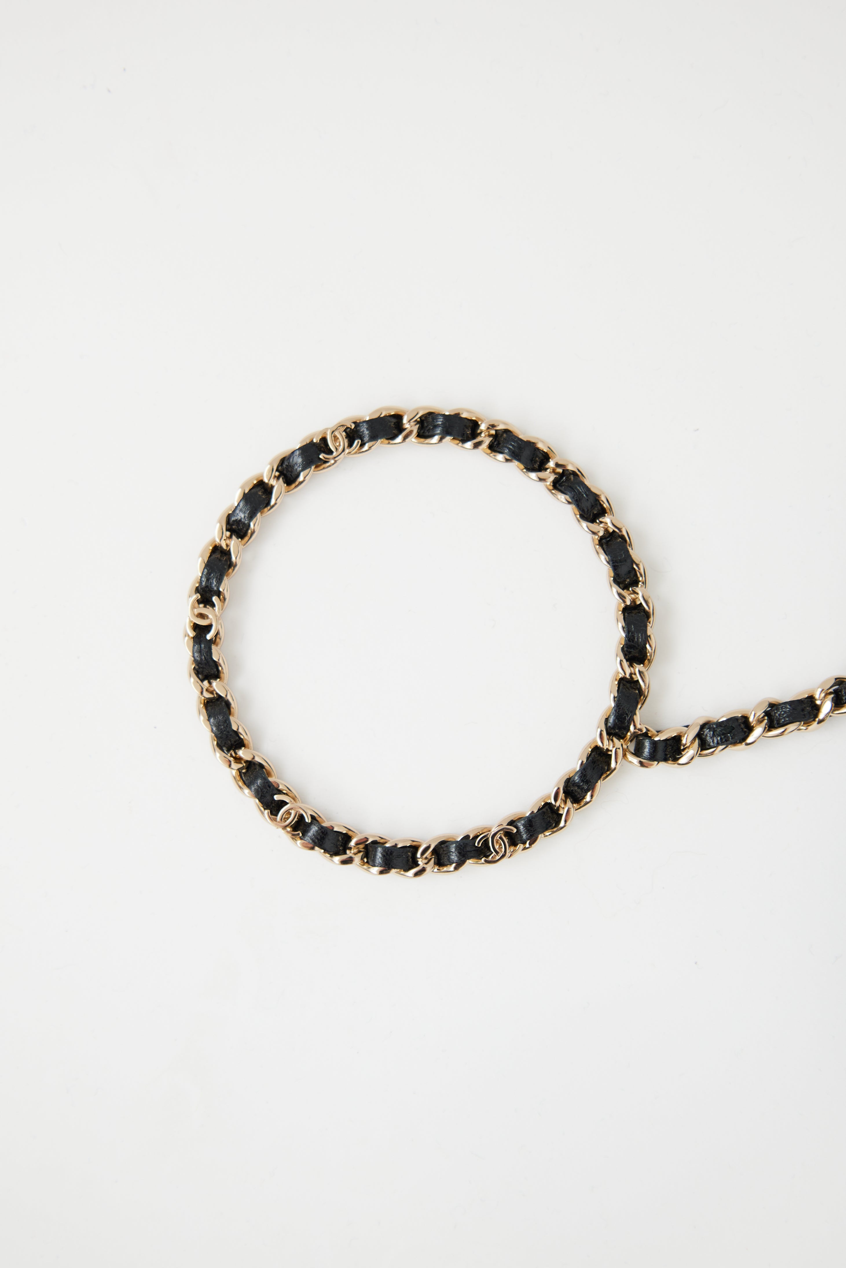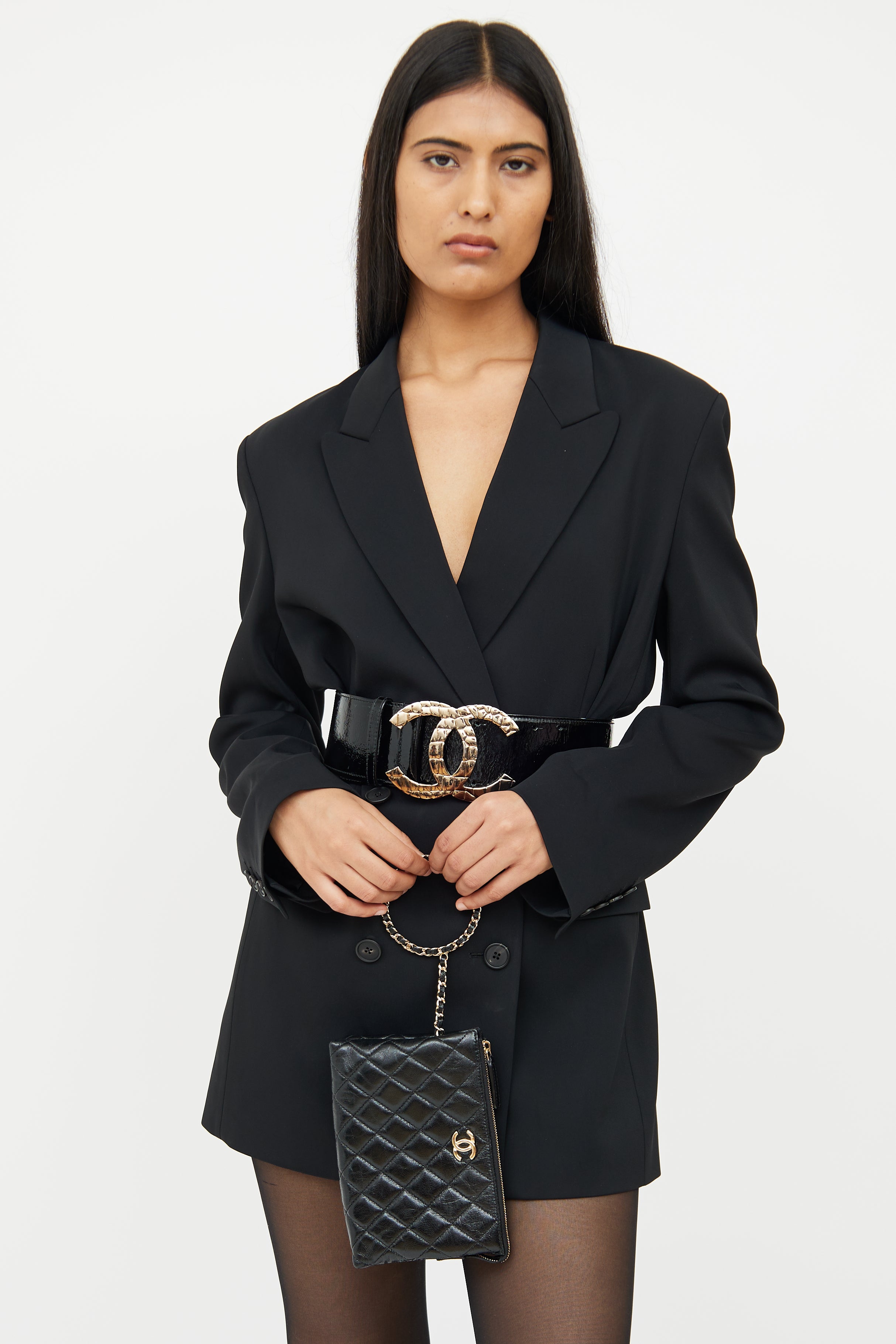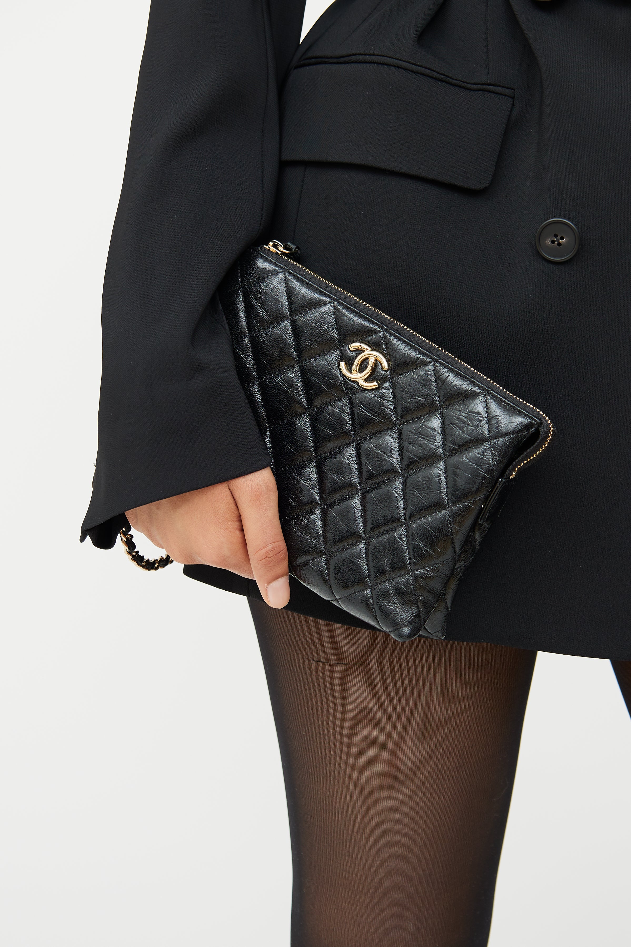 Pre-owned Chanel black quilted clutch featuring glossy Calfskin leather, gold tone hardware, CC logo on front, woven leather chain handle with CC, top zip closure, interior lined in textile, two divided compartments with three card slots. From 23S collection.