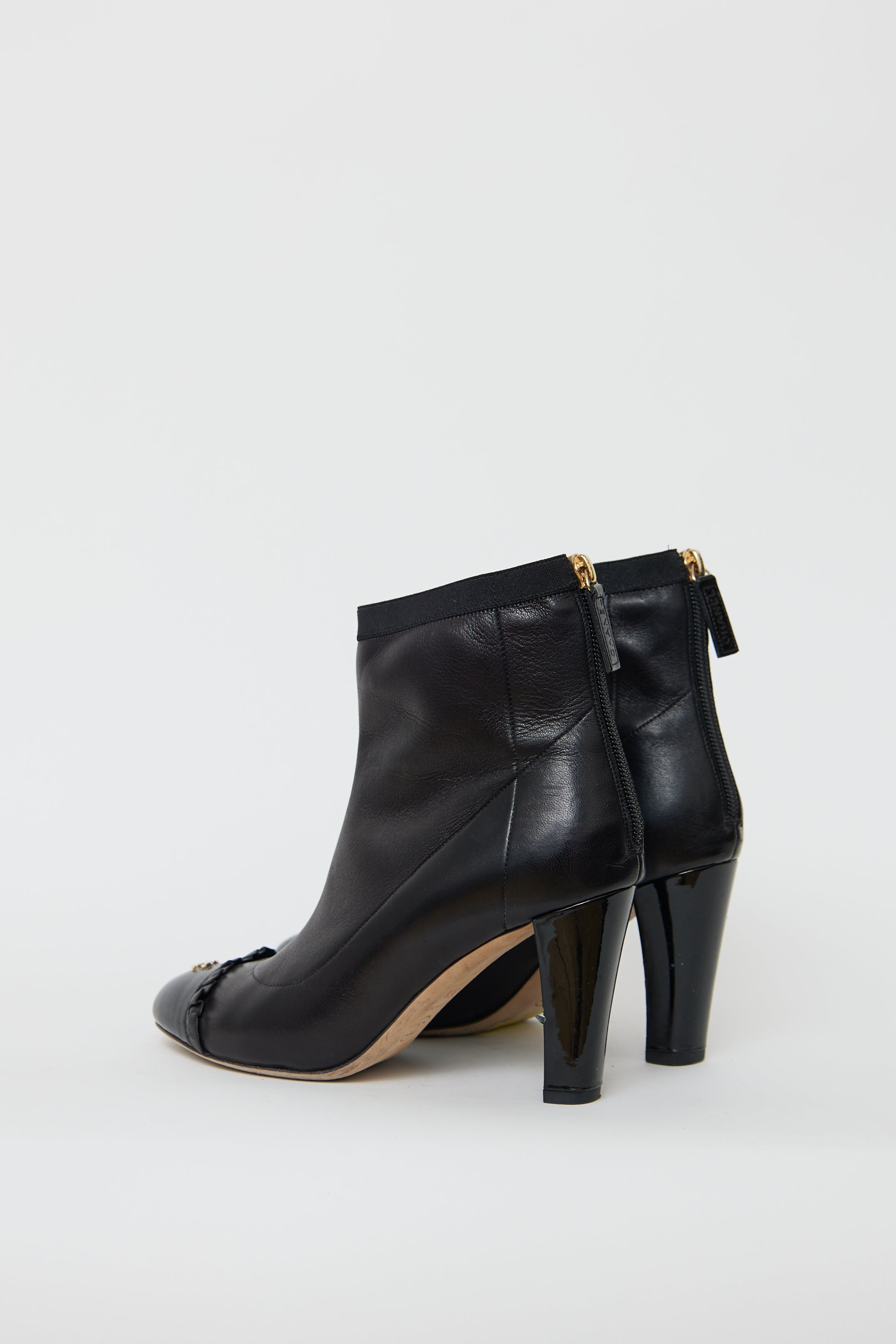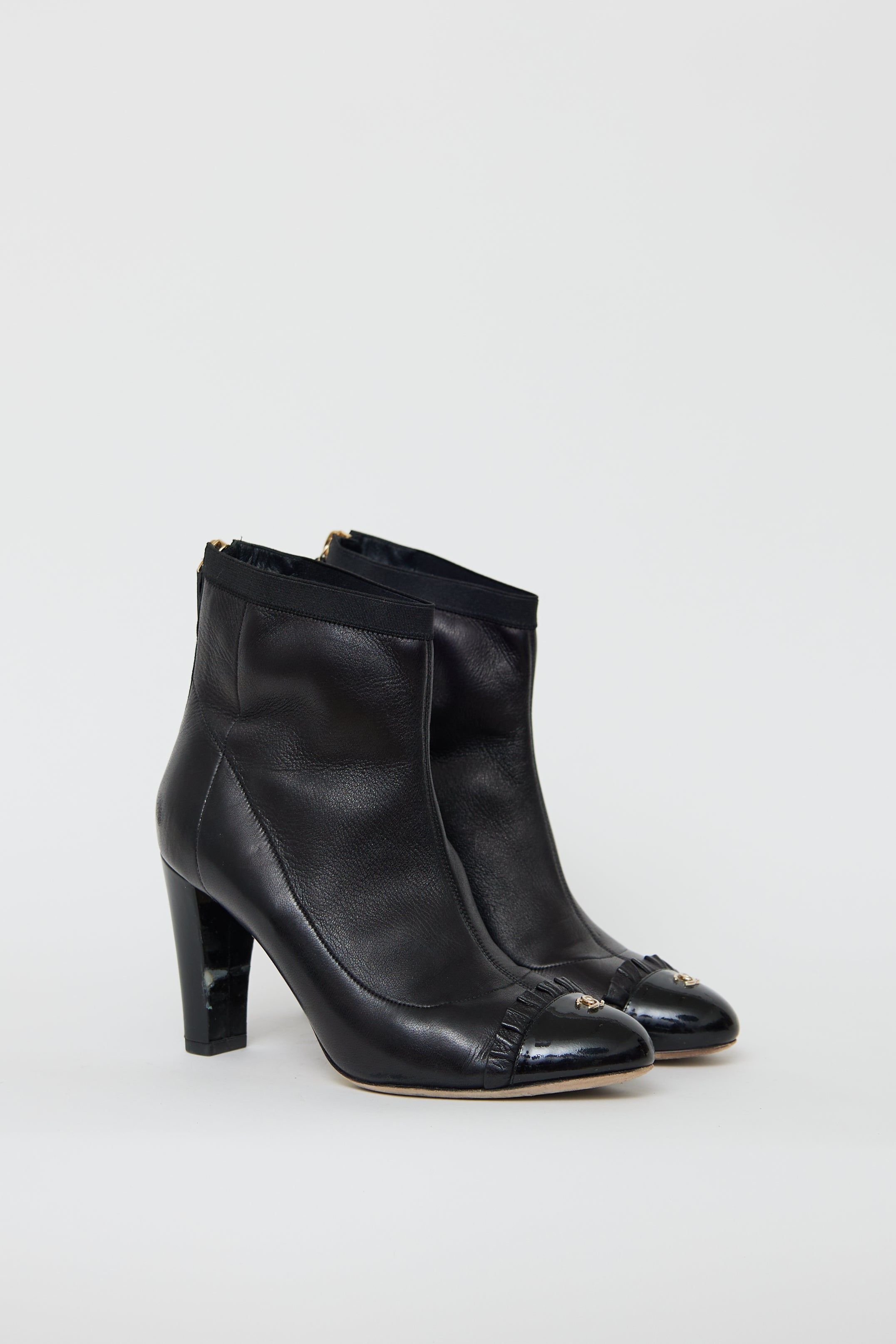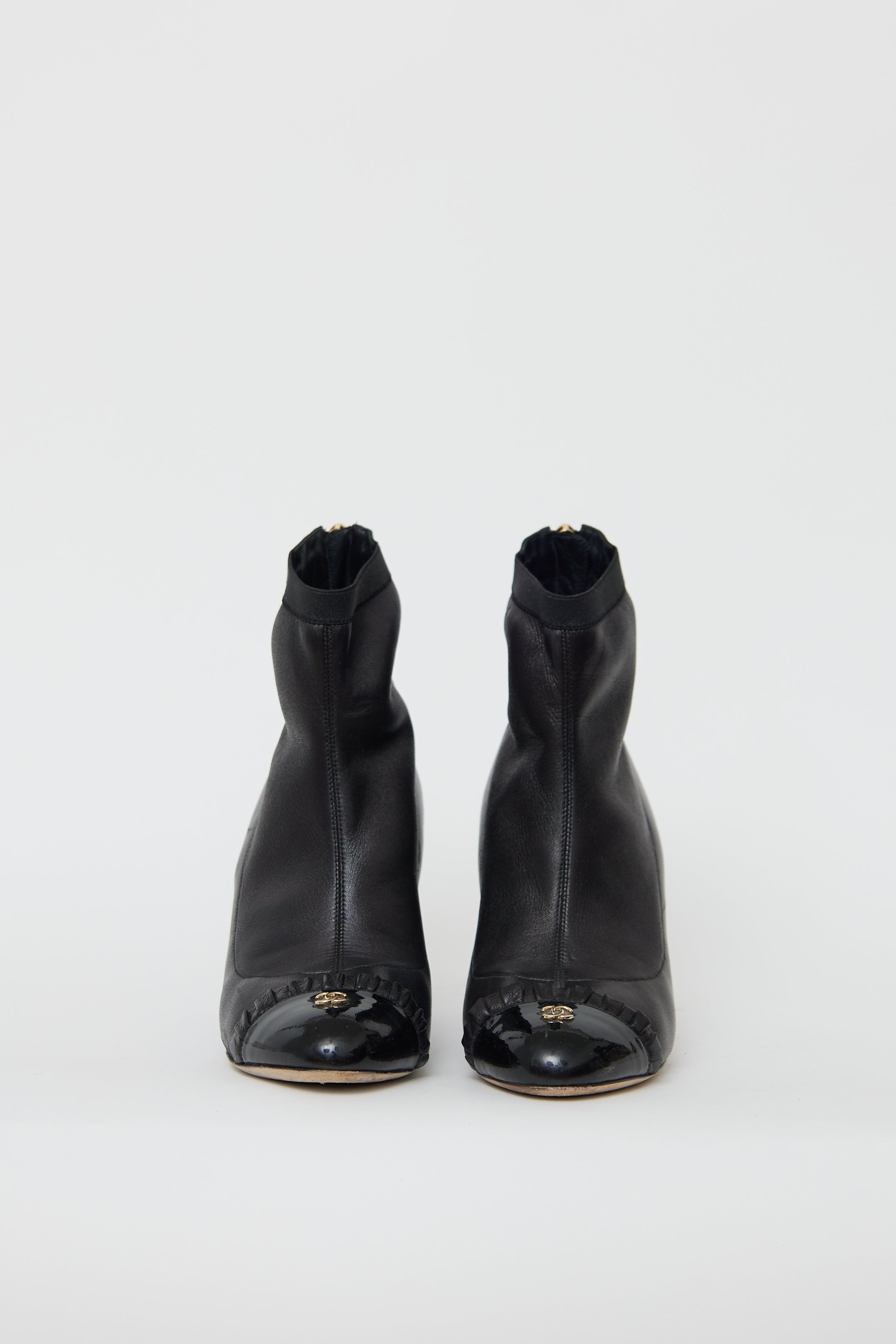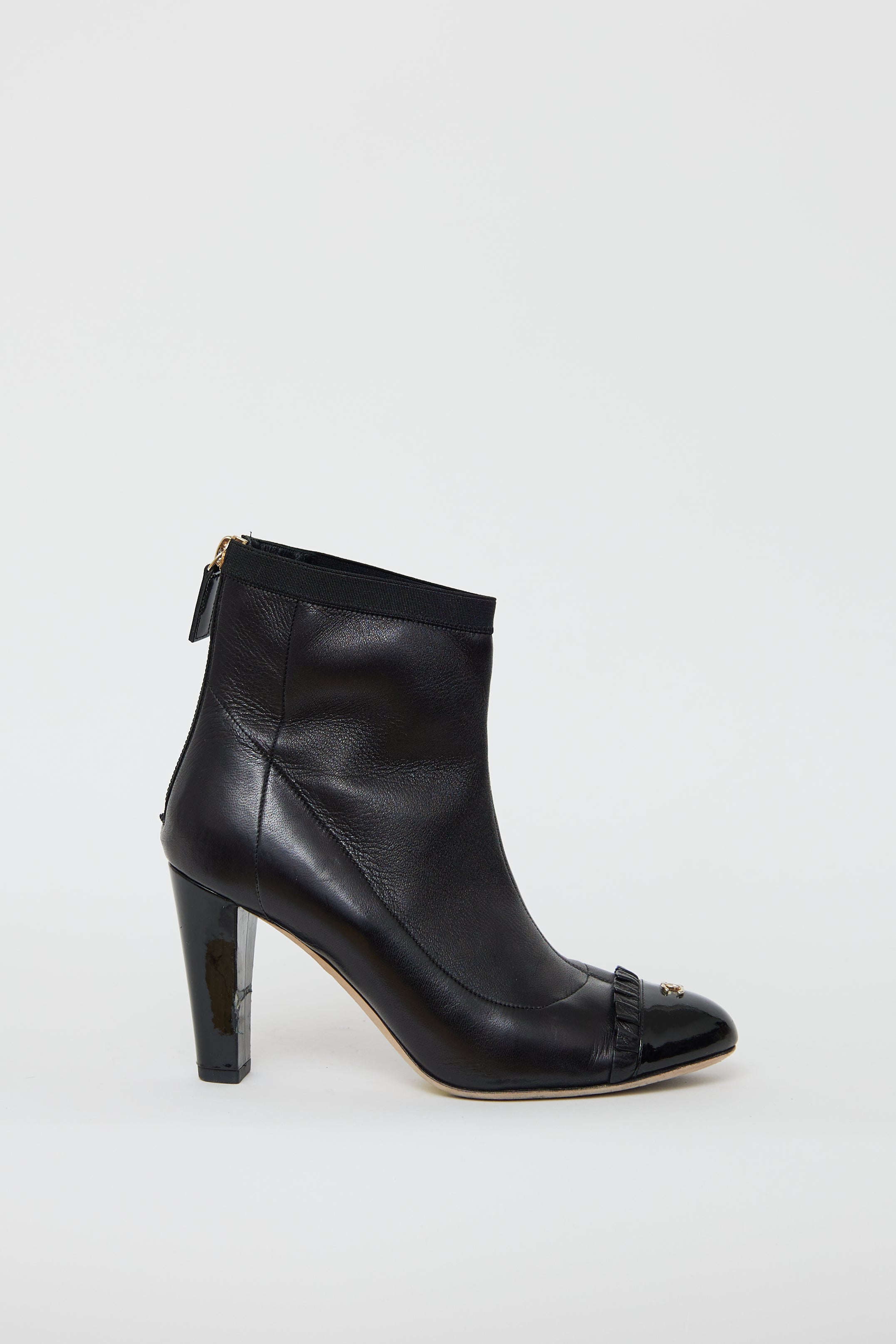 Pre-owned Chanel black leather boots featuring a rounded cap toe with ruffled trim, ankle height shaft, gold tone CC logo hardware at upper, wrapped patent block heel, and zip closure at heel.