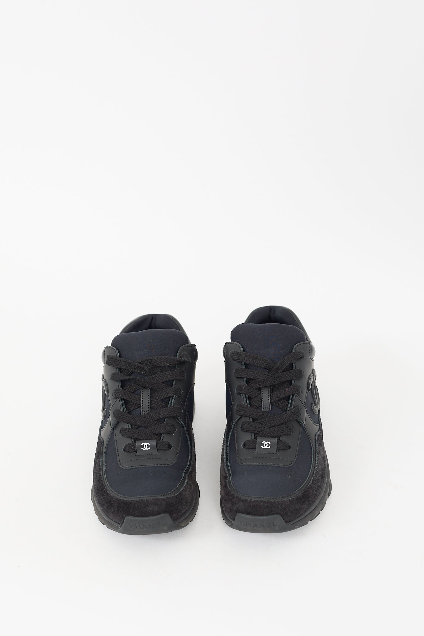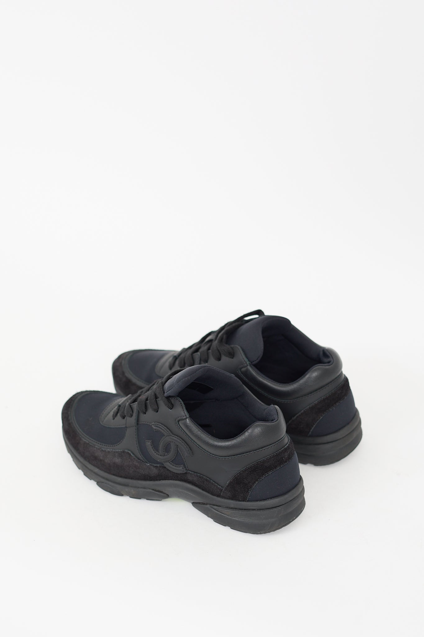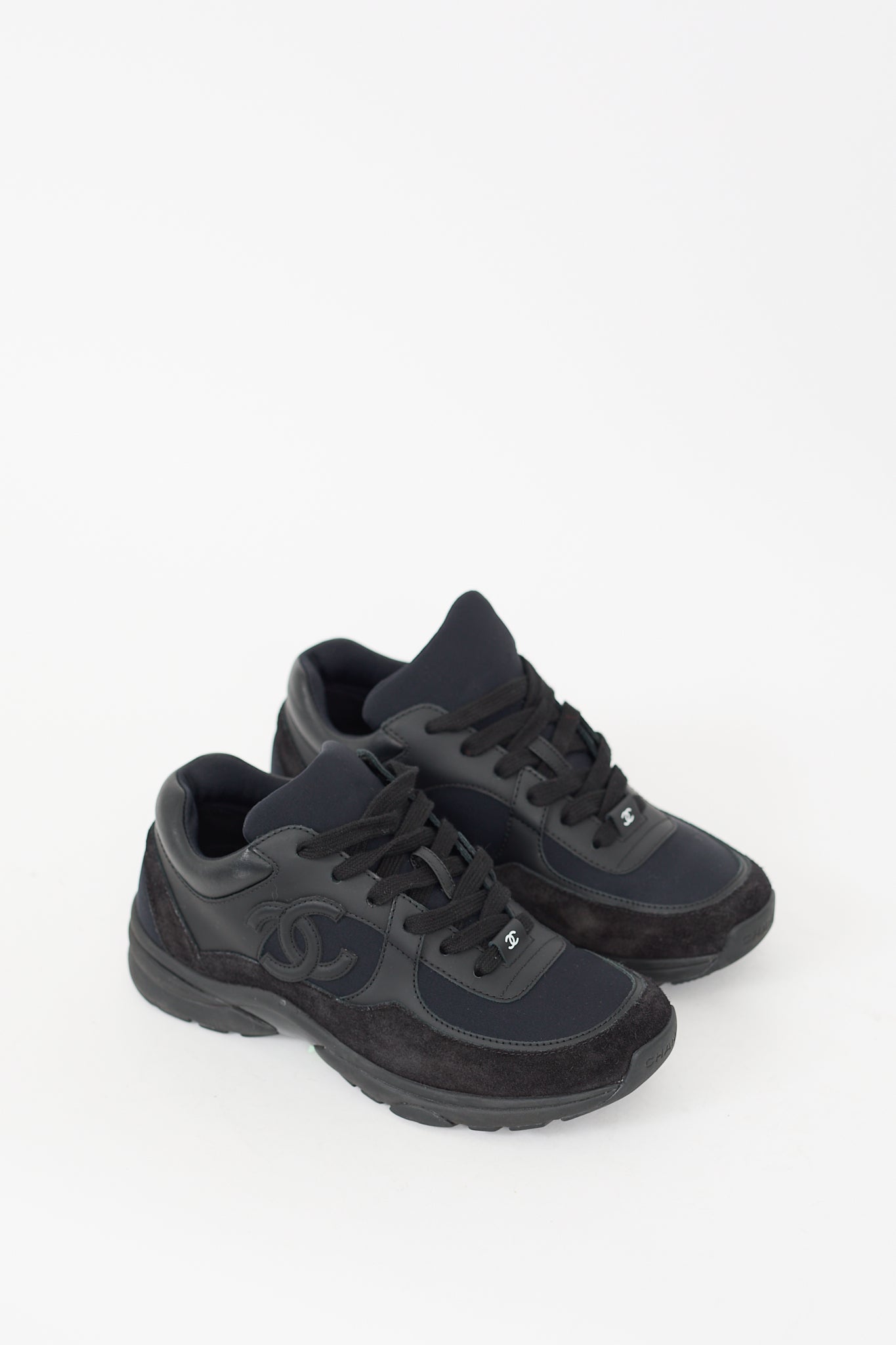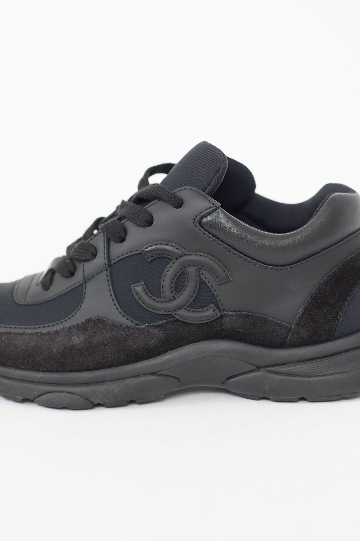 Pre-owned Chanel black sneakers featuring rounded toe, rubber and suede panelling throughout, logo tab at lace up front, and CC logo at outer sides. Comes with original box.