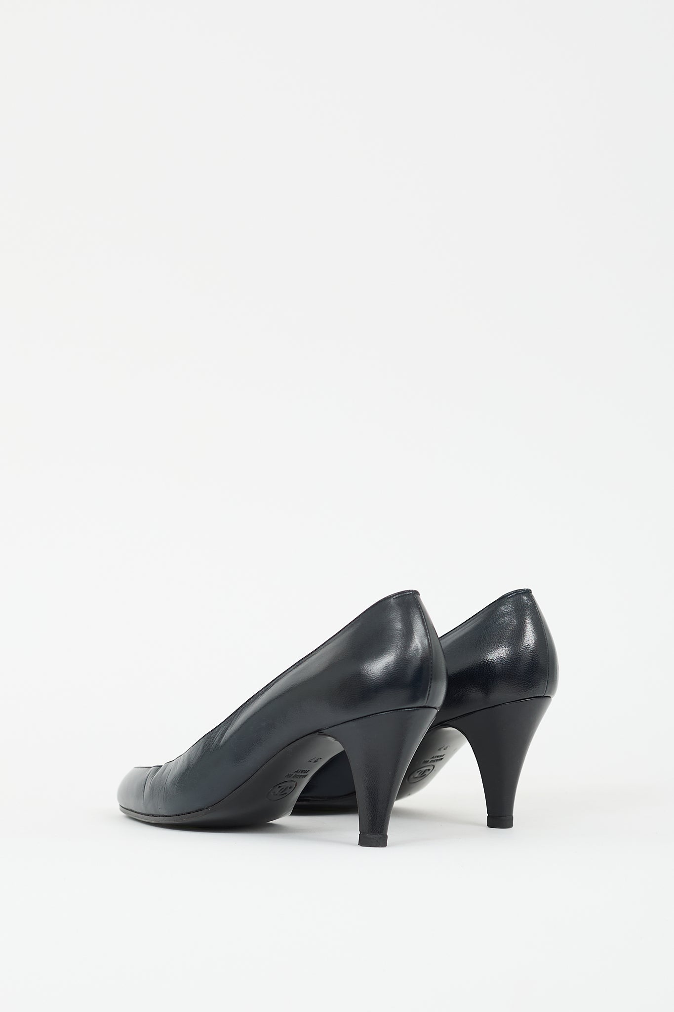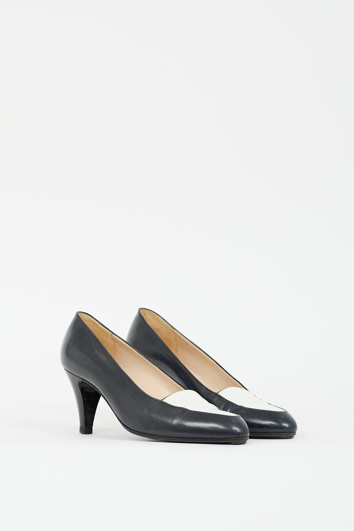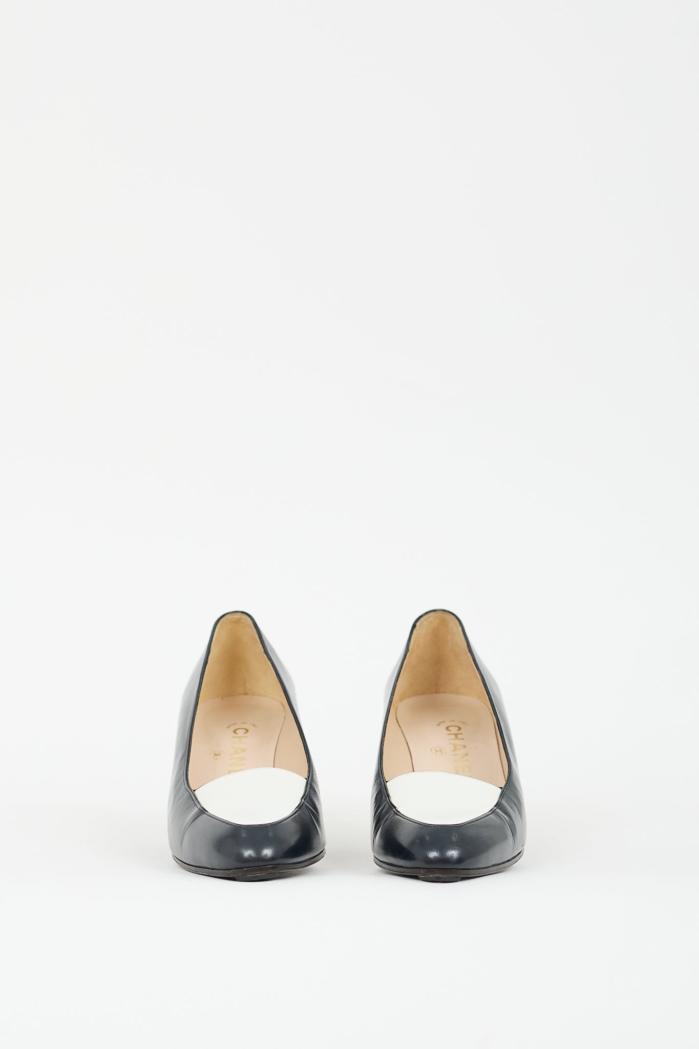 Pre-owned Chanel black and white pumps featuring an almond toe, leather upper, panelled design, covered cone heel, and leather insole and outsole.