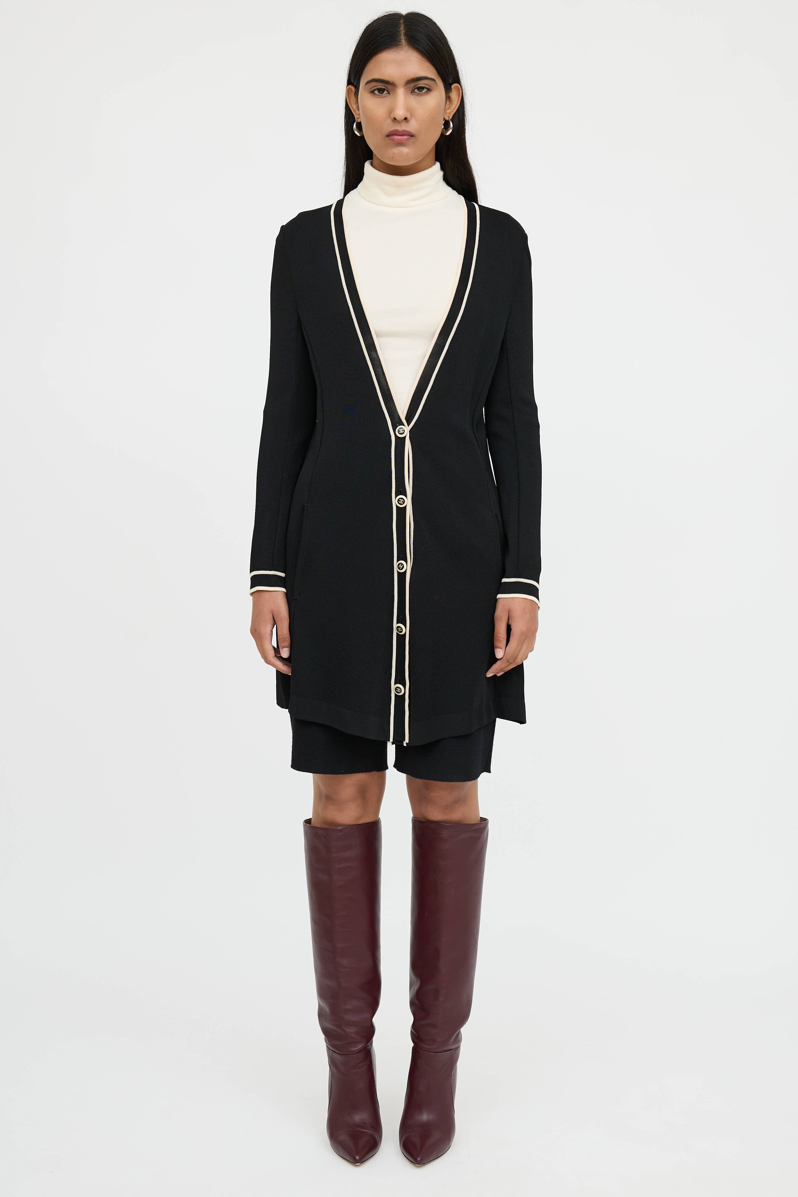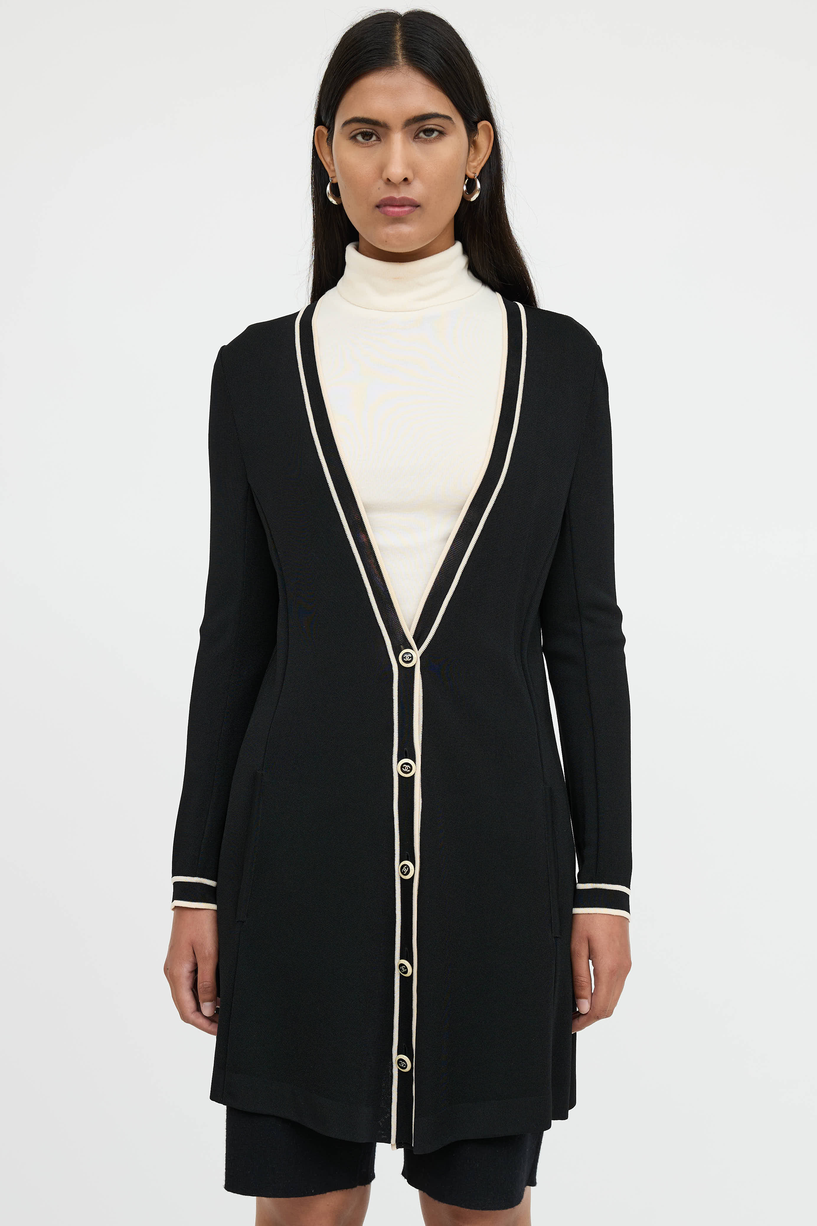Pre-owned Chanel black knit cardigan featuring a V-neckline, long sleeves with enameled buttoned cuffs, two slip pockets at hip, white ribbed trim, and logo button up closure. From the 2014 Cruise Collection by Karl Lagerfeld.